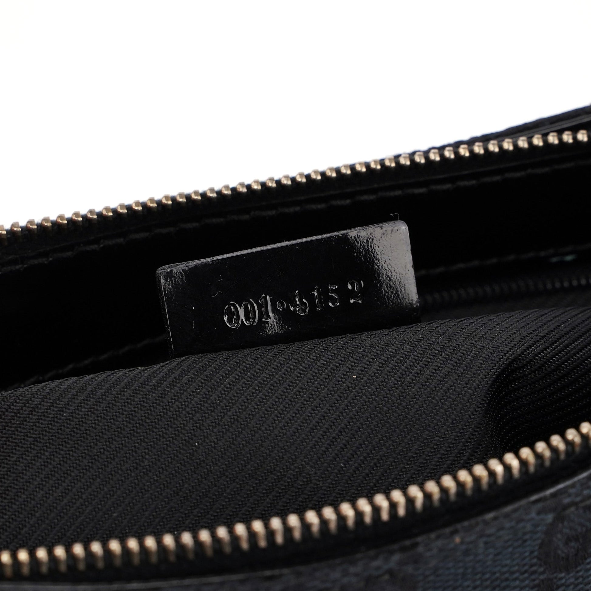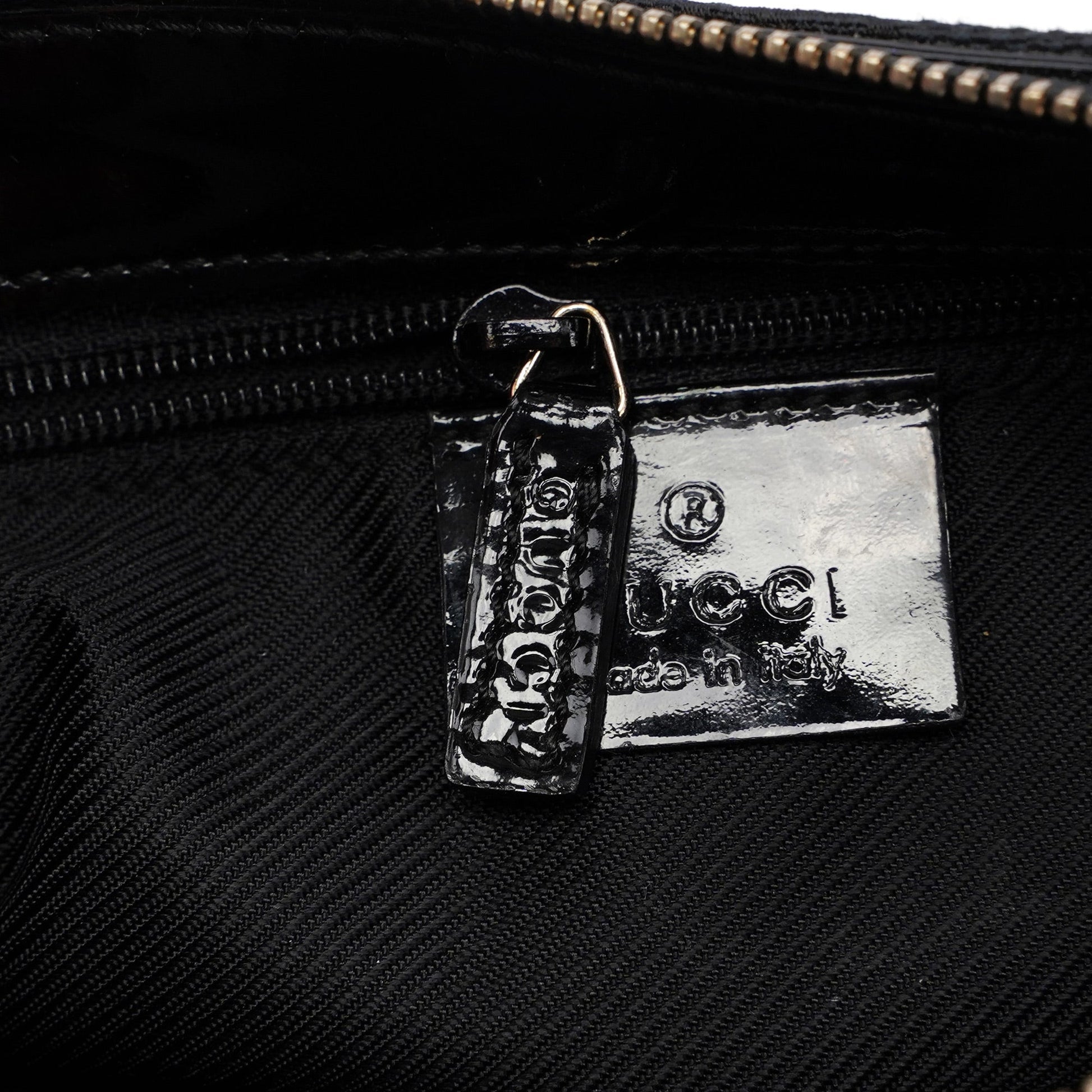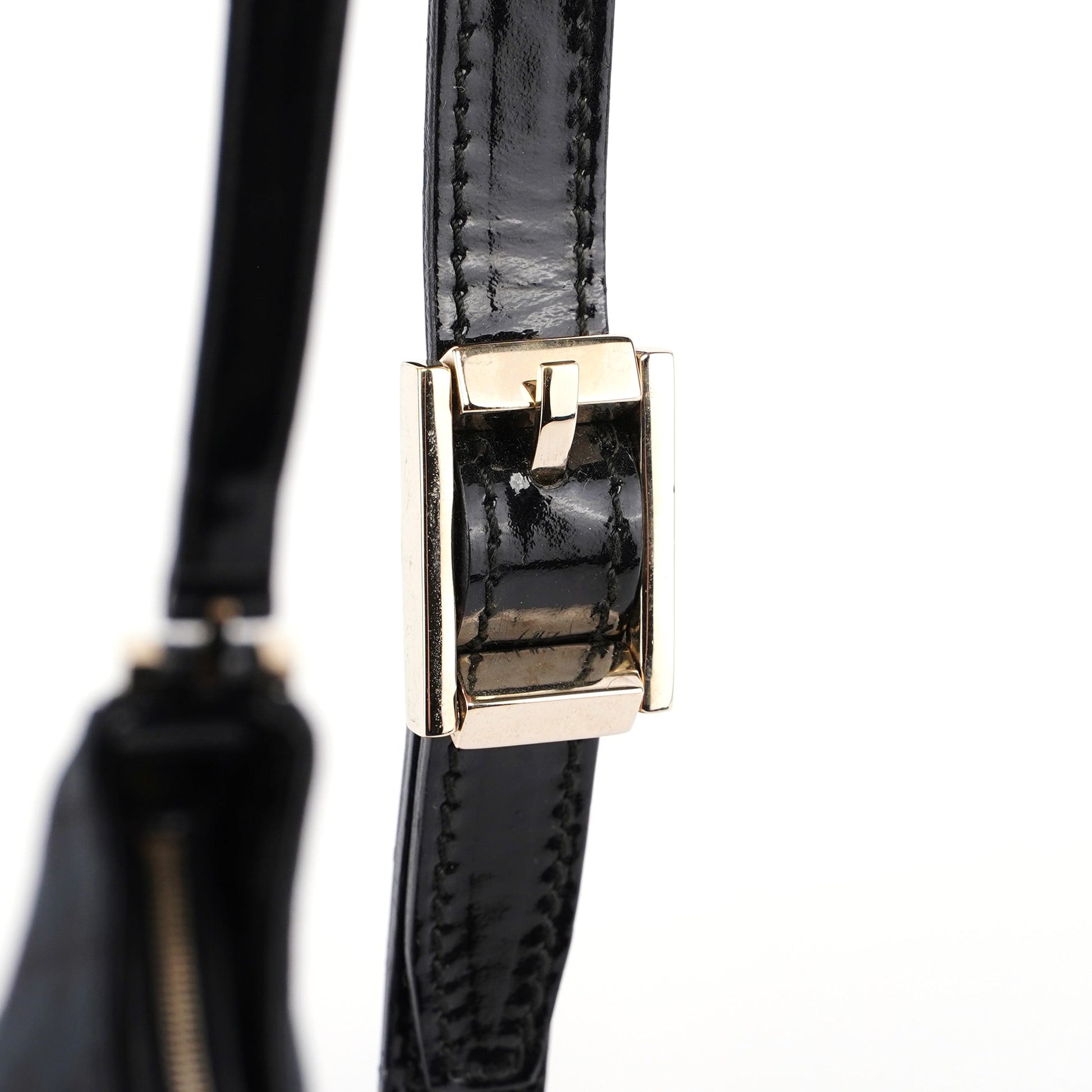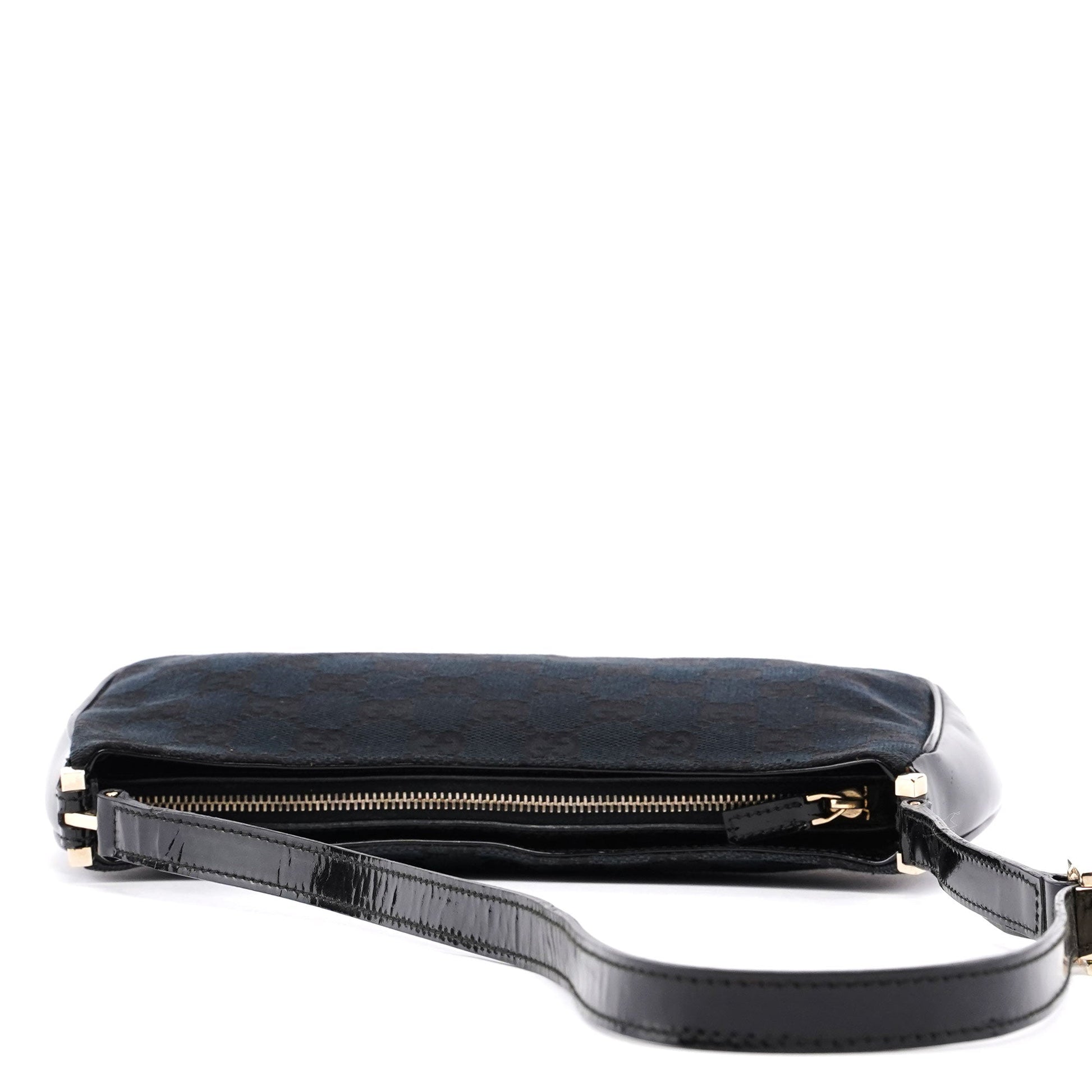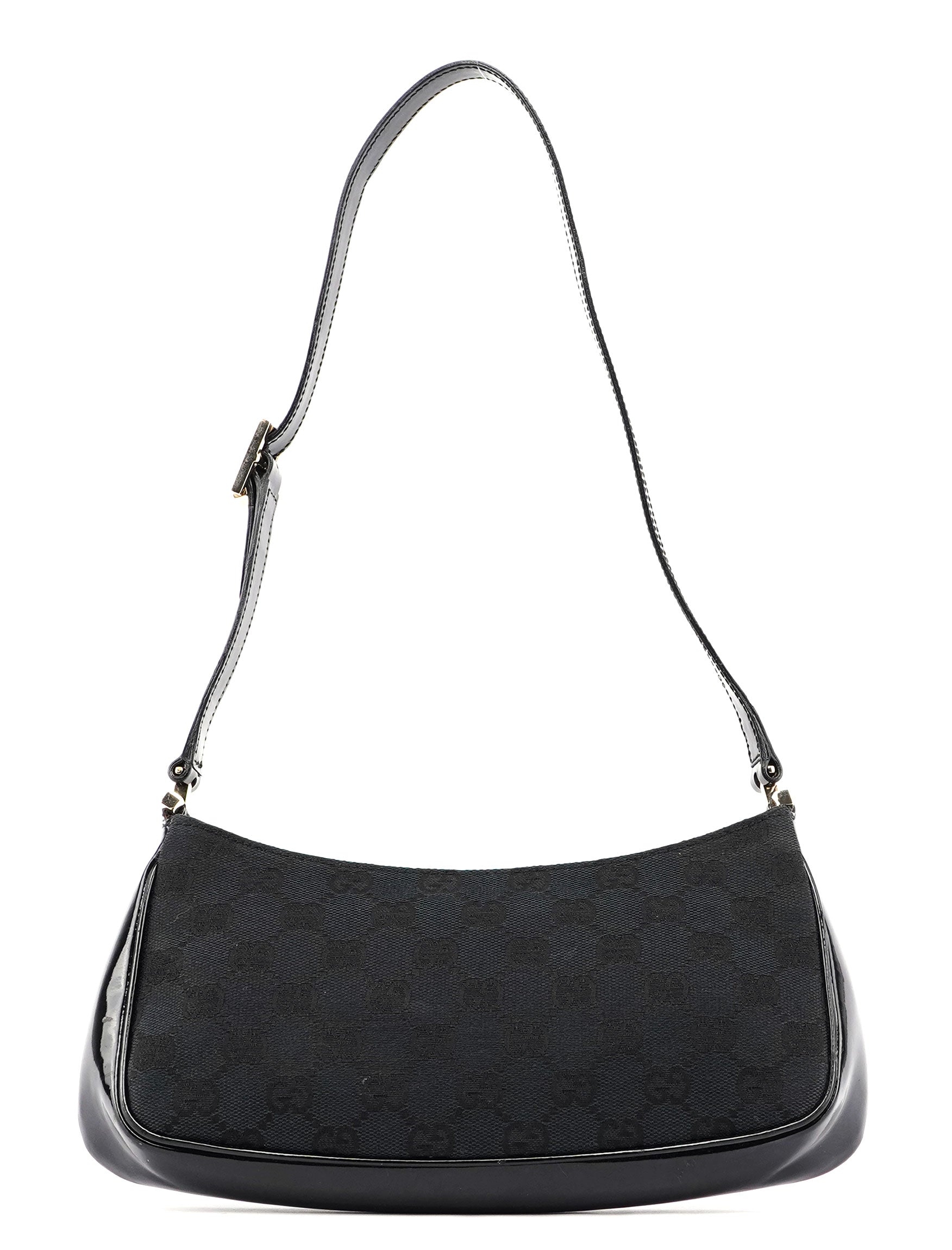 Designed by Tom Ford in the late 1990s, the Gucci GG mini hobo bag is handcrafted in black GG monogram canvas and black patent leather. Its gold-tone hardware hardware add a touch of elegance. Lined with satin, it features a small interior pocket for essentials.