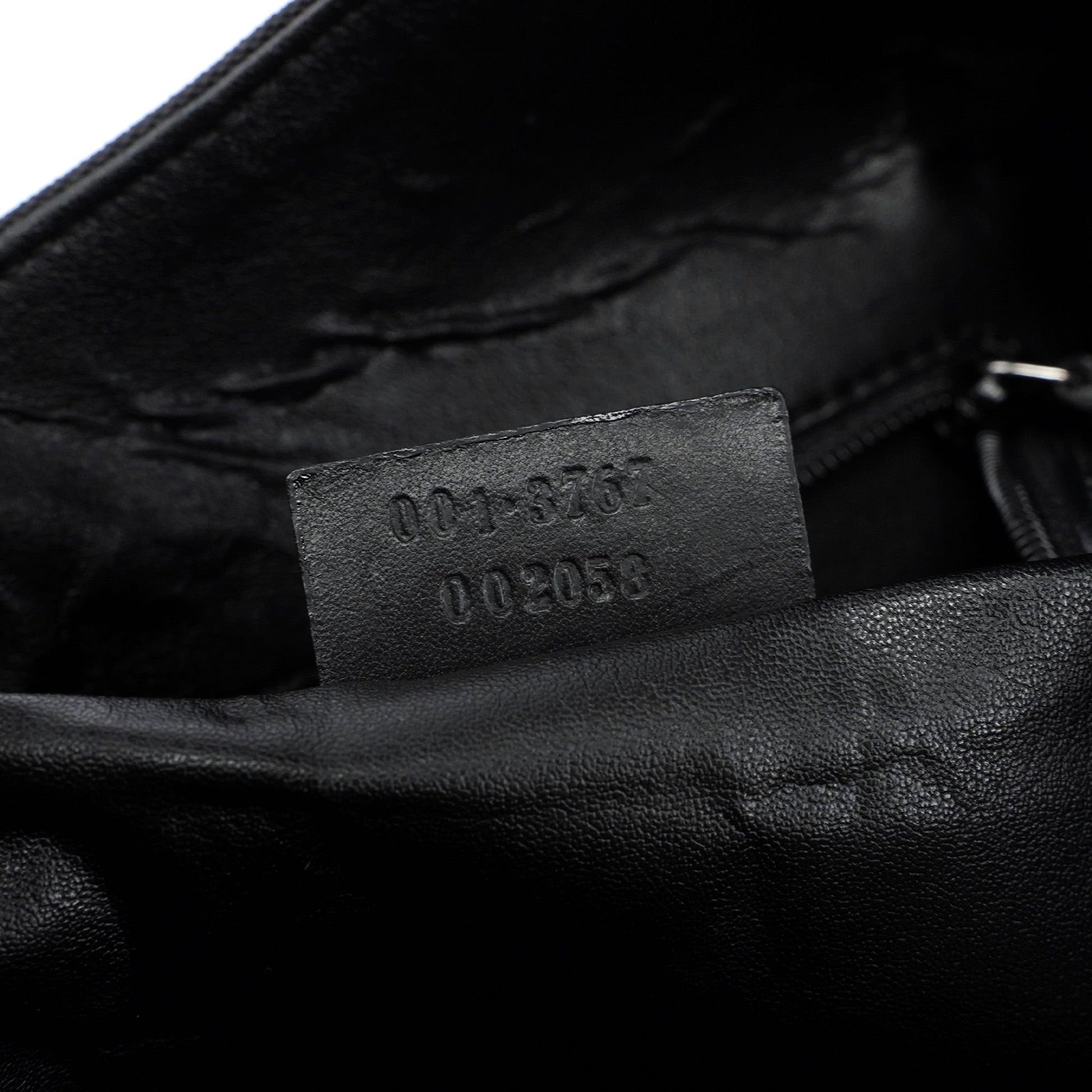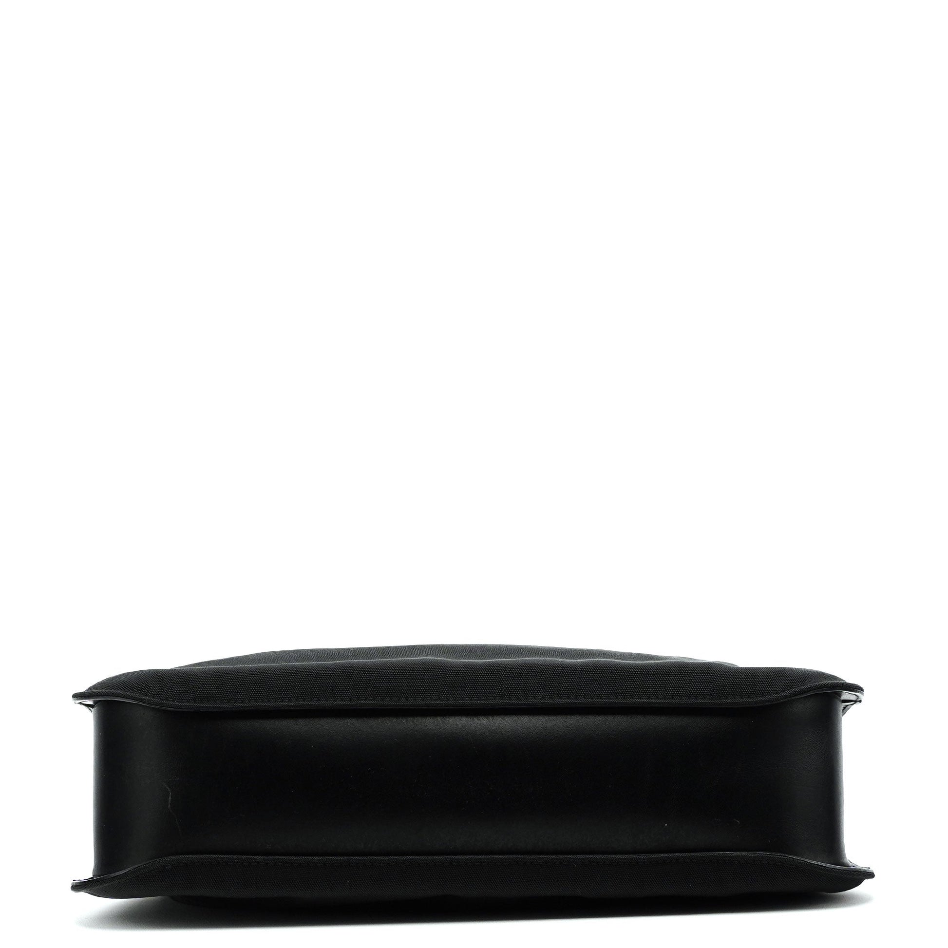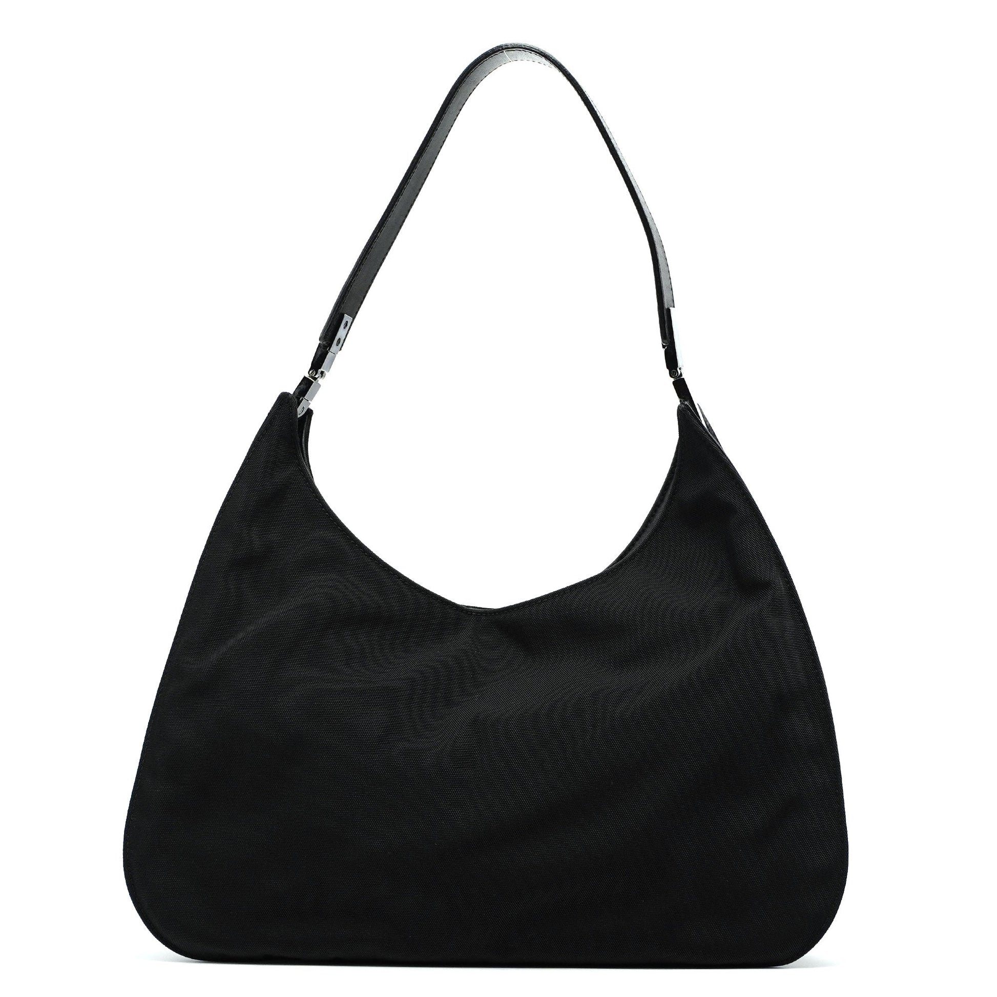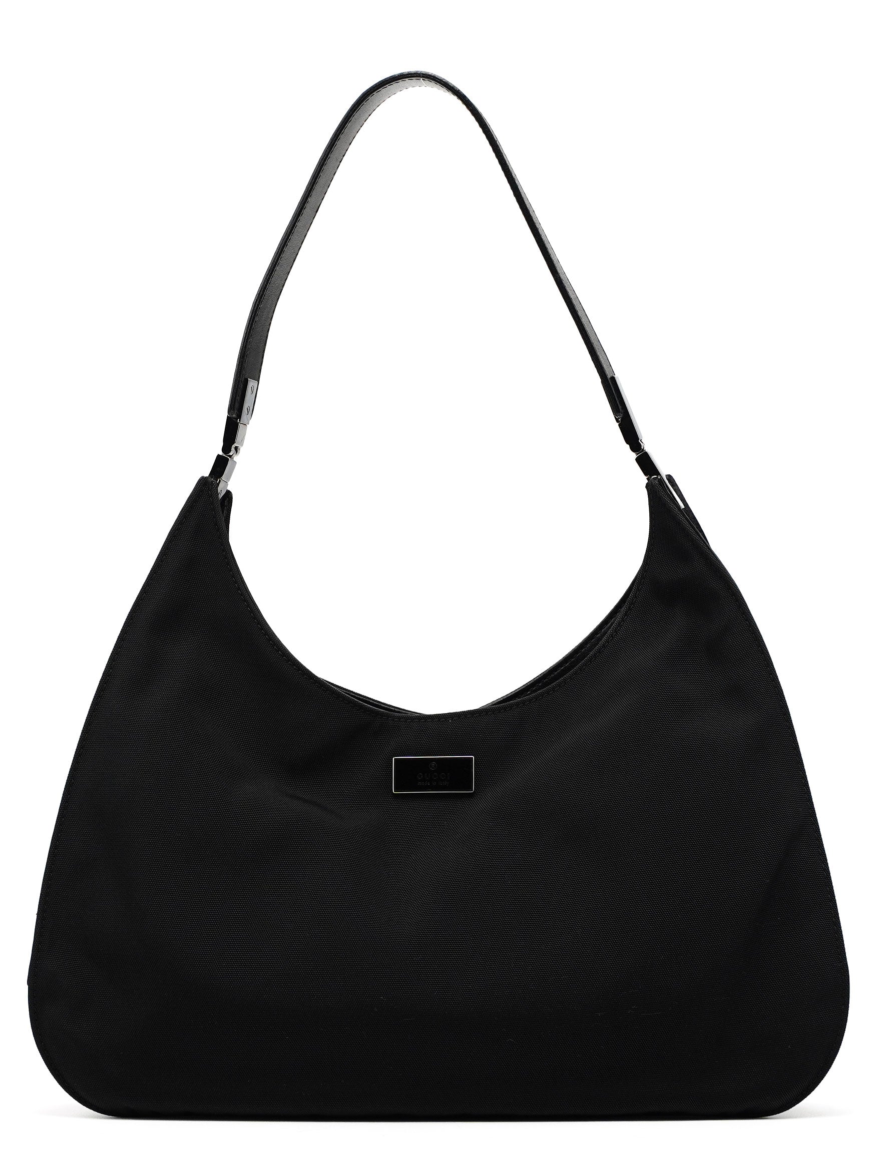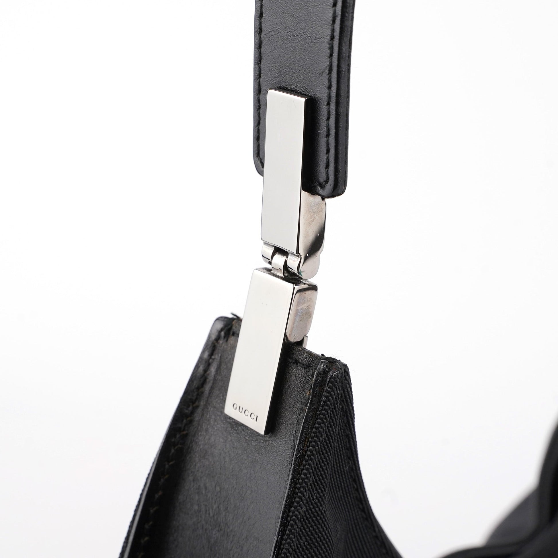 Handcrafted from black canvas with tonal calfskin leather, this Gucci hobo bag by Tom Ford from the late 1990s features silver-tone hardware engraved with the Gucci logo. The interior is lined in calfskin leather with an interior zipper pocket, and the Gucci logo plate adorns the front, showcasing timeless elegance.
