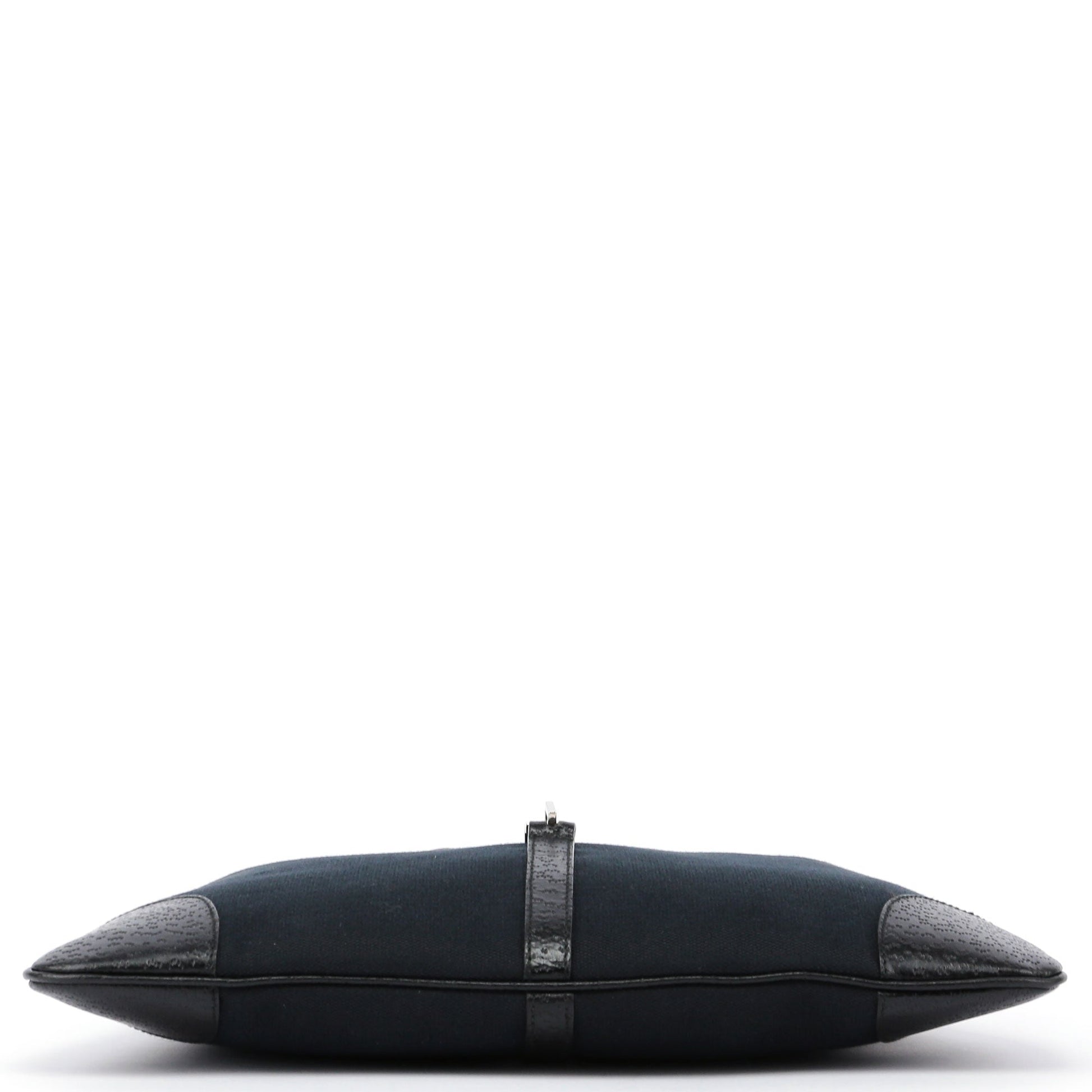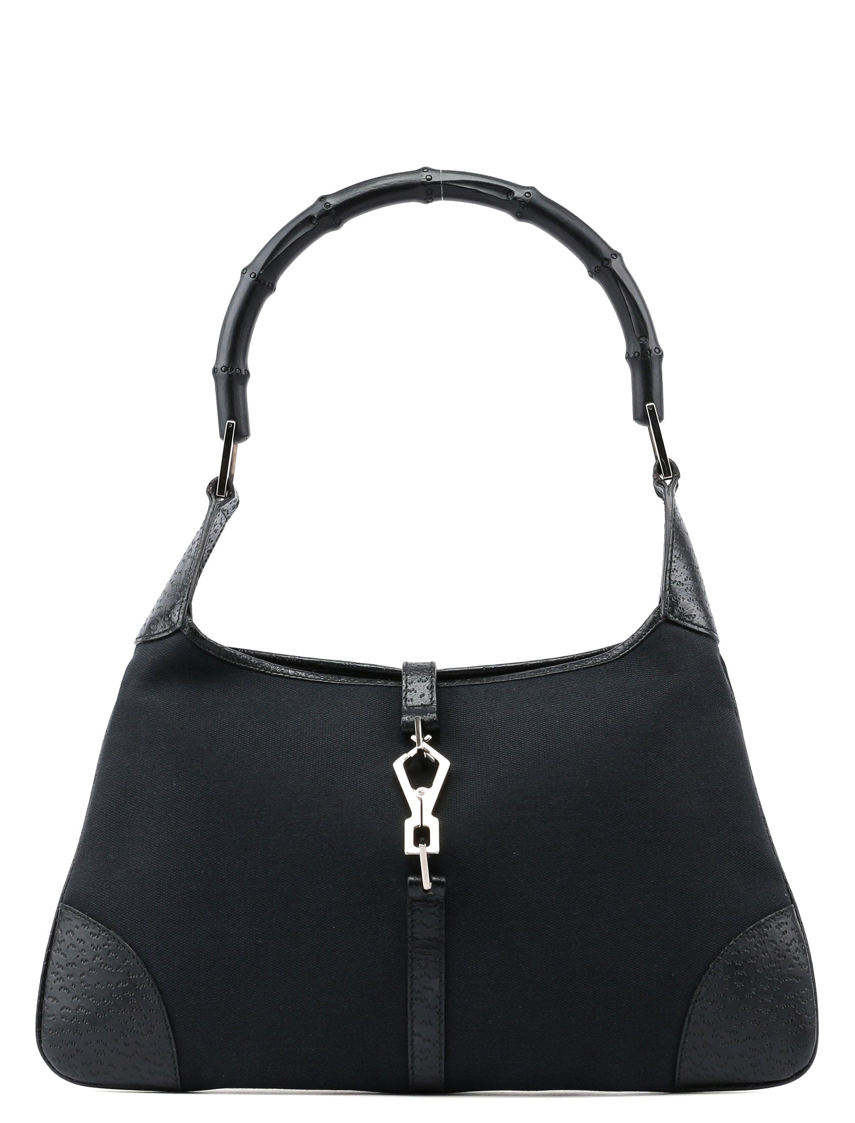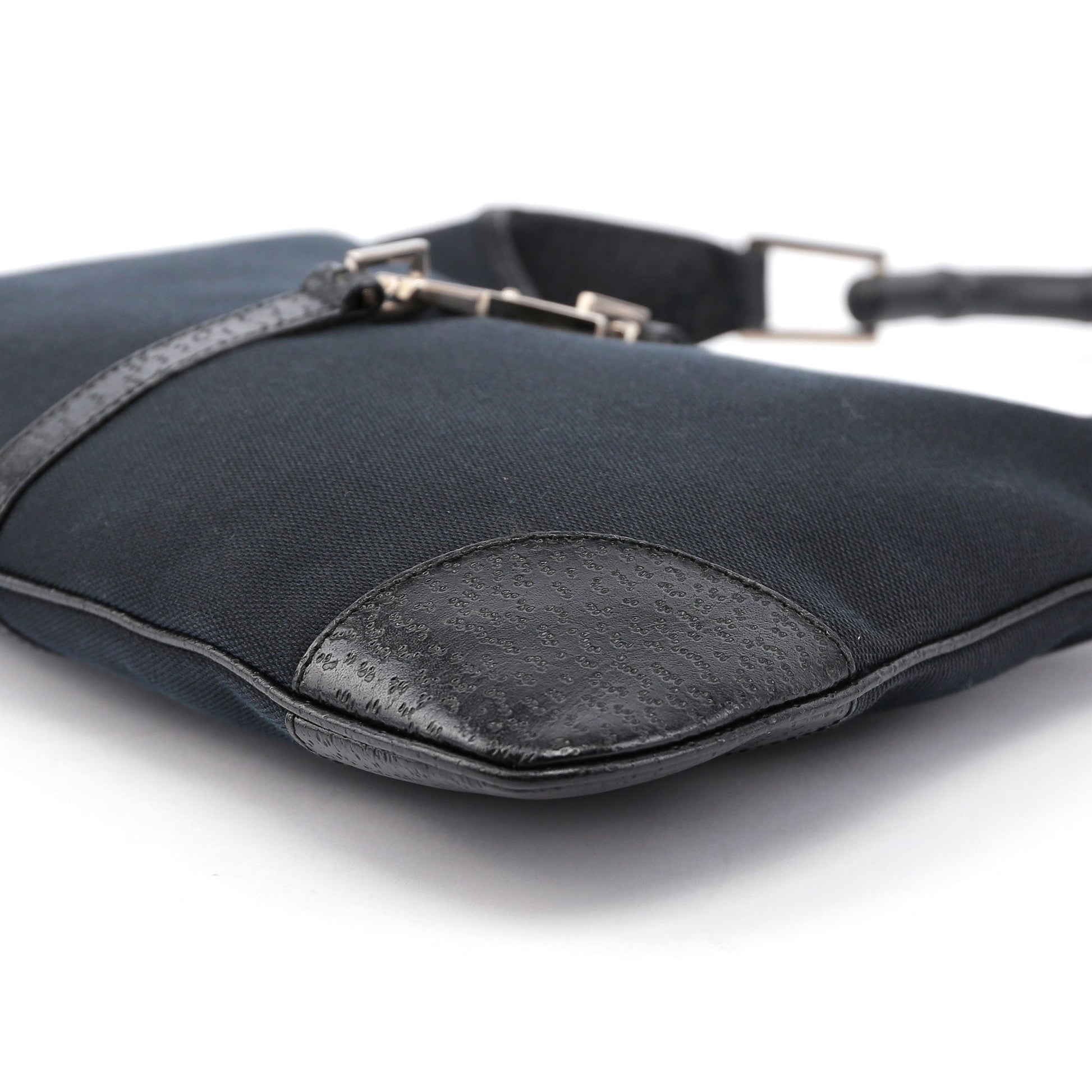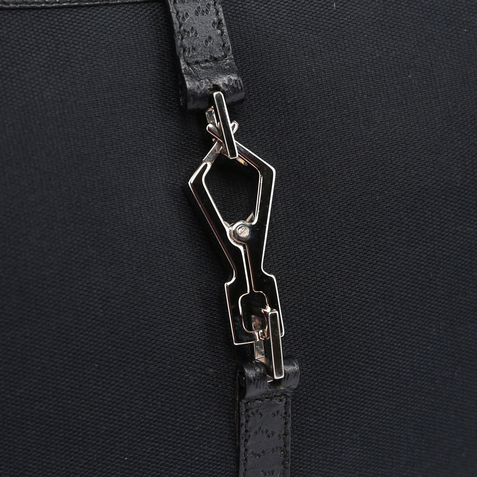 Designed by Tom Ford in the late 1990s, this Gucci Jackie Bamboo bag is handcrafted in black cotton canvas with tonal leather trim, accented by silver-tone hardware. It features a black bamboo handle with Gucci logo engraving and a classic silver-tone Jackie style closure. The interior, lined with square GG monogram satin and including an interior zipper pocket, marries functional design with Gucci's timeless aesthetic.