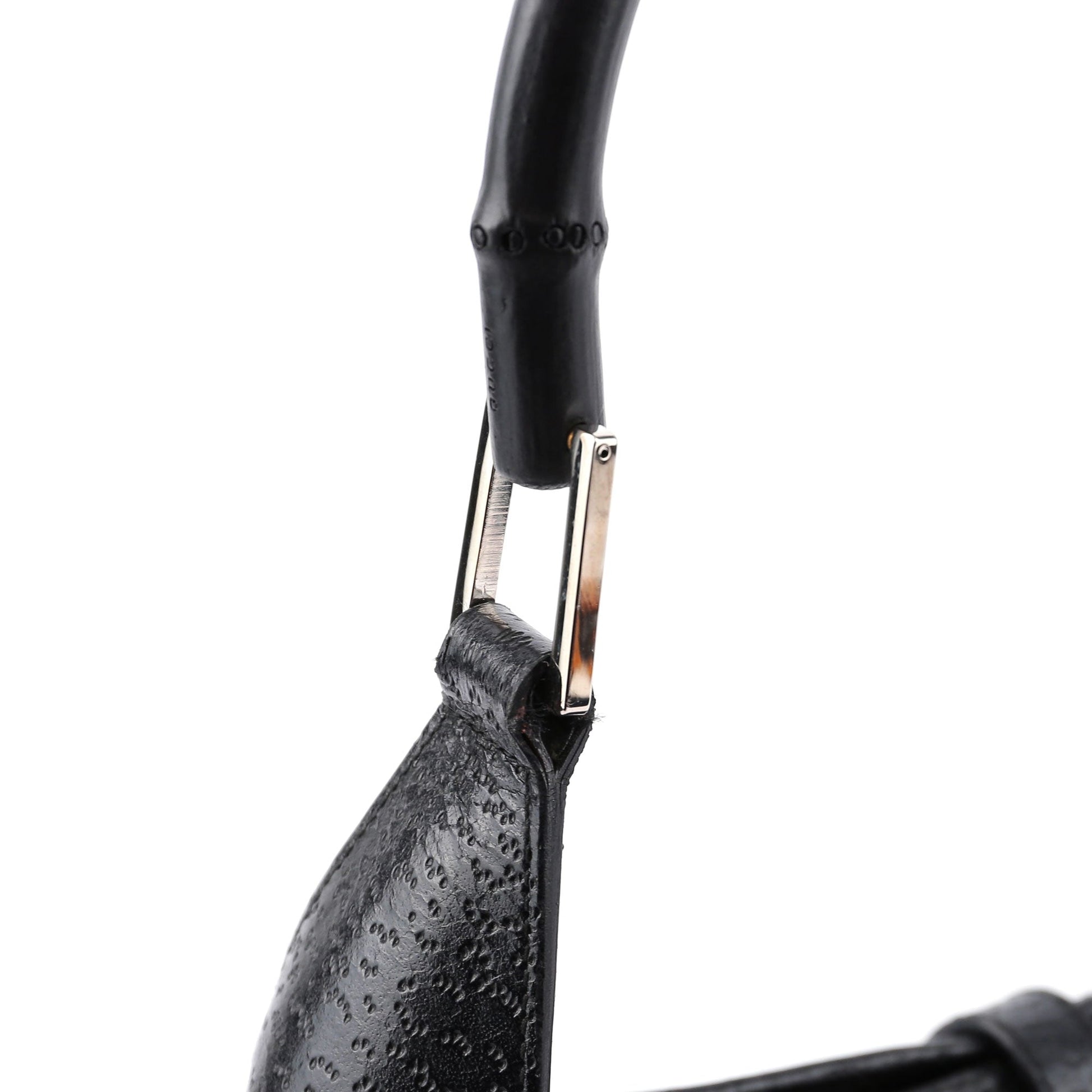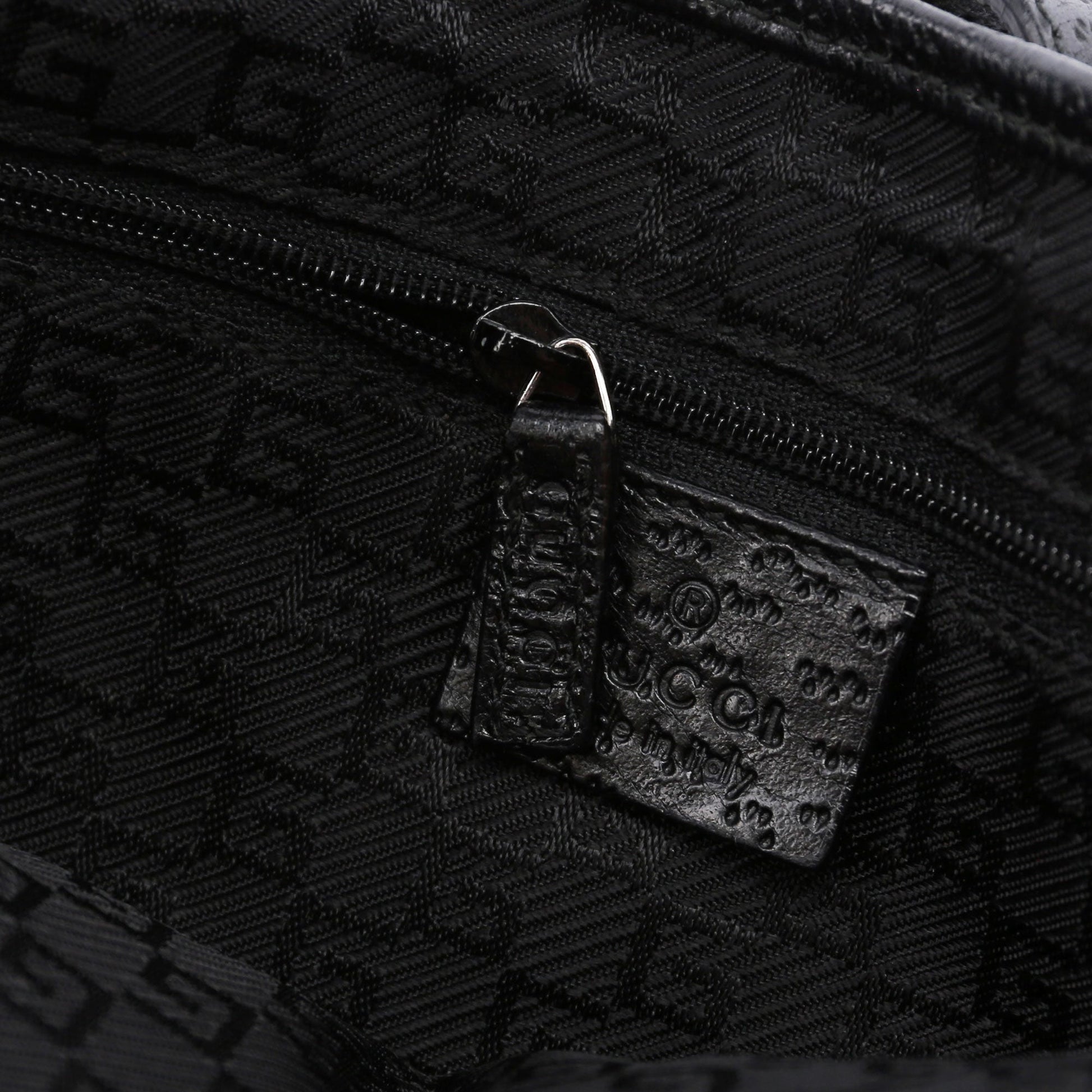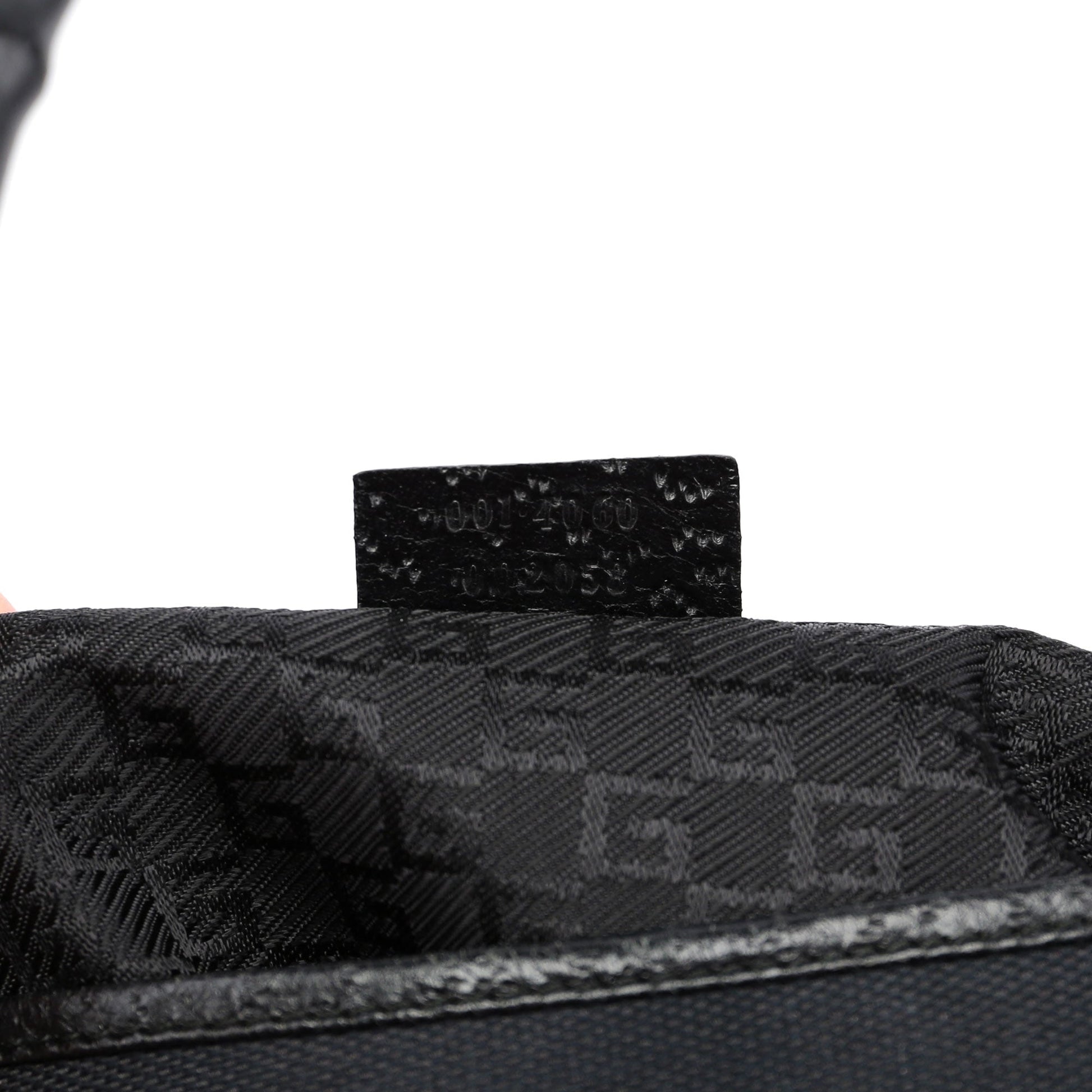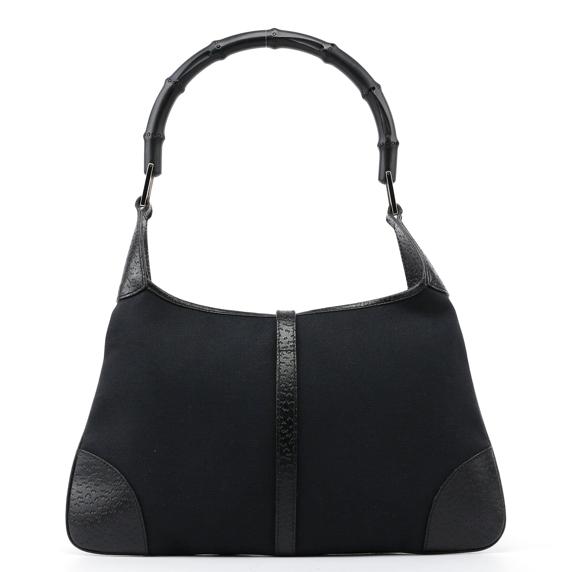 Designed by Tom Ford in the late 1990s, this Gucci Jackie Bamboo bag is handcrafted in black cotton canvas with tonal leather trim, accented by silver-tone hardware. It features a black bamboo handle with Gucci logo engraving and a classic silver-tone Jackie style closure. The interior, lined with square GG monogram satin and including an interior zipper pocket, marries functional design with Gucci's timeless aesthetic.