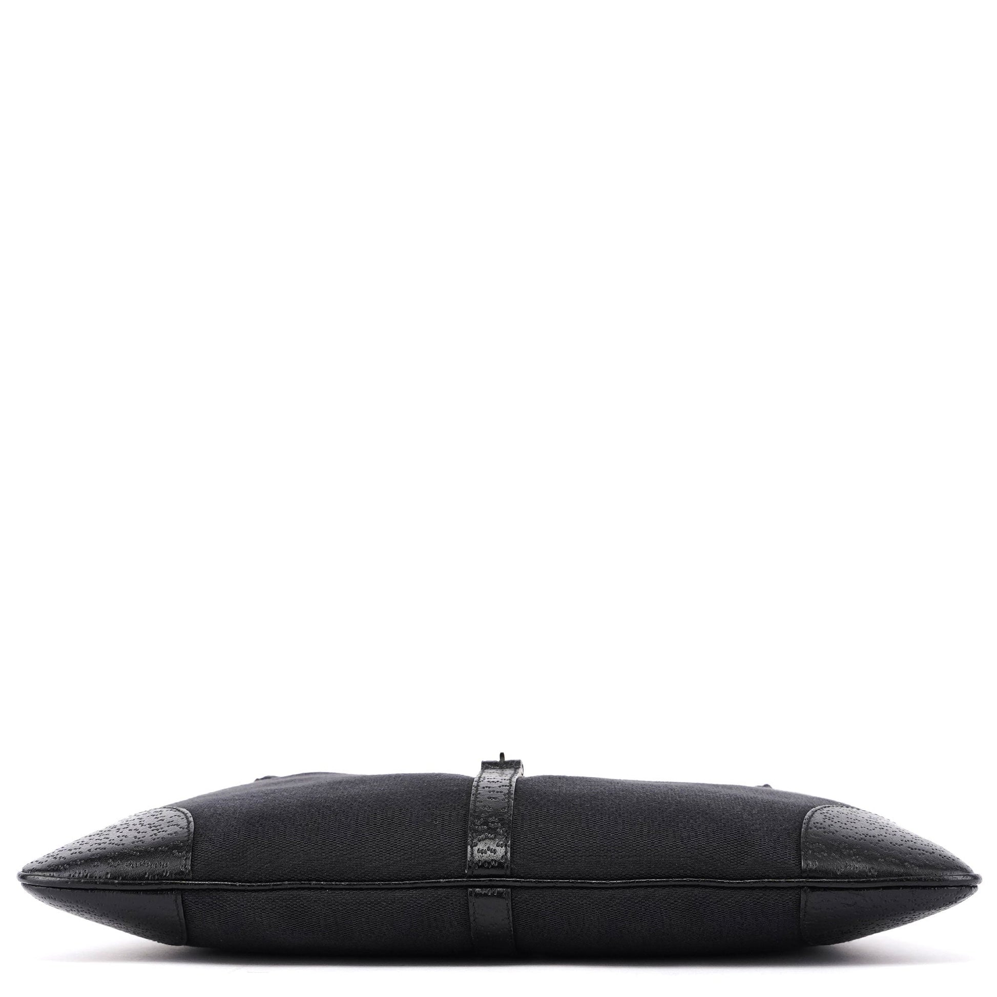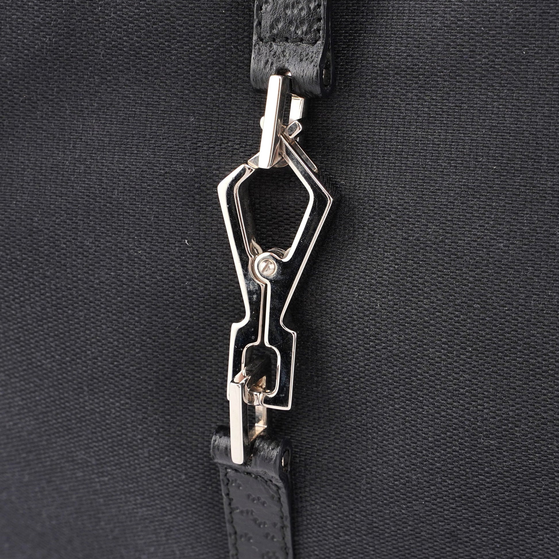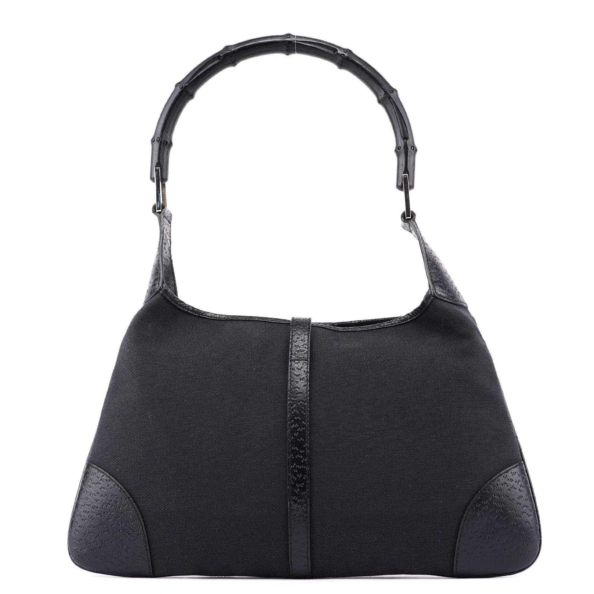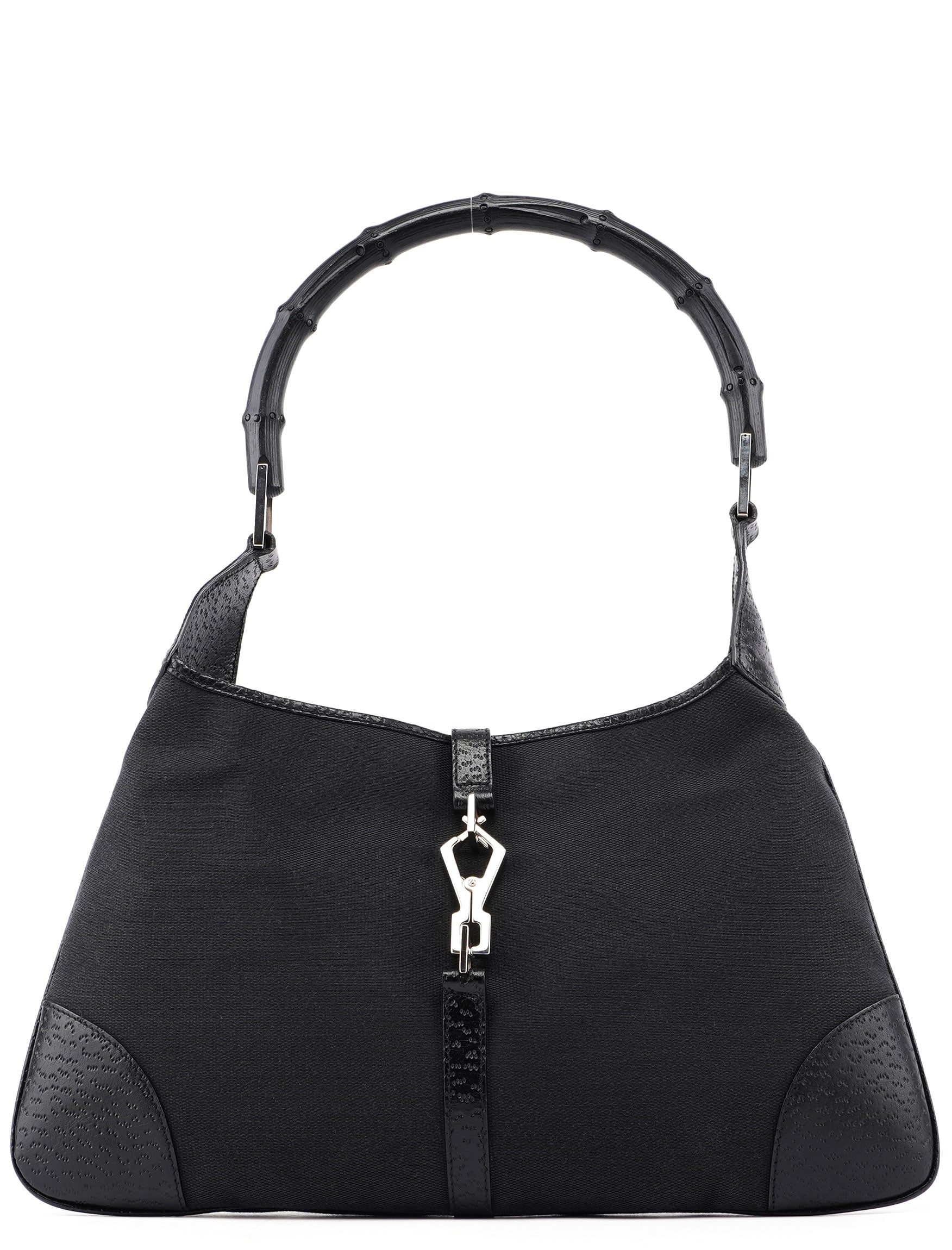 Designed by Tom Ford in the late 1990s, this Gucci Jackie Bamboo bag is handcrafted in black cotton canvas with tonal leather trim, accented by silver-tone hardware. It features a bamboo handle with Gucci logo engraving and the classic Jackie style closure. The interior, lined with satin and includes a zipper pocket.