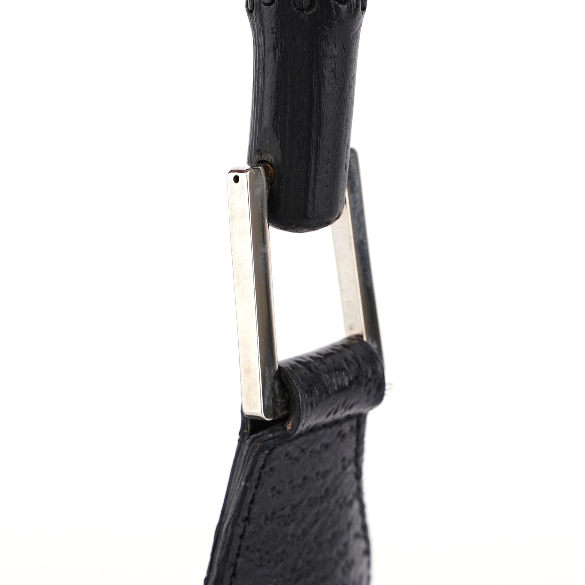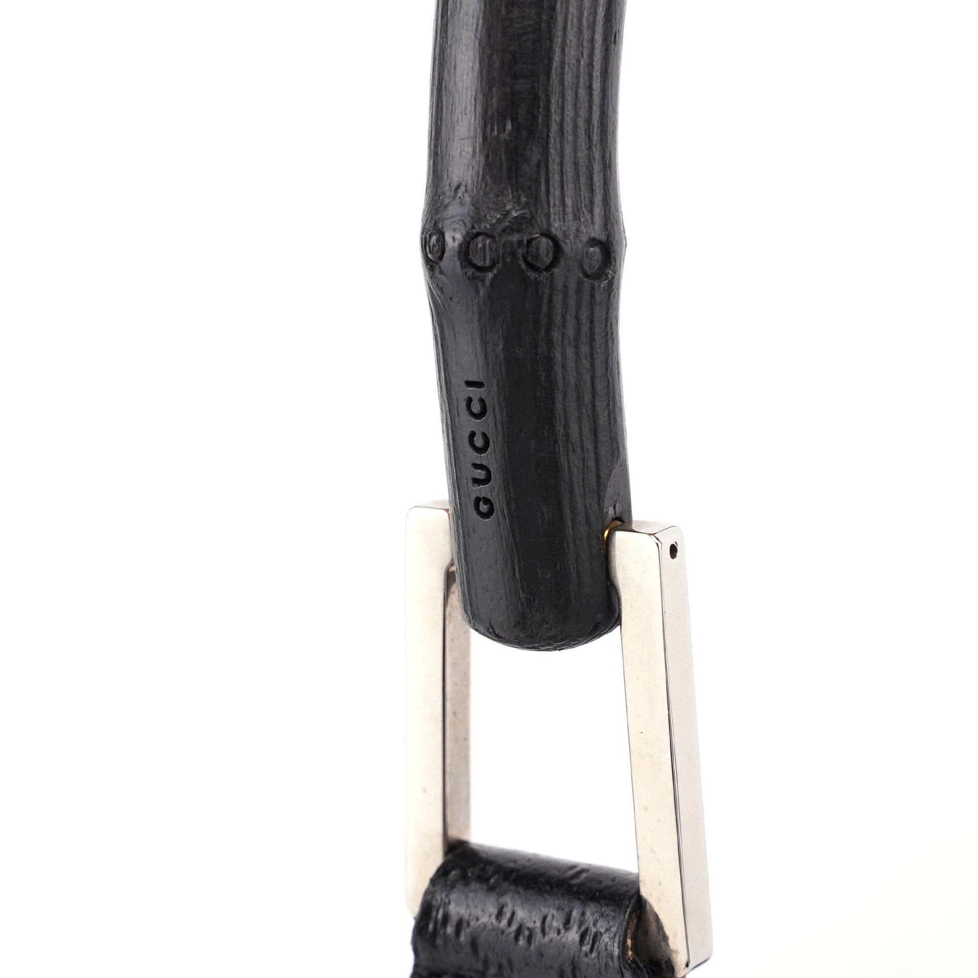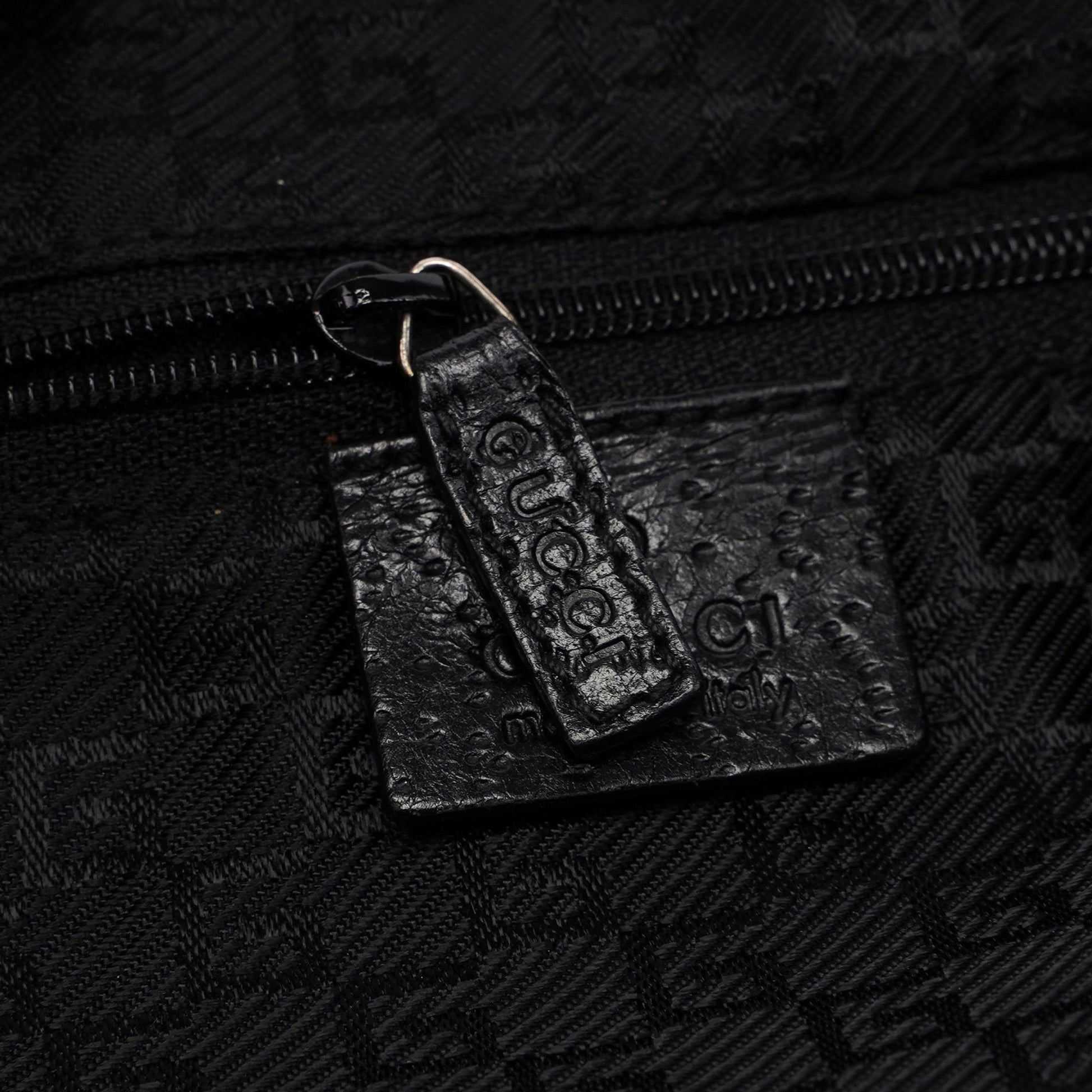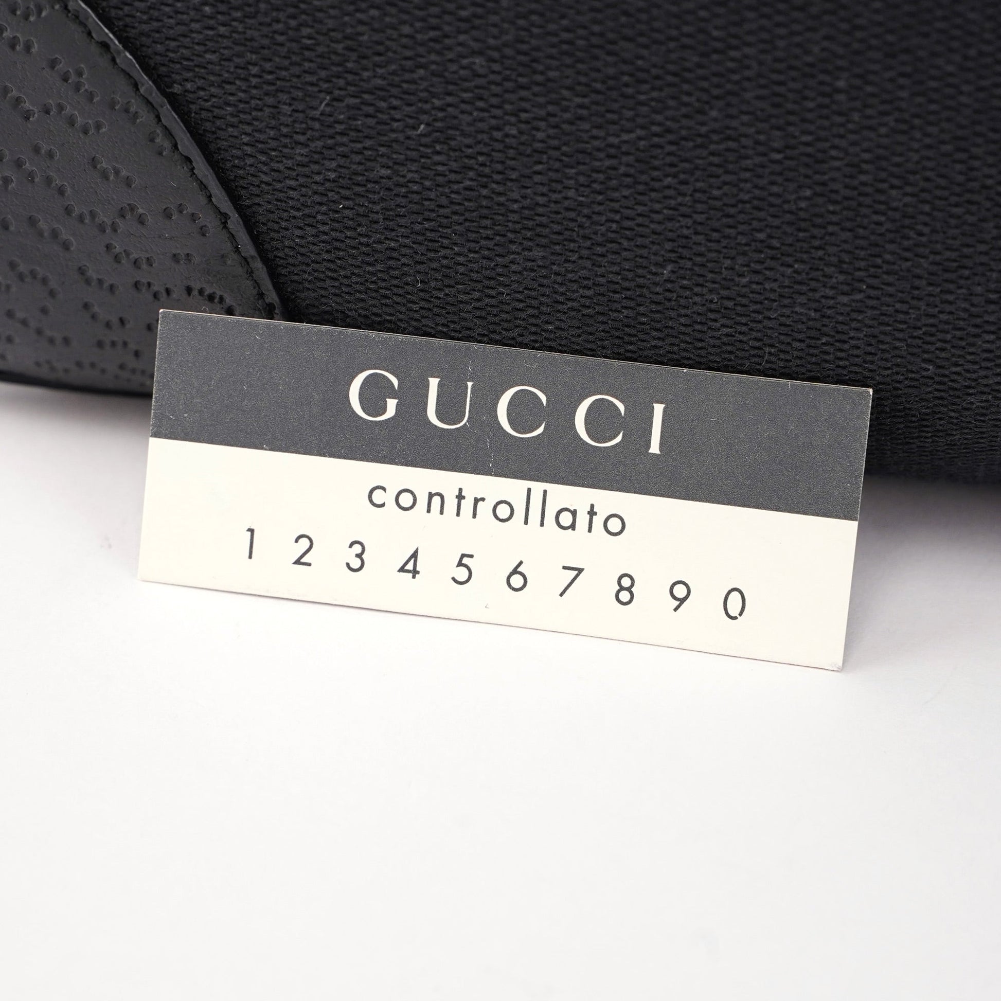 Designed by Tom Ford in the late 1990s, this Gucci Jackie Bamboo bag is handcrafted in black cotton canvas with tonal leather trim, accented by silver-tone hardware. It features a bamboo handle with Gucci logo engraving and the classic Jackie style closure. The interior, lined with satin and includes a zipper pocket.