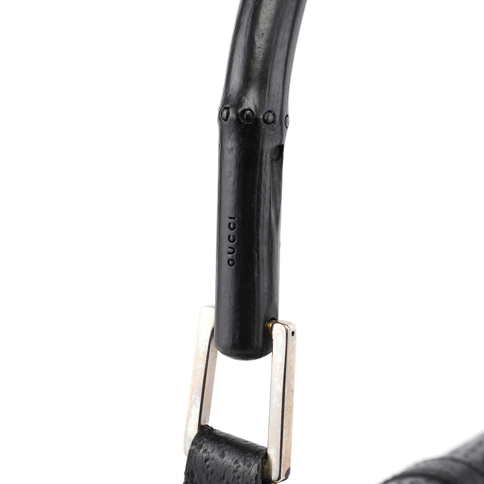 Designed by Tom Ford in the late 1990s, this Gucci Jackie Bamboo bag is handcrafted in black canvas with tonal leather trim and silver-tone hardware. It features a bamboo handle with Gucci logo engraving and a classic silver-tone Jackie style closure. The interior, lined with satin and includes an interior zipper pocket.