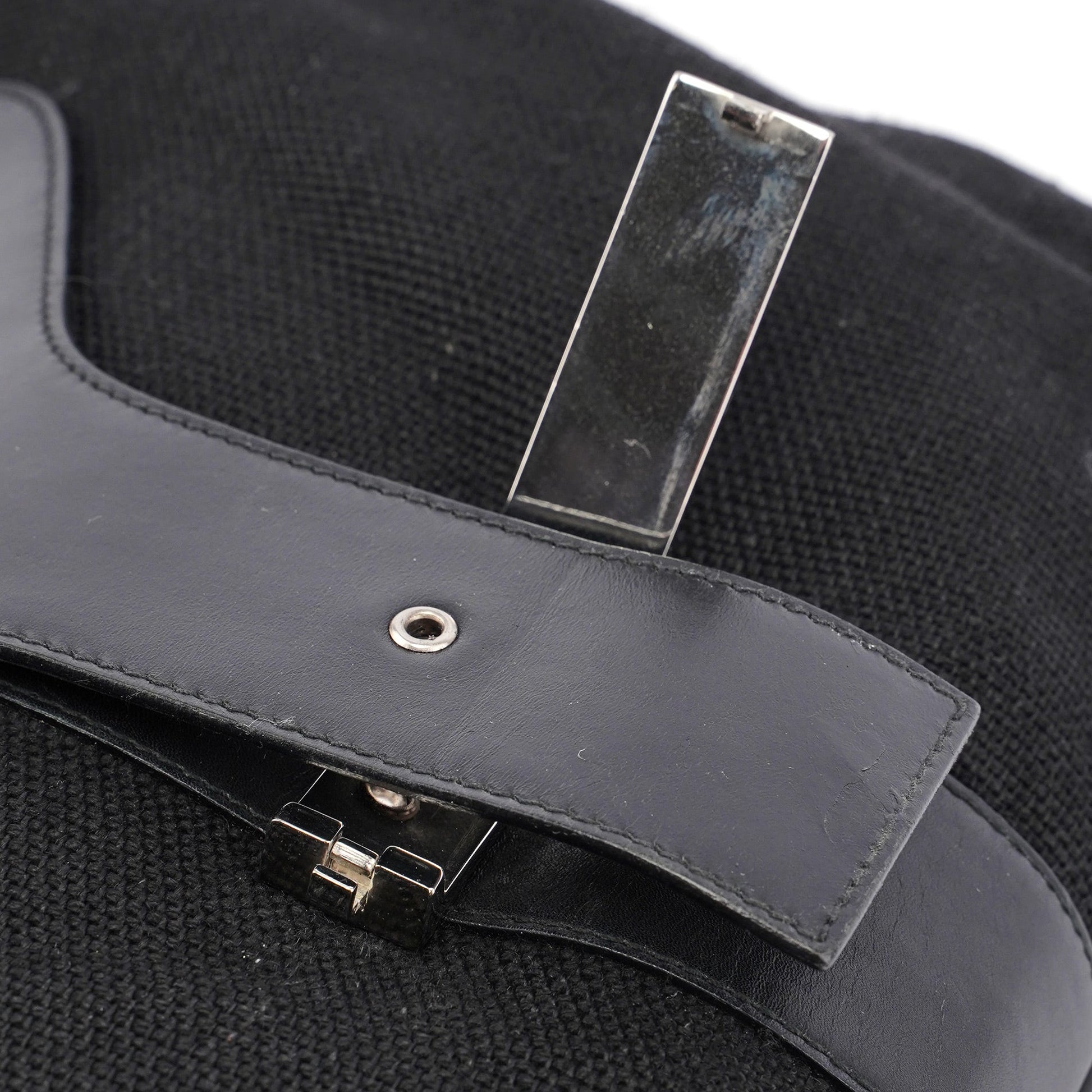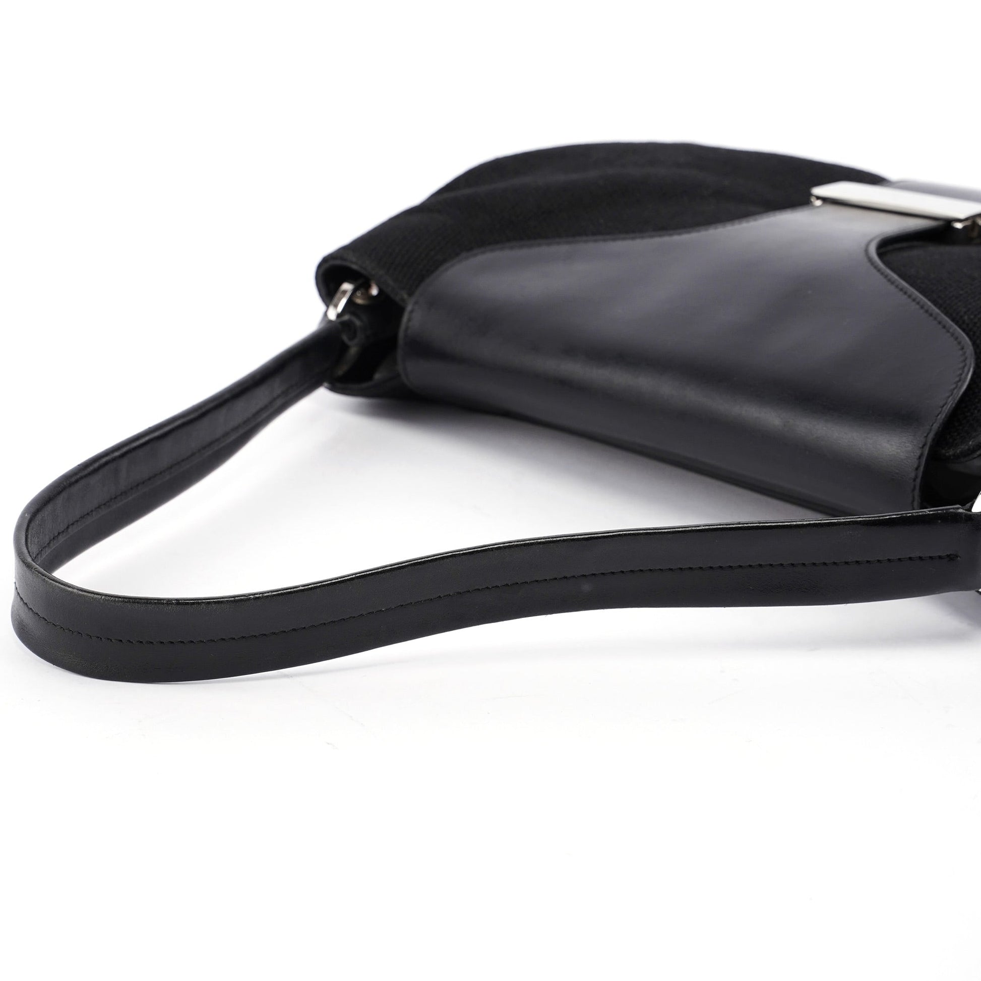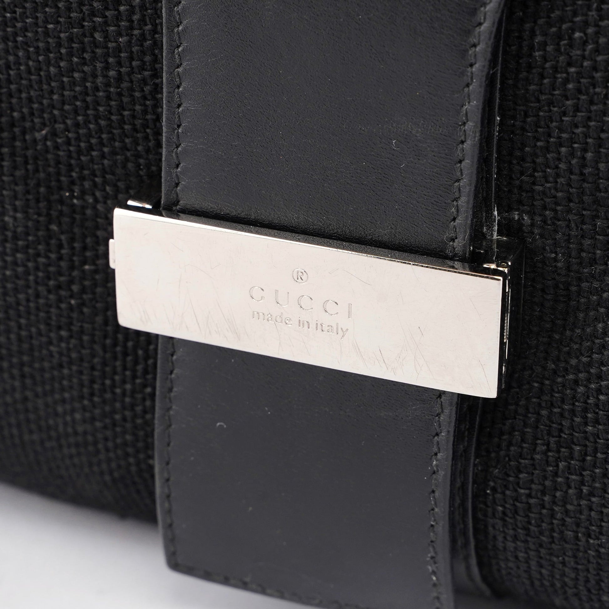 Introducing the Gucci Canvas Vitello handbag, a masterpiece by Tom Ford from the late 1990s. Crafted with black canvas and calfskin leather, adorned with silver-tone hardware engraved with the iconic Gucci logo. Its satin-lined interior boasts a convenient zipper pocket for essentials.