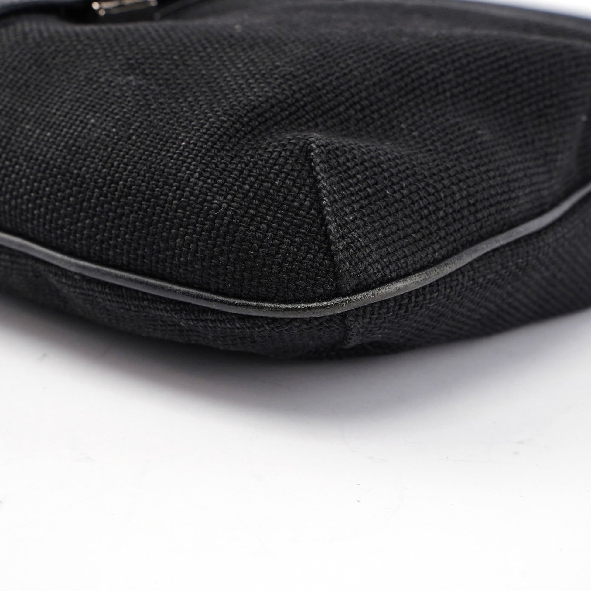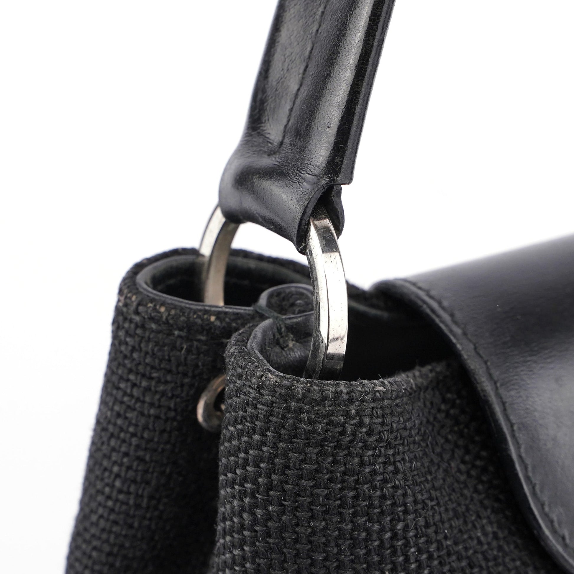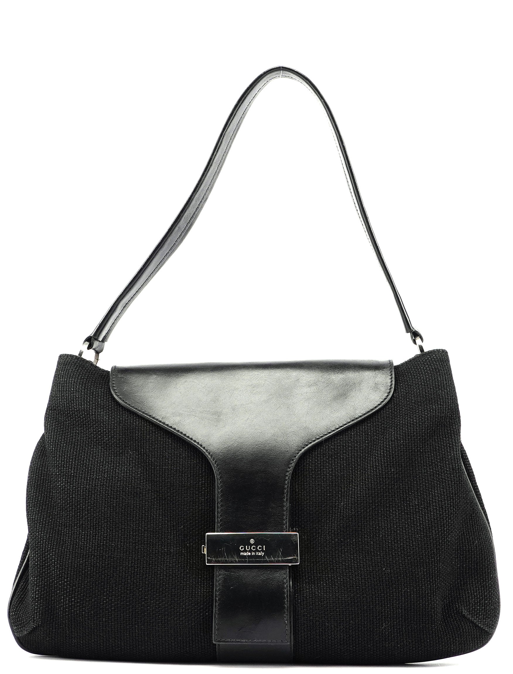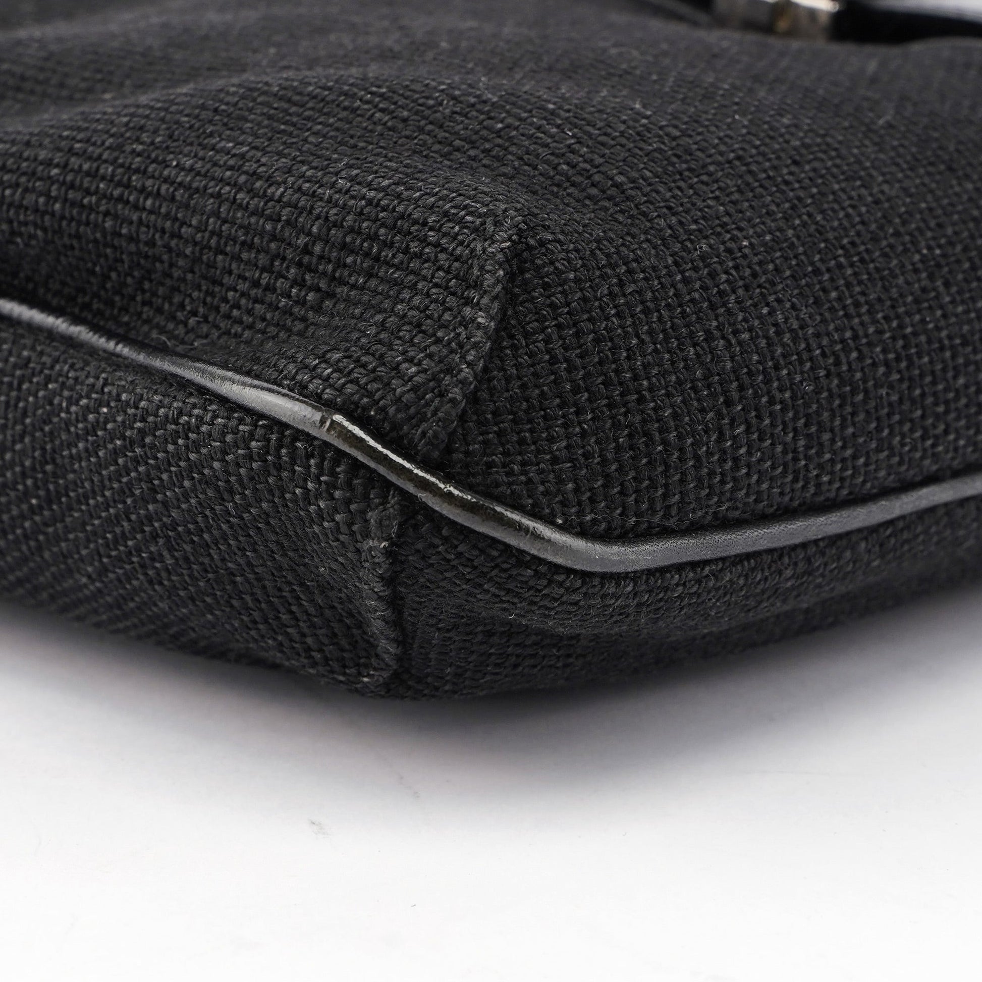 Introducing the Gucci Canvas Vitello handbag, a masterpiece by Tom Ford from the late 1990s. Crafted with black canvas and calfskin leather, adorned with silver-tone hardware engraved with the iconic Gucci logo. Its satin-lined interior boasts a convenient zipper pocket for essentials.