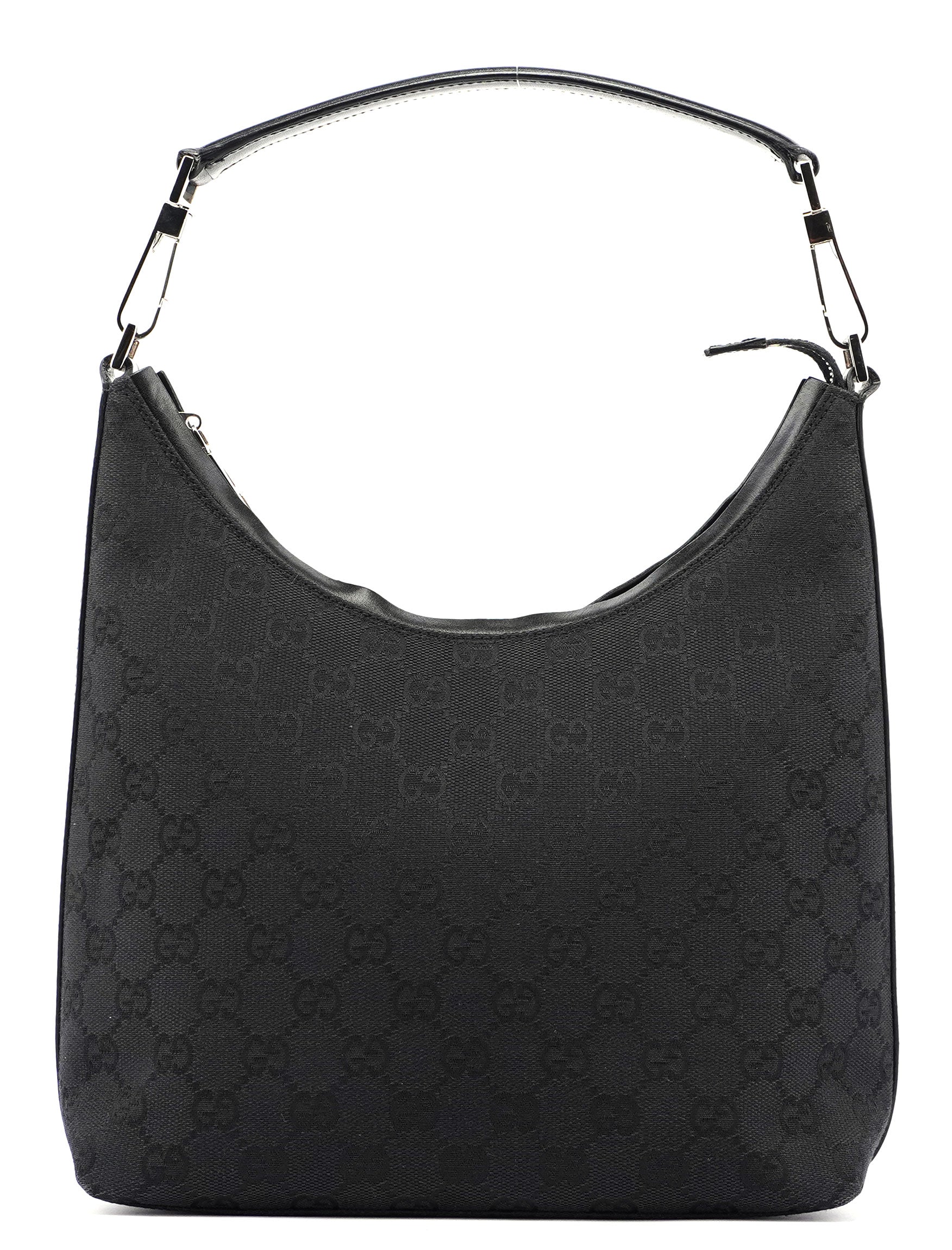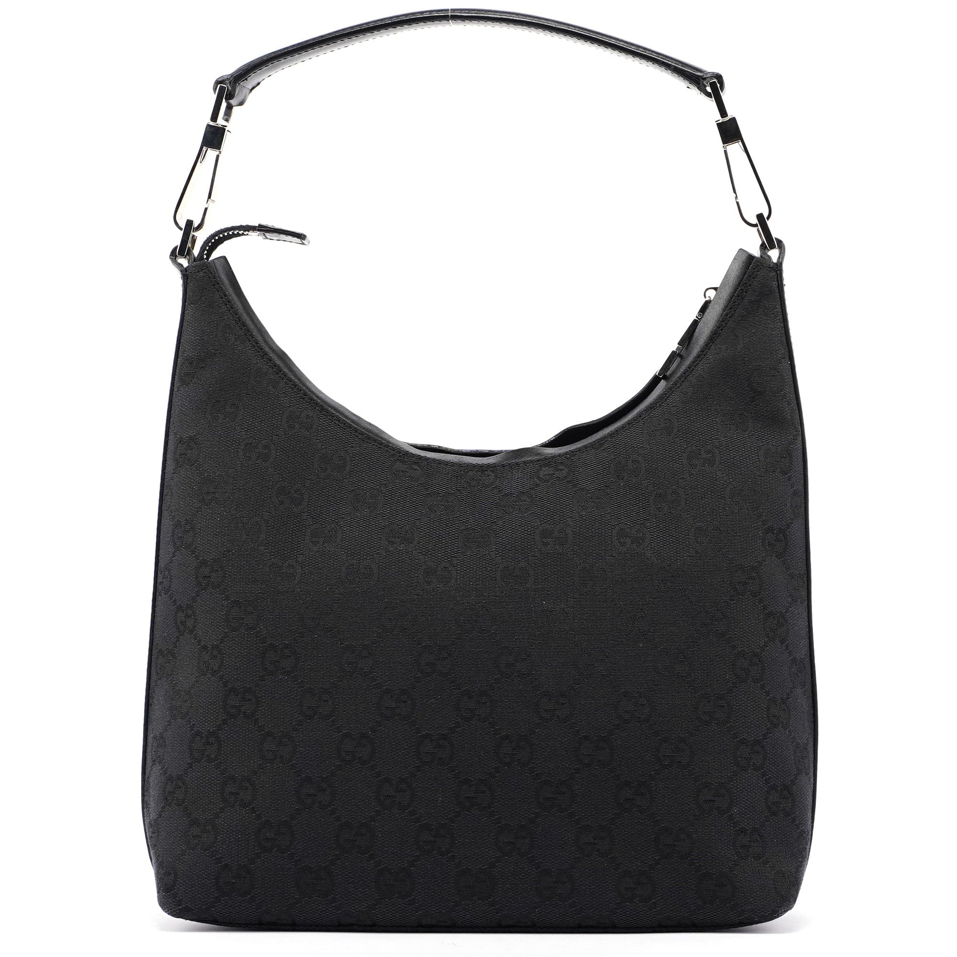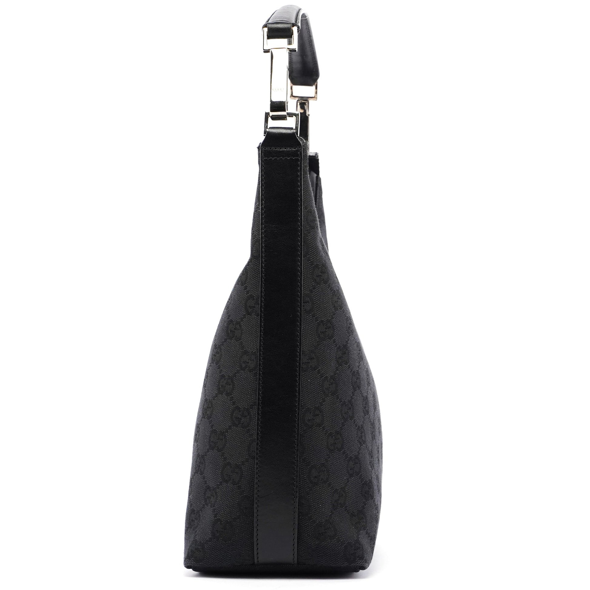 Unveil the elegance of the Gucci GG canvas shoulder bag, designed by Tom Ford in the late 1990s. This luxurious piece features silver-tone hardware with engraved Gucci logo, complemented by black calfskin leather trim. A zipper closure secures the satin-lined interior, making it a perfect fusion of timeless design and modern sophistication.