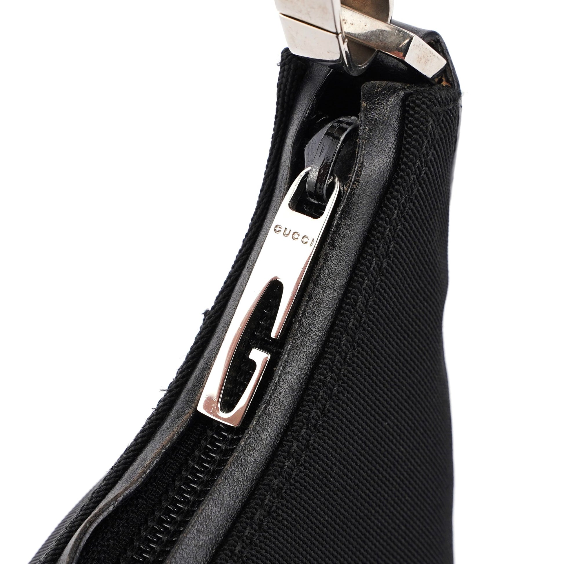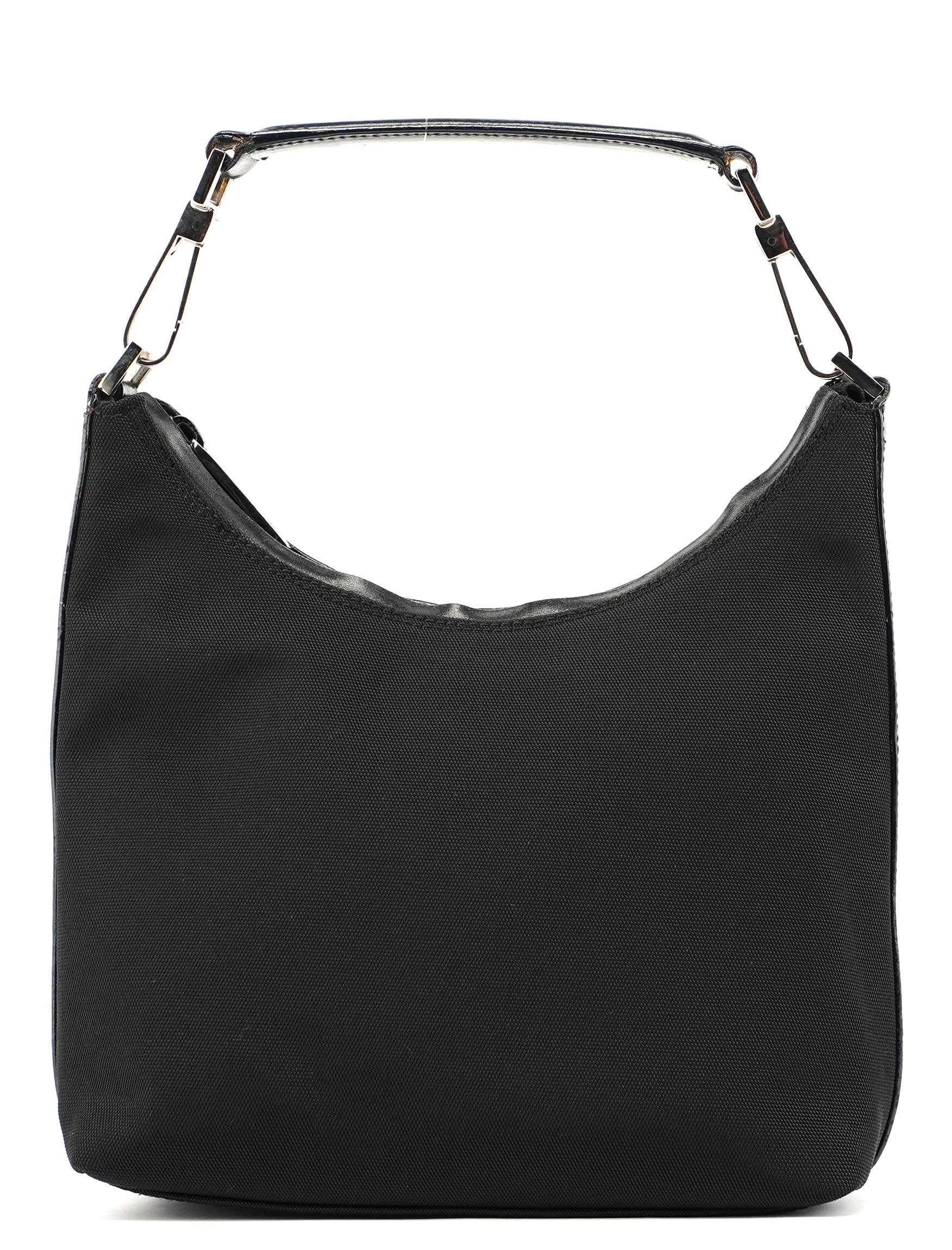 Handcrafted from black canvas and tonal leather, this Gucci Hobo bag by Tom Ford from the late 1990s features silver-tone hardware engraved with the Gucci logo, a zipper closure, and a cotton-lined interior with an interior pocket, showcasing timeless elegance.