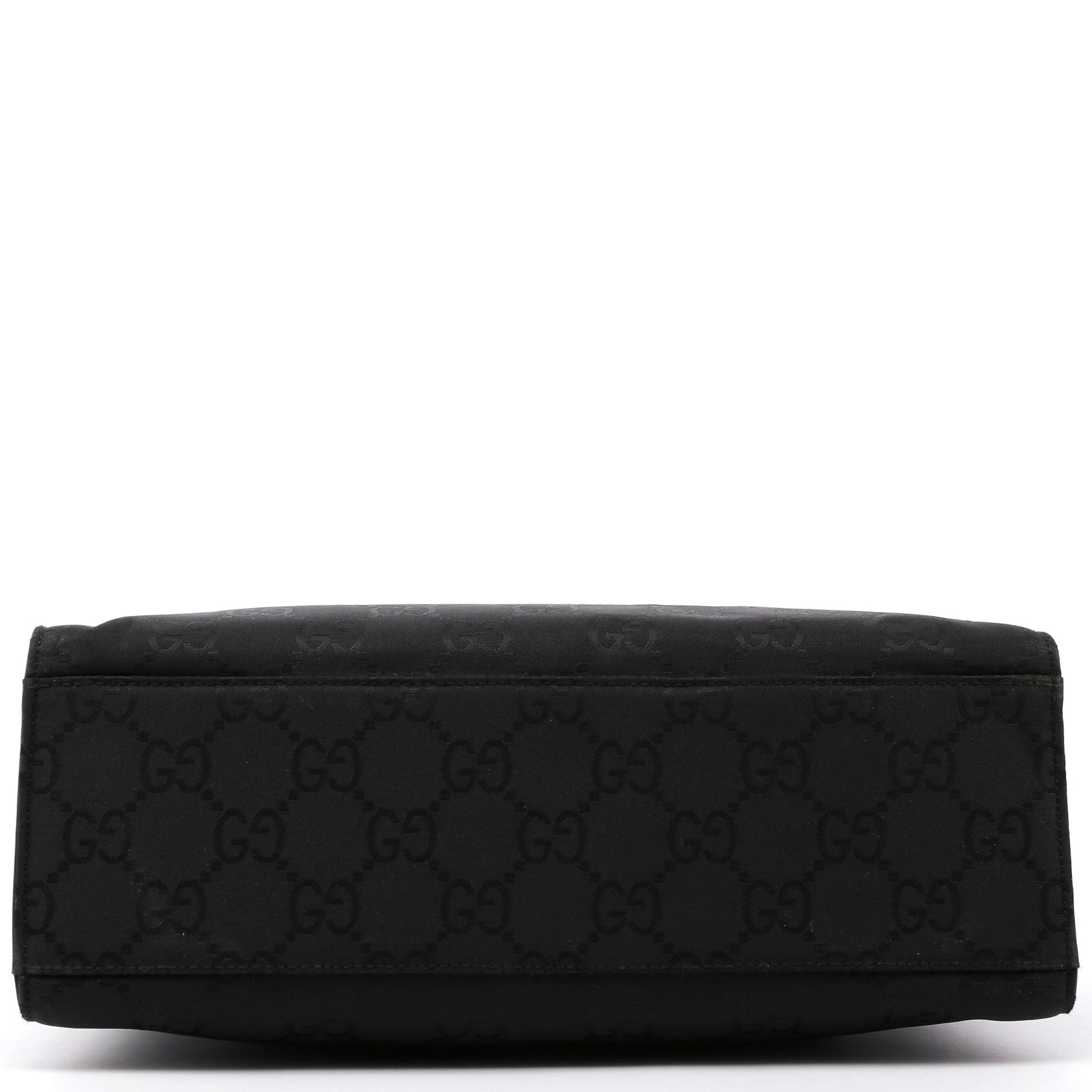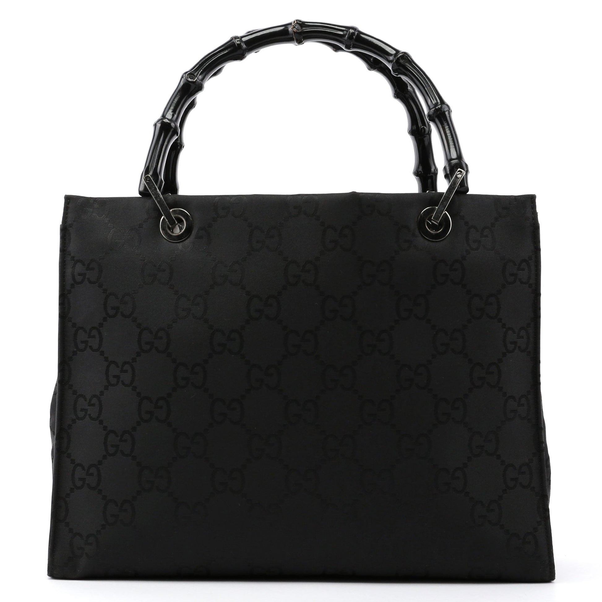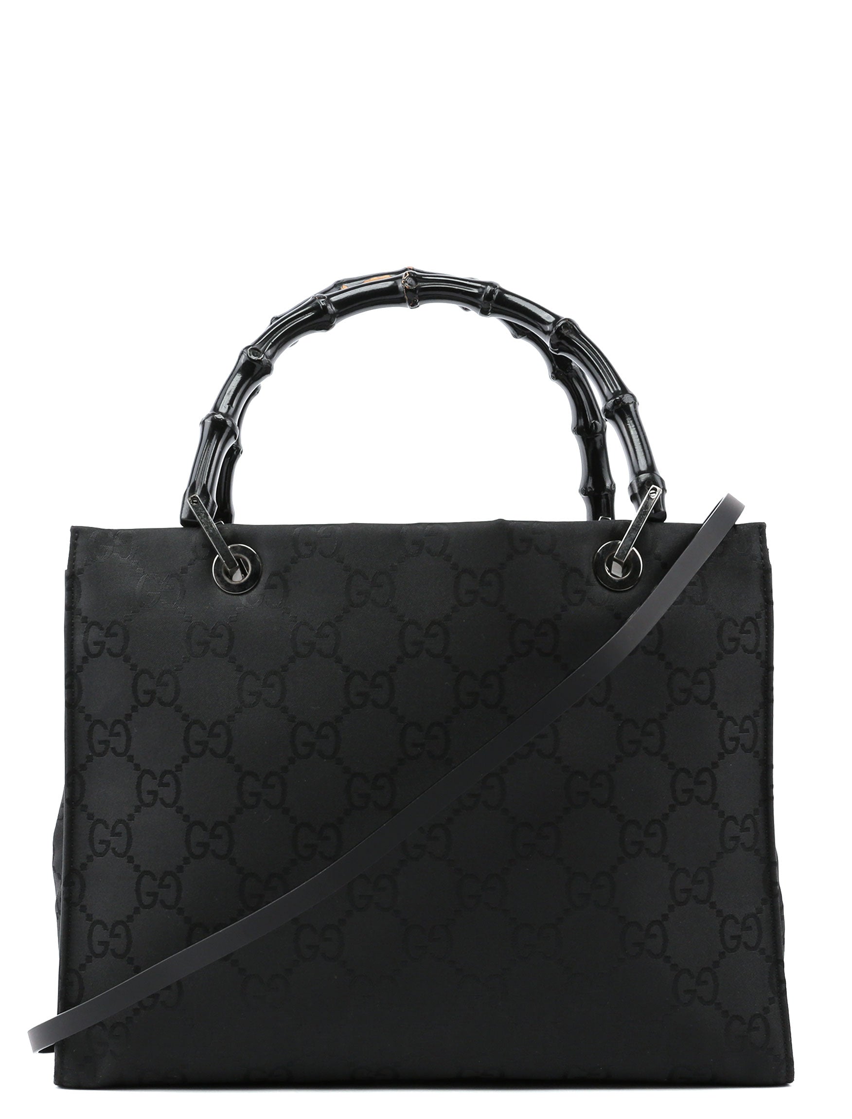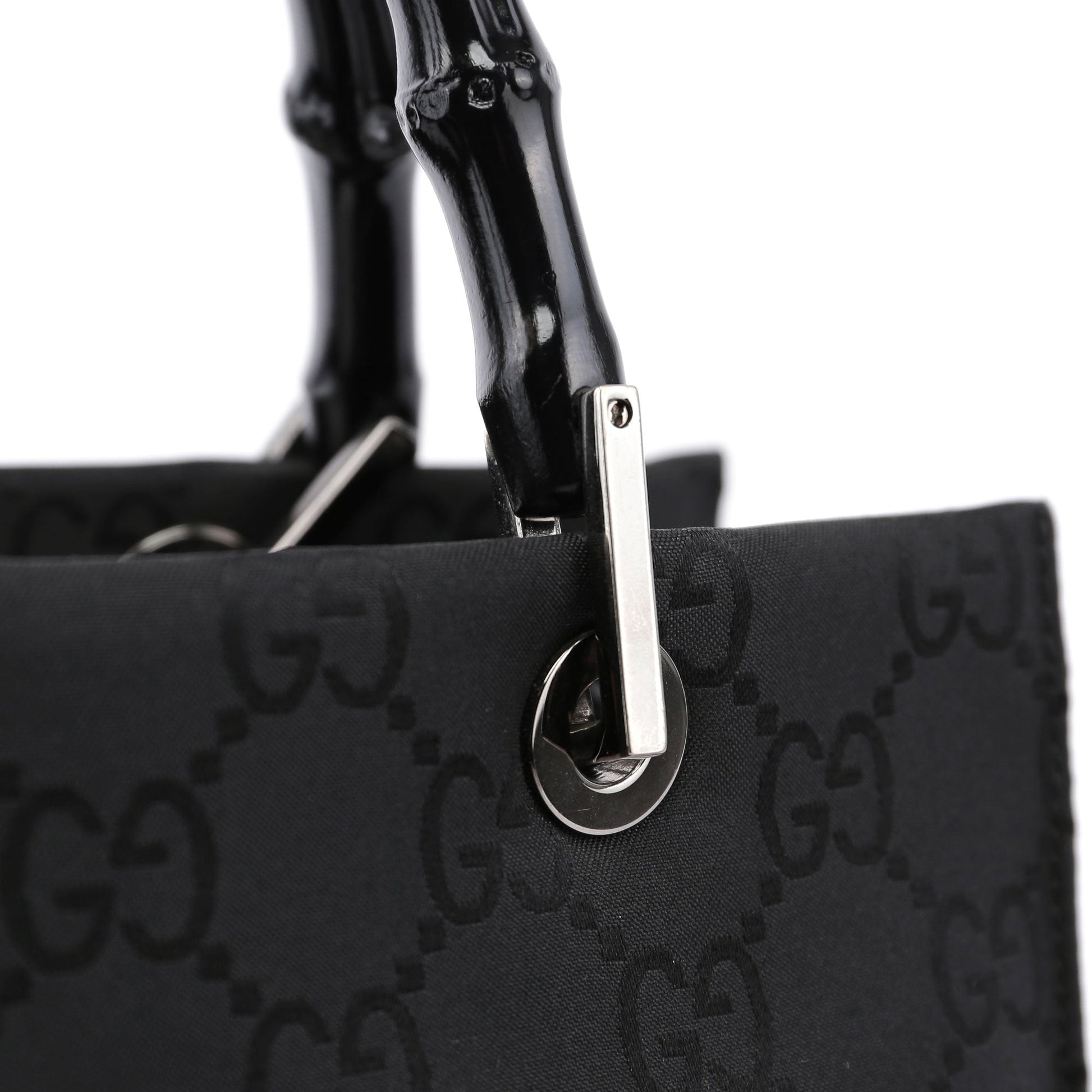 Designed by Tom Ford in the late 1990s, this Gucci Bamboo GG 2-Way tote bag features two elegant black bamboo handles and silver-tone hardware. Crafted with the iconic GG monogram canvas, it offers three interior compartments lined with satin, including an interior zipper pocket for organized storage, blending luxurious design with practical functionality. The bag also comes with a detachable shoulder strap for additional styling options.