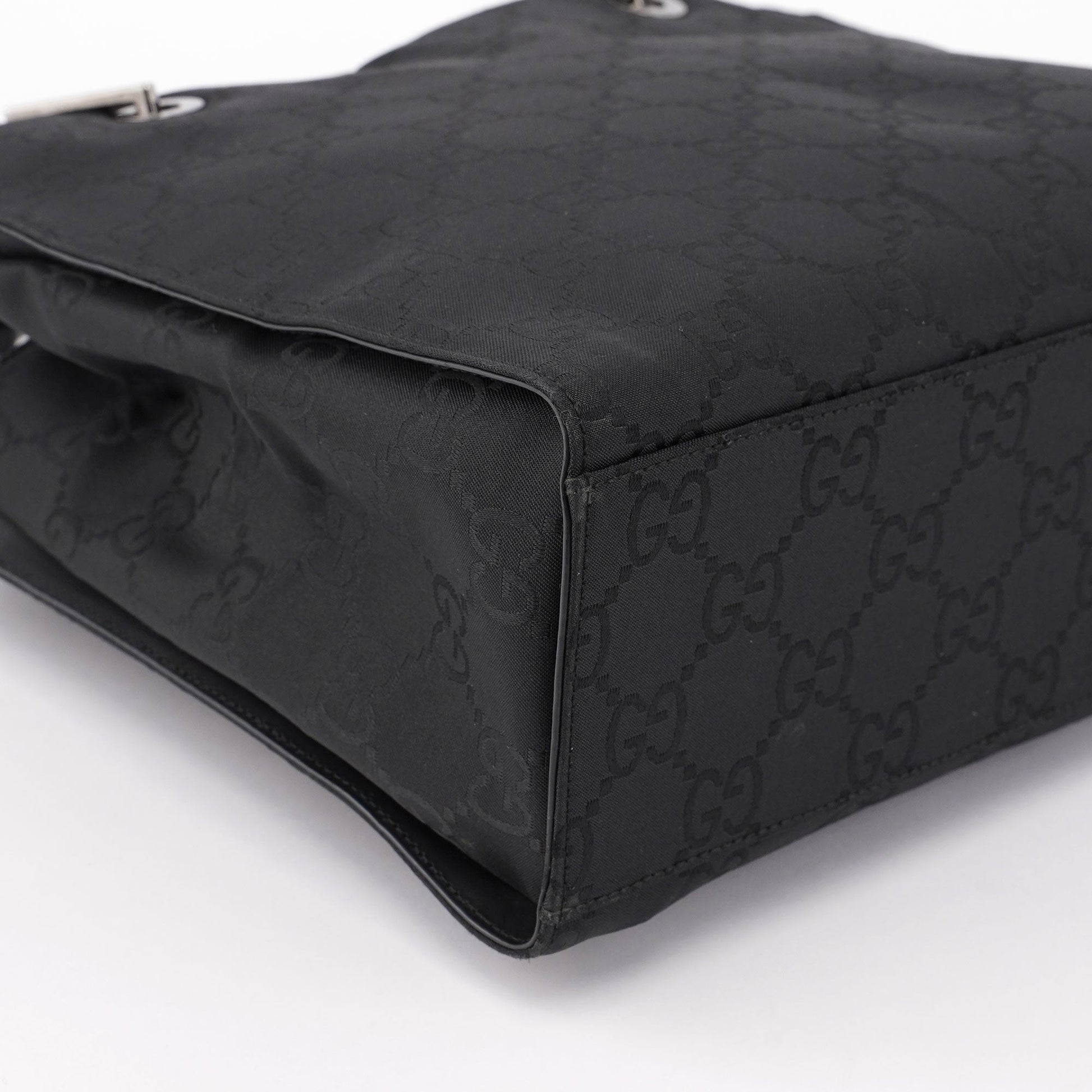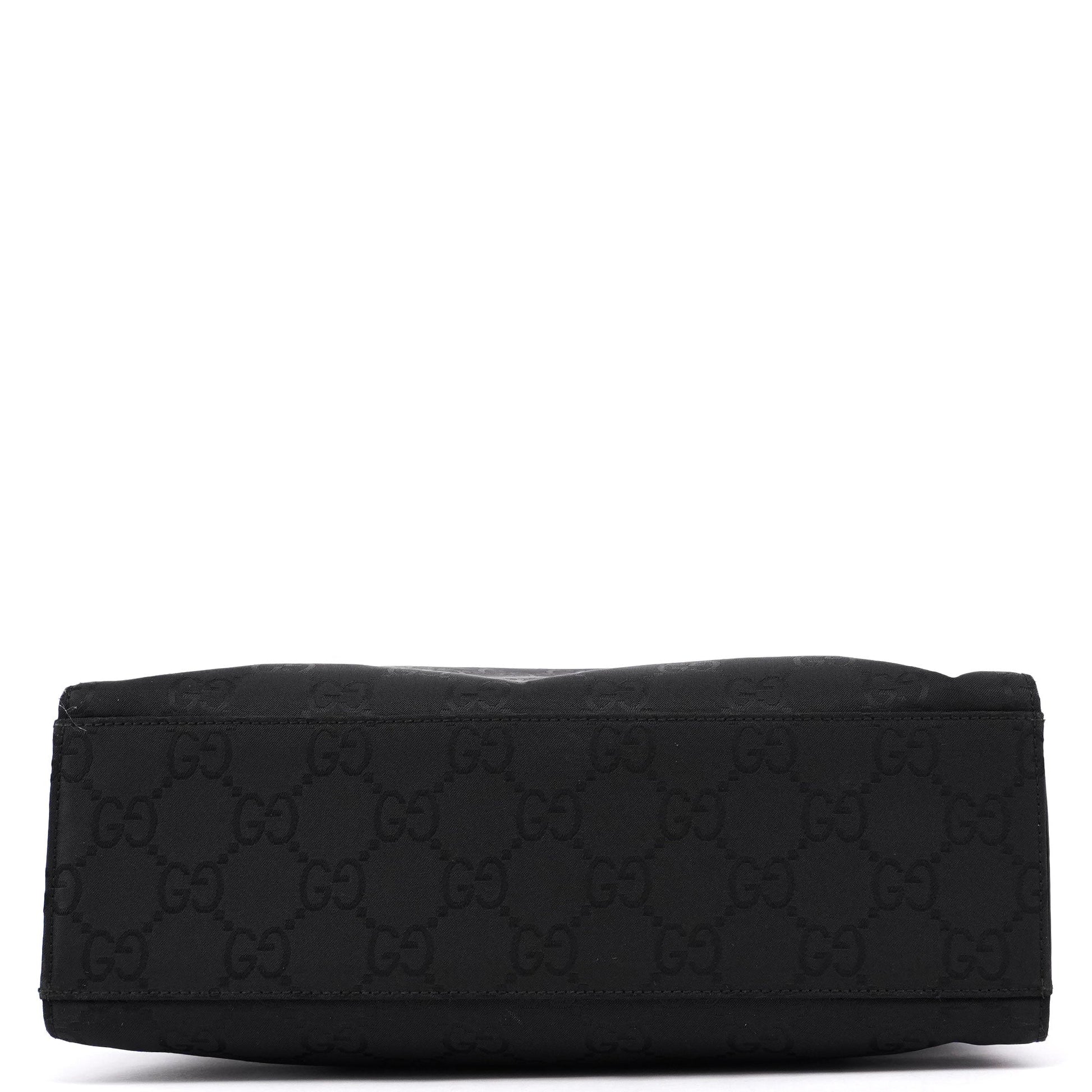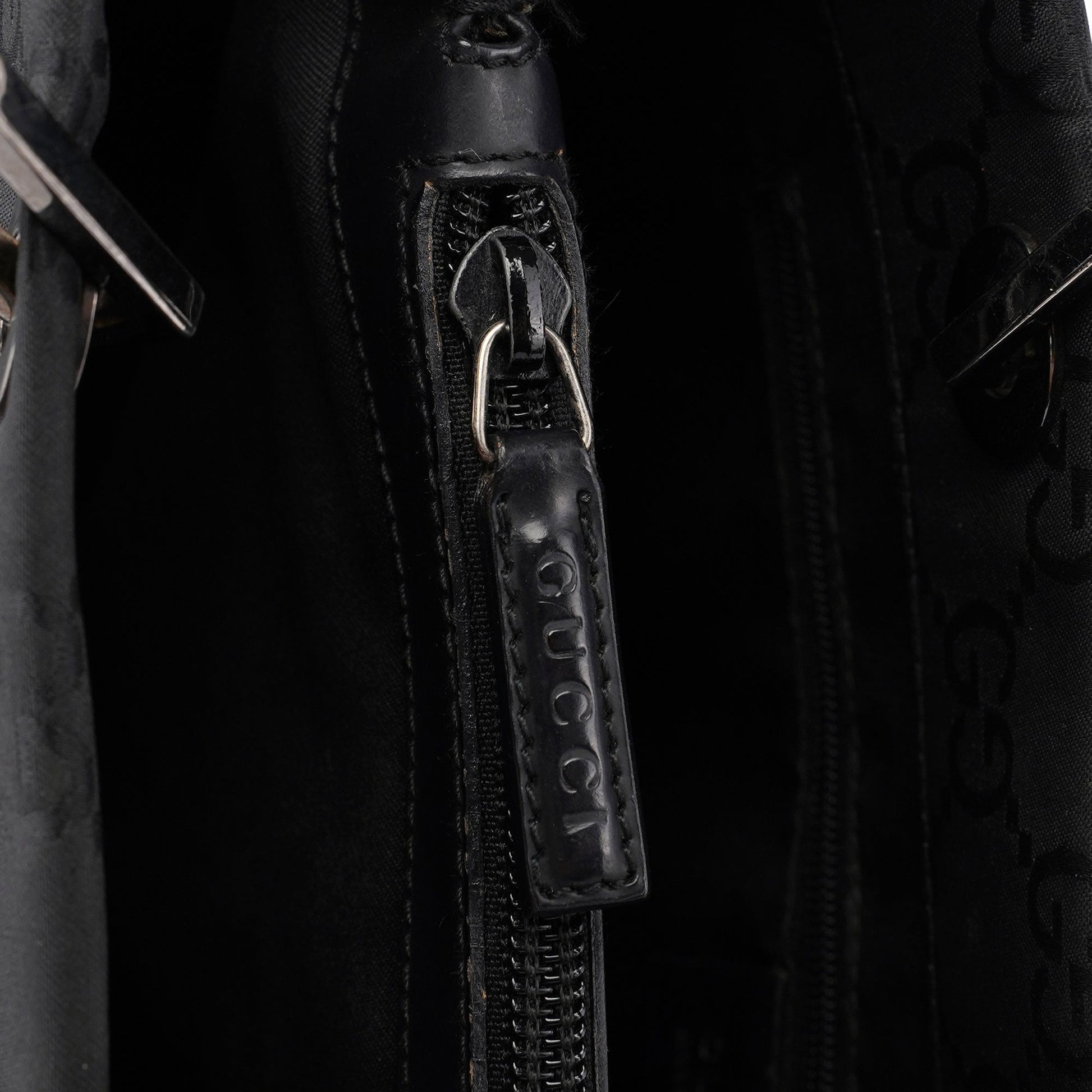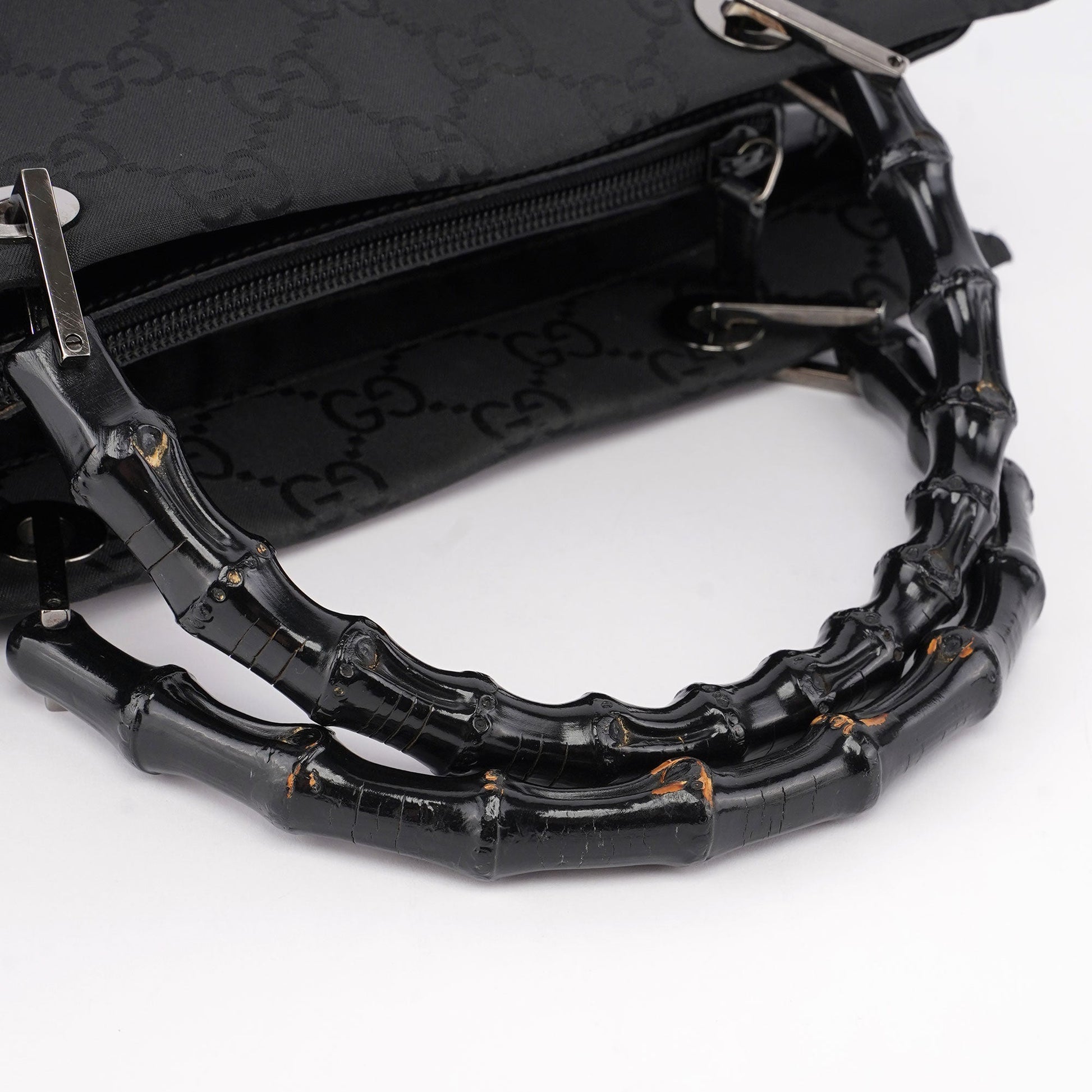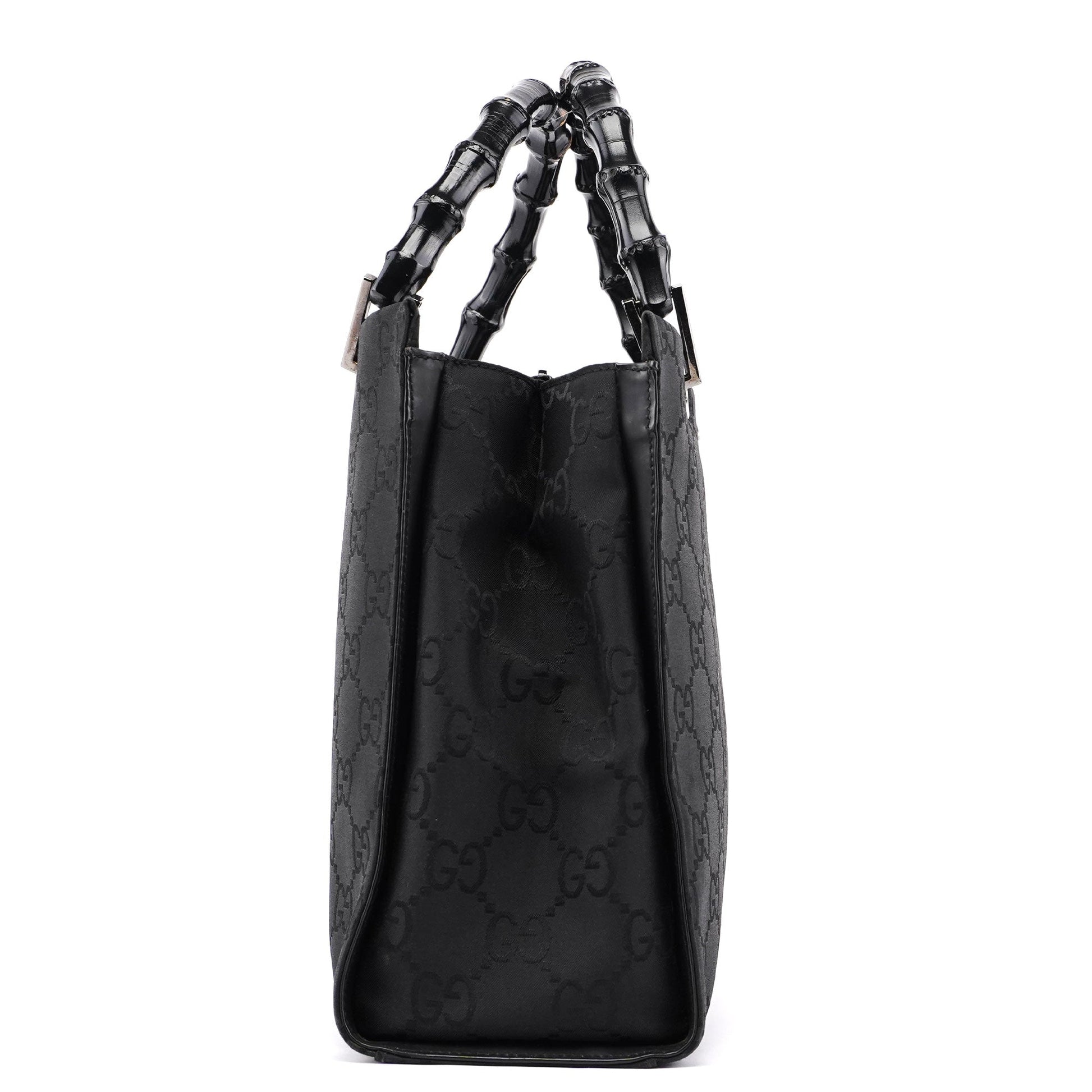 Designed by Tom Ford in the late 1990s, this Gucci Bamboo GG tote bag features two elegant black bamboo handles and silver-tone hardware. Crafted with the iconic GG monogram canvas, it offers three interior compartments lined with satin, including an interior zipper pocket for organized storage, blending luxurious design with practical functionality.