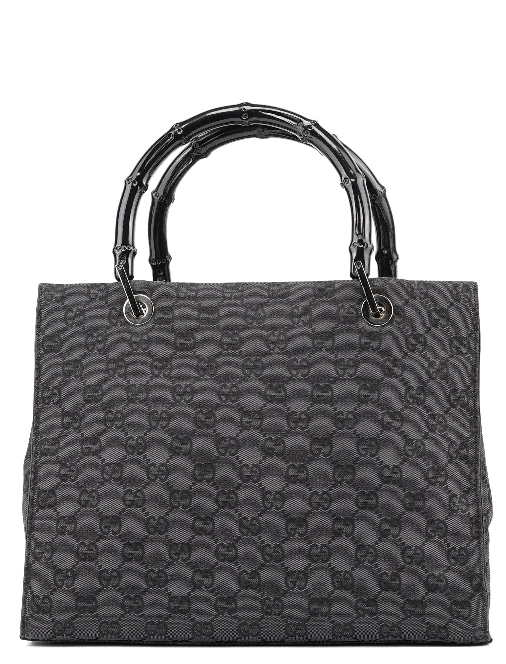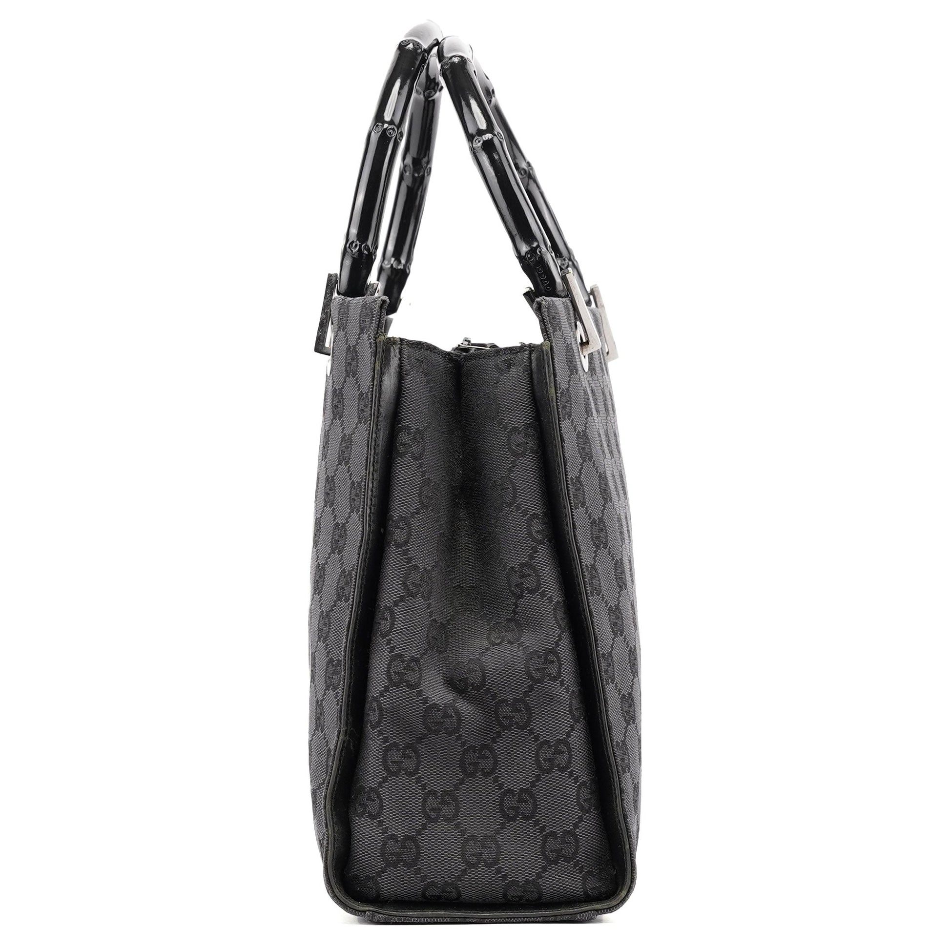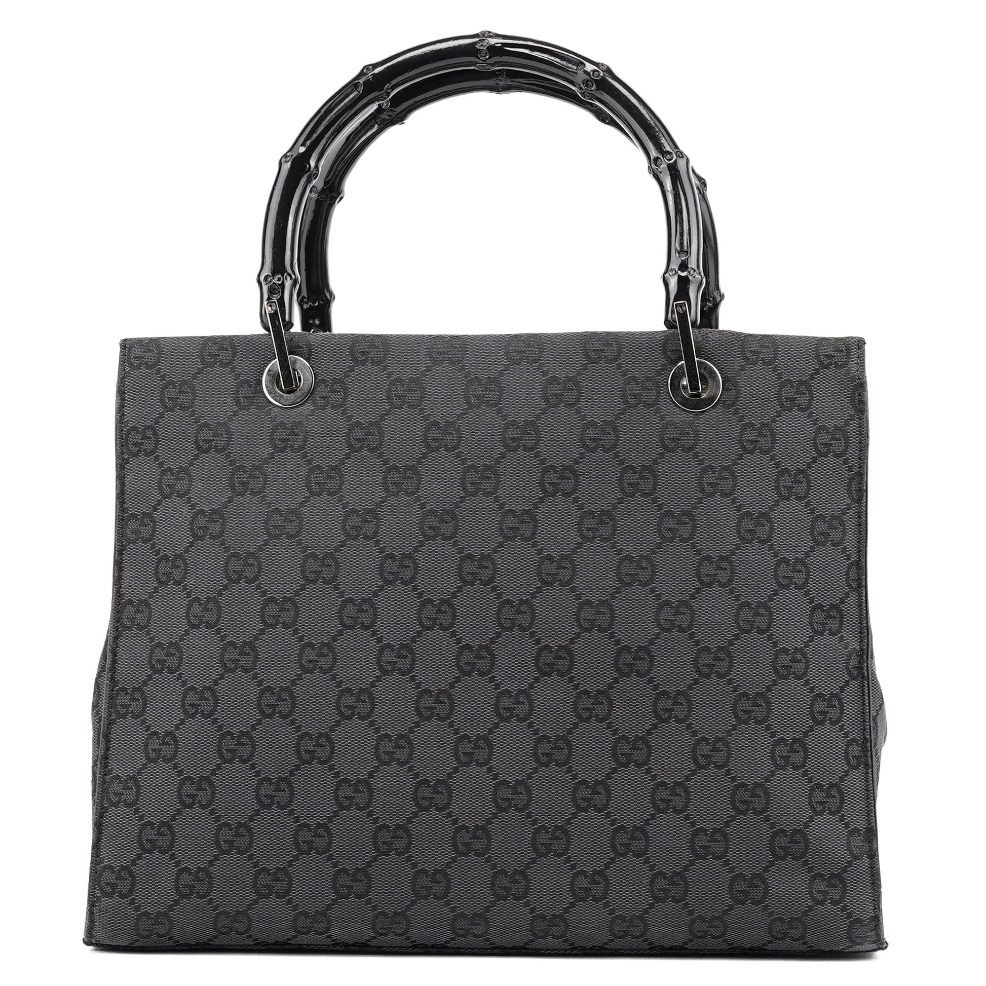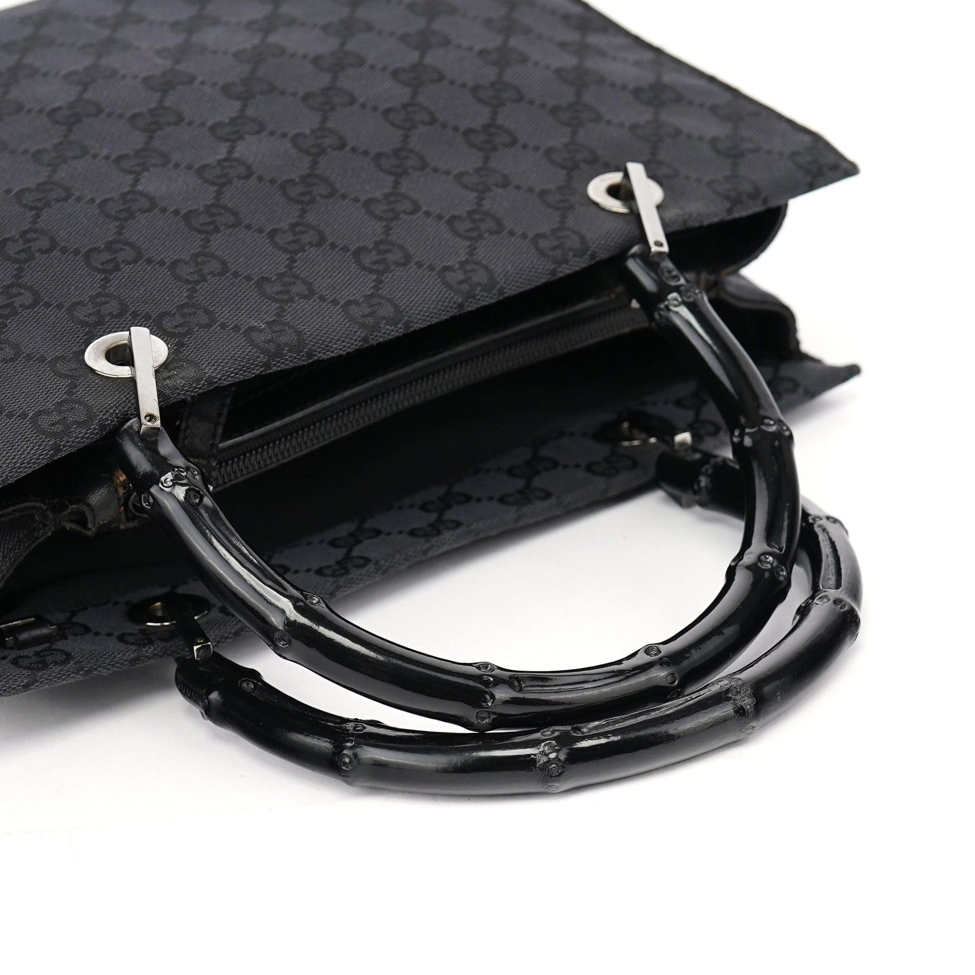 Designed by Tom Ford in the late 1990s, this Gucci Bamboo GG tote bag features two elegant black bamboo handles, a detachable strap and silver-tone hardware. Crafted with the iconic GG monogram canvas, it offers three interior compartments lined with satin, including an interior zipper pocket for organized storage, blending luxurious design with practical functionality.