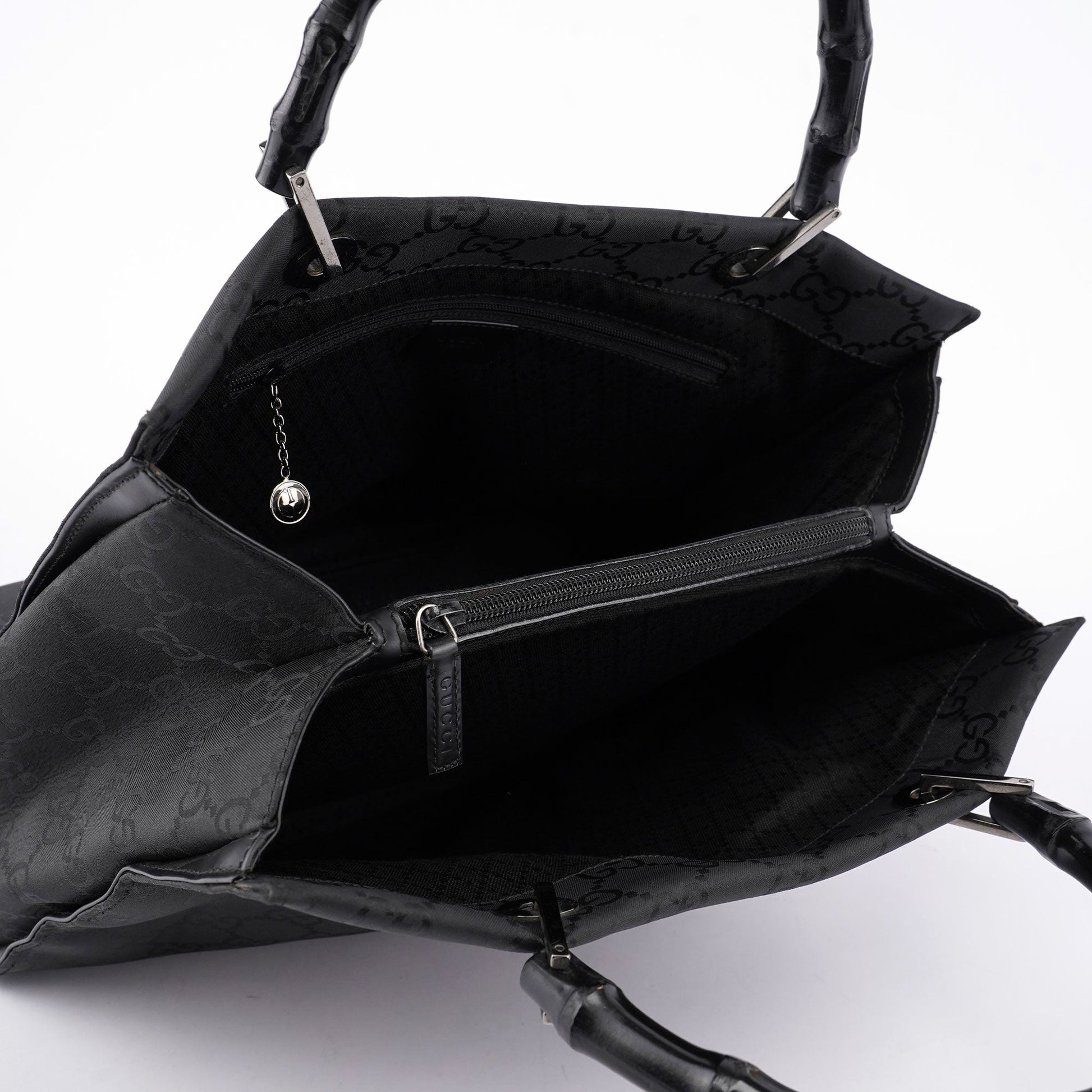 Designed by Tom Ford in the late 1990s, this Gucci Bamboo GG tote bag features two elegant black bamboo handles and silver-tone hardware. Crafted with the iconic GG monogram canvas, it offers three interior compartments lined with satin, including an interior zipper pocket for organized storage, blending luxurious design with practical functionality.