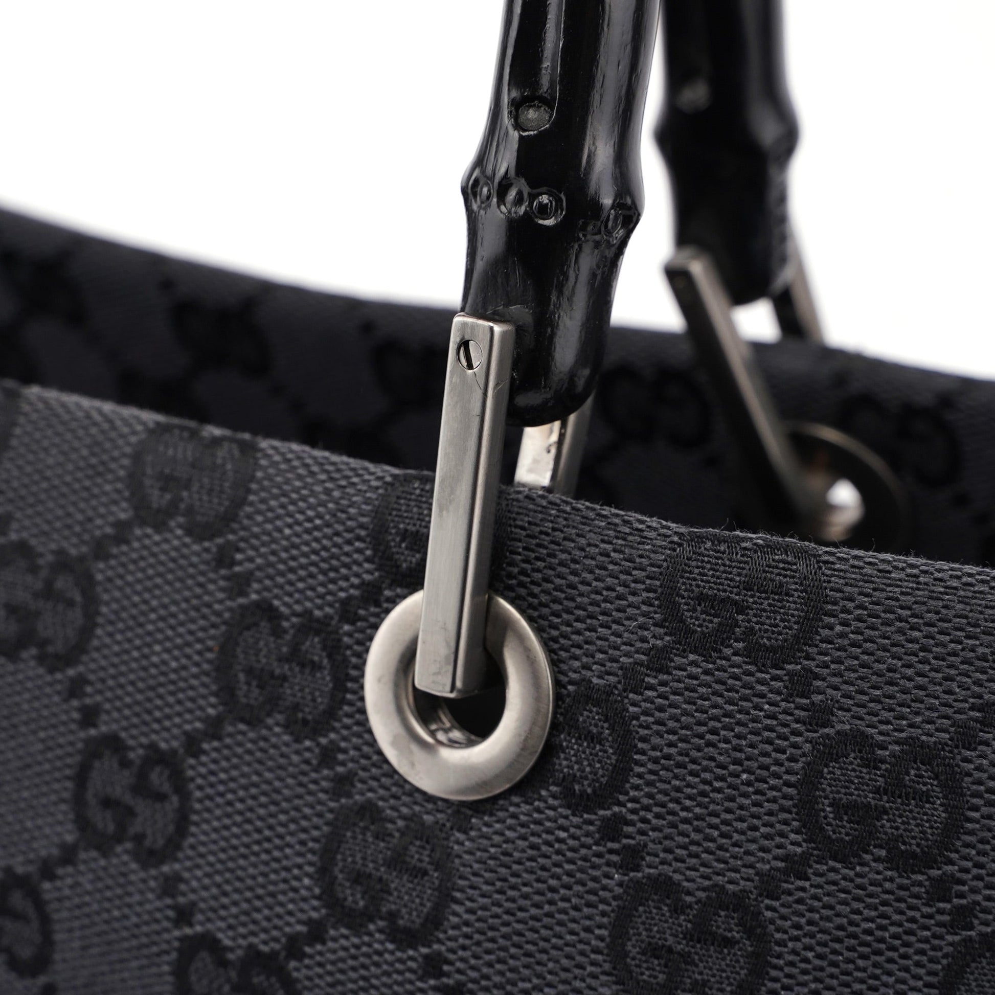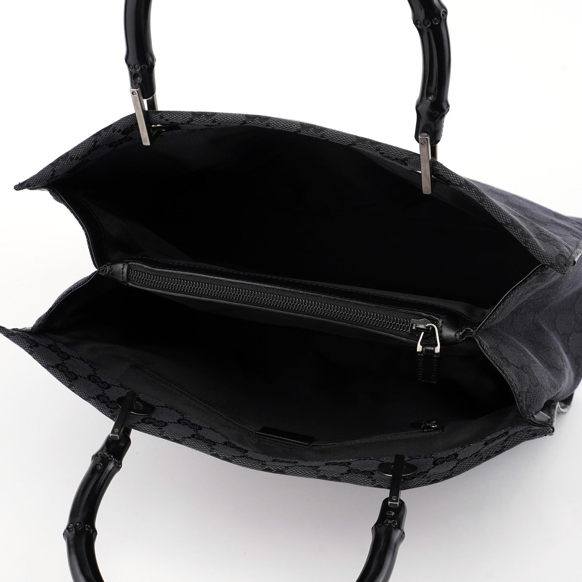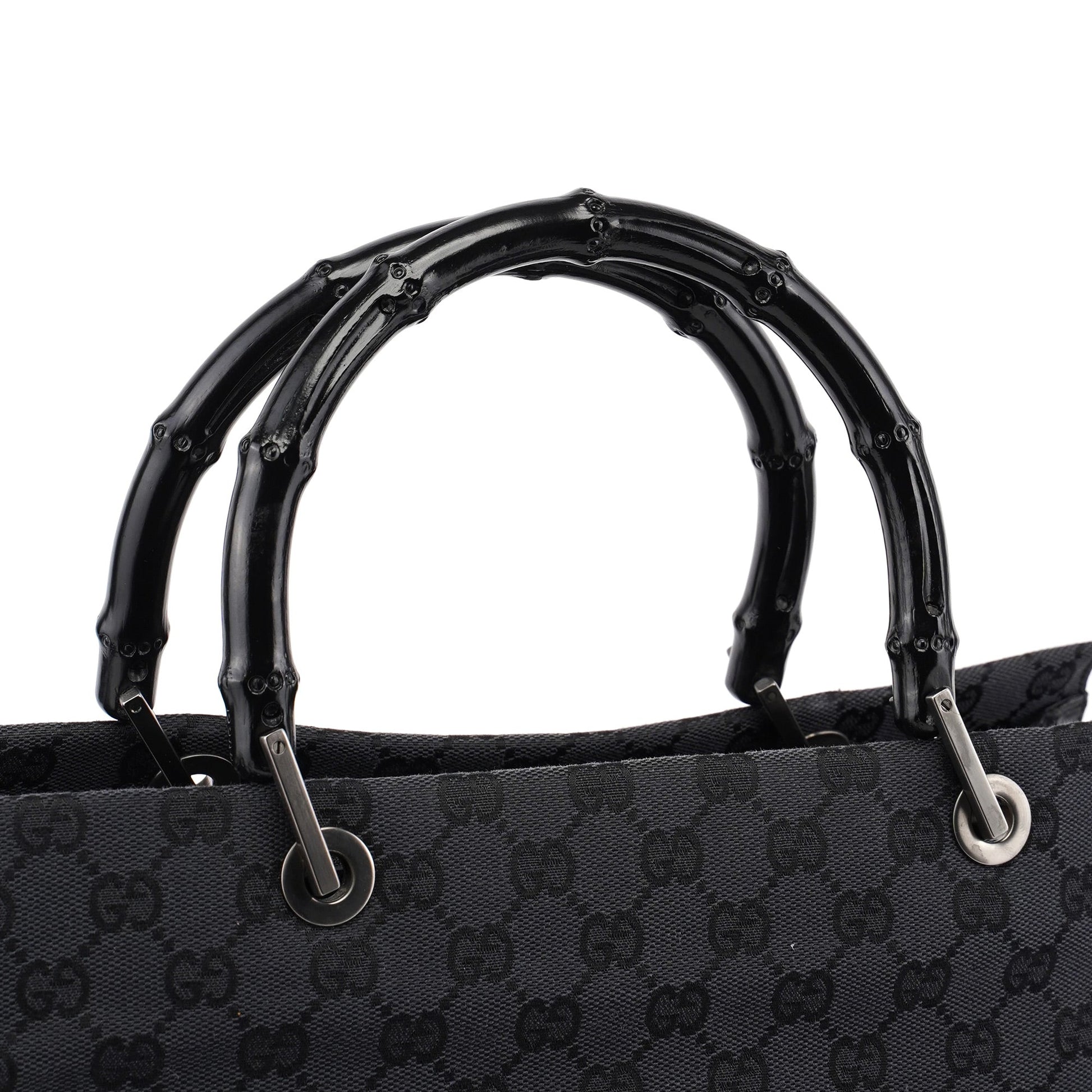 Designed by Tom Ford in the late 1990s, this Gucci Bamboo GG tote bag features two elegant black bamboo handles and silver-tone hardware. Crafted with the iconic GG monogram canvas, it offers three interior compartments lined with satin, including an interior zipper pocket for organized storage, blending luxurious design with practical functionality.