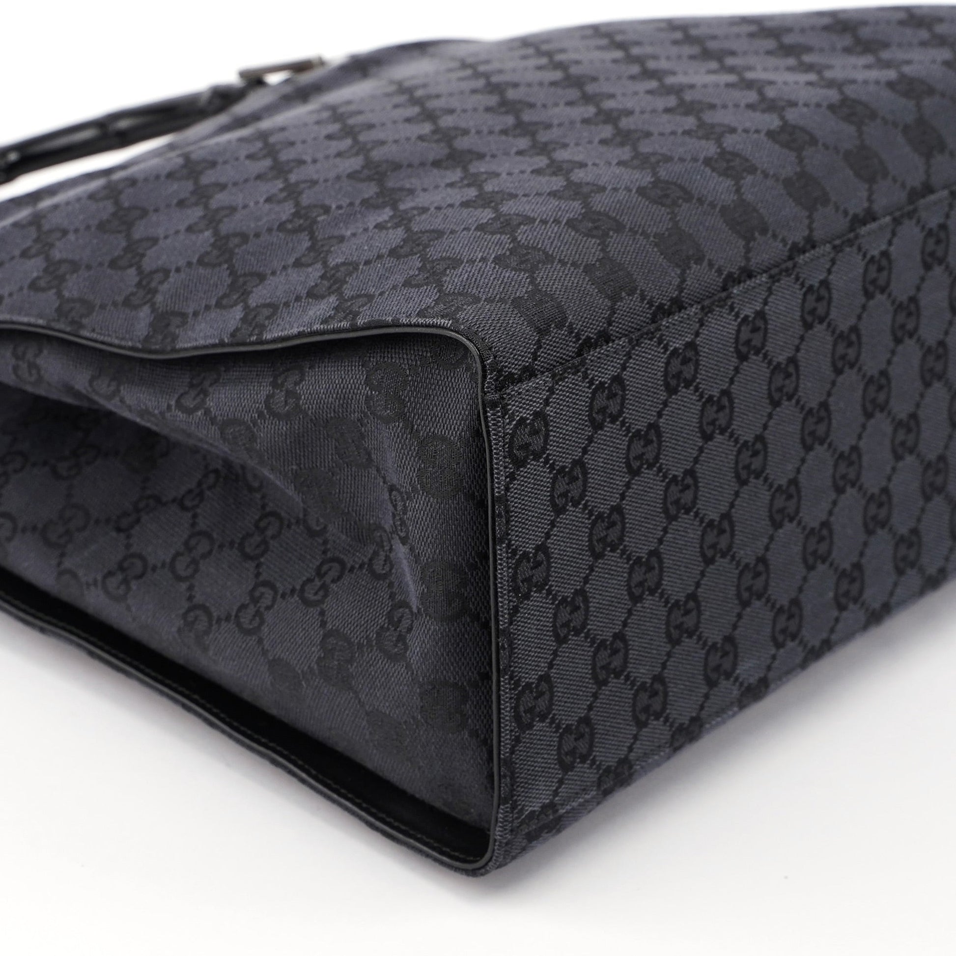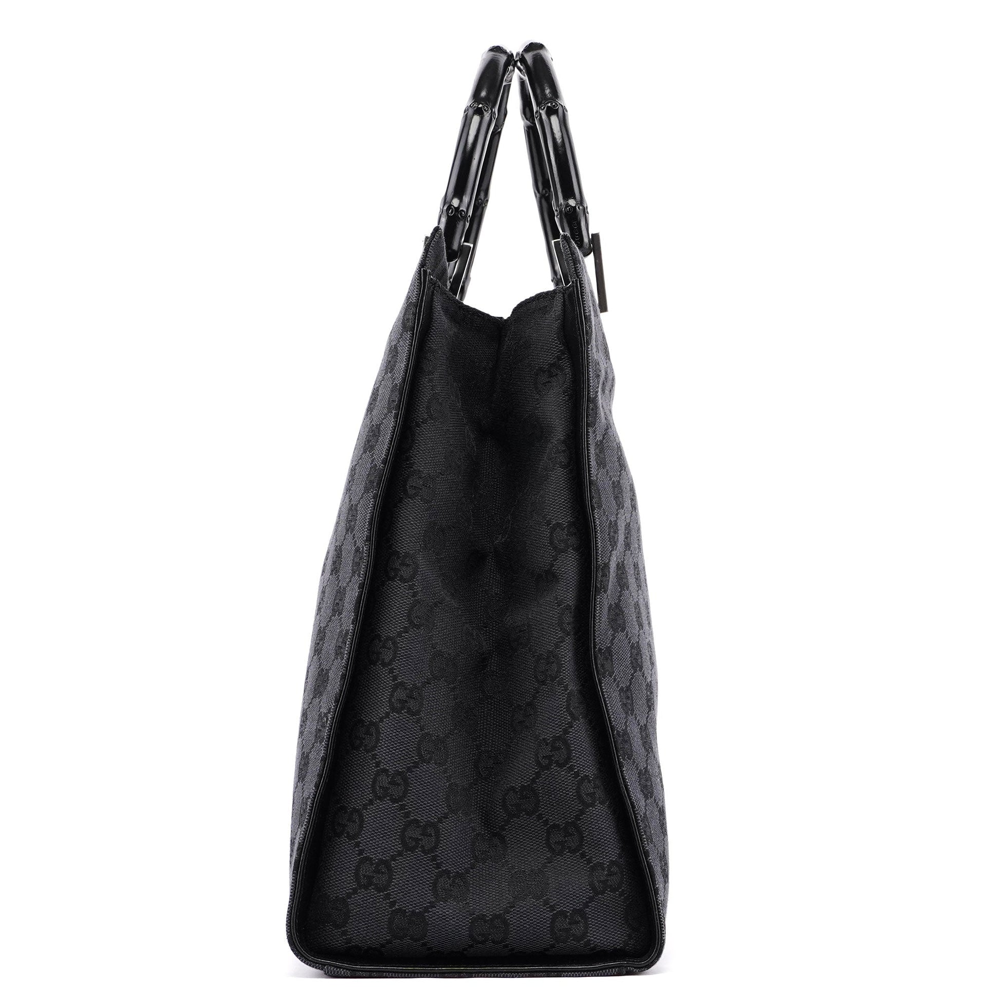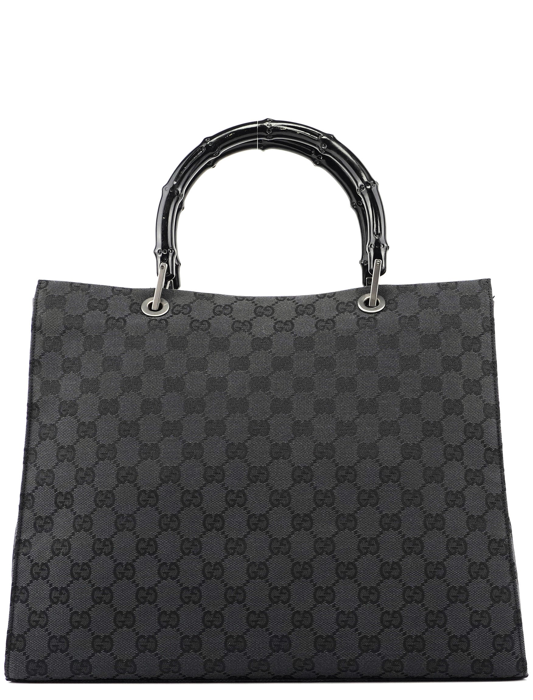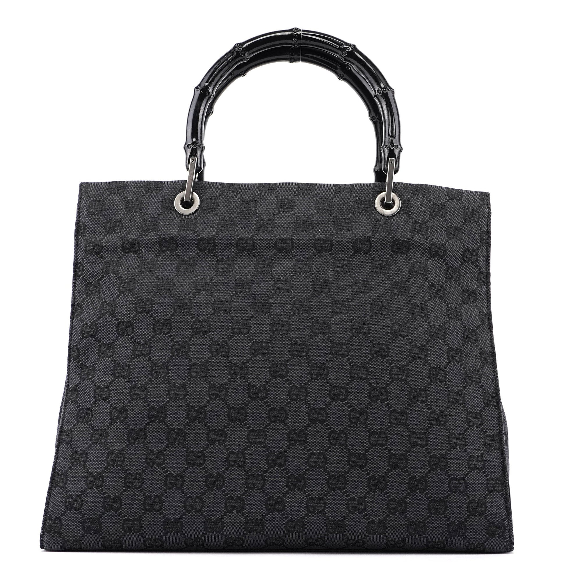 Designed by Tom Ford in the late 1990s, this Gucci Bamboo GG tote bag features two elegant black bamboo handles and silver-tone hardware. Crafted with the iconic GG monogram canvas, it offers three interior compartments lined with satin, including an interior zipper pocket for organized storage, blending luxurious design with practical functionality.