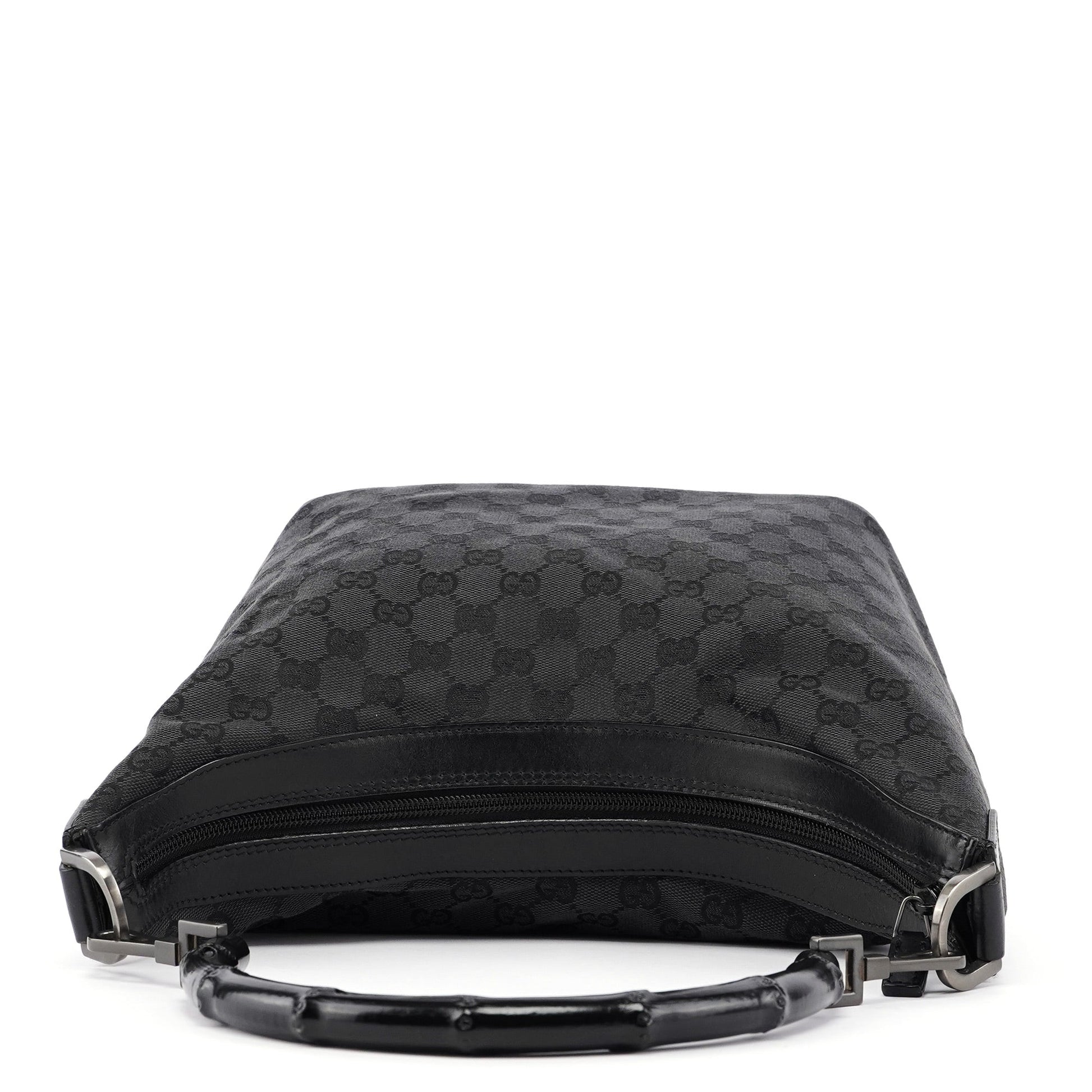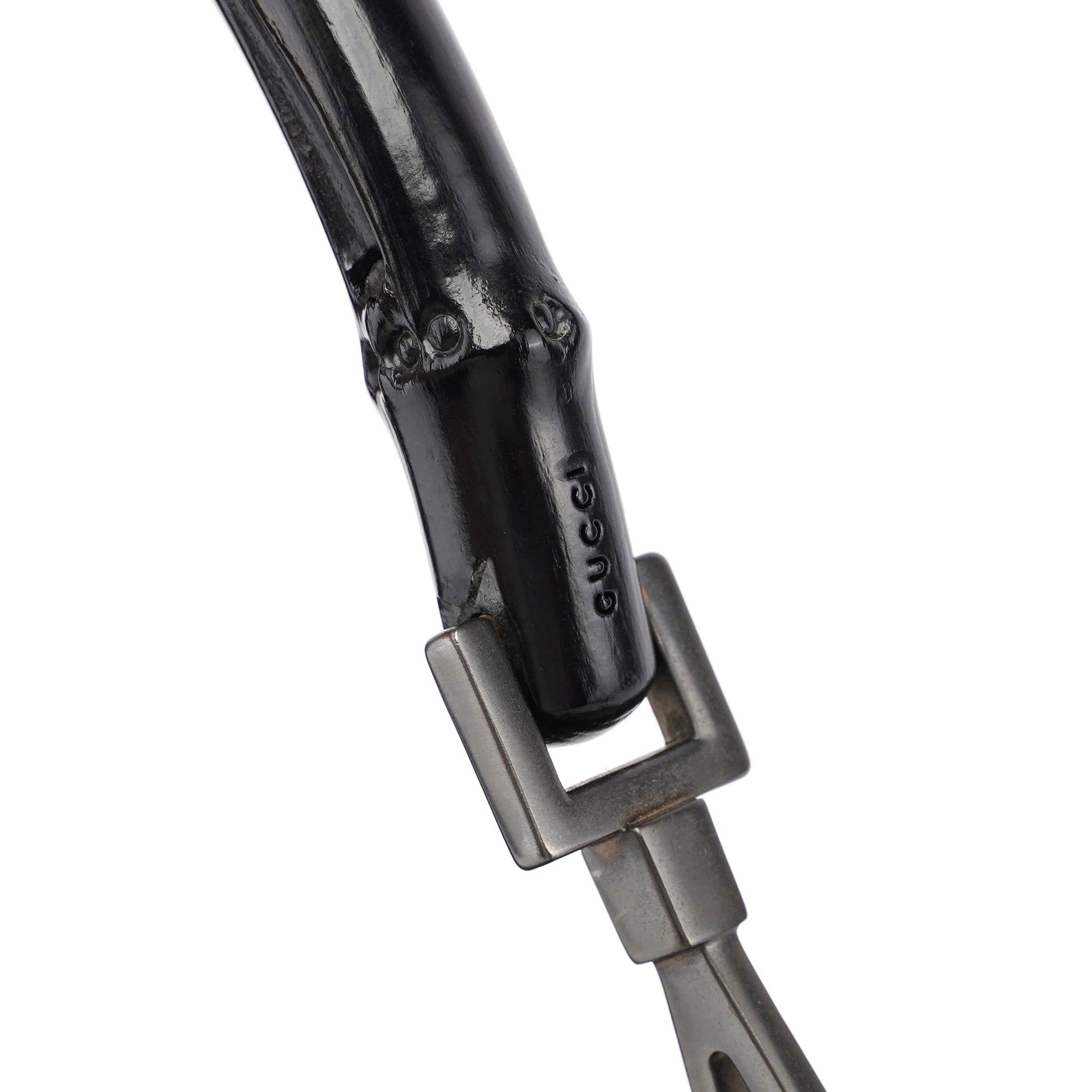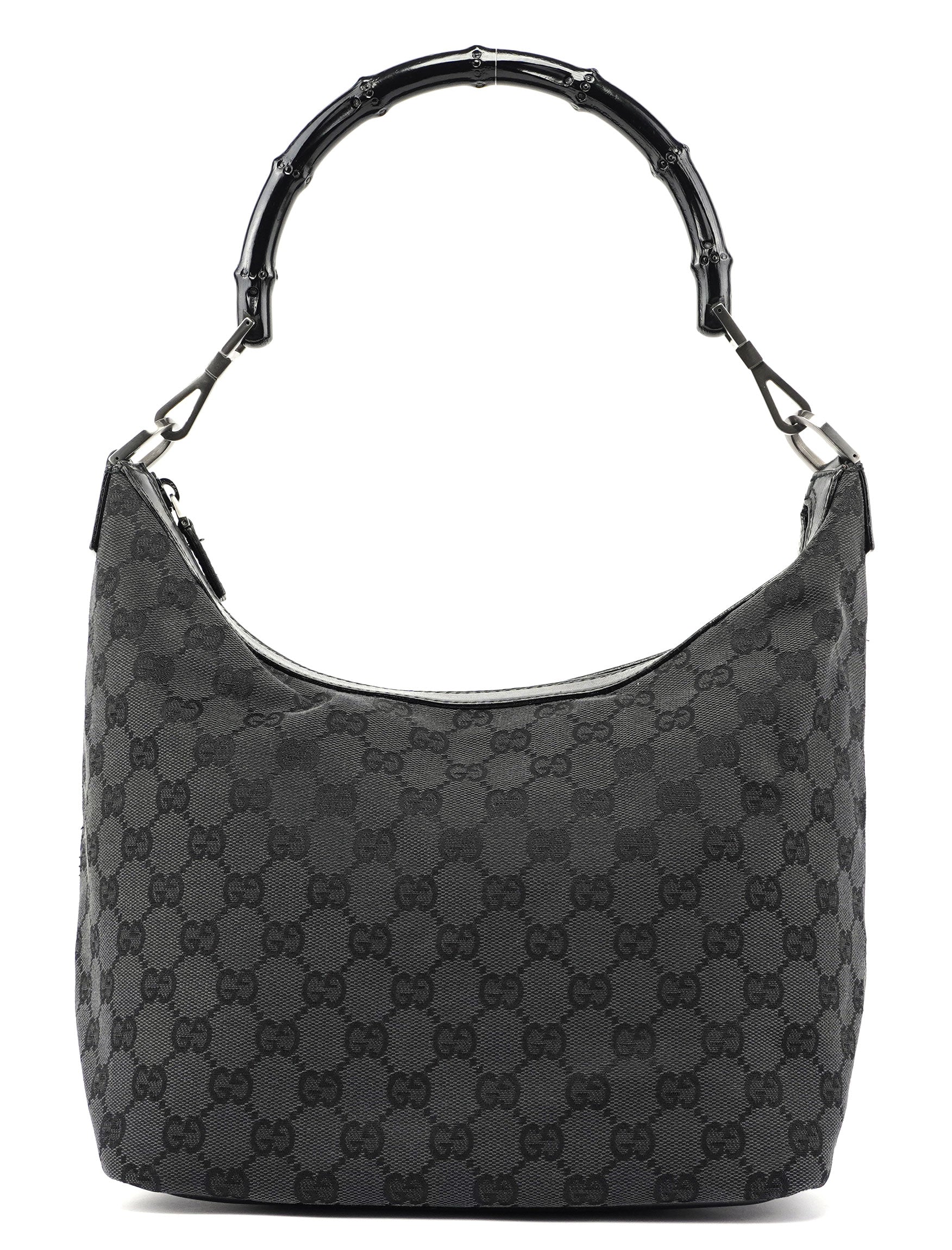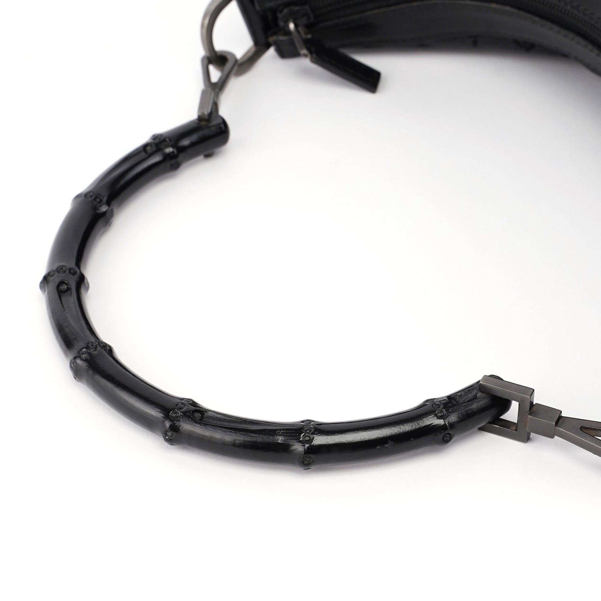 This Gucci Bamboo shoulder bag, a design from the late 1990s by Tom Ford boasts bamboo handle, while the black GG monogram canvas, anthracite hardware, and tonal leather trim create a stunning visual contrast. The bag's spacious zipper-closed compartment is lined with satin and includes an interior zipper pocket.