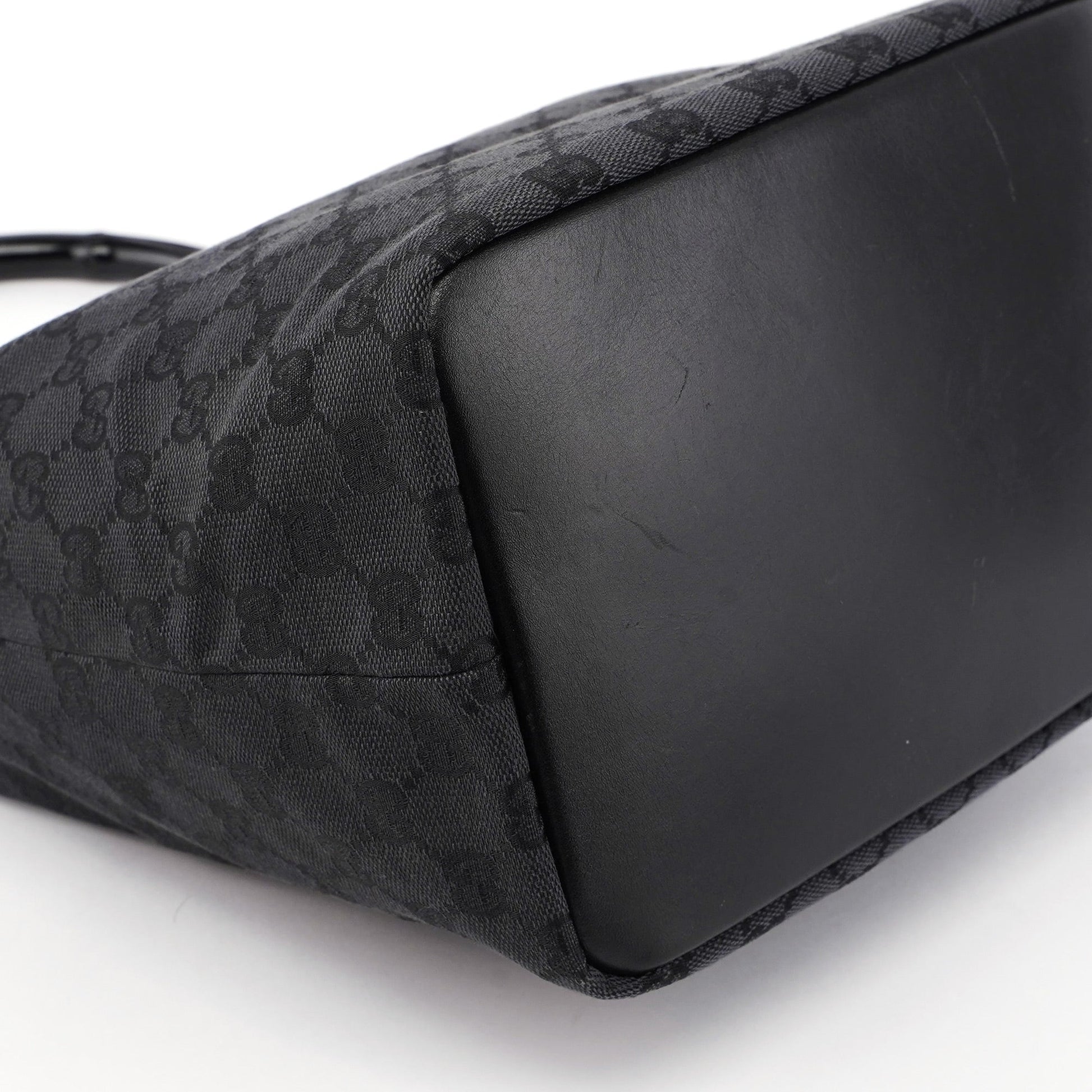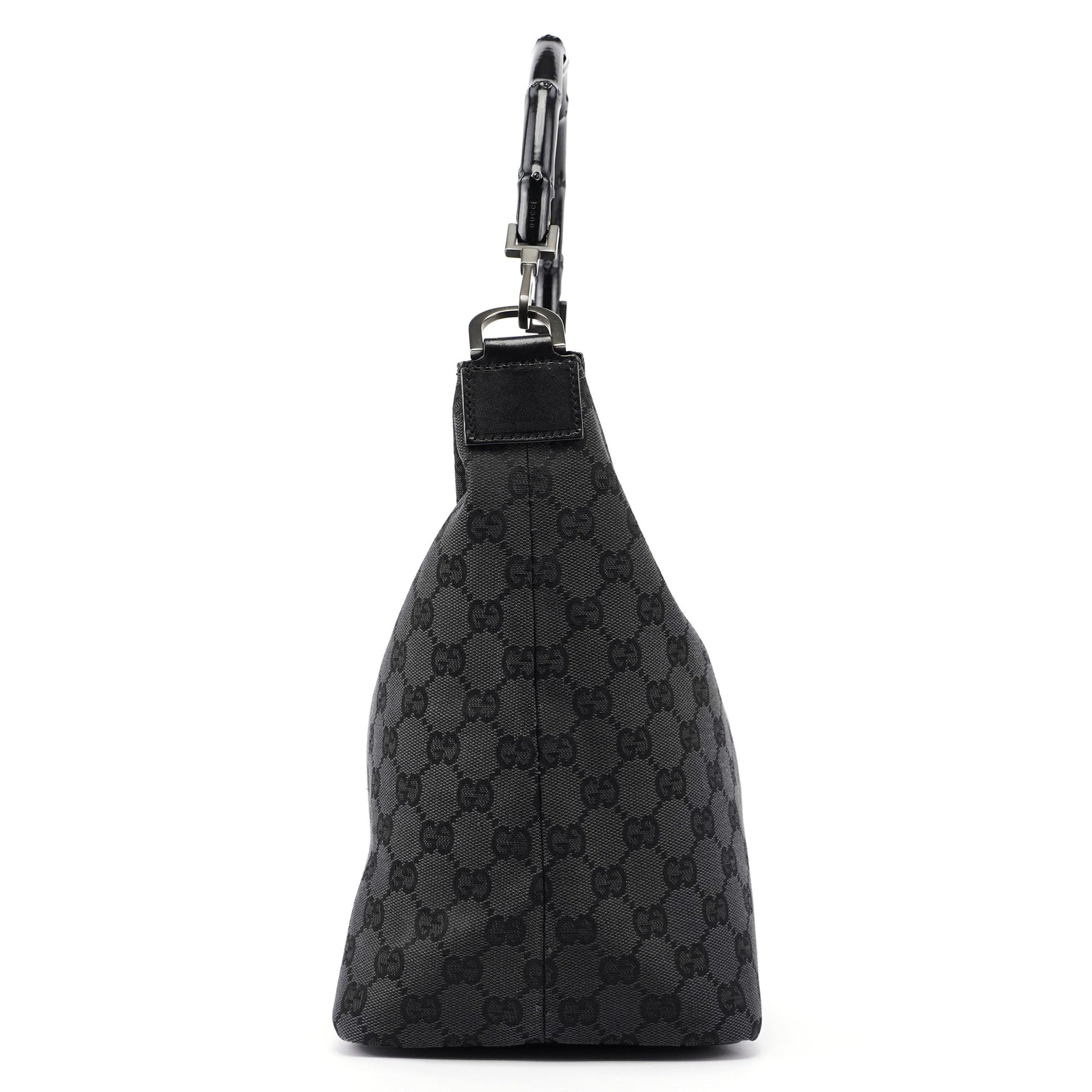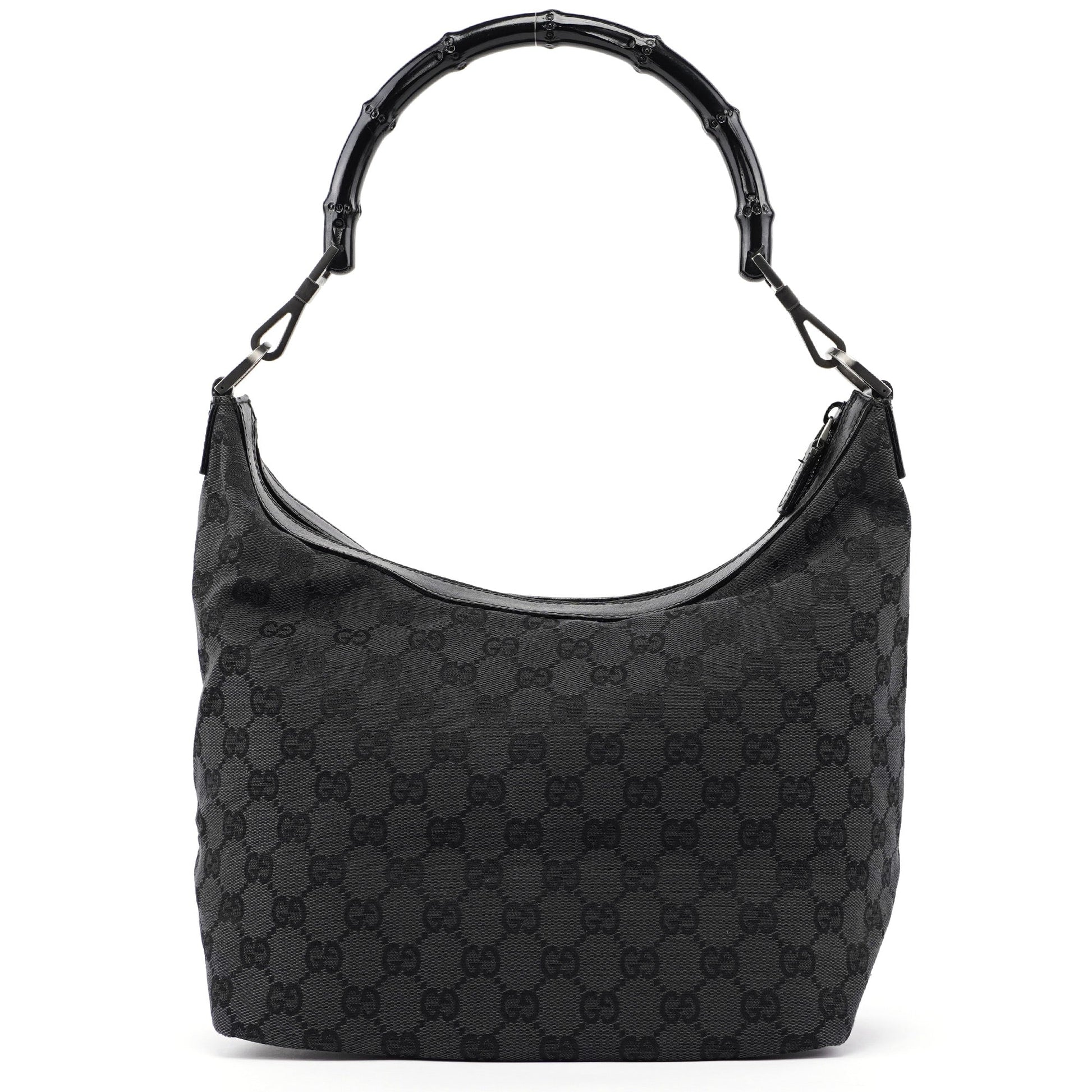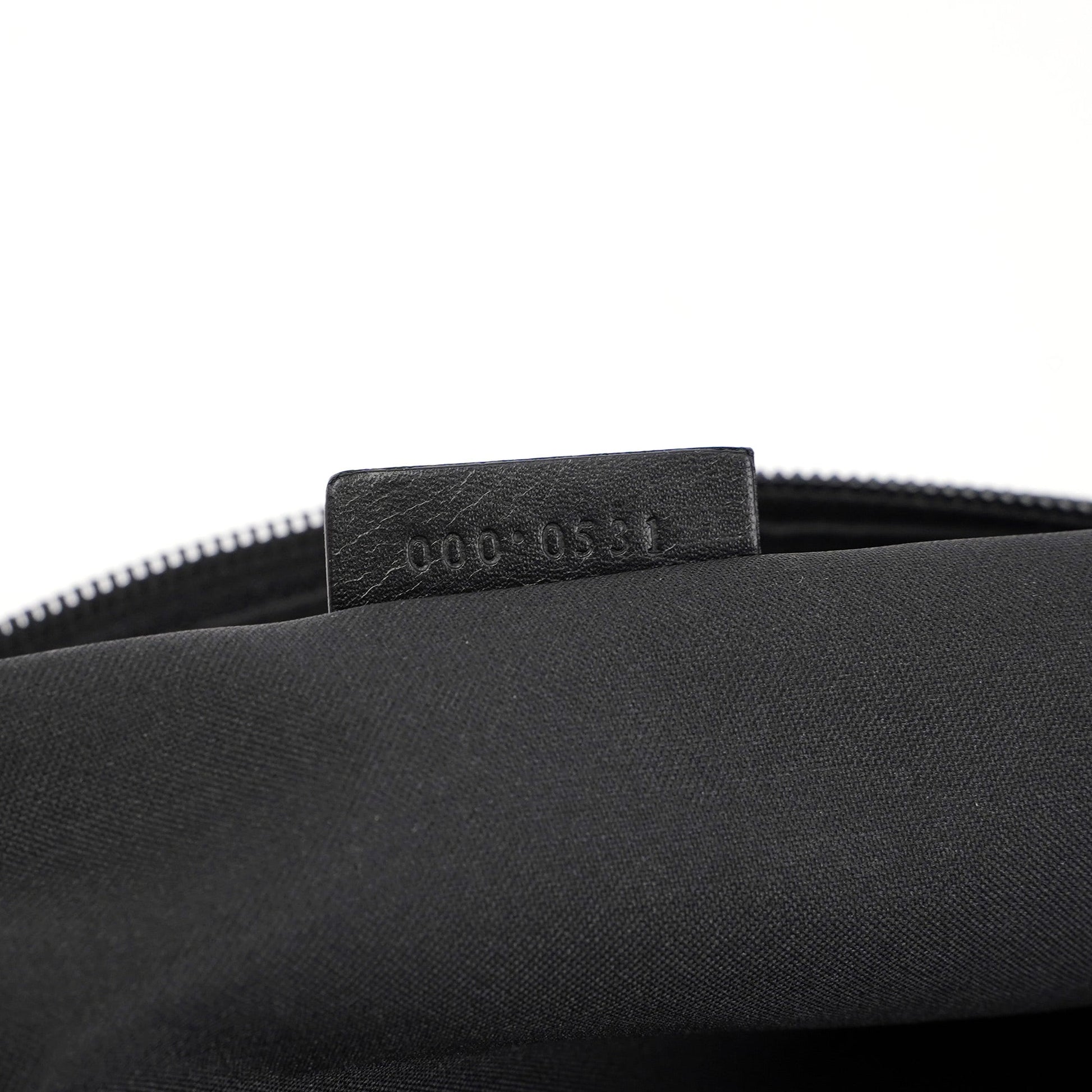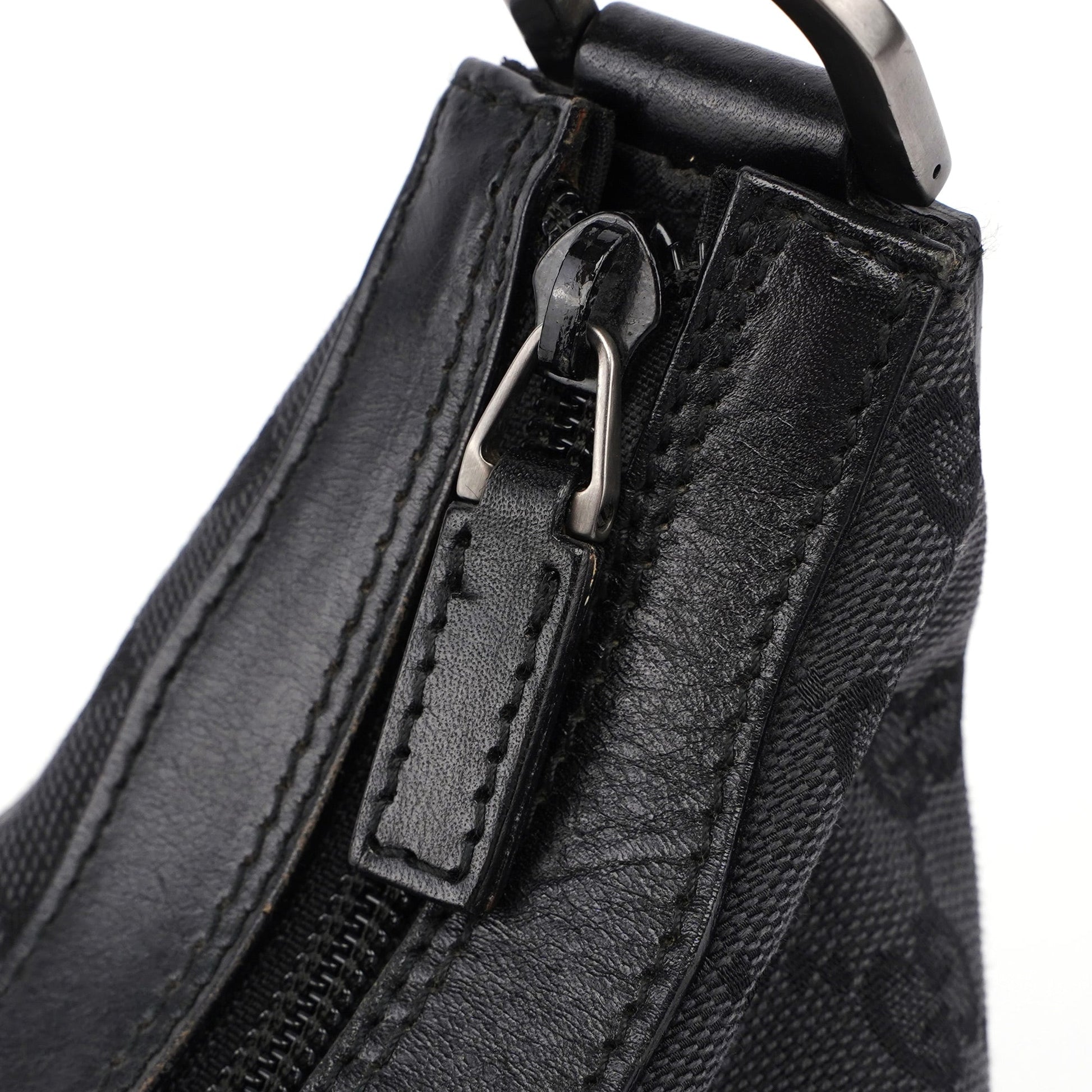 This Gucci Bamboo shoulder bag, a design from the late 1990s by Tom Ford boasts bamboo handle, while the black GG monogram canvas, anthracite hardware, and tonal leather trim create a stunning visual contrast. The bag's spacious zipper-closed compartment is lined with satin and includes an interior zipper pocket.
