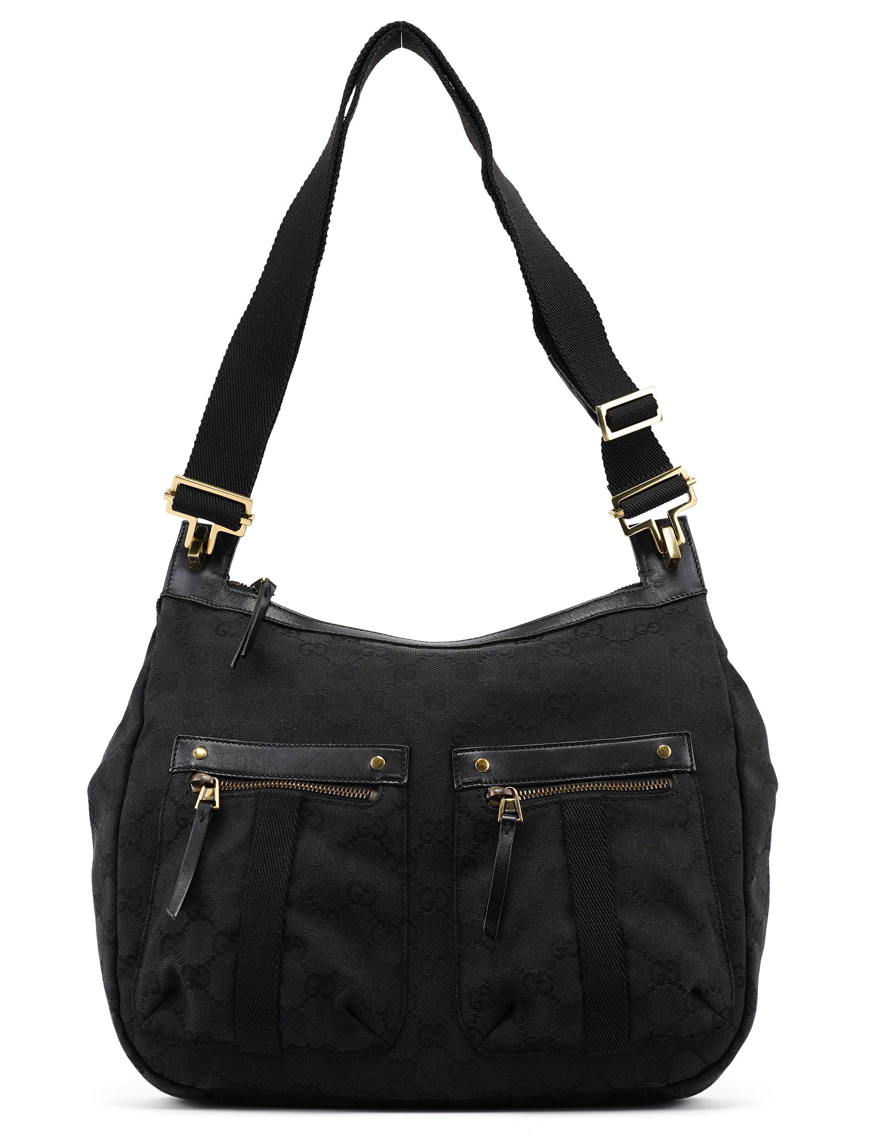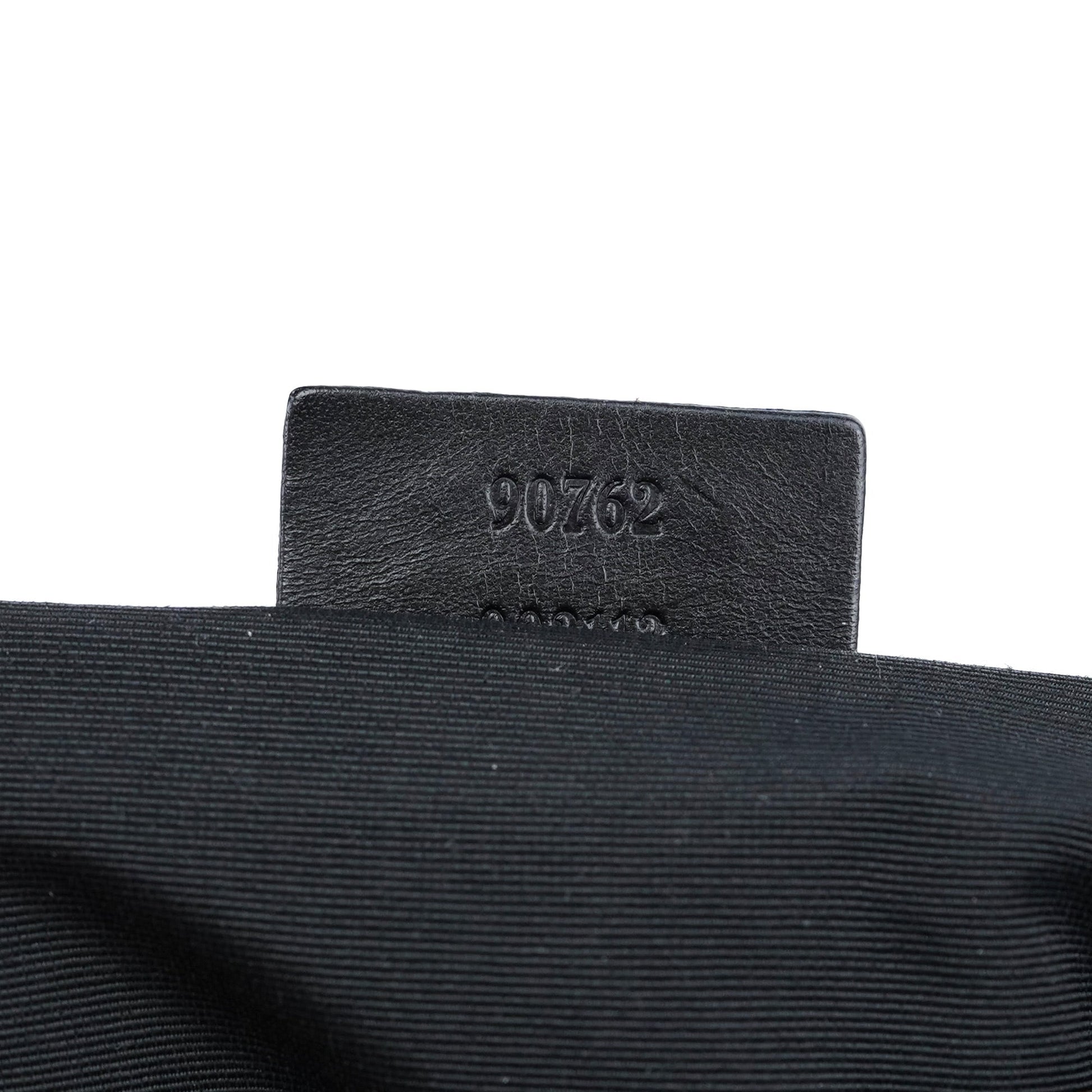 Discover the Gucci crossbody bag, designed by Tom Ford in the late 1990s. Handcrafted in black GG monogram with black leather trim, it features gold-tone hardware, two front pockets, and a zipper closure. The satin-lined interior includes a zipper pocket for organized storage.