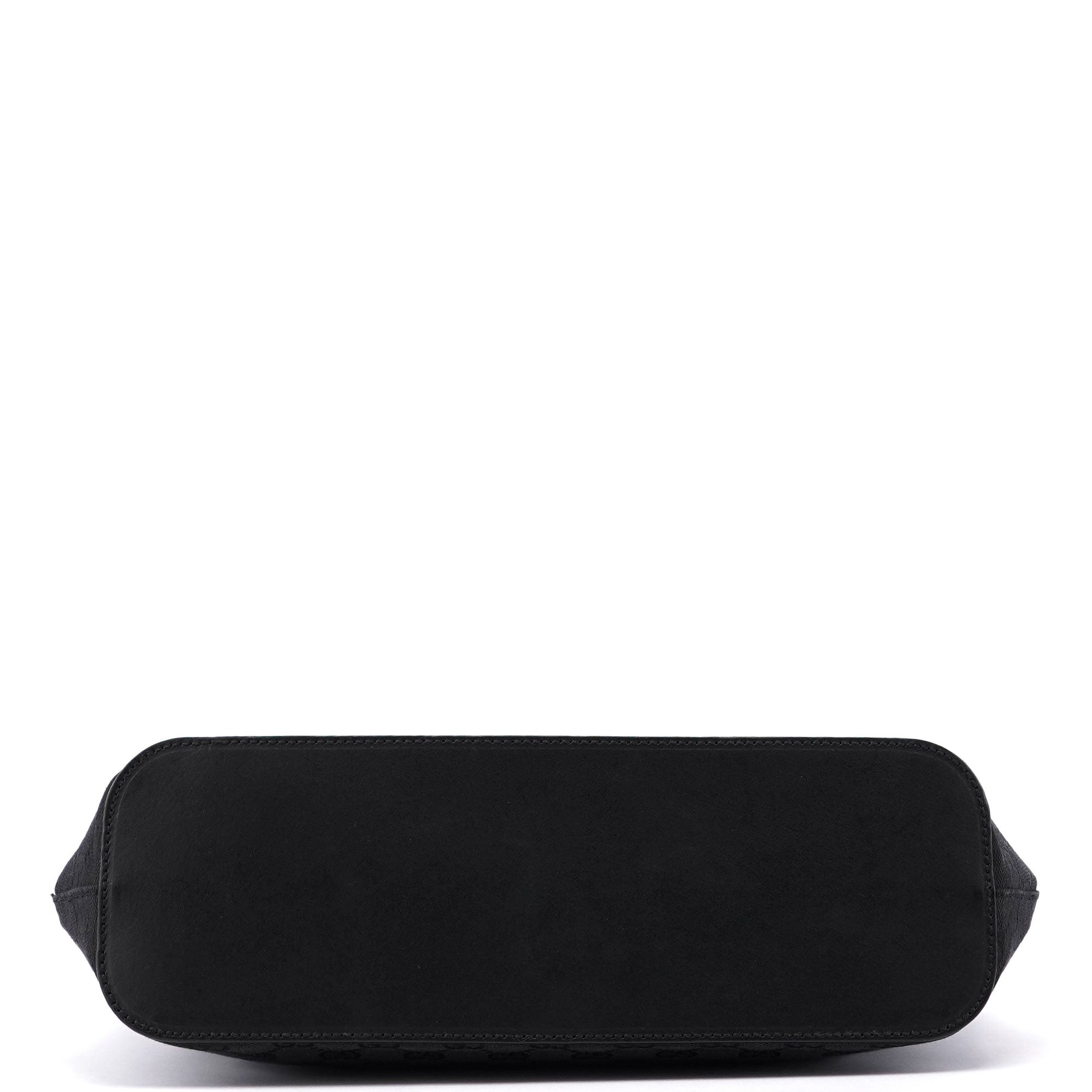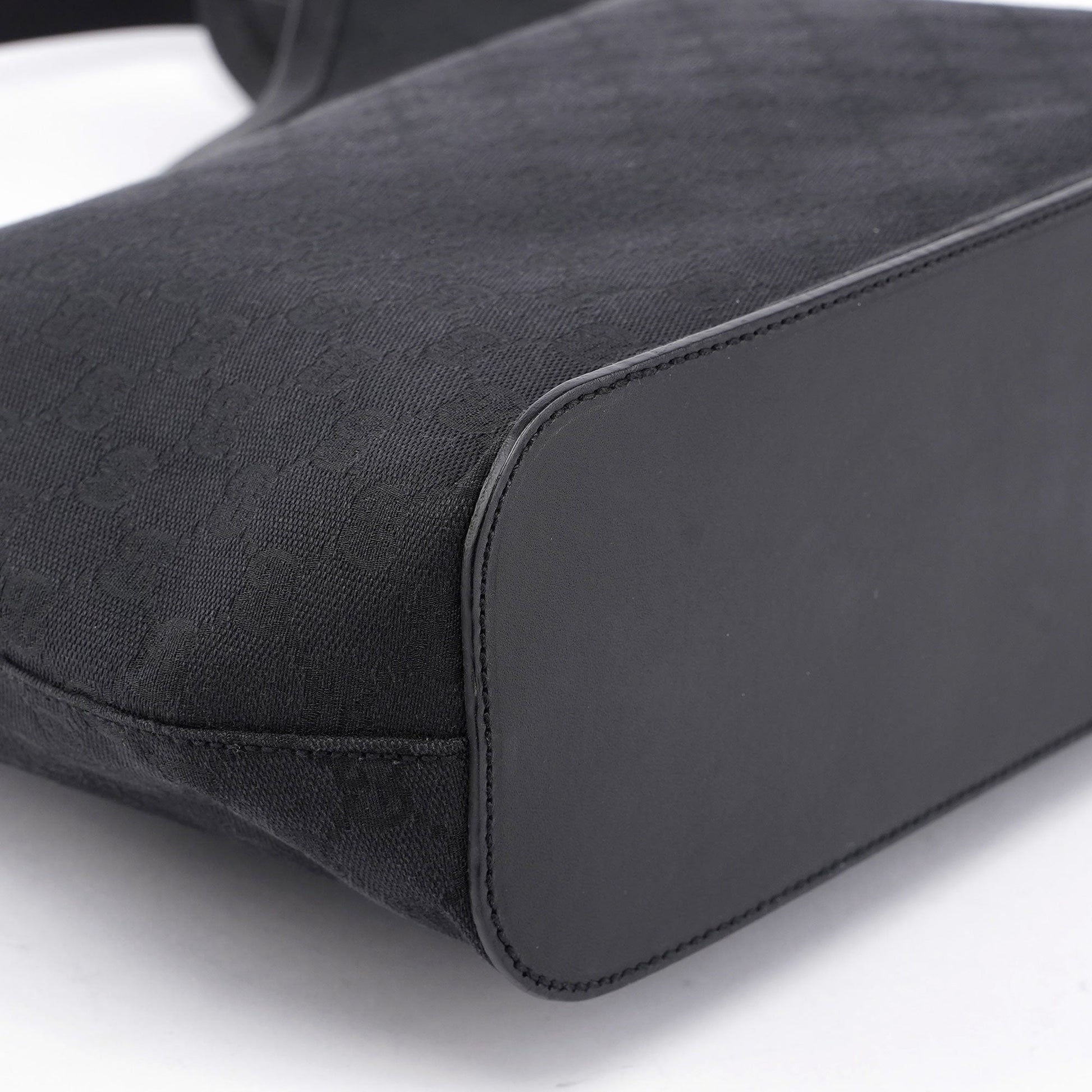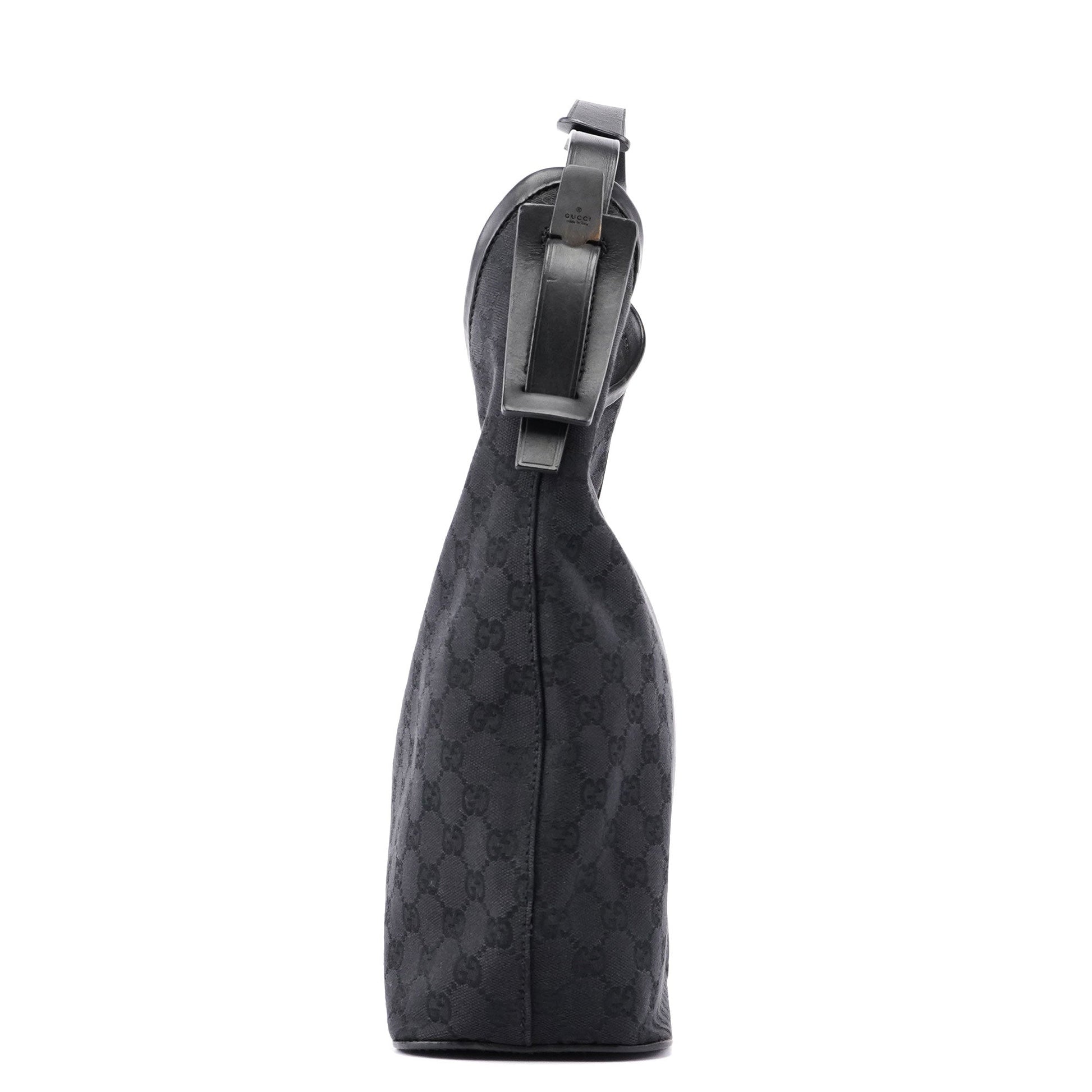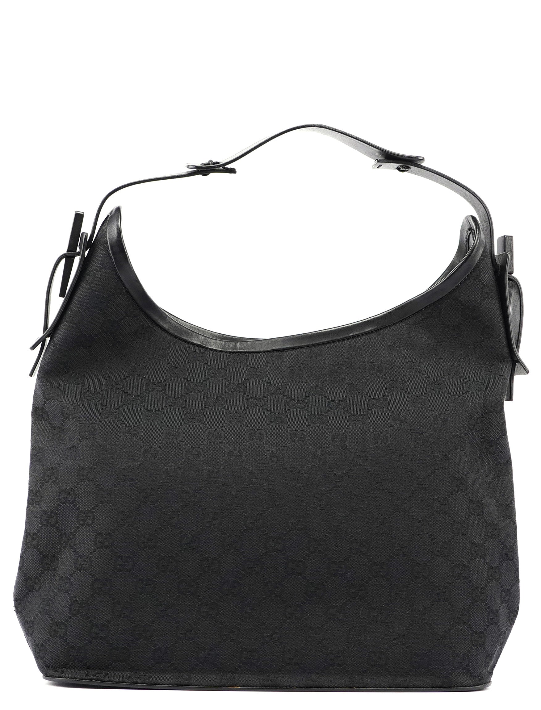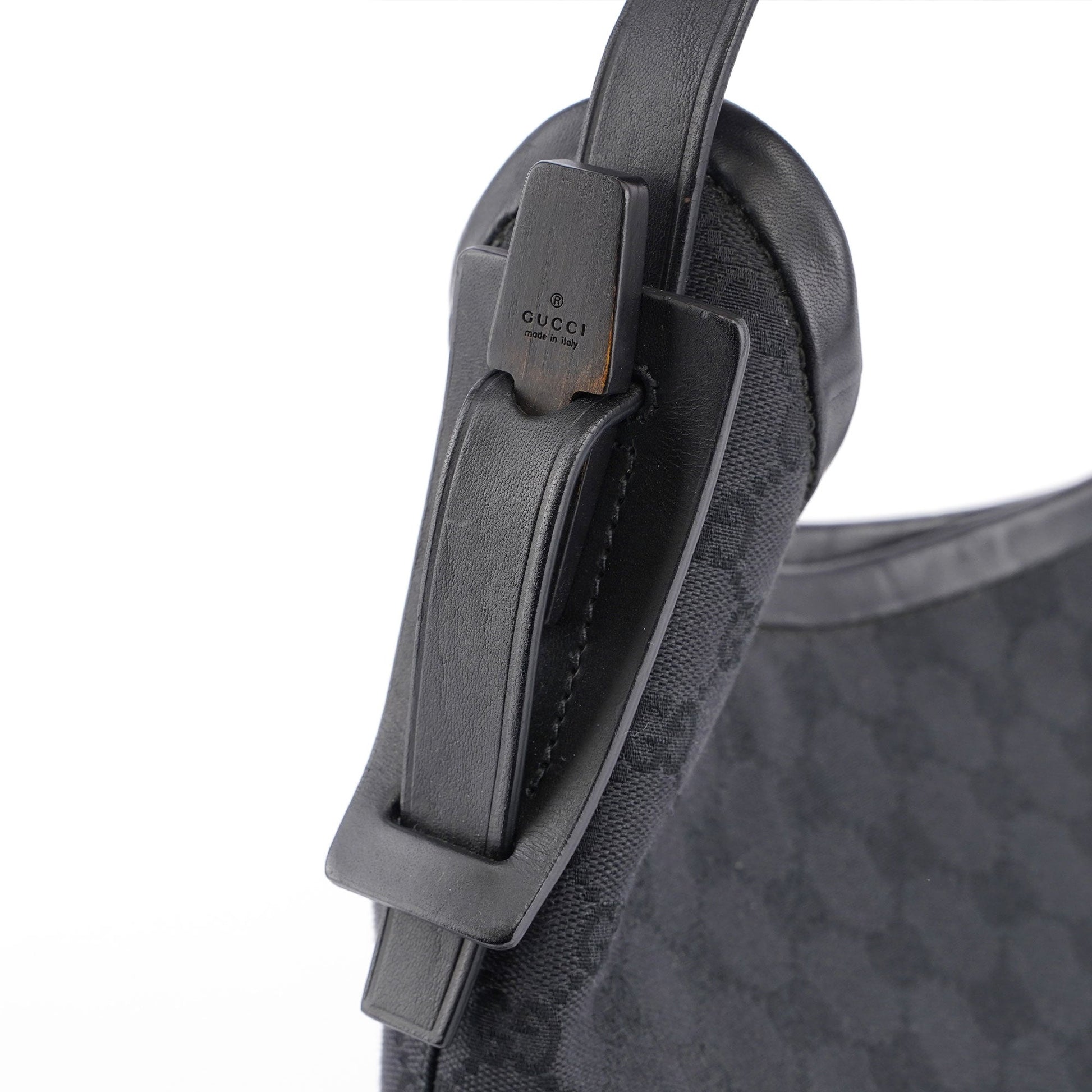Introducing the Gucci GG hobo shoulder bag from the 2003 collection, designed by Tom Ford. Handcrafted in black GG monogram canvas with calfskin leather trim, it features wood details on the handles engraved with the Gucci logo. The interior, secured with a magnet, is lined with cotton and includes an interior zipper pocket for organization.
