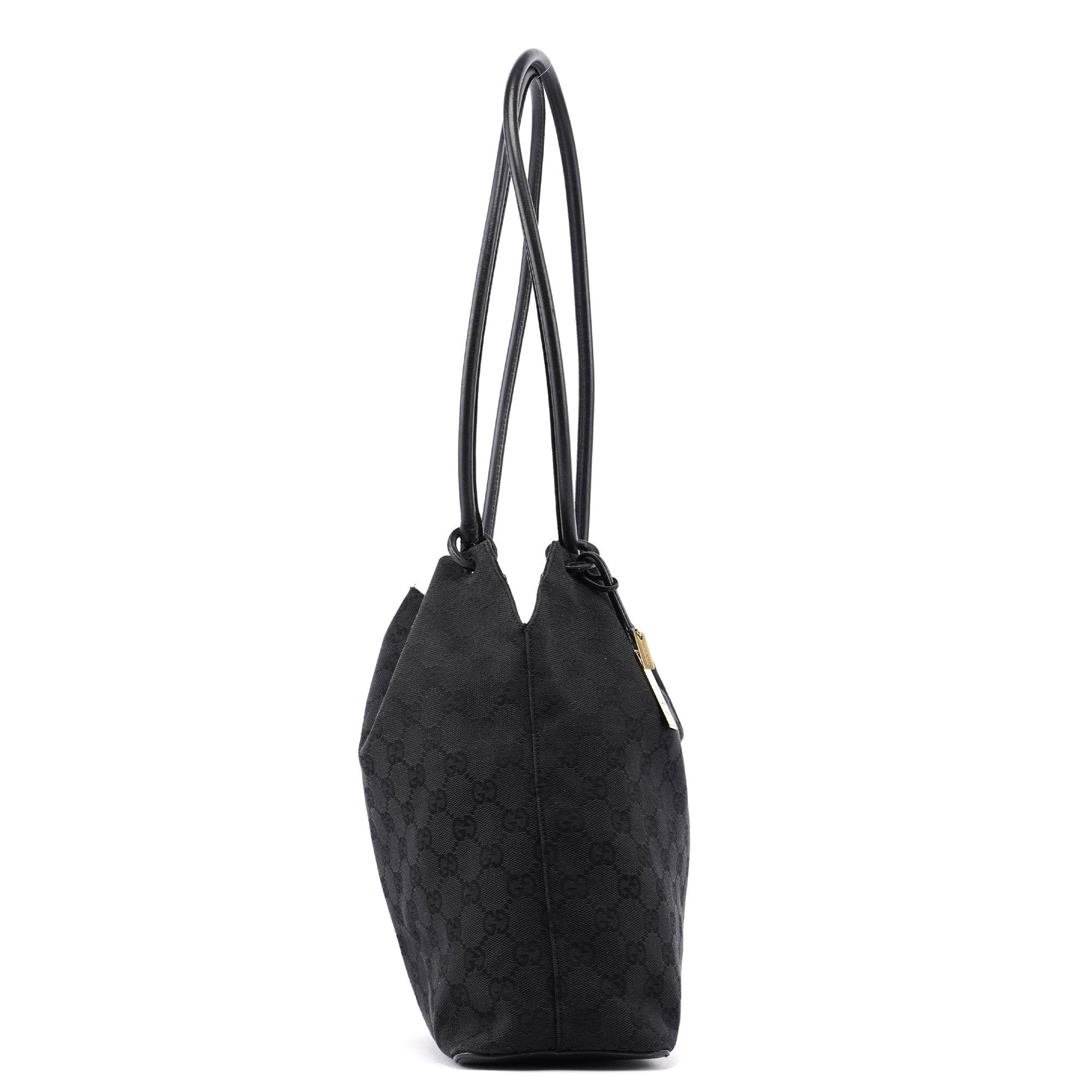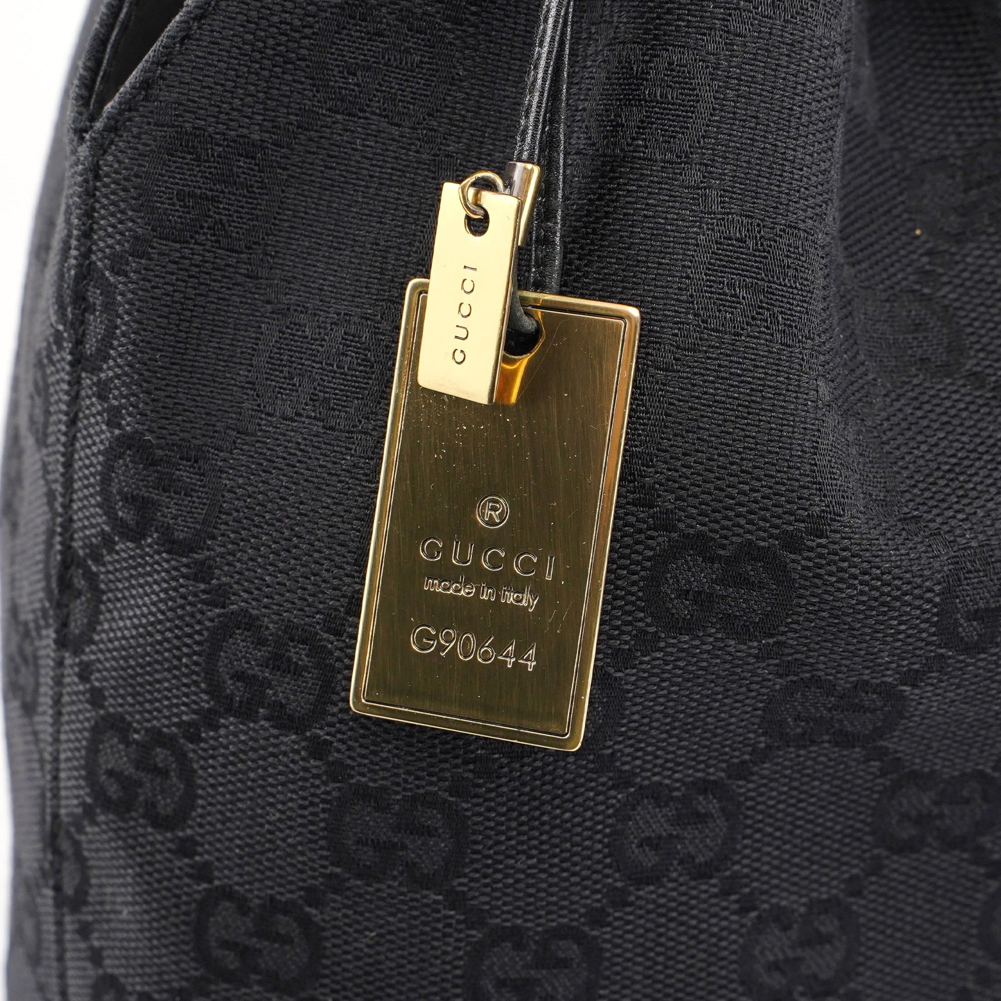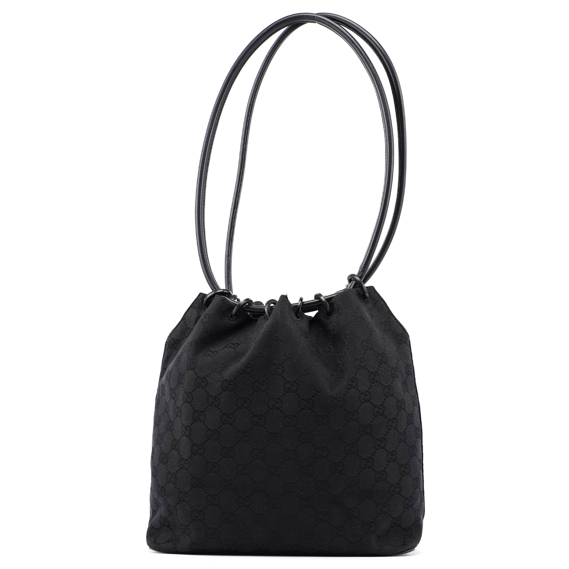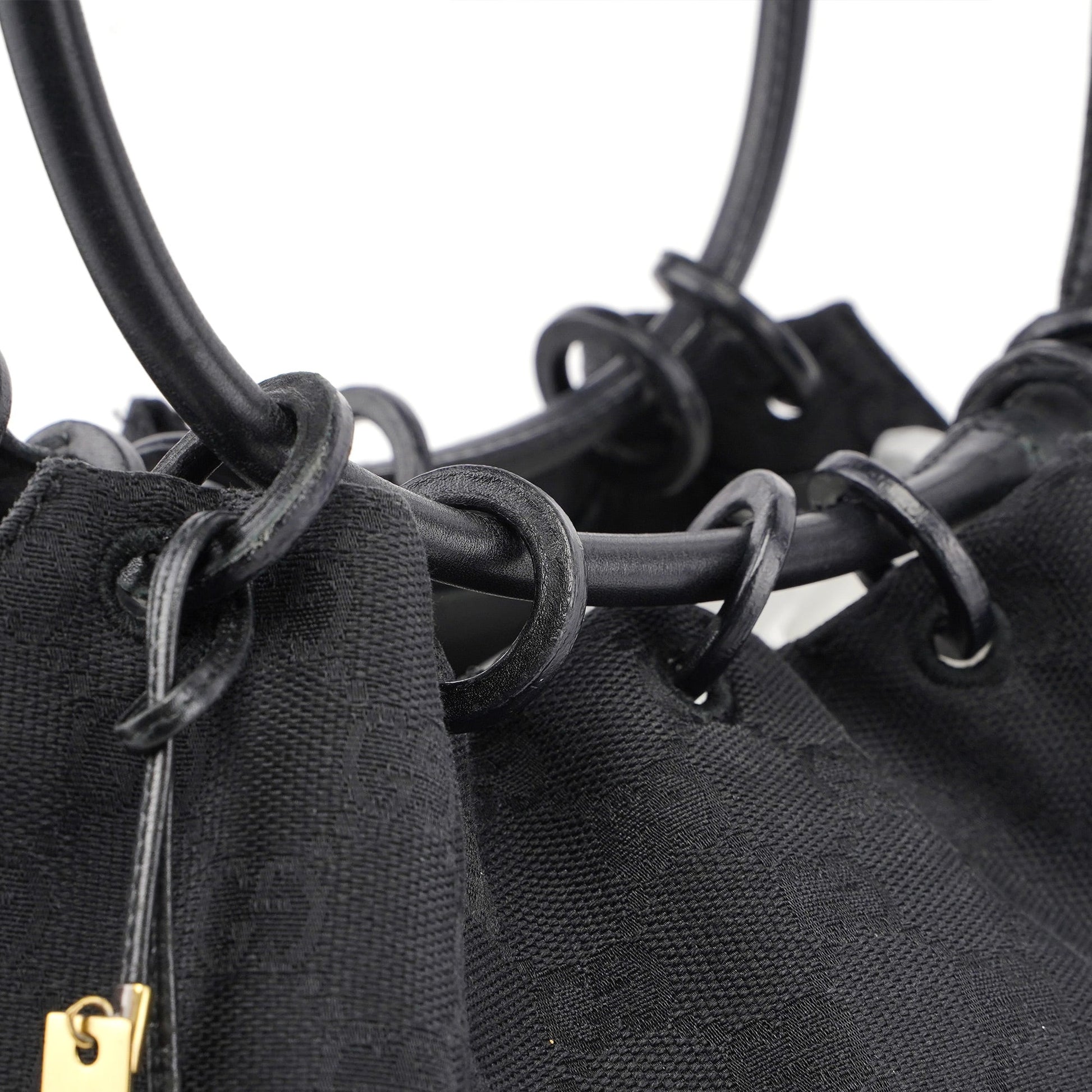 This vintage Gucci shoulder bag, crafted from GG monogram canvas and black leather, exudes timeless elegance. It features a double drawstring style handle and gold-tone hardware, highlighted by a Gucci logo bangle. The interior, lined in GG monogram satin, includes a convenient zipper pouch.