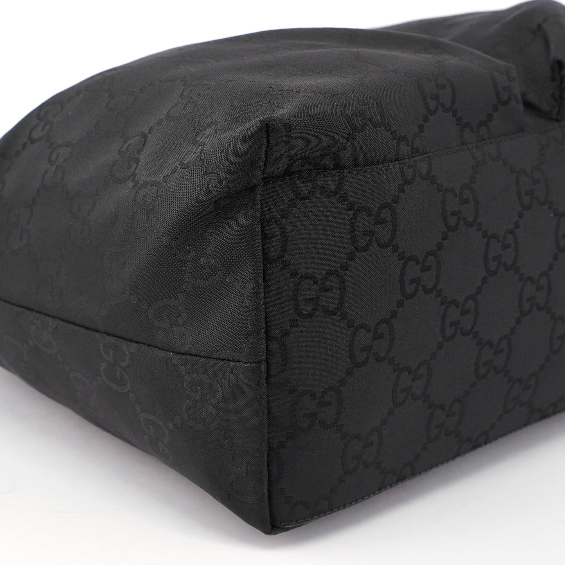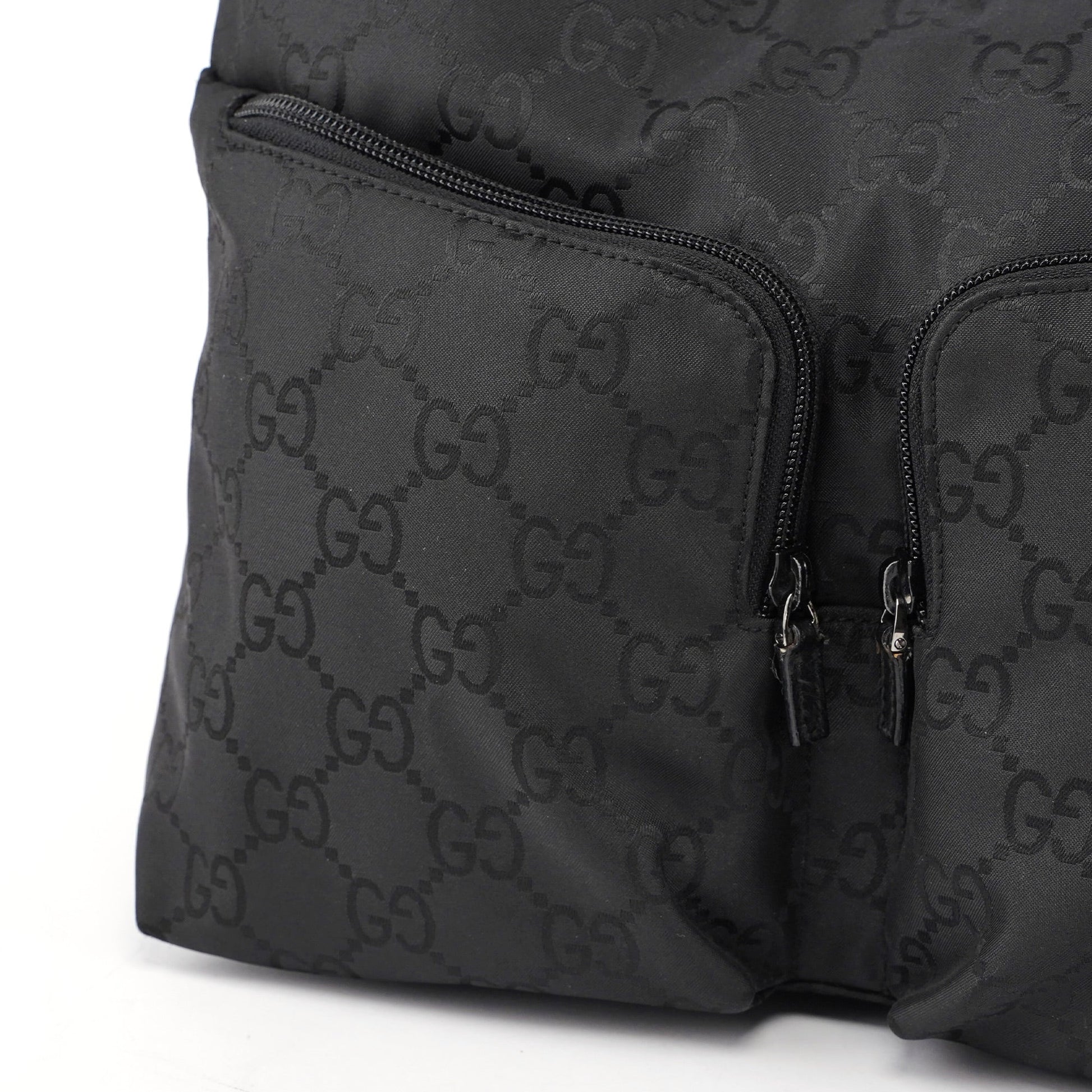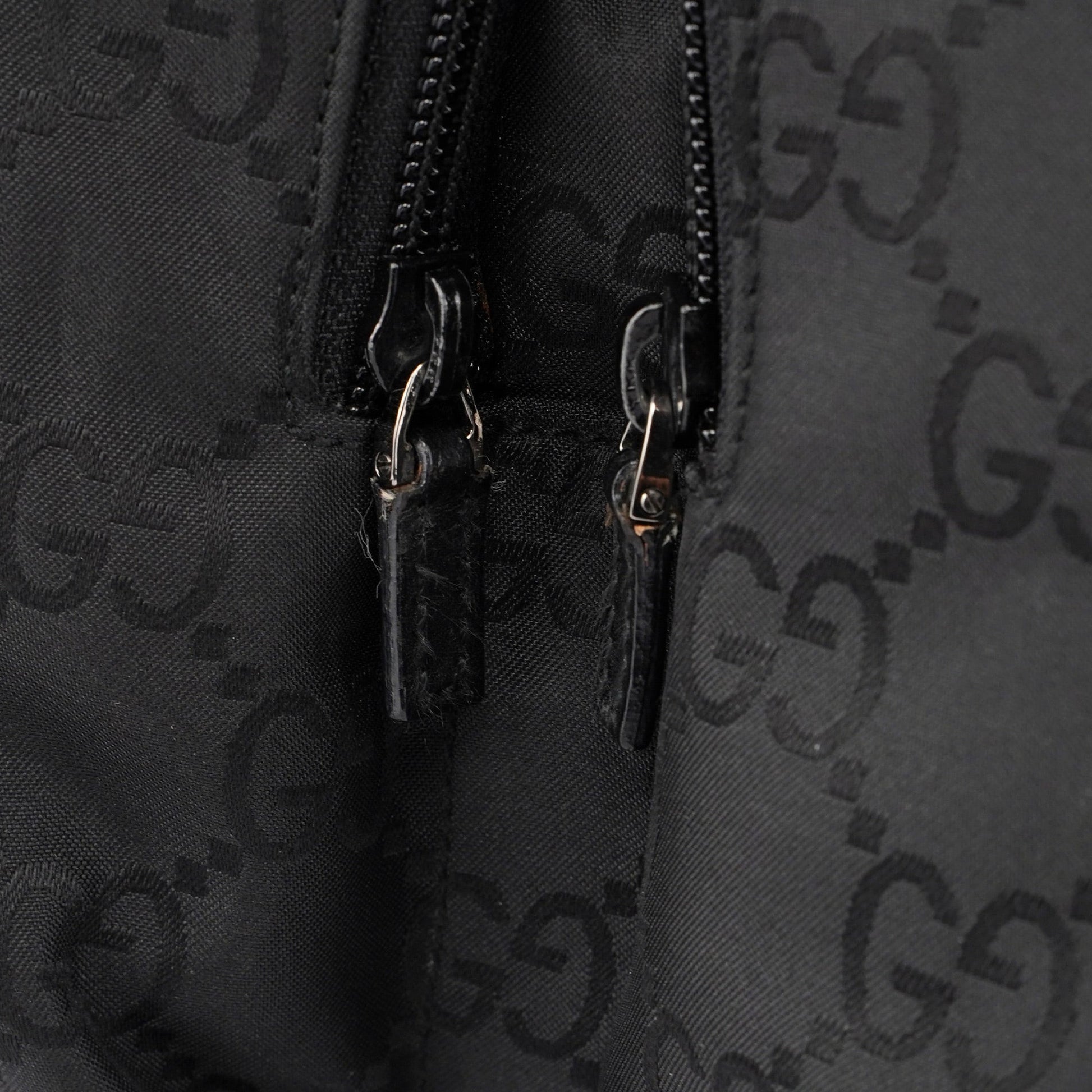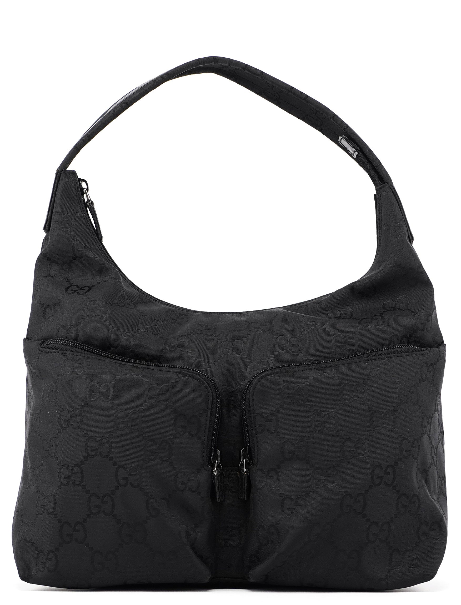 Designed by Tom Ford in the late 1990s, the Gucci GG shoulder bag boasts a black GG canvas monogram with calfskin leather trim. Silver-tone hardware adorns the exterior, including zipper pockets at the front. The bag securely closes with a zipper, revealing a satin-lined interior complete with an additional zipper pocket.