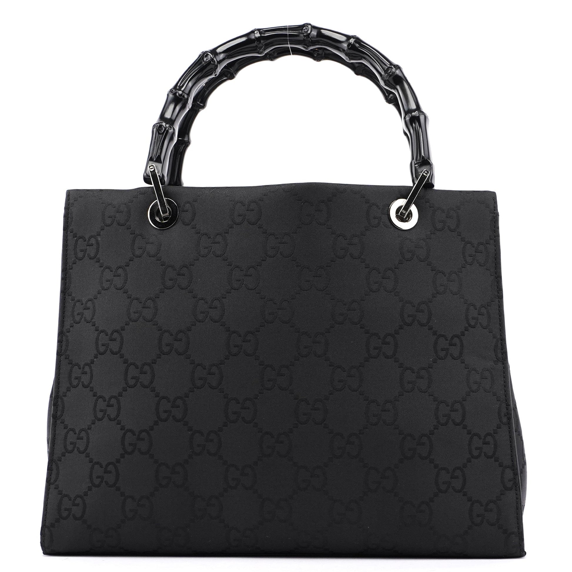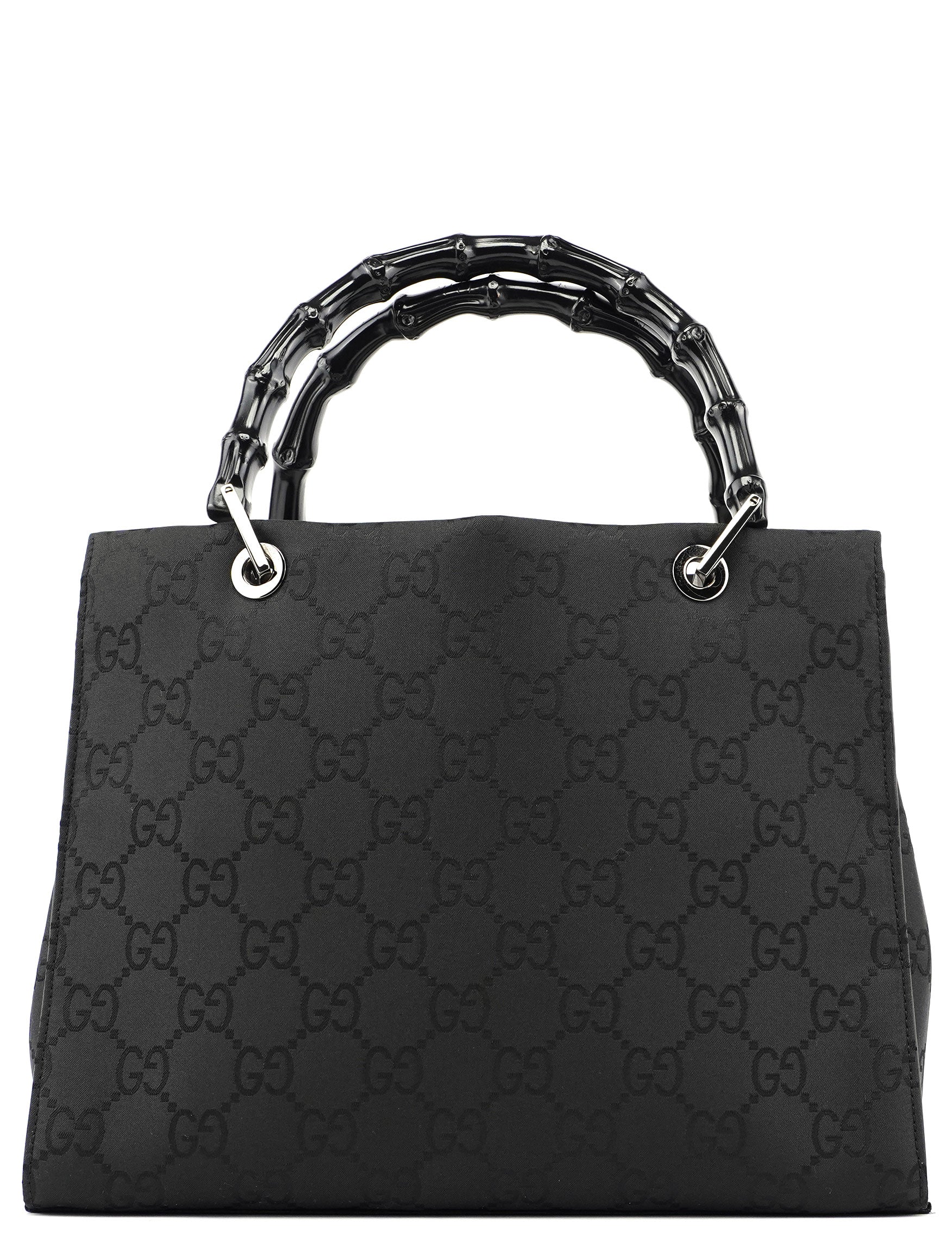 Designed by Tom Ford in the late 1990s, this Gucci Bamboo GG tote bag features two elegant black bamboo handles and silver-tone hardware. Crafted with the iconic GG monogram canvas, it offers three interior compartments lined with satin, including an interior zipper pocket for organized storage, blending luxurious design with practical functionality.