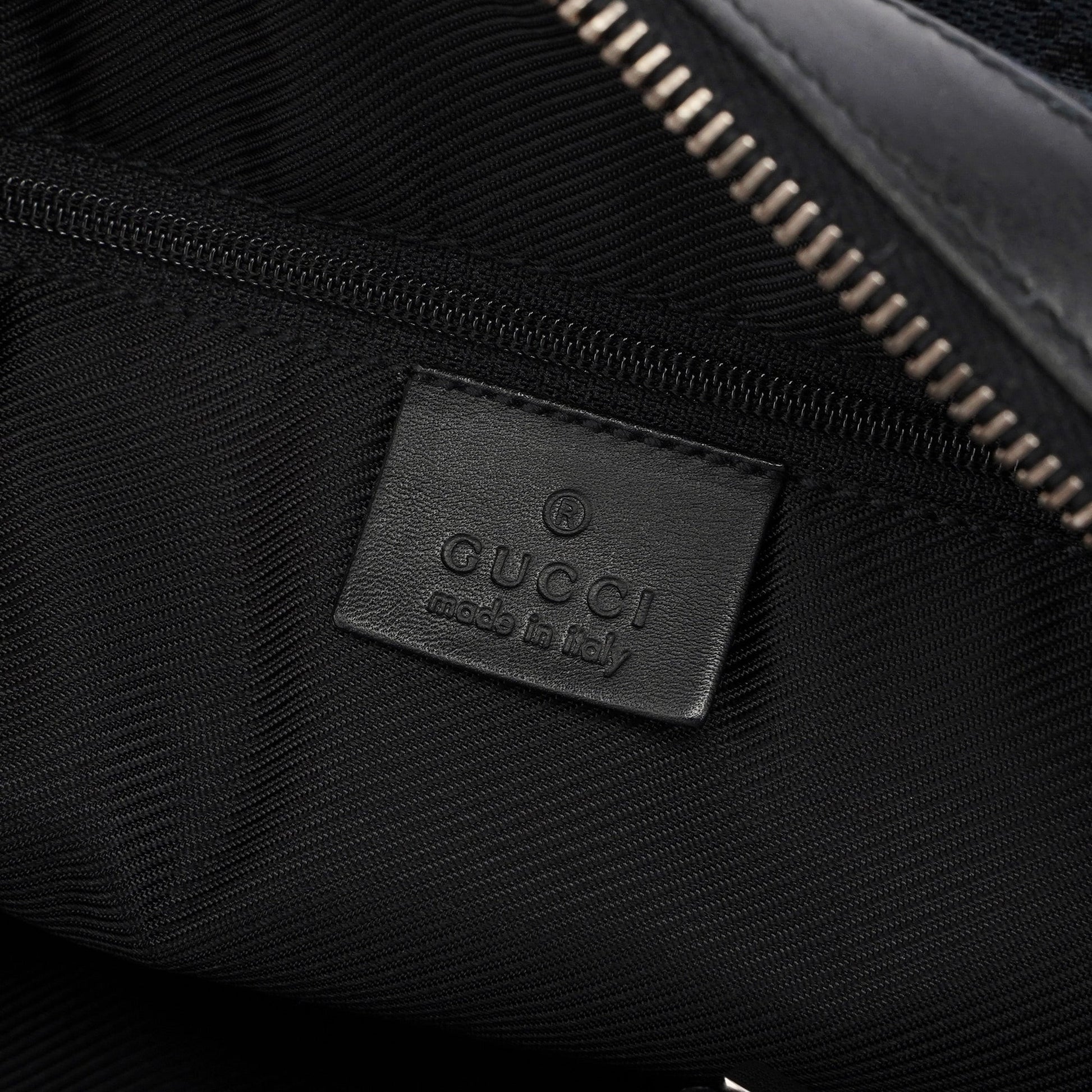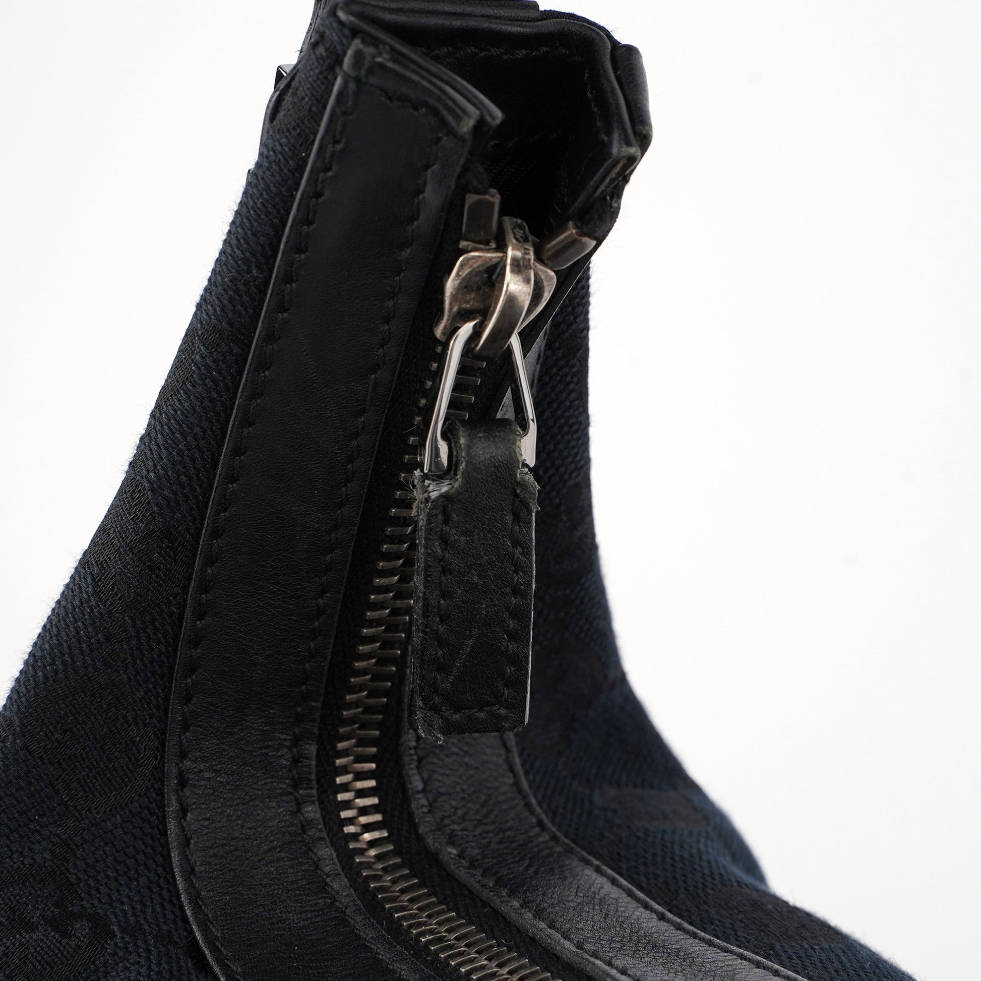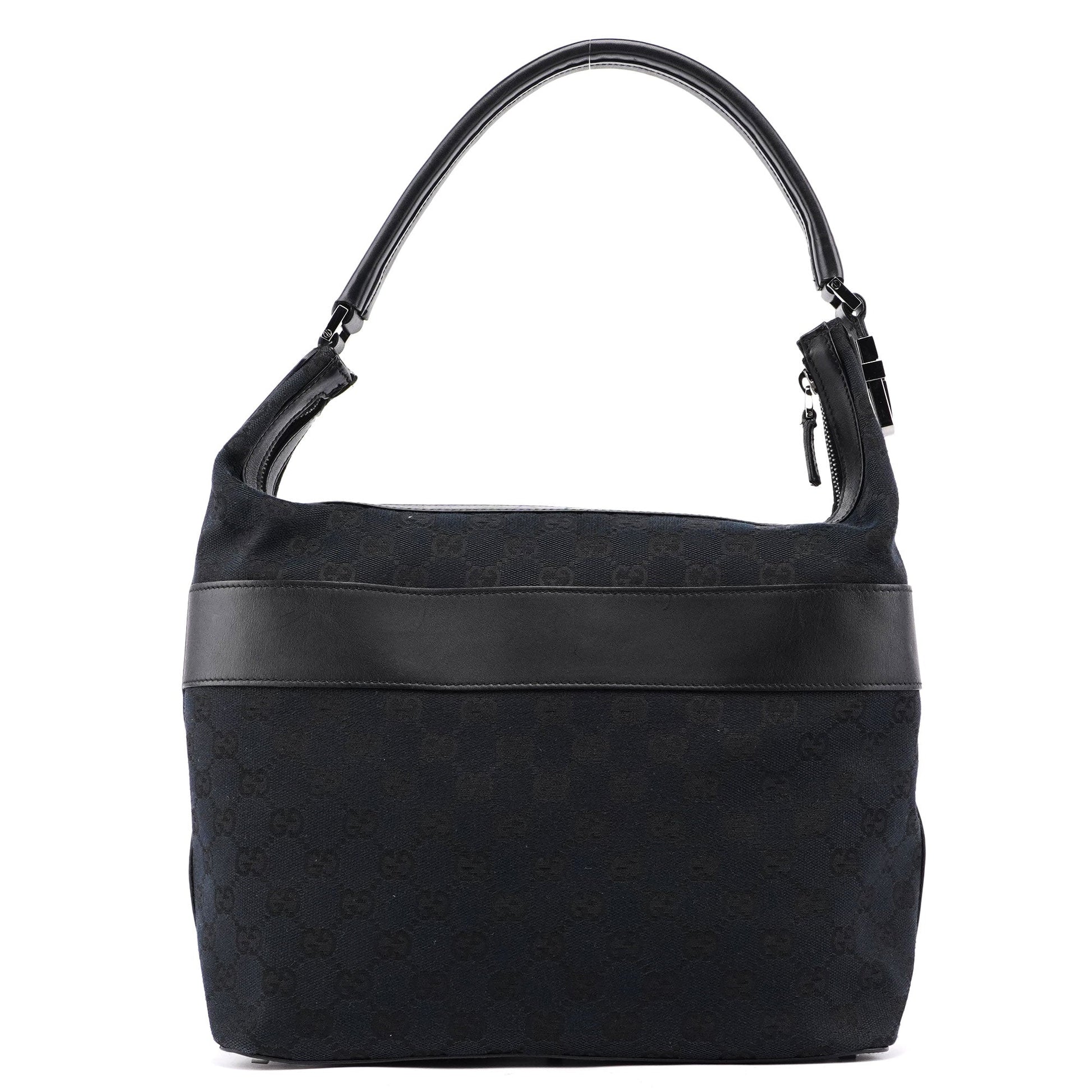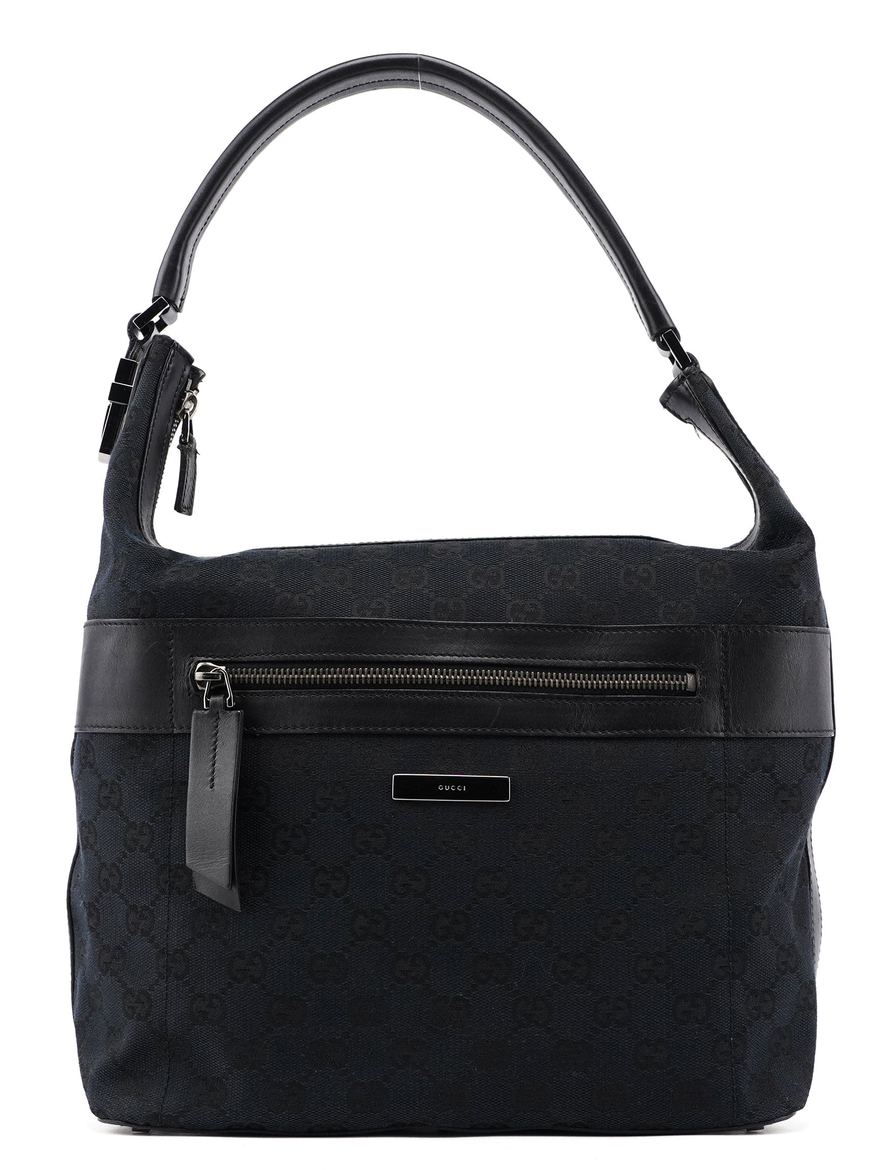 This original Gucci GG hobo shoulder bag, designed by Tom Ford in the late 1990s, is handcrafted from black GG monogram canvas with calfskin leather trim. It features a front zipper pocket, a main zipper closure, and a satin-lined interior with an additional zipper pocket. The Gucci logo plate at the front adds a signature touch of elegance.