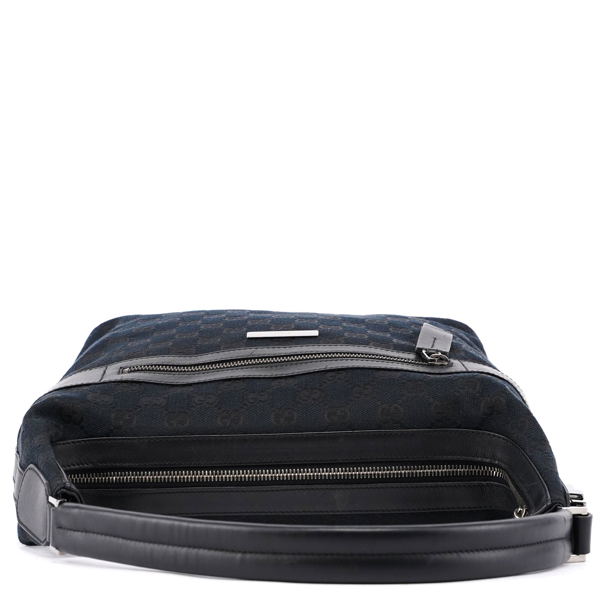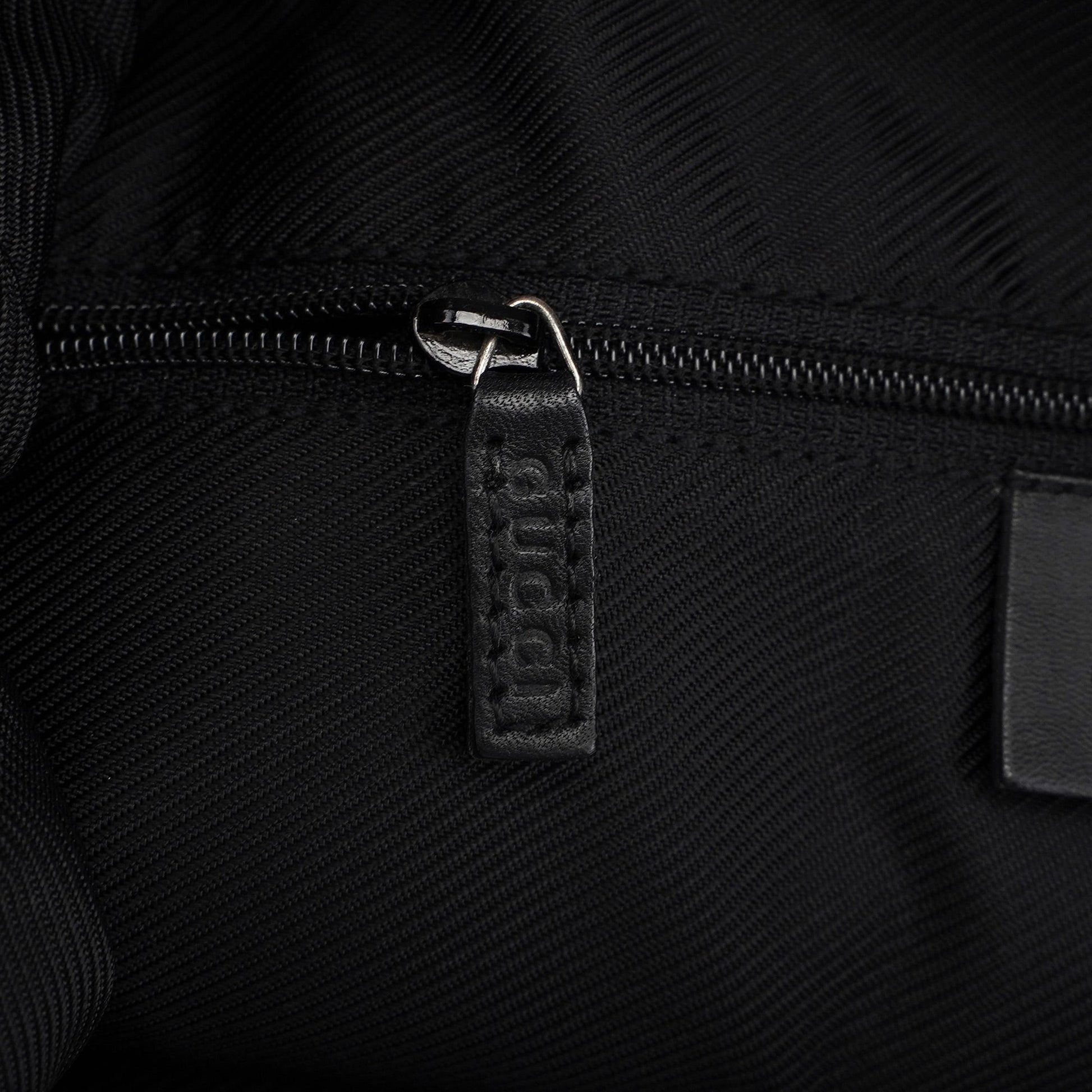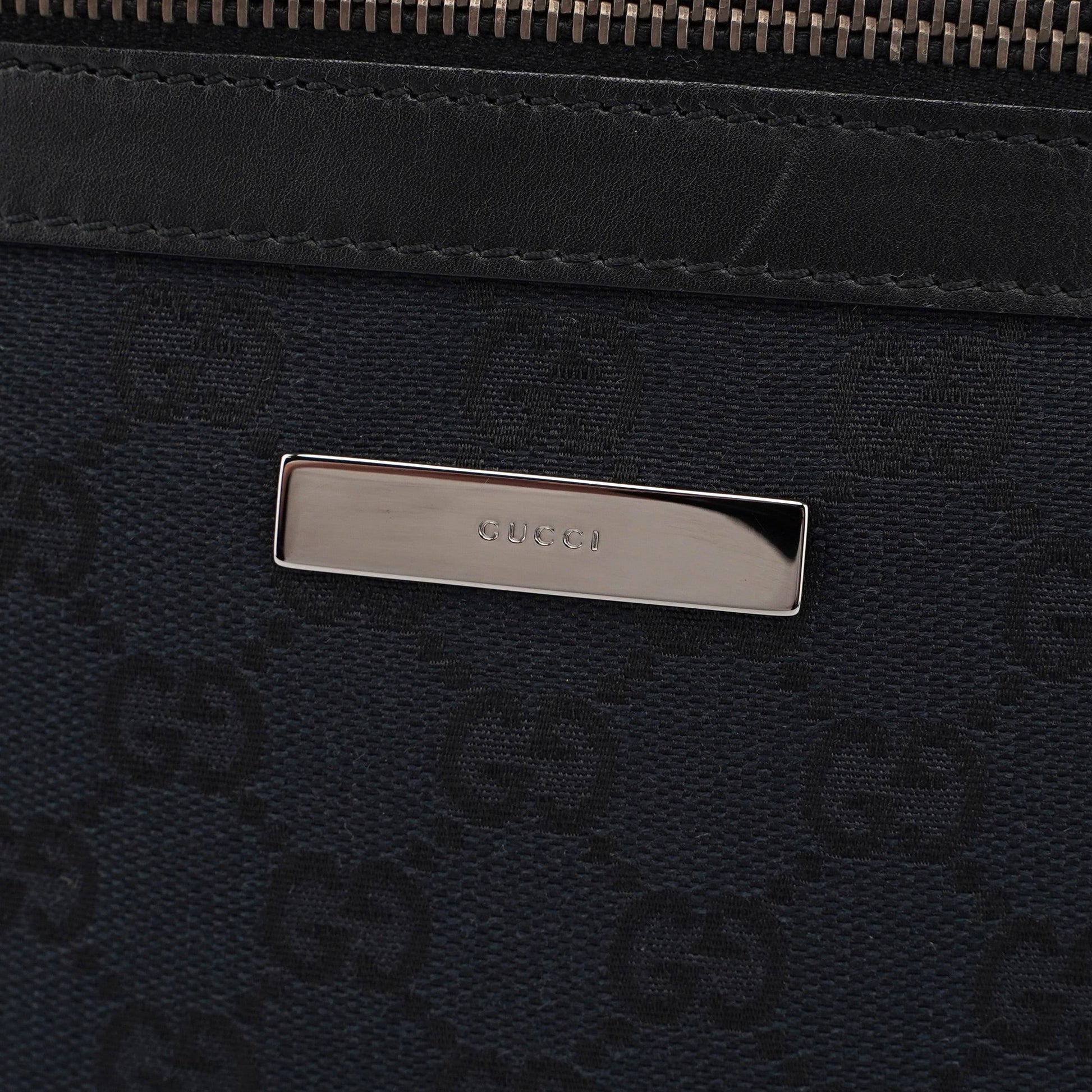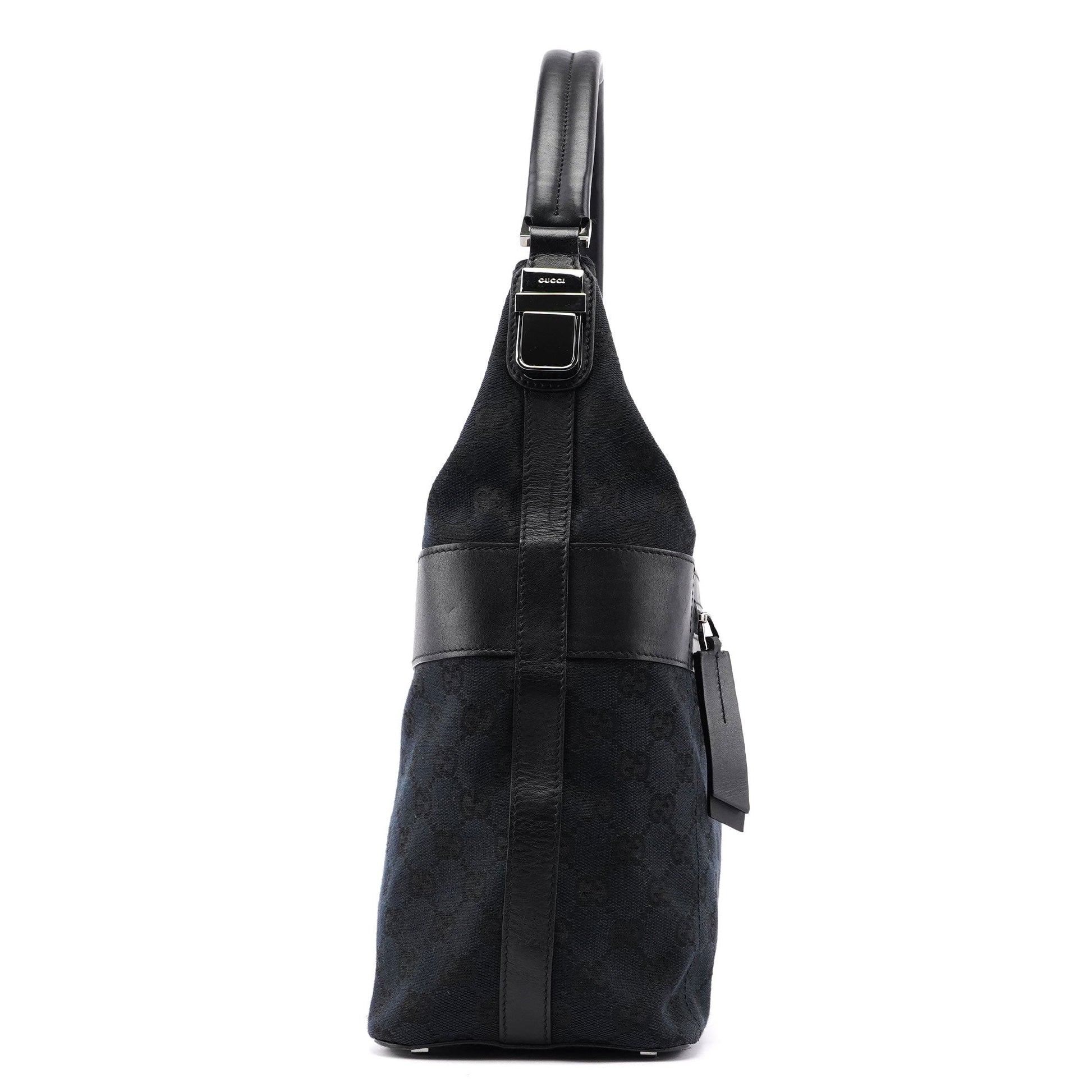 This original Gucci GG hobo shoulder bag, designed by Tom Ford in the late 1990s, is handcrafted from black GG monogram canvas with calfskin leather trim. It features a front zipper pocket, a main zipper closure, and a satin-lined interior with an additional zipper pocket. The Gucci logo plate at the front adds a signature touch of elegance.