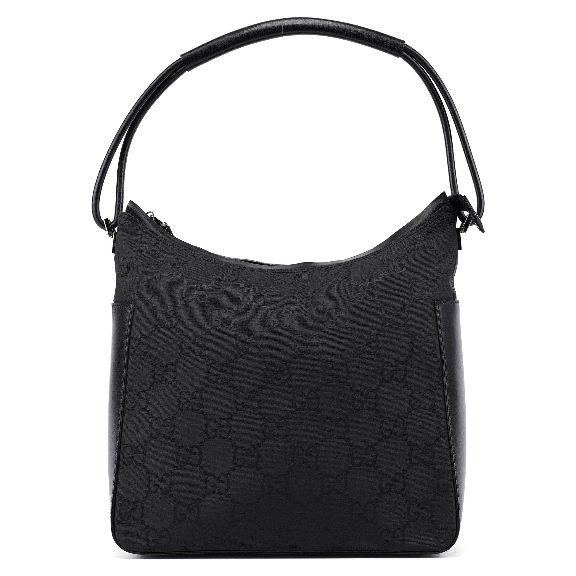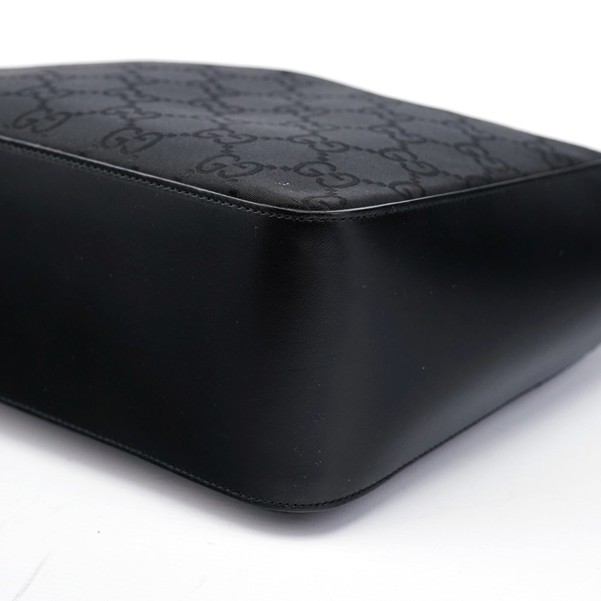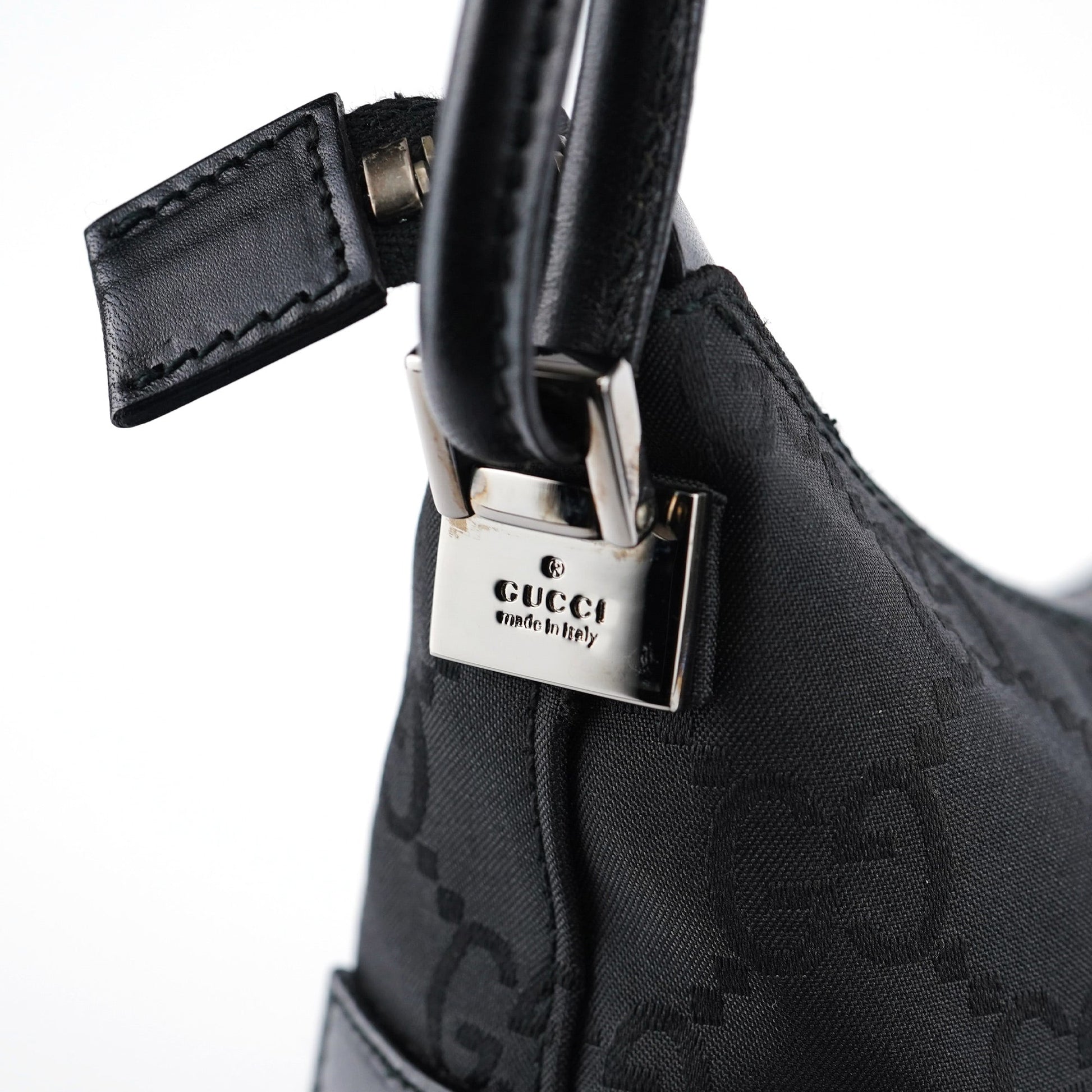 Designed by Tom Ford in the late 1990s, this Gucci GG hobo shoulder bag combines black GG monogram canvas with tonal calfskin leather trim for a sophisticated look. Silver-tone hardware engraved with the Gucci logo adds a refined touch, while the satin-lined interior includes a zipper pocket for organized storage. A timeless blend of elegance and functionality.