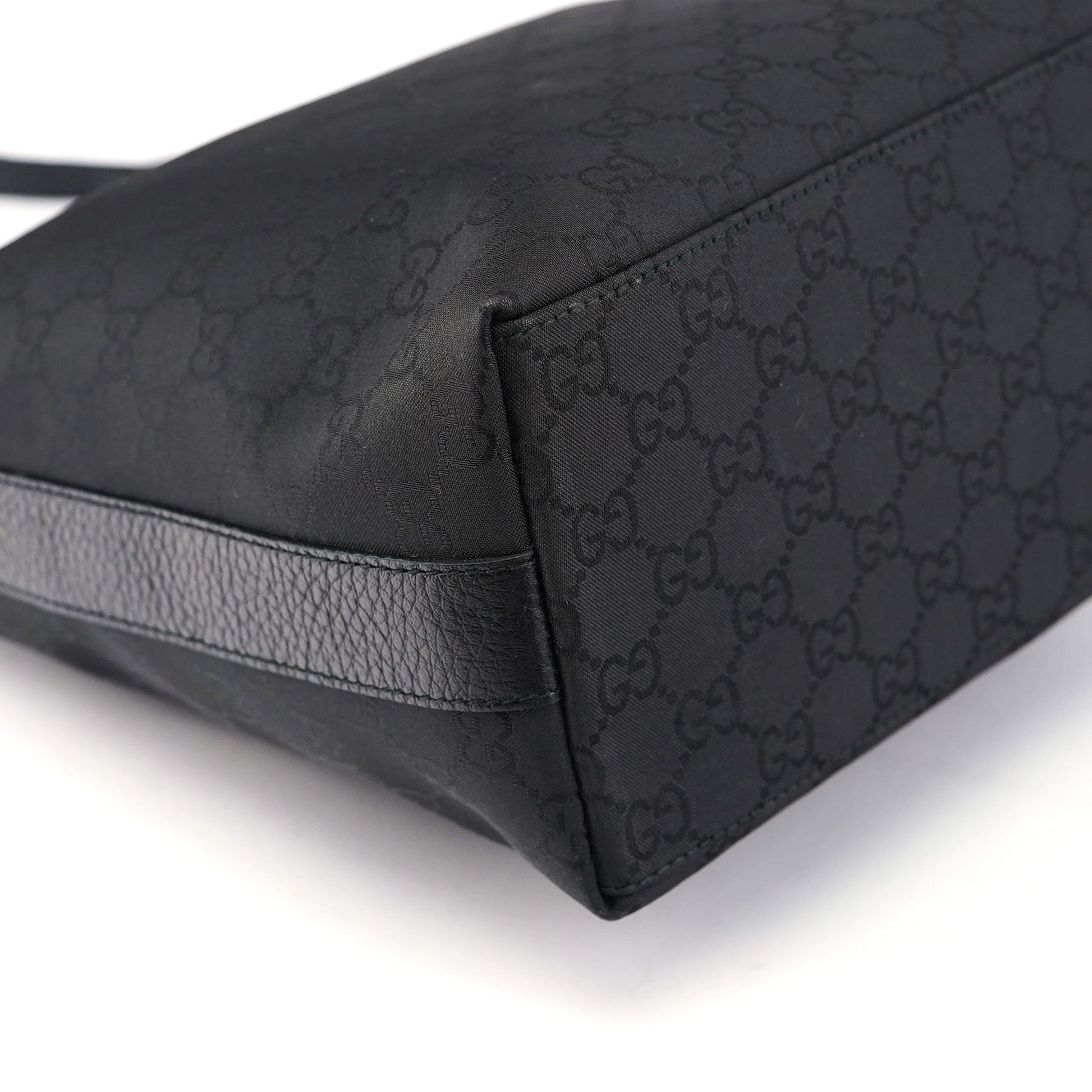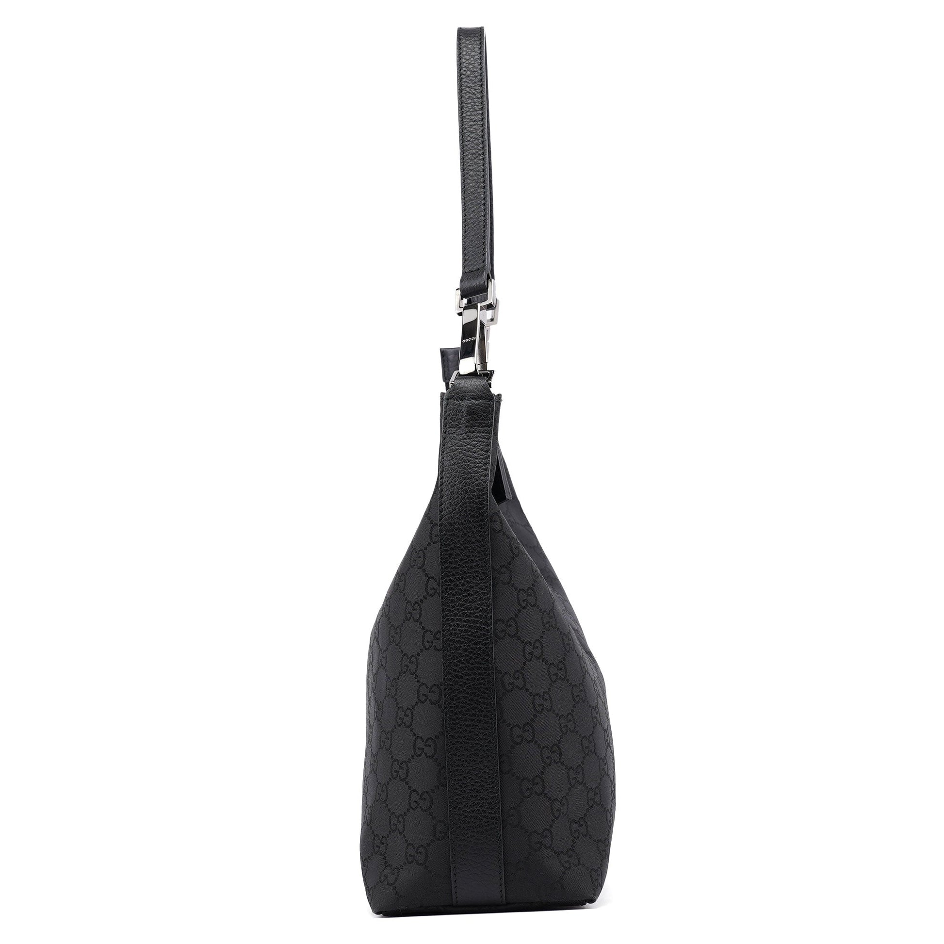 Designed by Tom Ford in the late 1990s, this Gucci GG hobo shoulder bag combines black GG monogram nylon with tonal calfskin leather trim. Silver-tone hardware engraved with the Gucci logo adds a refined touch, while the satin-lined interior includes a zipper pocket for organized storage. A timeless blend of elegance and functionality.