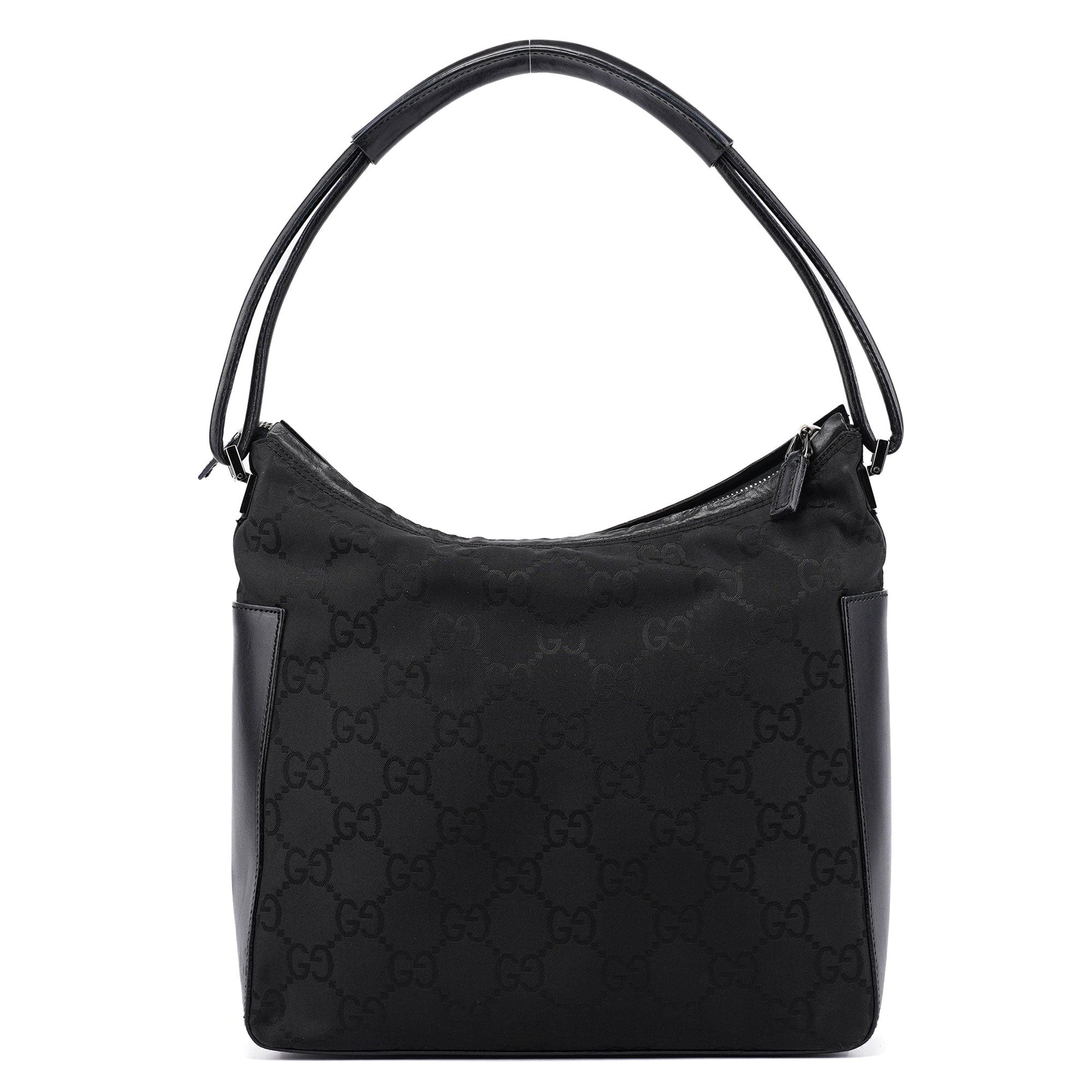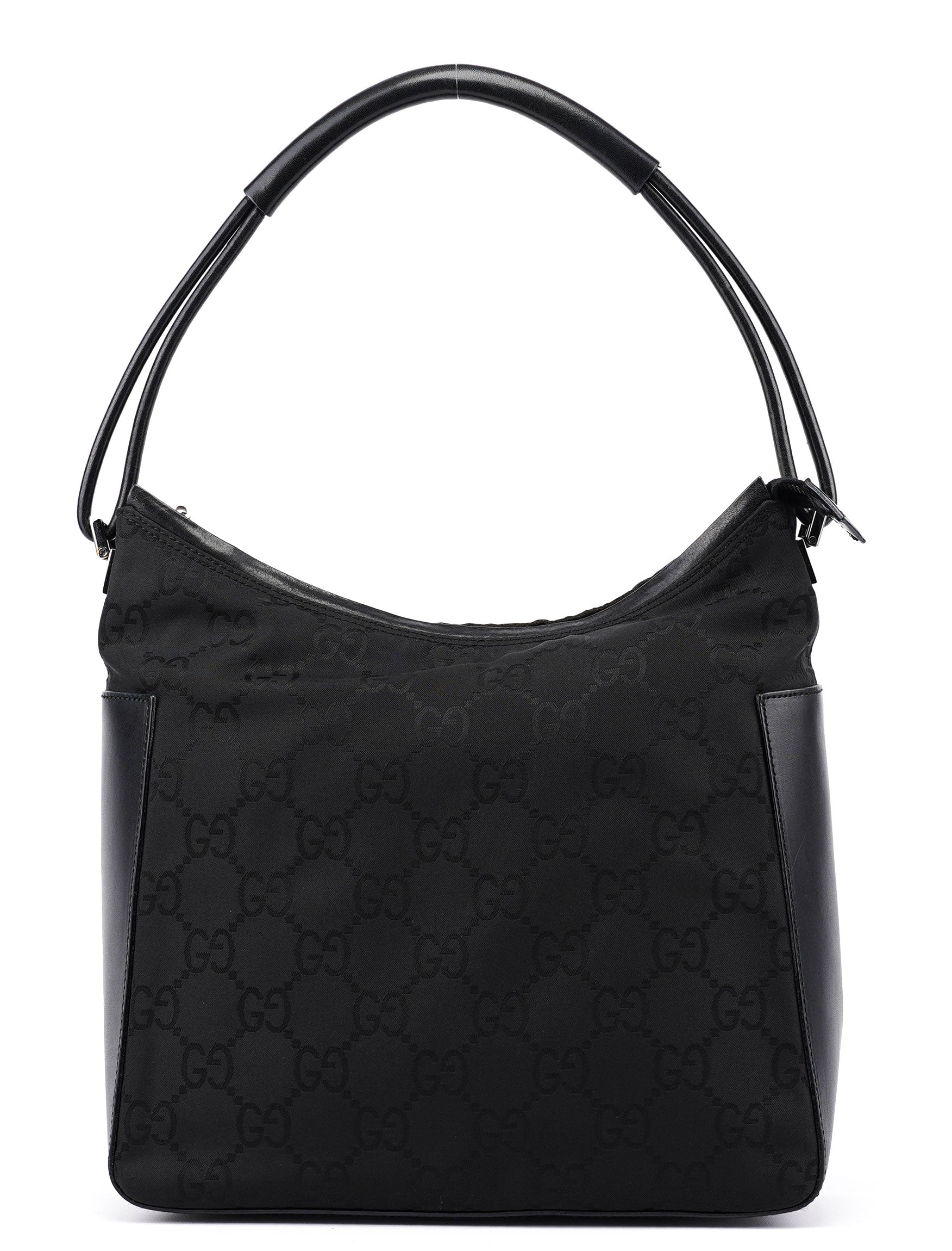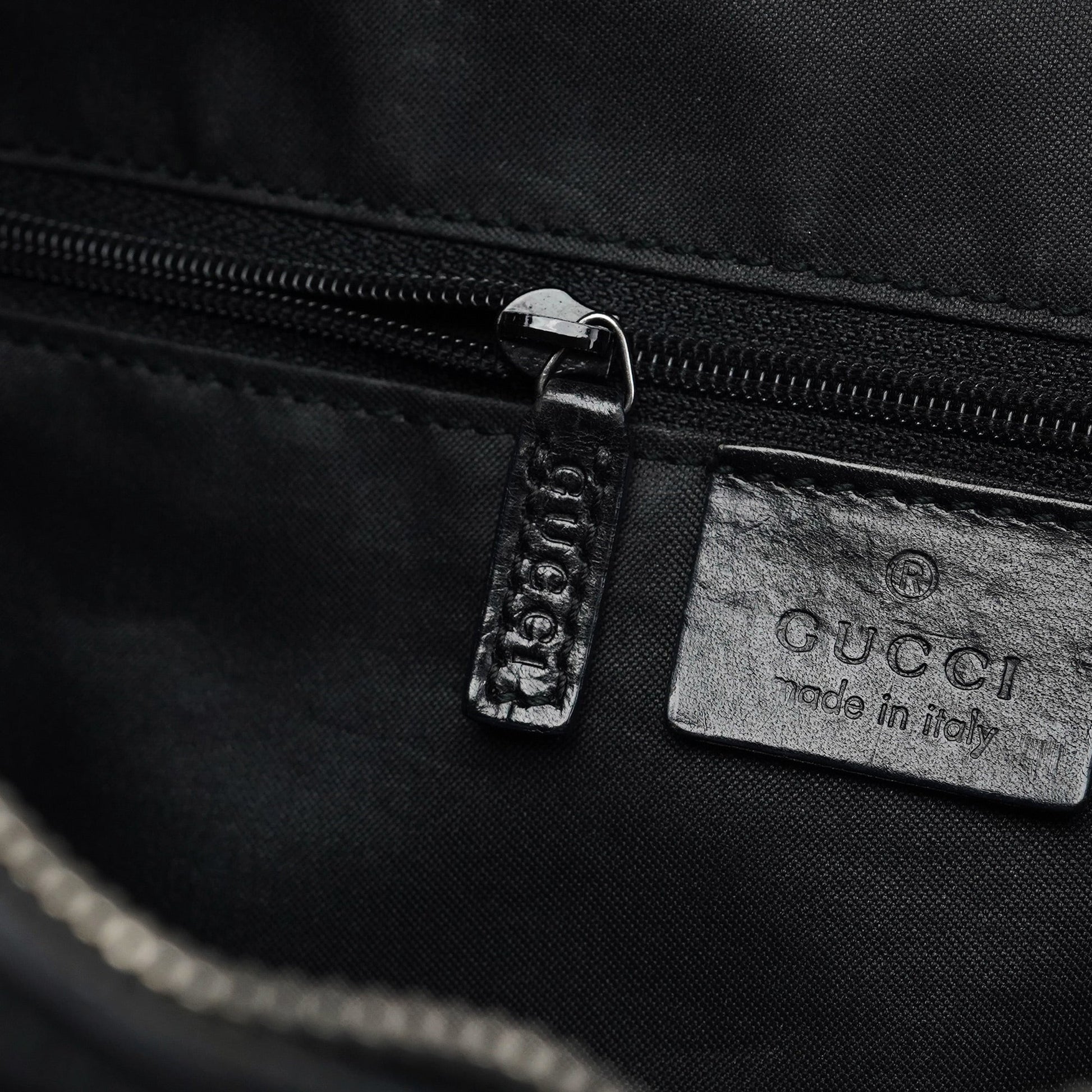 Designed by Tom Ford in the late 1990s, this Gucci hobo bag combines black GG monogram canvas with tonal calfskin leather trim. Silver-tone hardware engraved with the Gucci logo enhances its refined style, while the satin-lined interior includes a convenient zipper pocket for practical storage. A timeless blend of elegance and functionality.