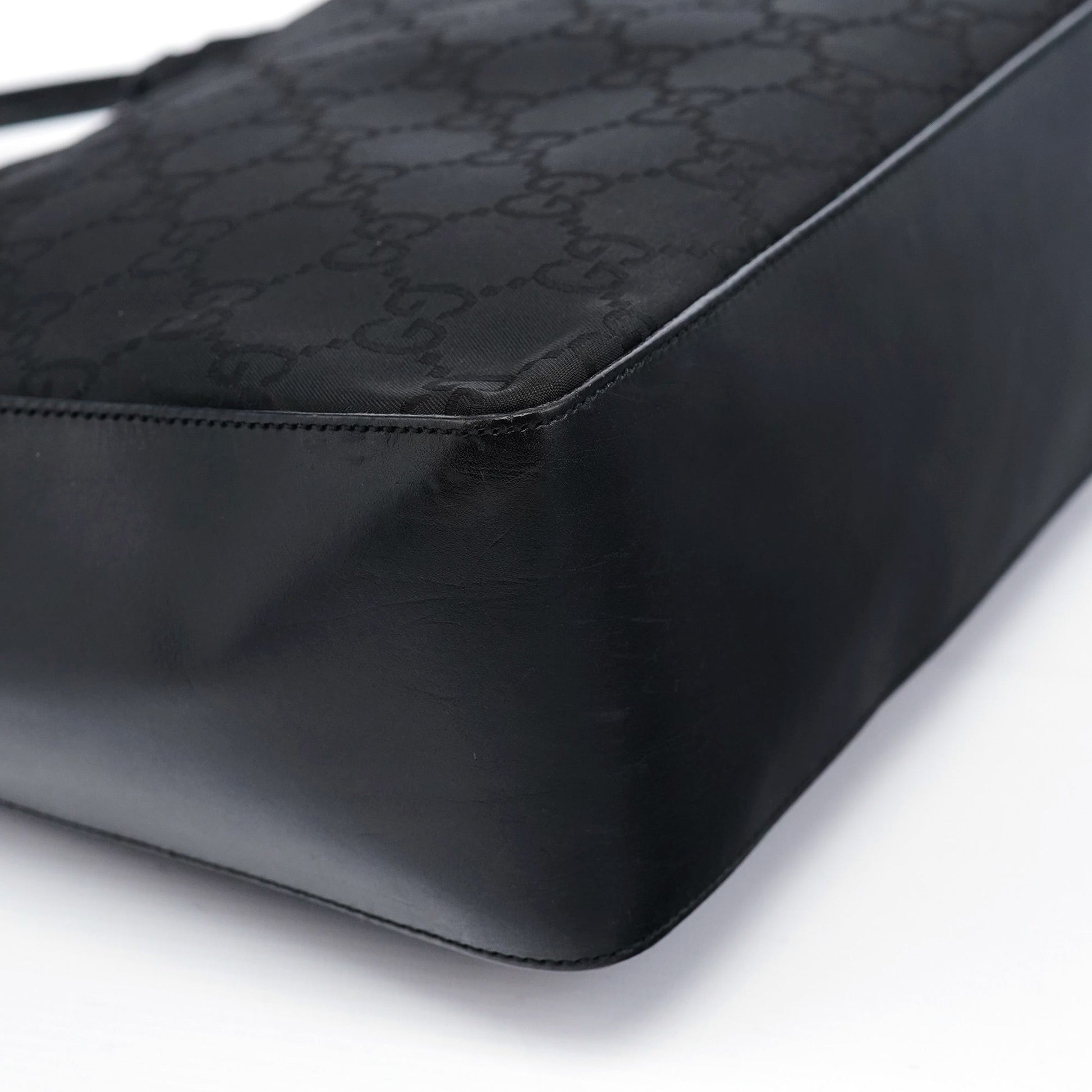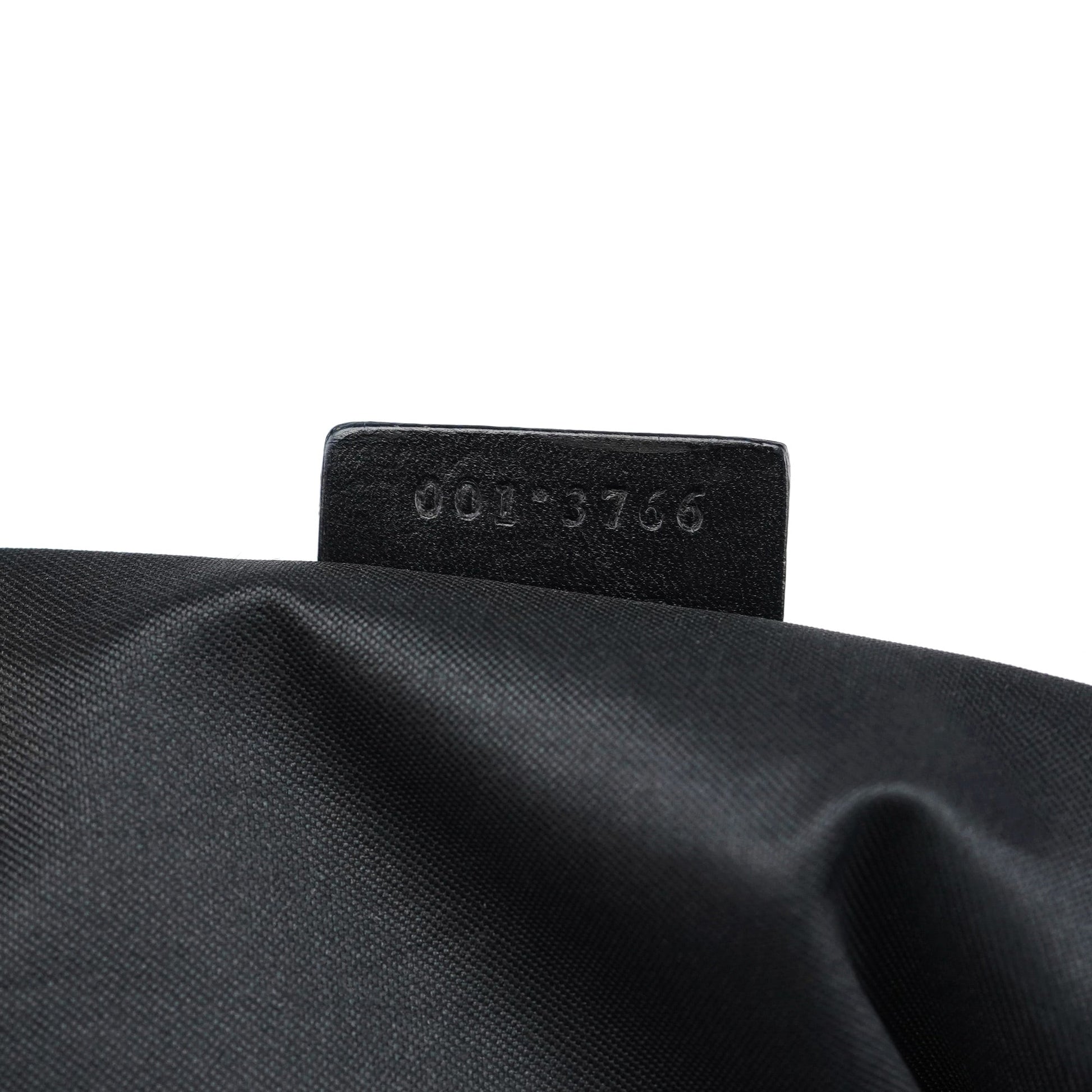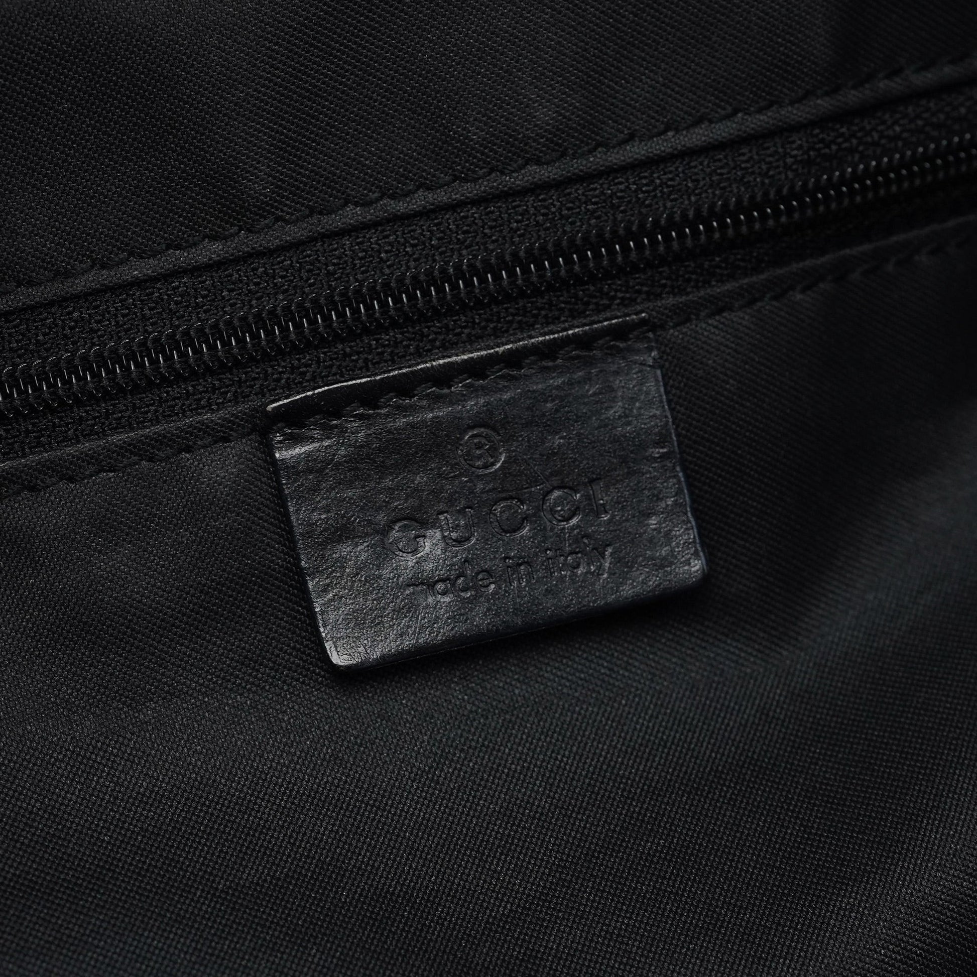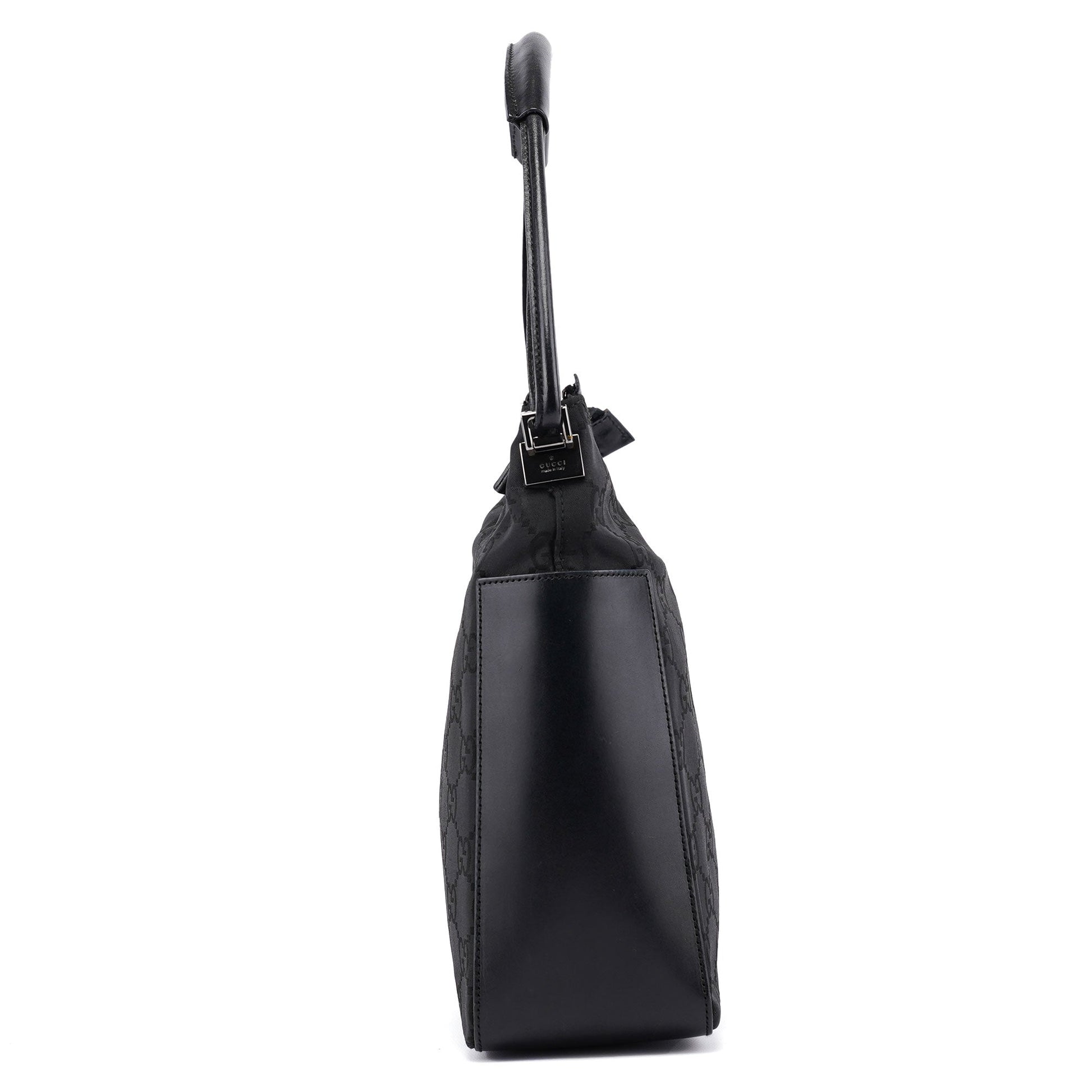 Designed by Tom Ford in the late 1990s, this Gucci hobo bag combines black GG monogram canvas with tonal calfskin leather trim. Silver-tone hardware engraved with the Gucci logo enhances its refined style, while the satin-lined interior includes a convenient zipper pocket for practical storage. A timeless blend of elegance and functionality.