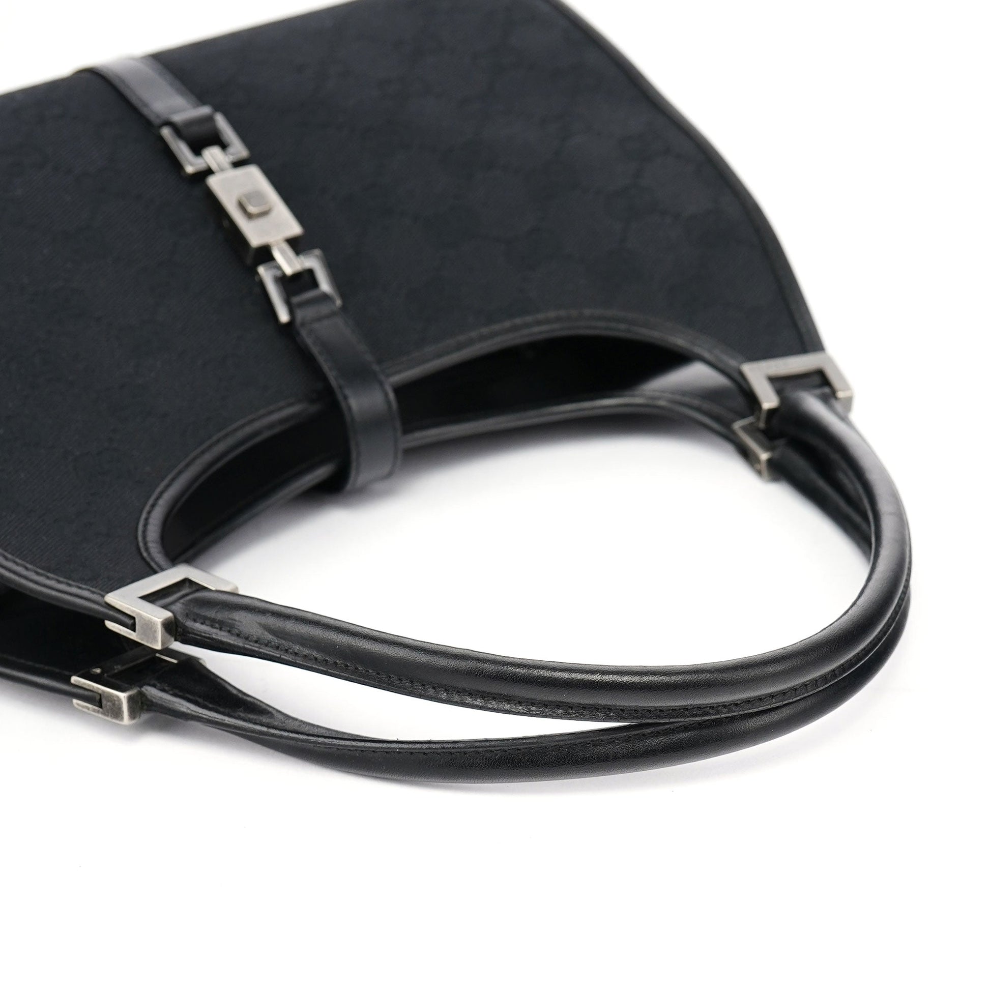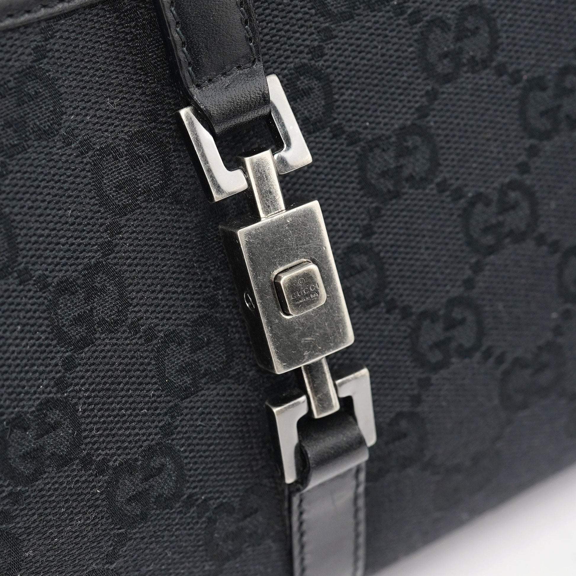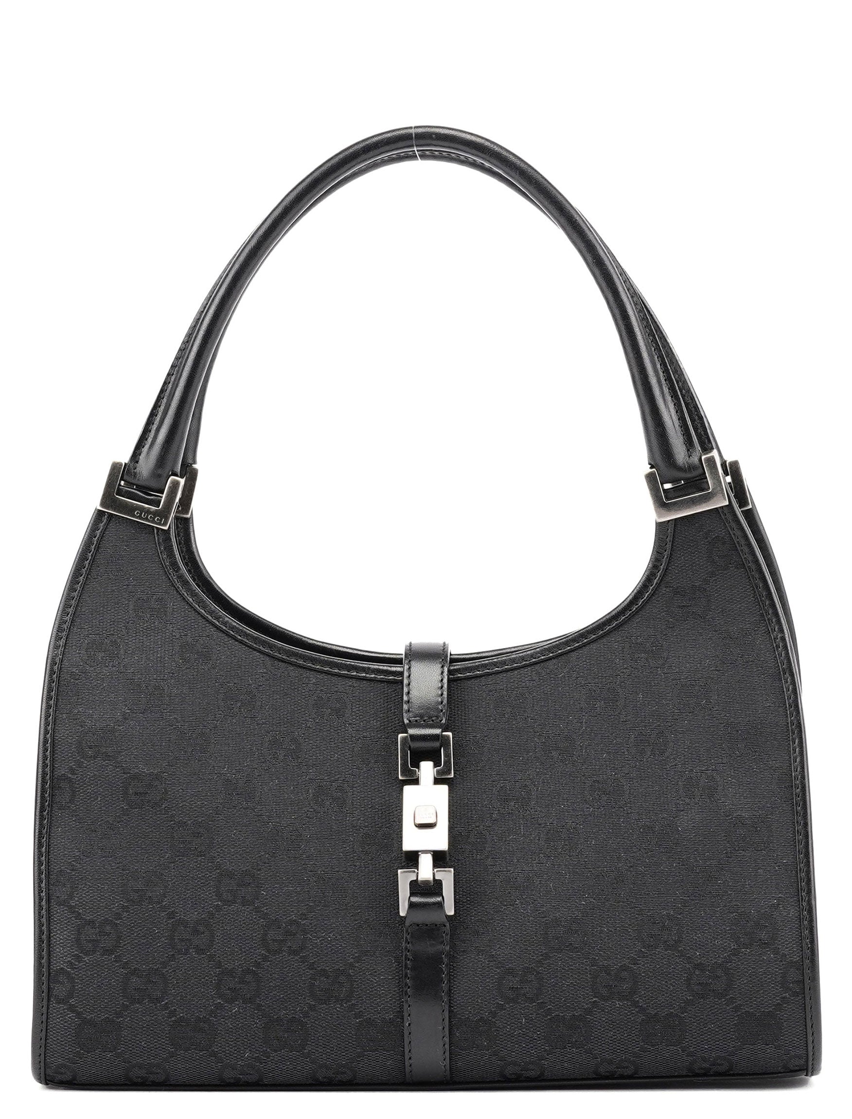 The iconic Gucci GG Jackie shoulder bag, designed by Tom Ford in the late 1990s and now being re-editioned, is crafted from black GG monogram canvas and tonal calfskin leather, with silver-tone hardware engraved with the Gucci logo. It features the signature Jackie clasp closure, while the satin-lined interior includes a practical zipper pocket.