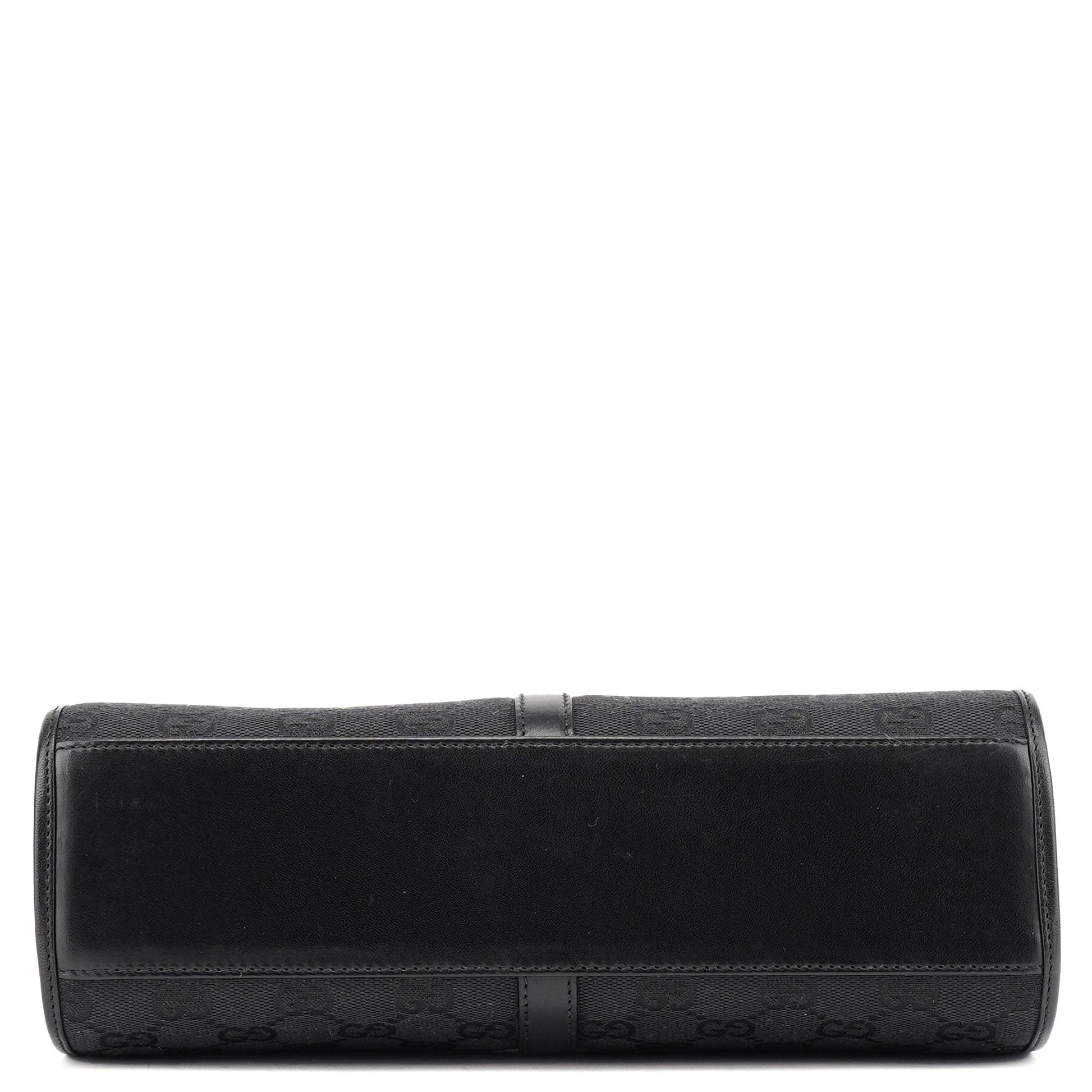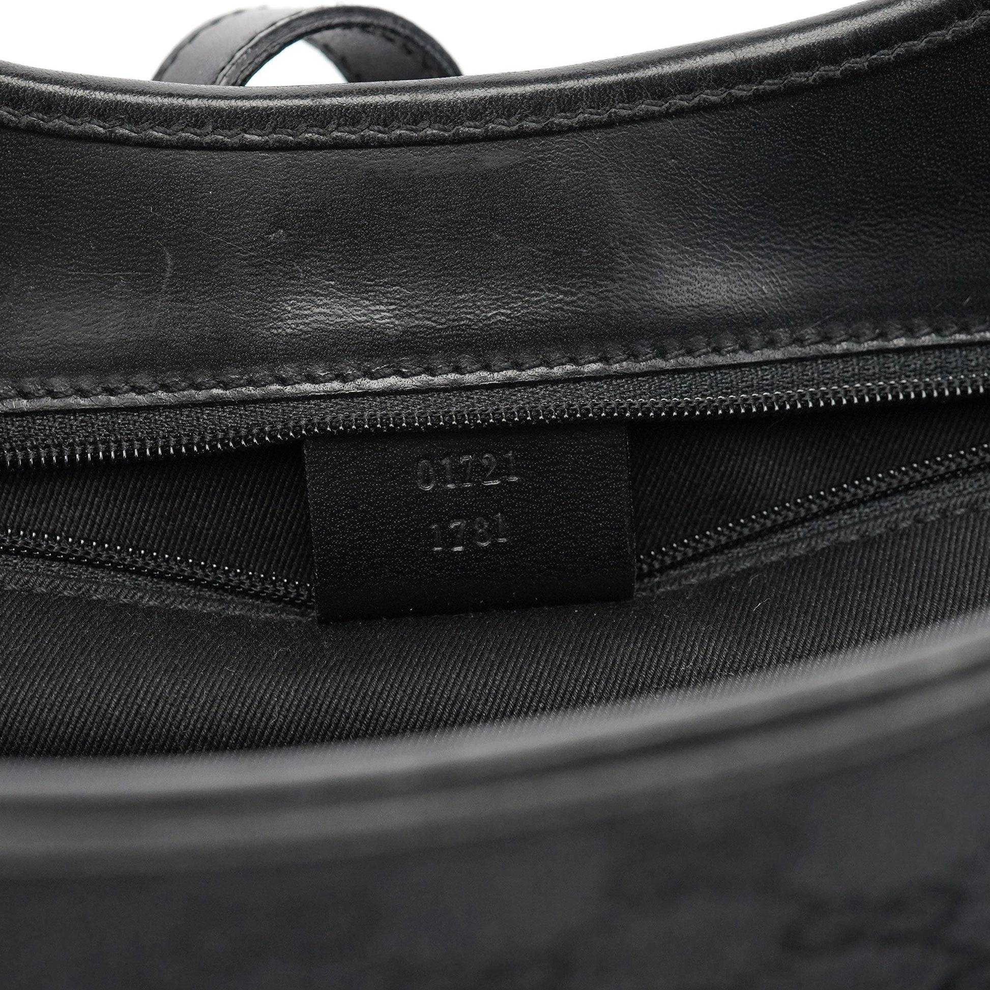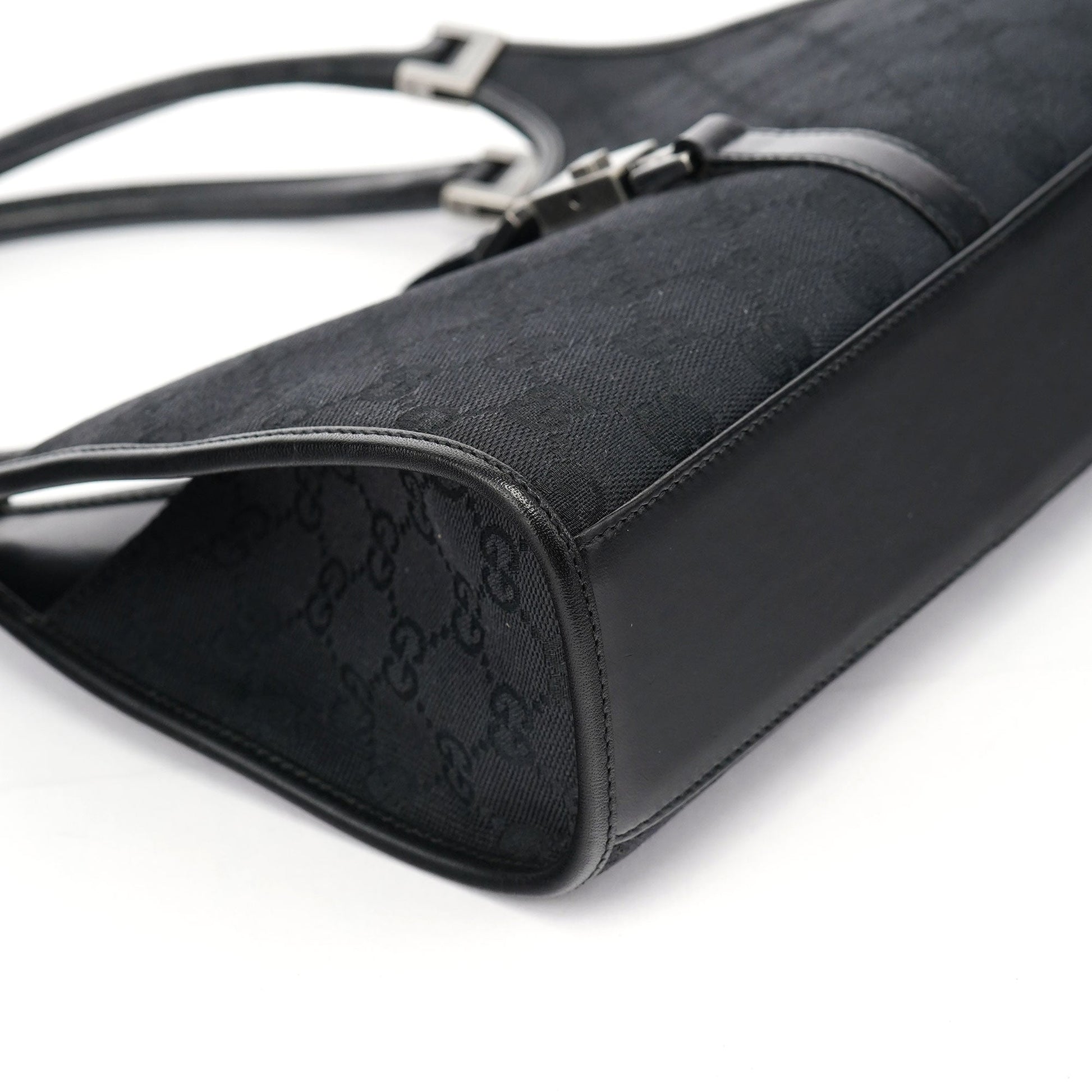 The iconic Gucci GG Jackie shoulder bag, designed by Tom Ford in the late 1990s and now being re-editioned, is crafted from black GG monogram canvas and tonal calfskin leather, with silver-tone hardware engraved with the Gucci logo. It features the signature Jackie clasp closure, while the satin-lined interior includes a practical zipper pocket.
