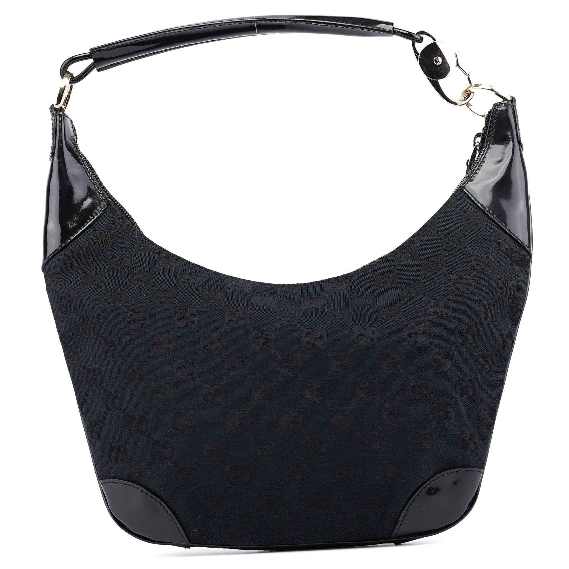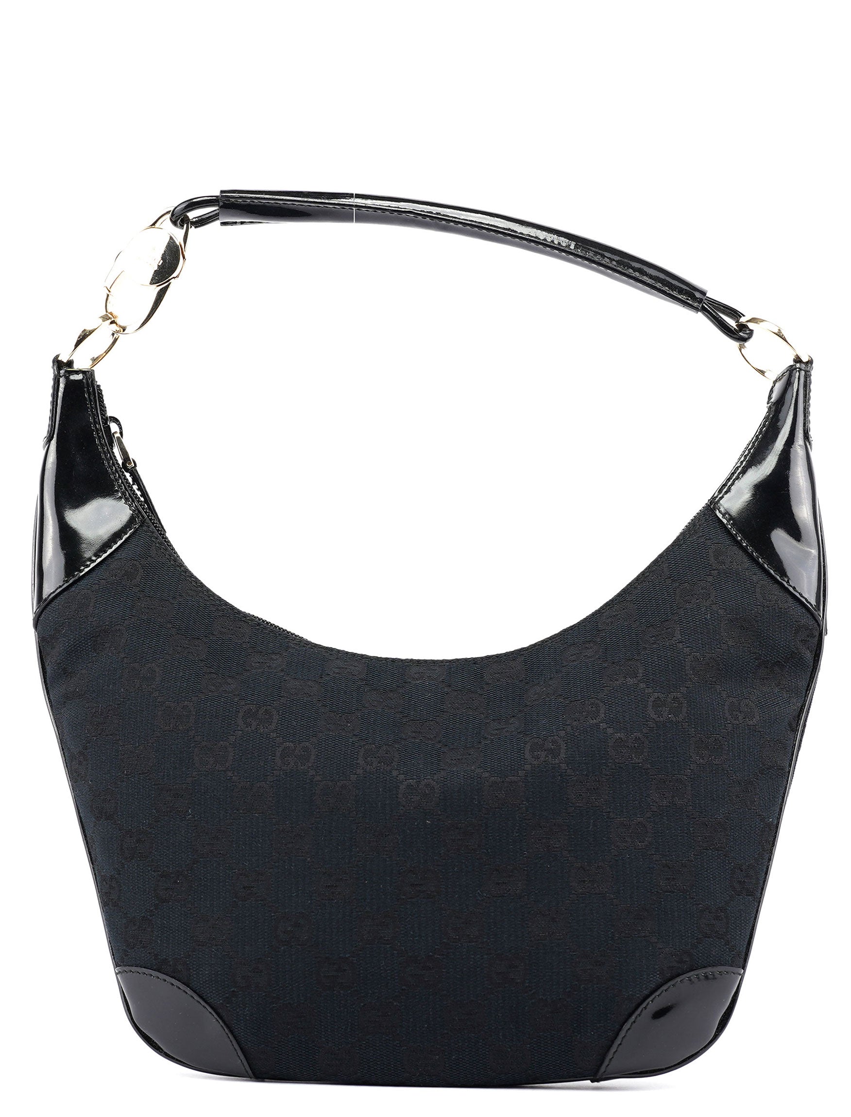 Designed by Tom Ford in the late 1990s, this Gucci GG shoulder bag is crafted from black GG monogram canvas with black patent leather trim. Gold-tone hardware engraved with the Gucci logo adds a touch of elegance, while the satin-lined interior with a zipper pocket and secure zipper closure offers timeless functionality and style.