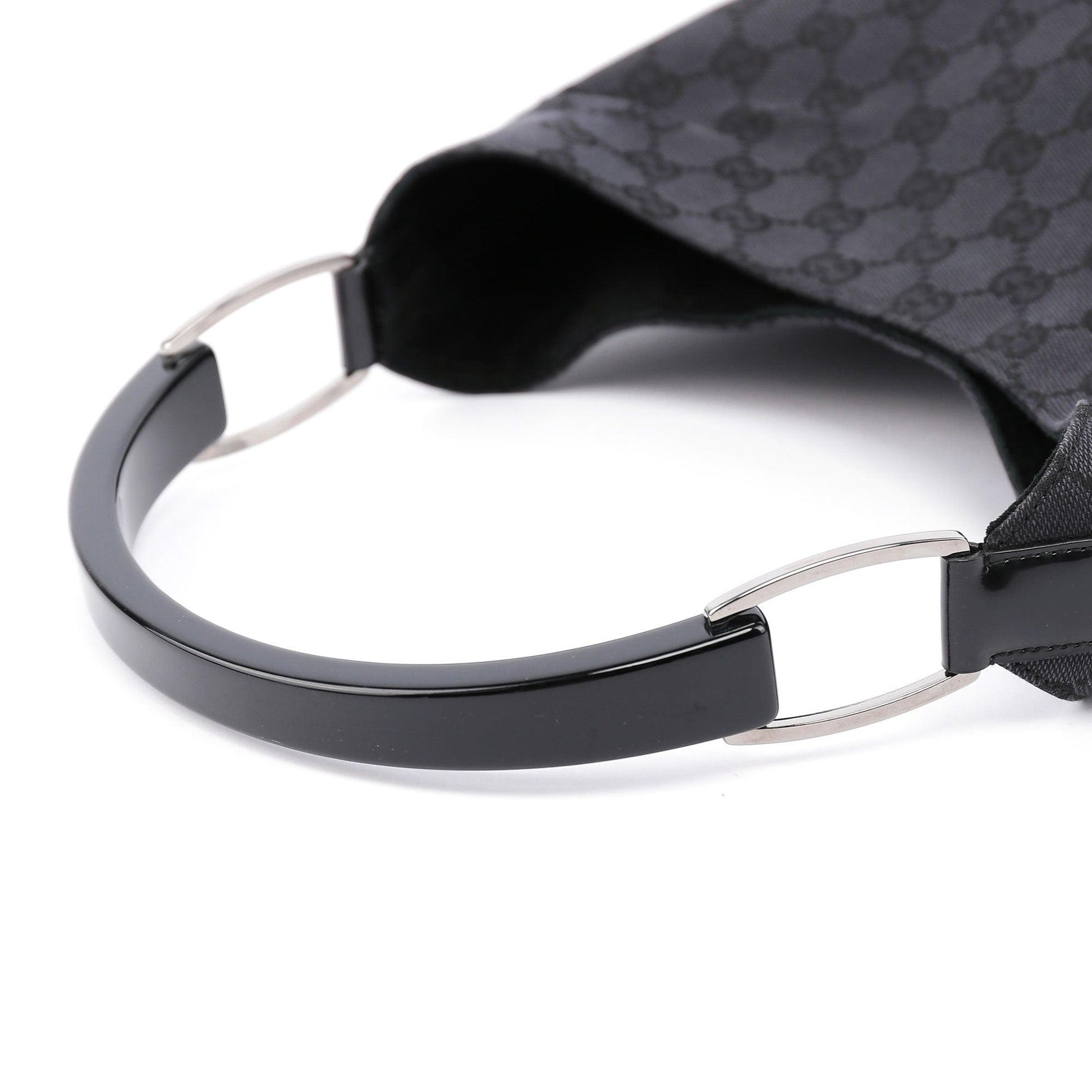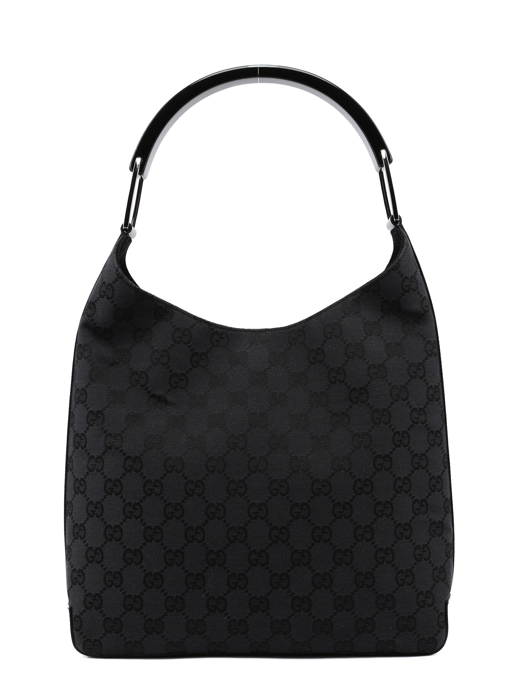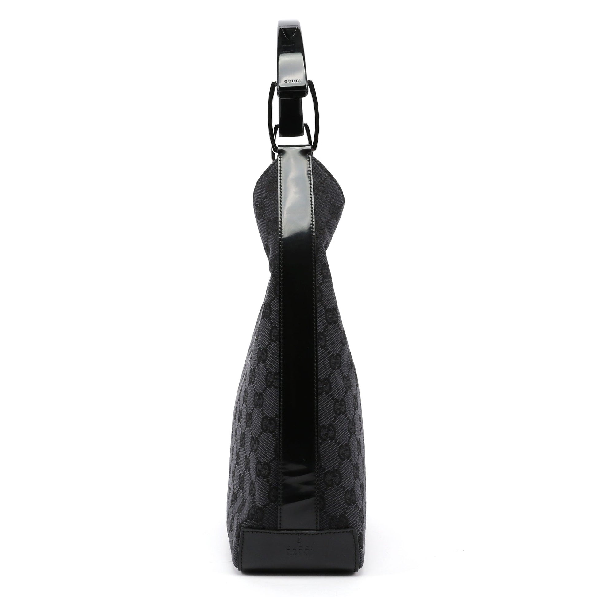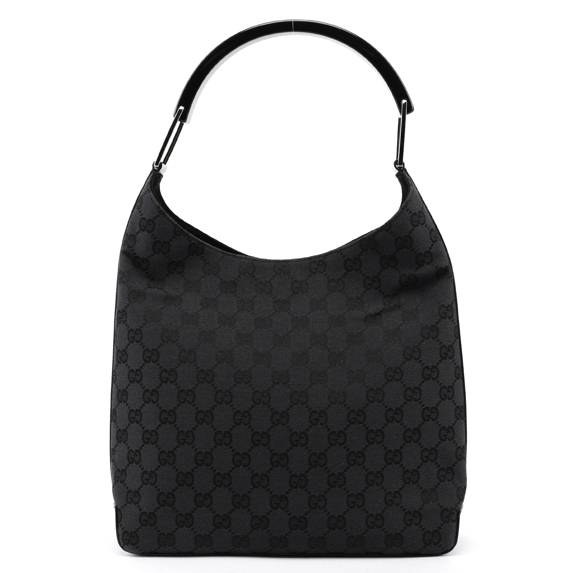 Designed by Tom Ford in the late '90s, this Gucci GG monogram shoulder bag is handcrafted in anthracite GG monogram canvas, silver-tone hardware, and patent leather trim with an embossed logo. A plastic handle with the Gucci logo engraved adds a unique touch. Its suede-lined interior includes a zipper pocket, combining iconic style with functionality.