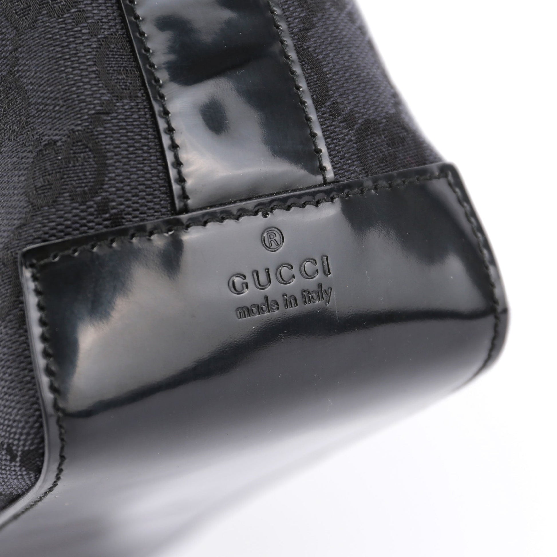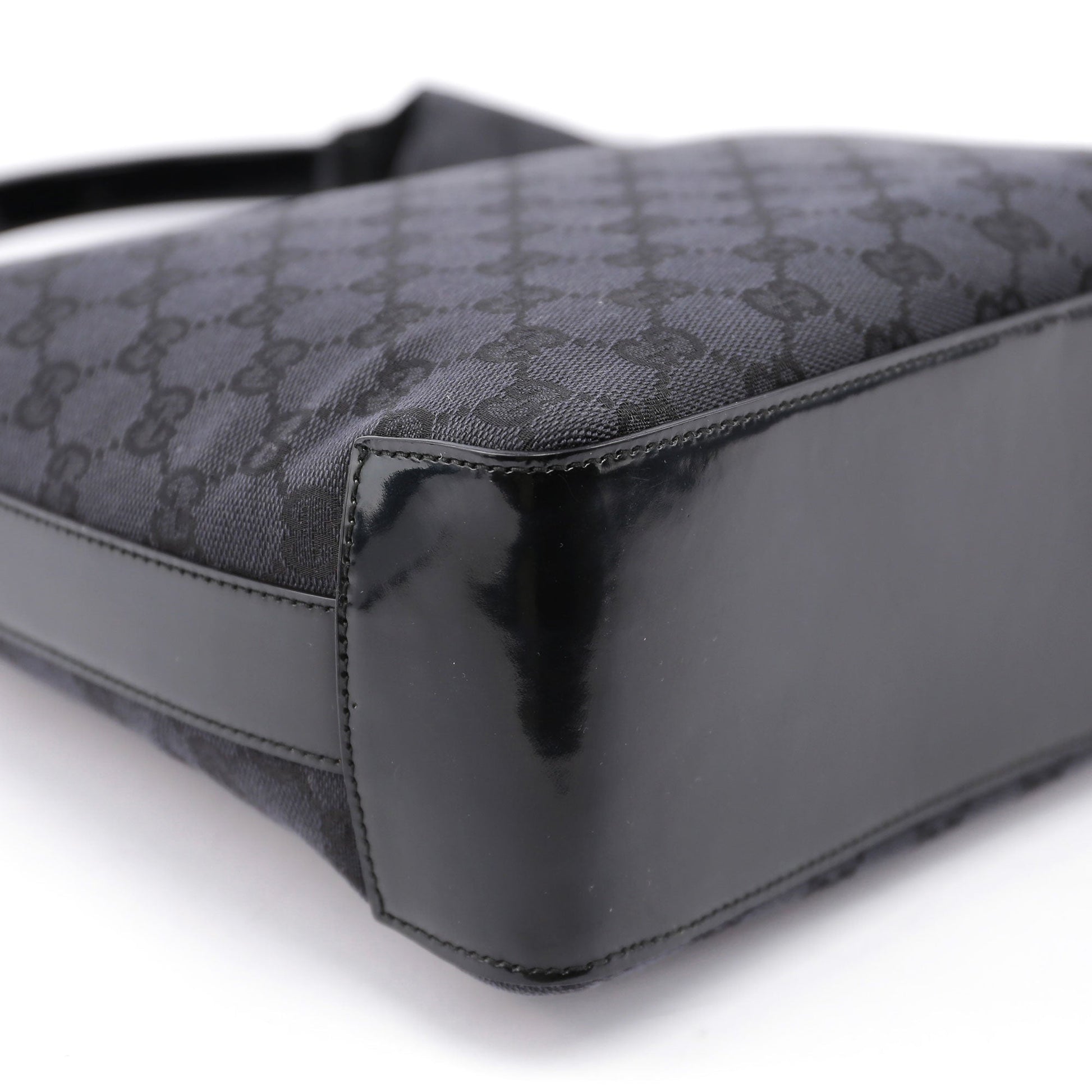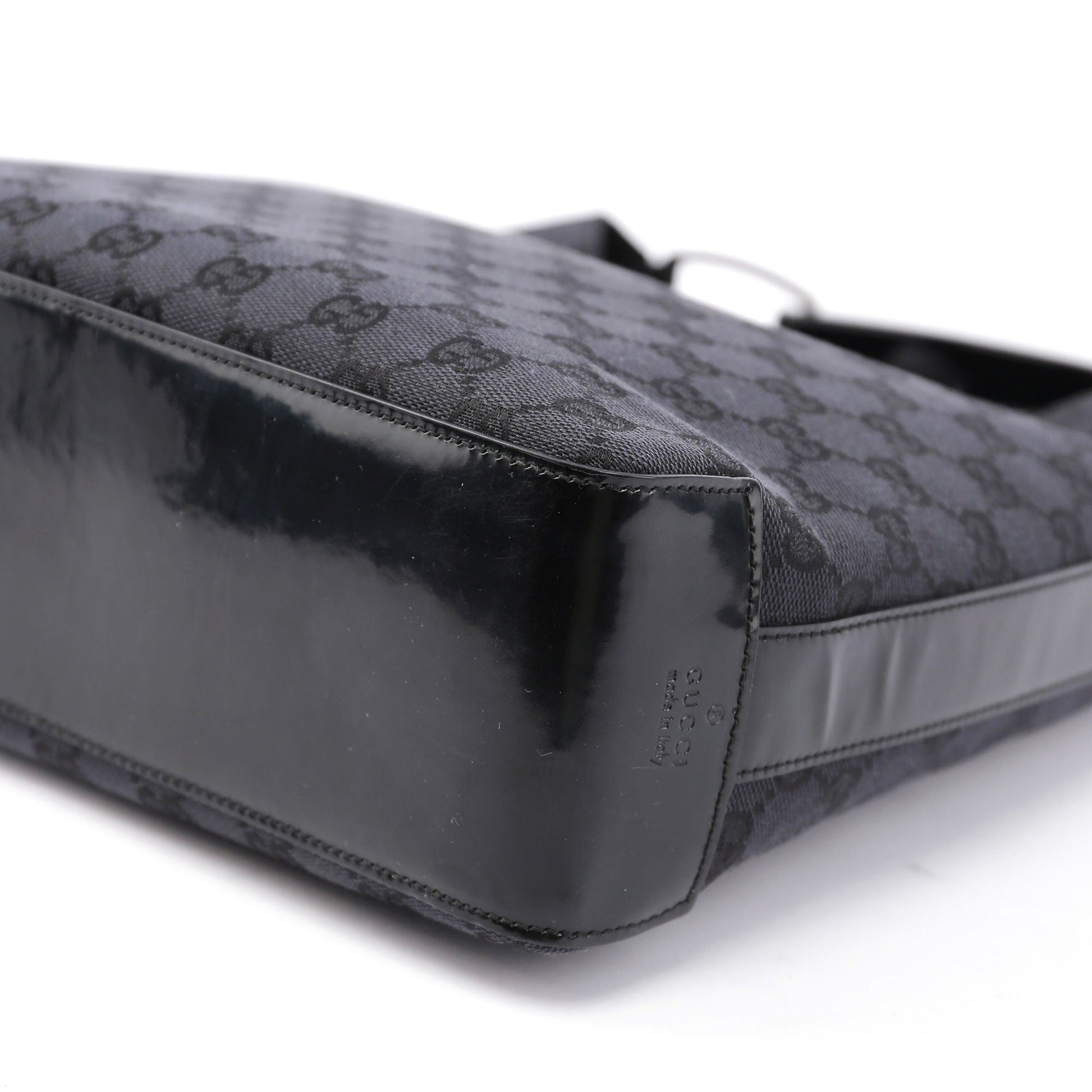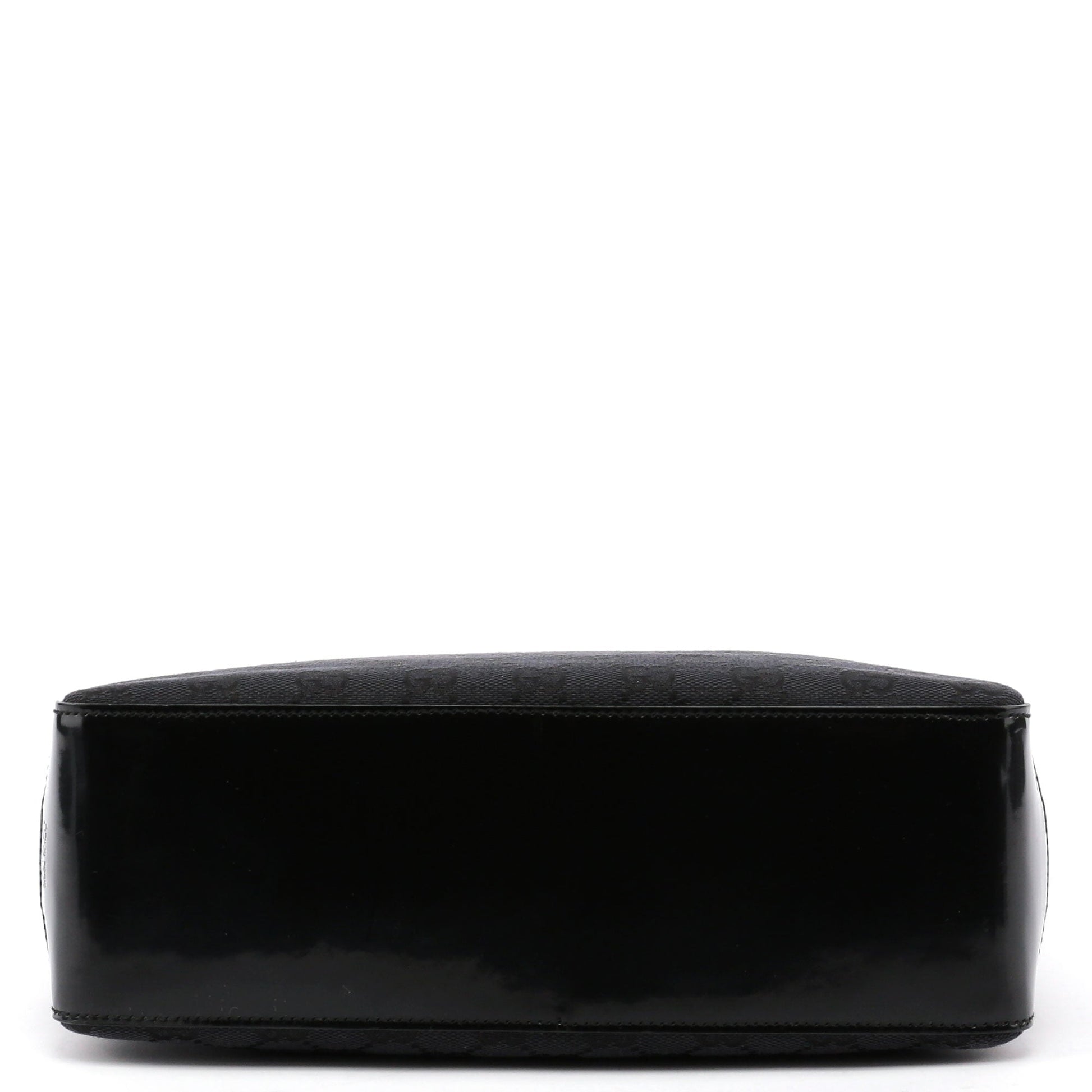 Designed by Tom Ford in the late '90s, this Gucci GG monogram shoulder bag is handcrafted in anthracite GG monogram canvas, silver-tone hardware, and patent leather trim with an embossed logo. A plastic handle with the Gucci logo engraved adds a unique touch. Its suede-lined interior includes a zipper pocket, combining iconic style with functionality.