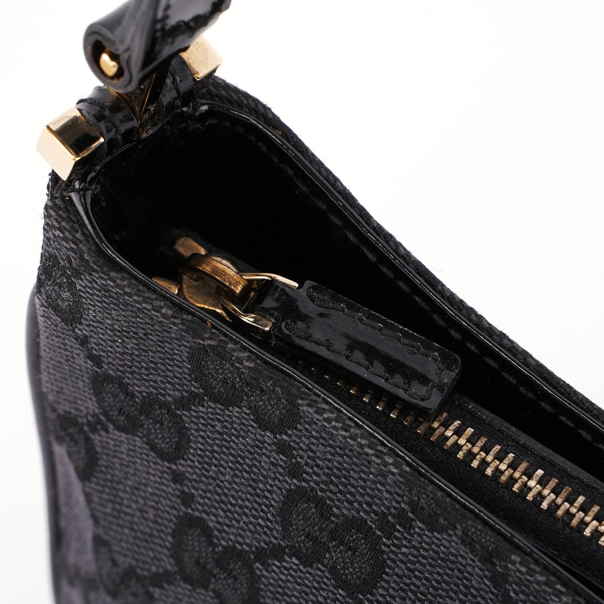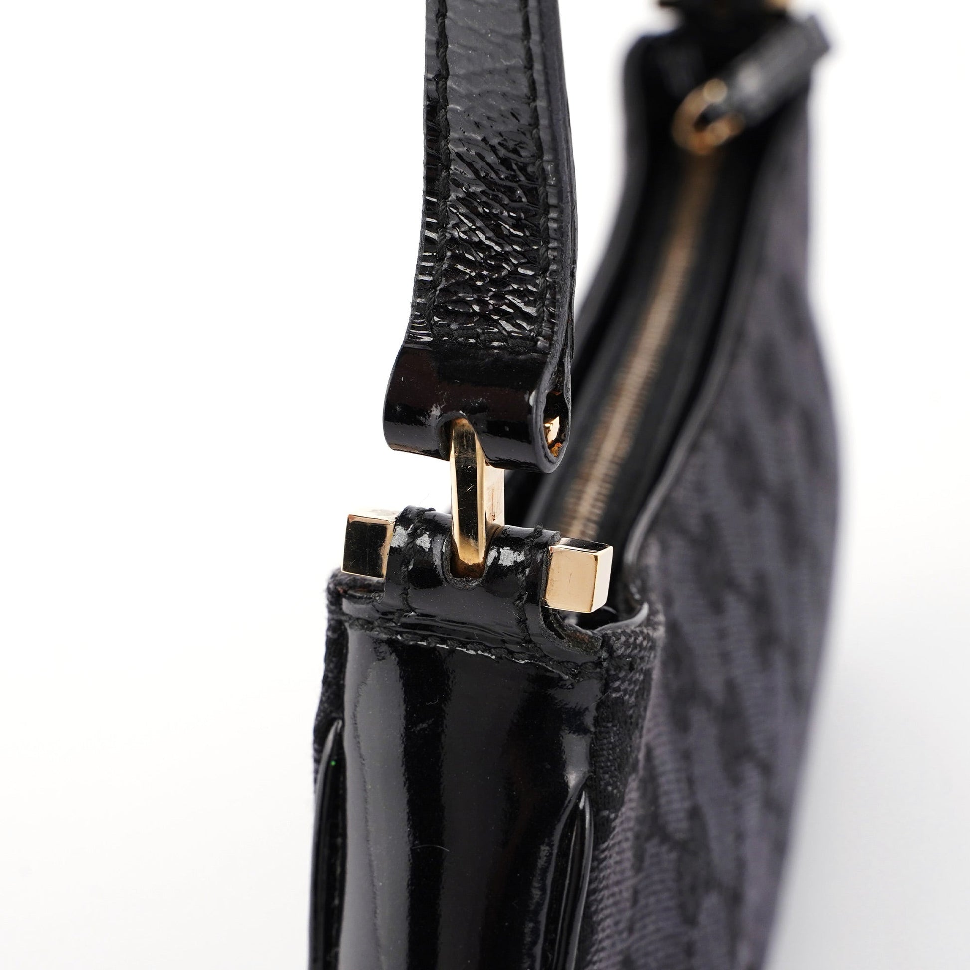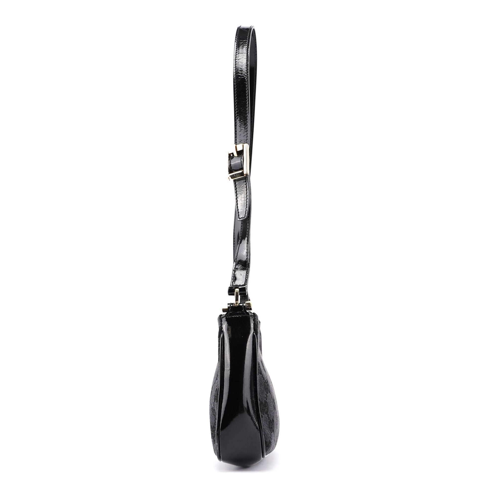 Designed by Tom Ford in the late 1990s, the Gucci GG mini hobo bag is handcrafted in black GG monogram canvas and black patent leather. Its gold-tone hardware hardware add a touch of elegance. Lined with satin, it features a small interior pocket for essentials.