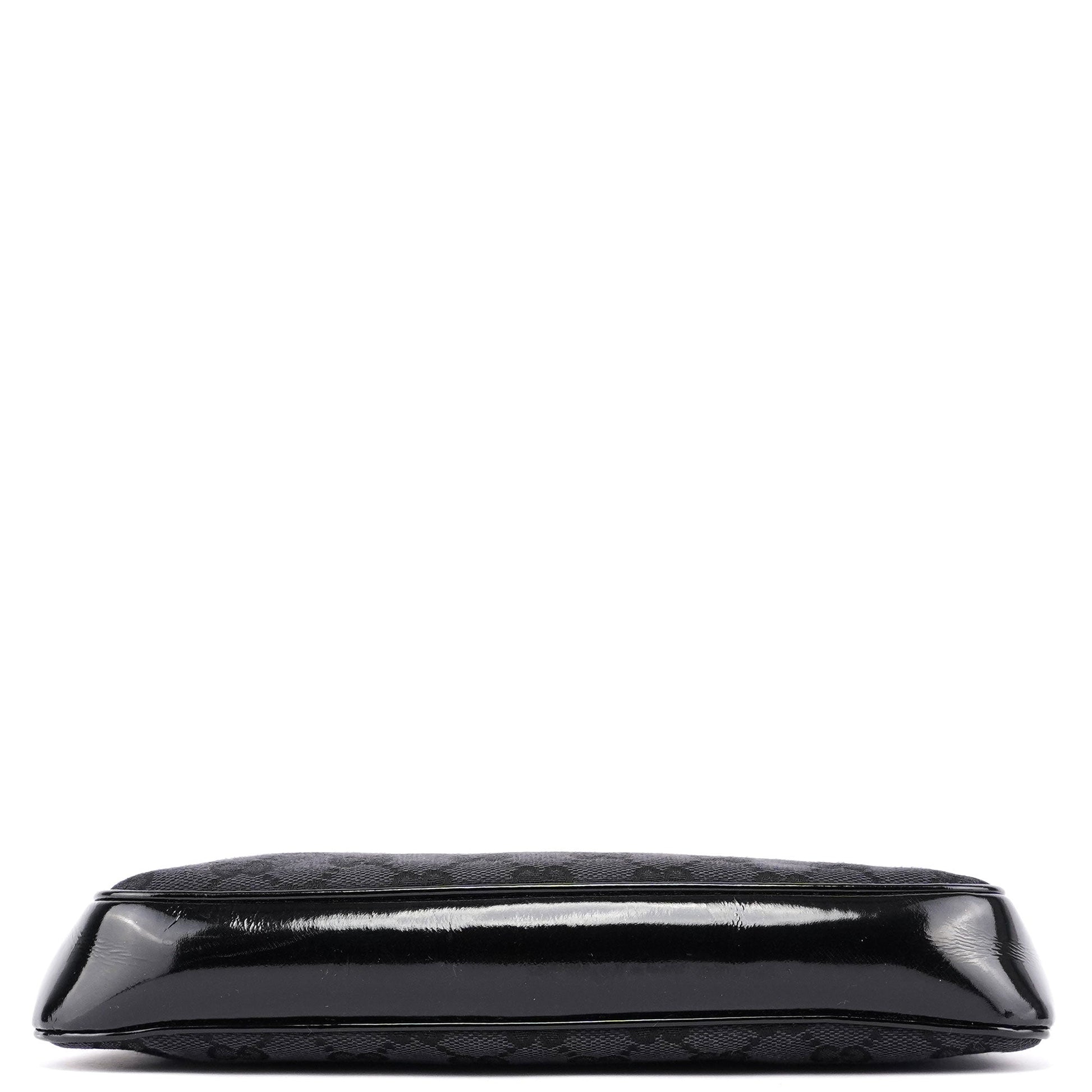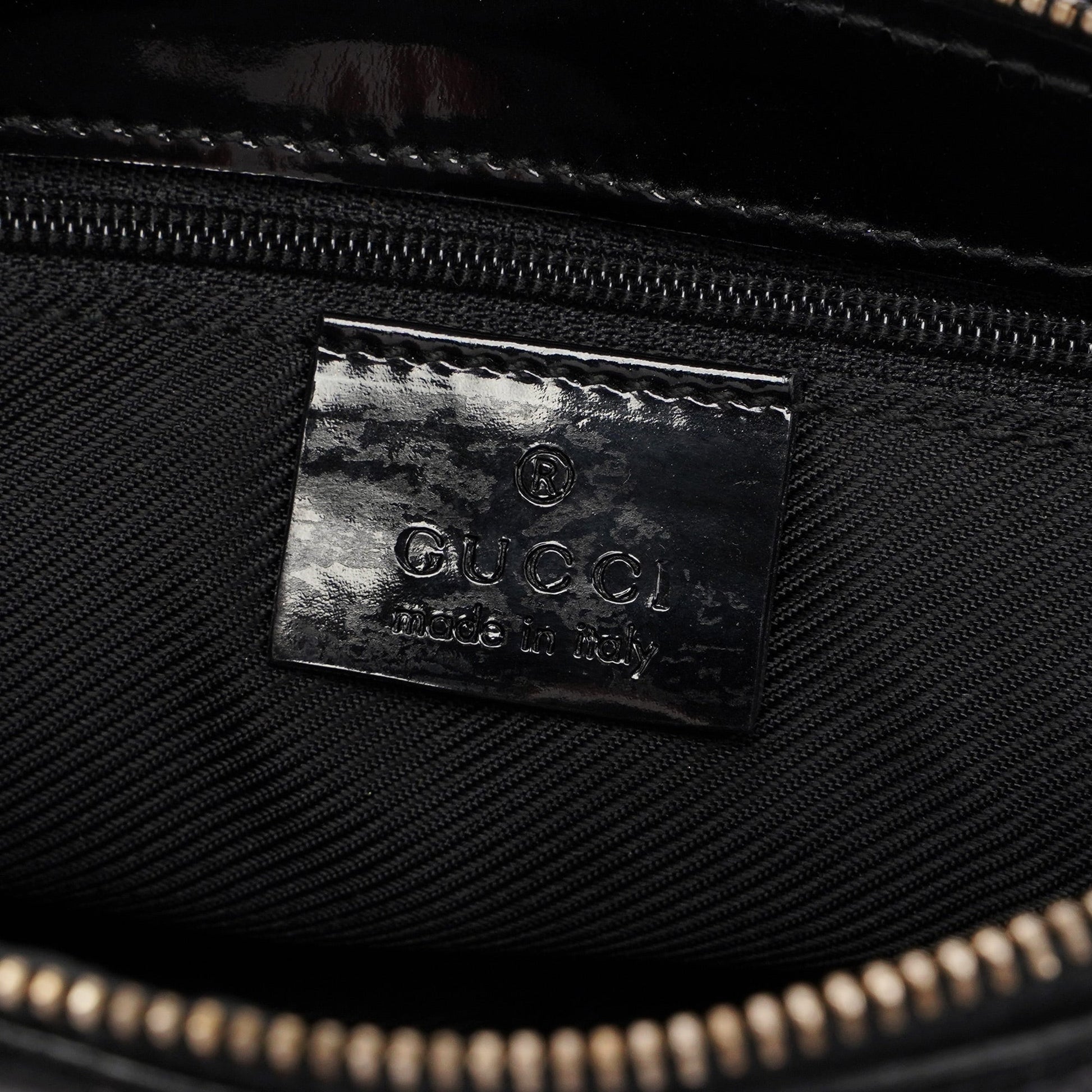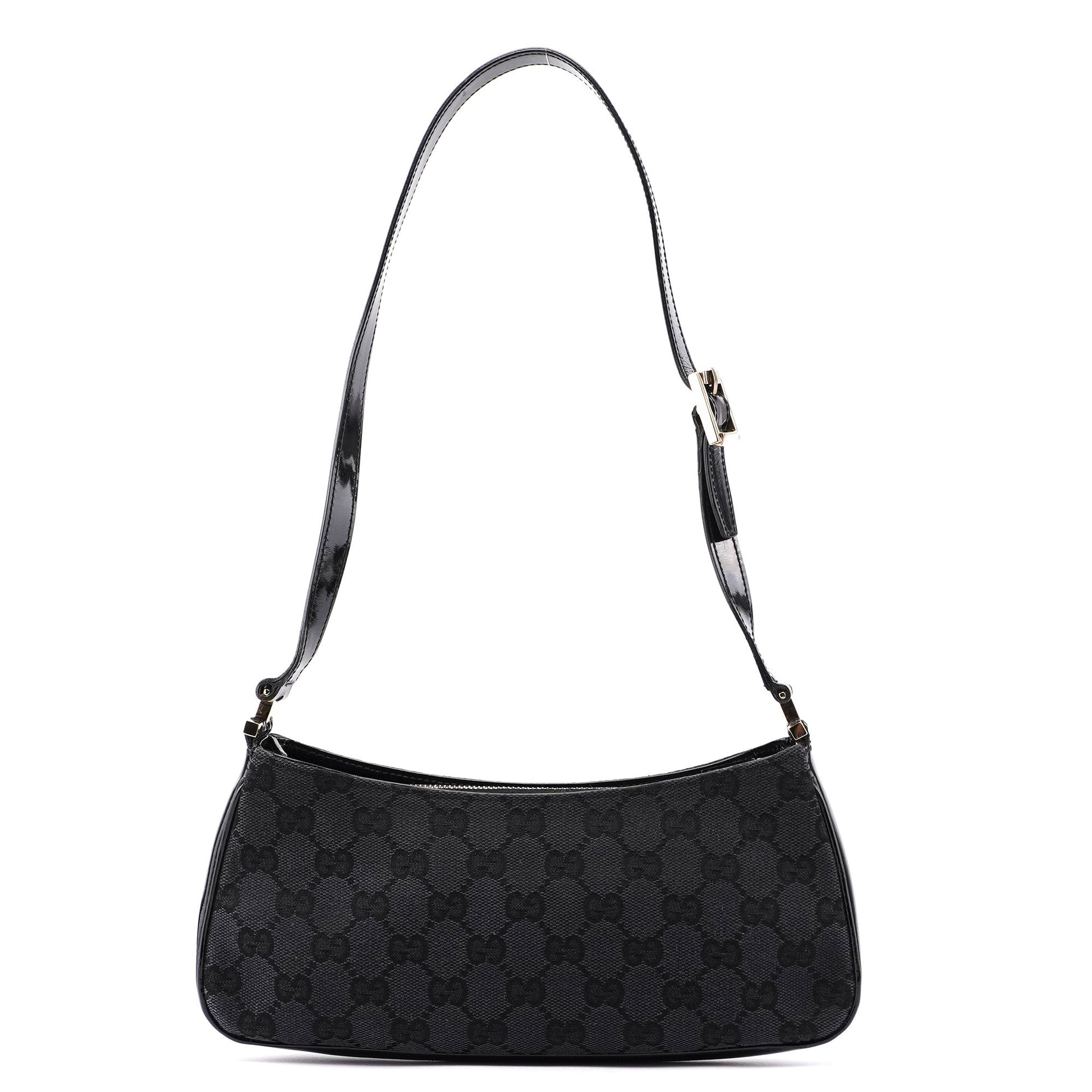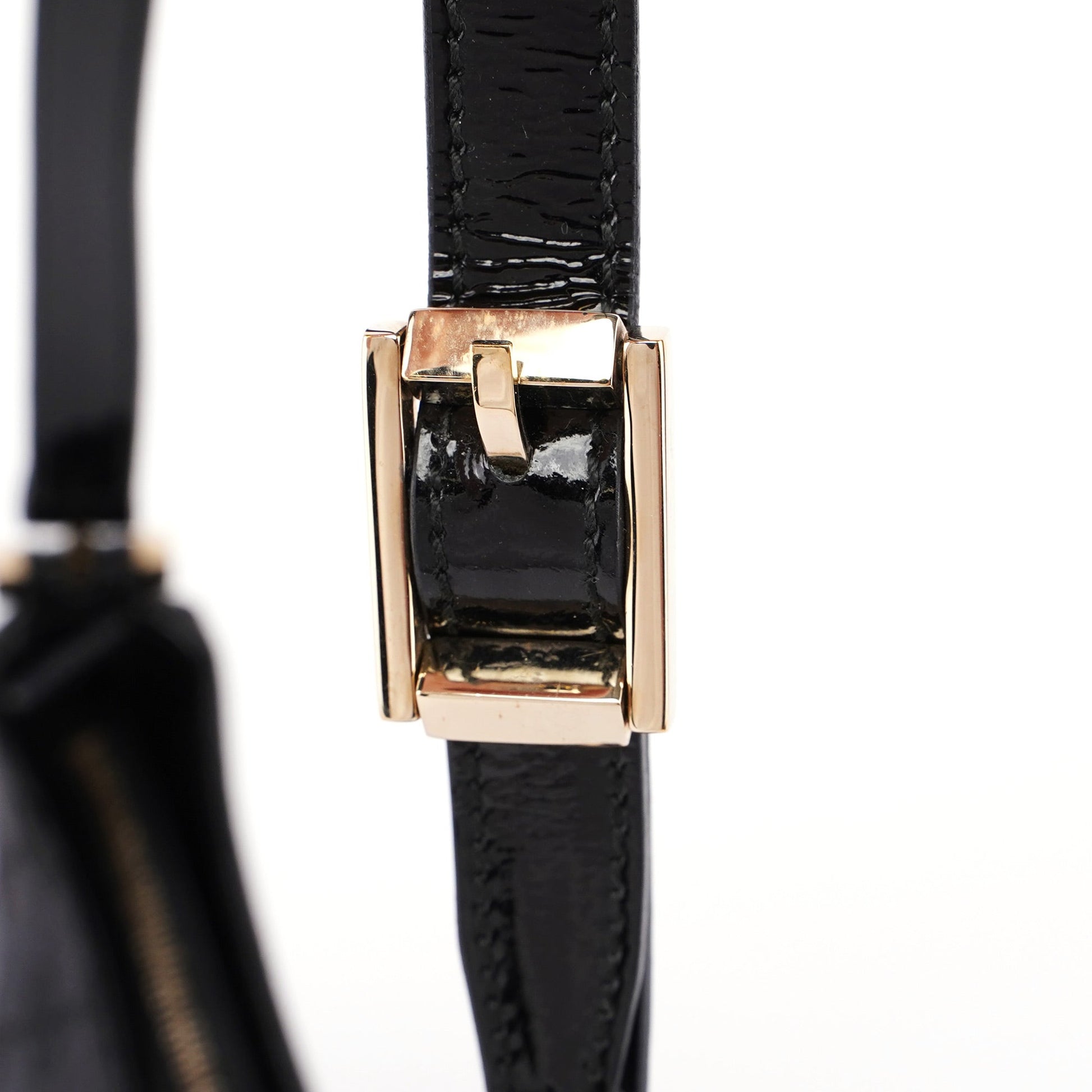 Designed by Tom Ford in the late 1990s, the Gucci GG mini hobo bag is handcrafted in black GG monogram canvas and black patent leather. Its gold-tone hardware hardware add a touch of elegance. Lined with satin, it features a small interior pocket for essentials.