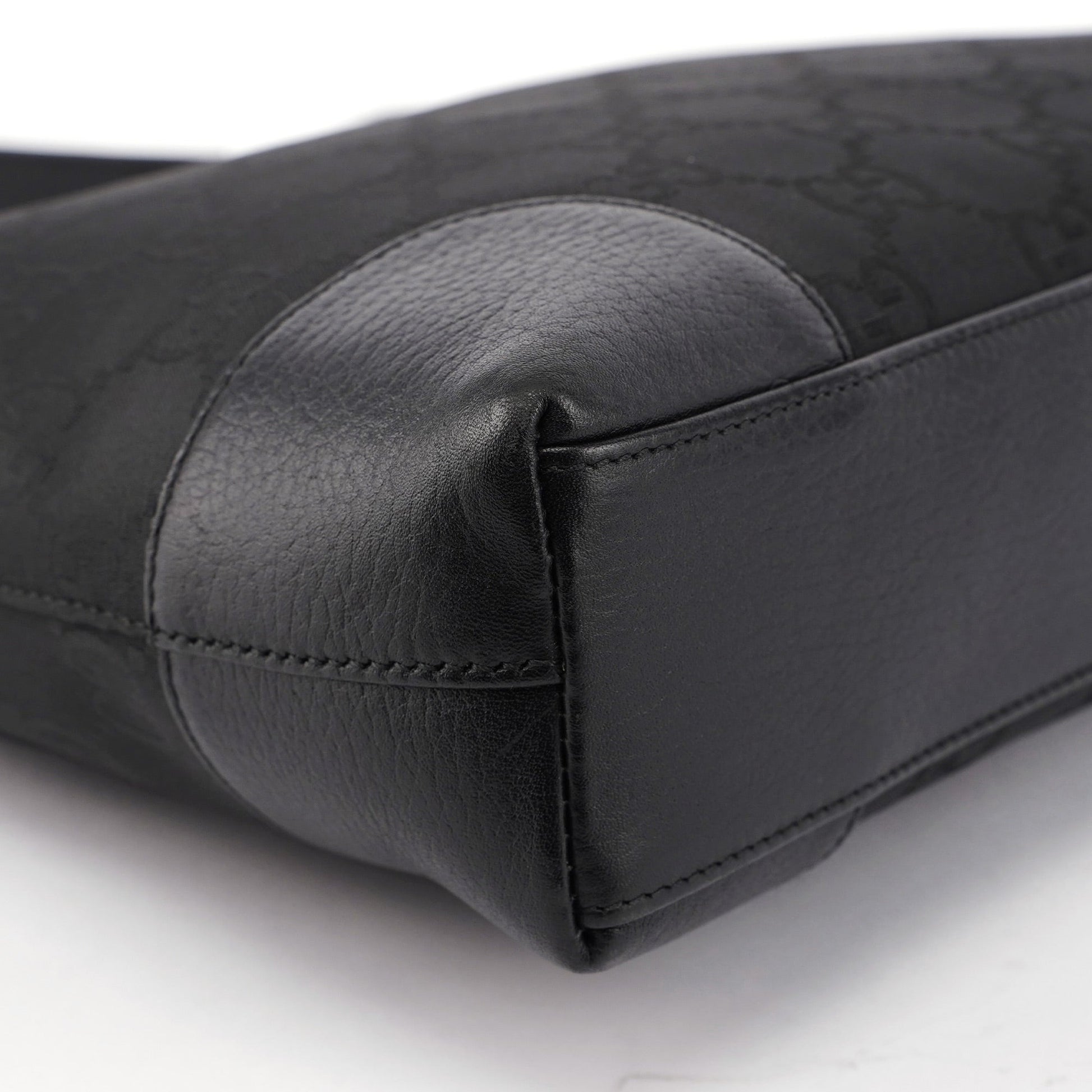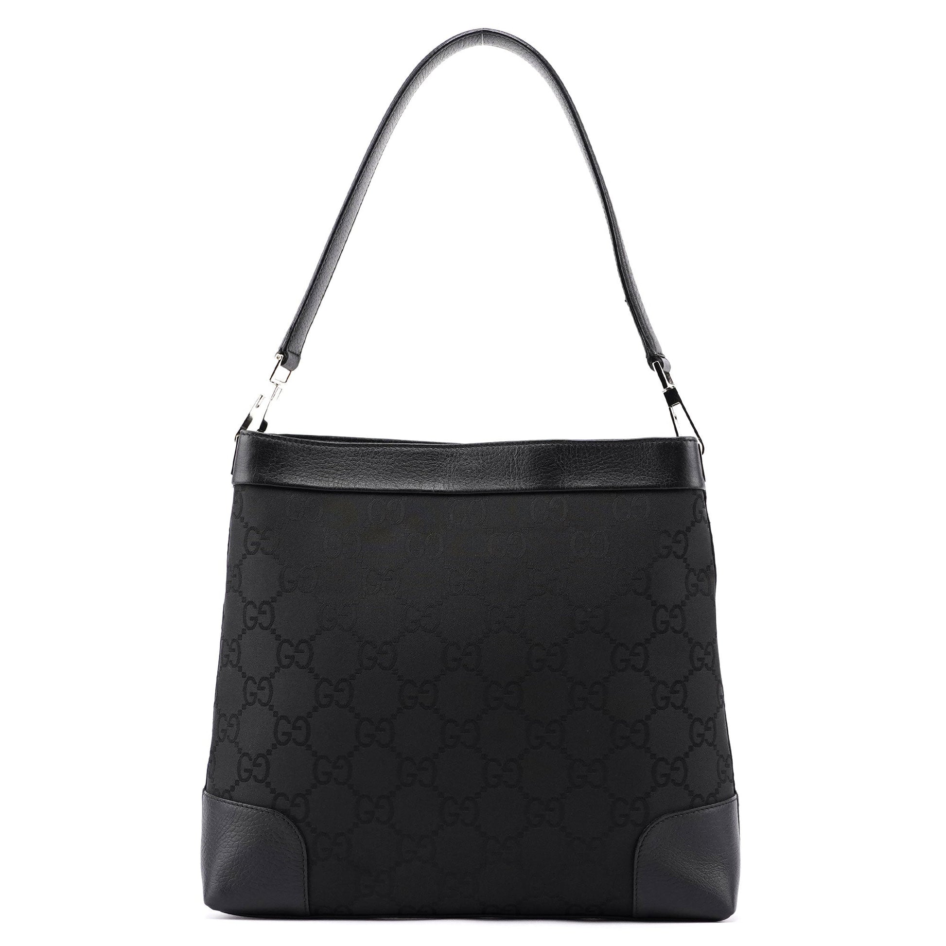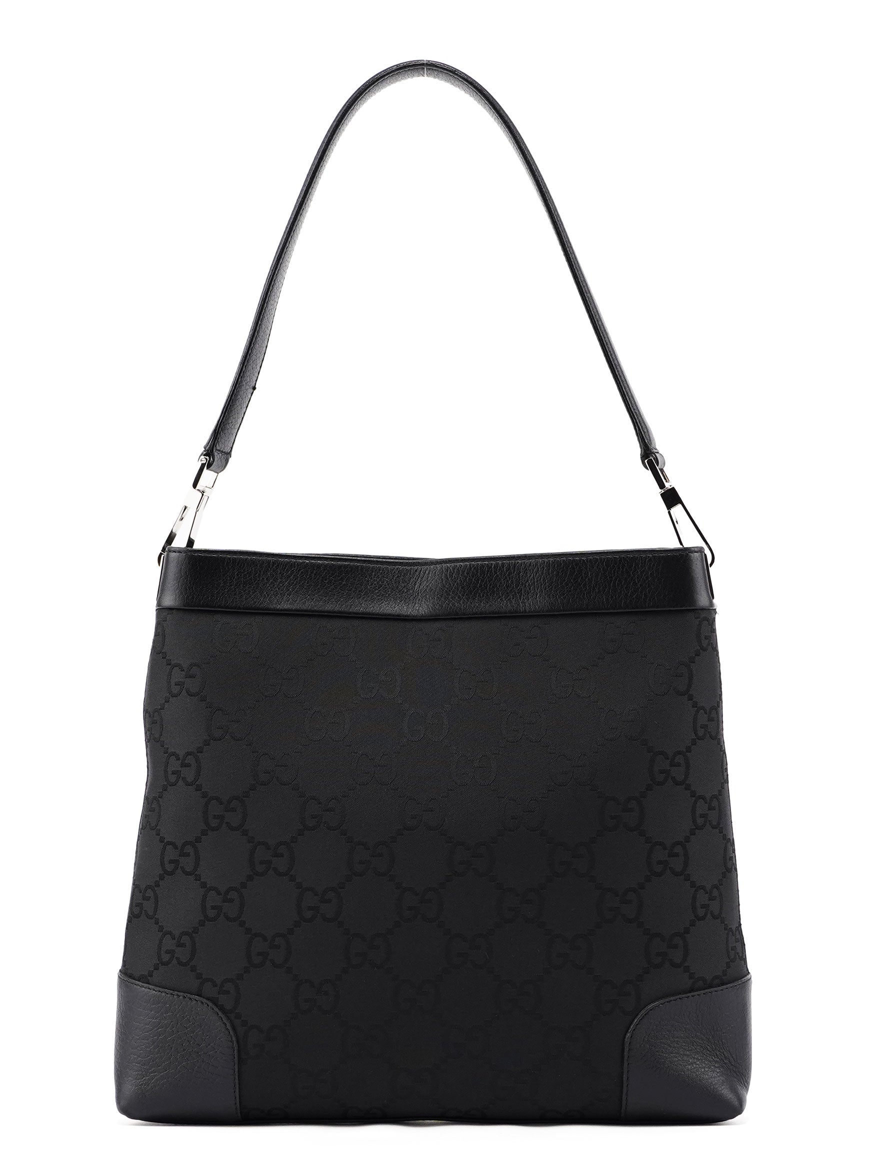 Handcrafted from black GG monogram nylon with tonal leather trim, this Gucci GG shoulder bag features silver-tone hardware engraved with the Gucci logo, a magnetic closure, and a satin-lined interior with an interior zipper pocket, showcasing timeless elegance.