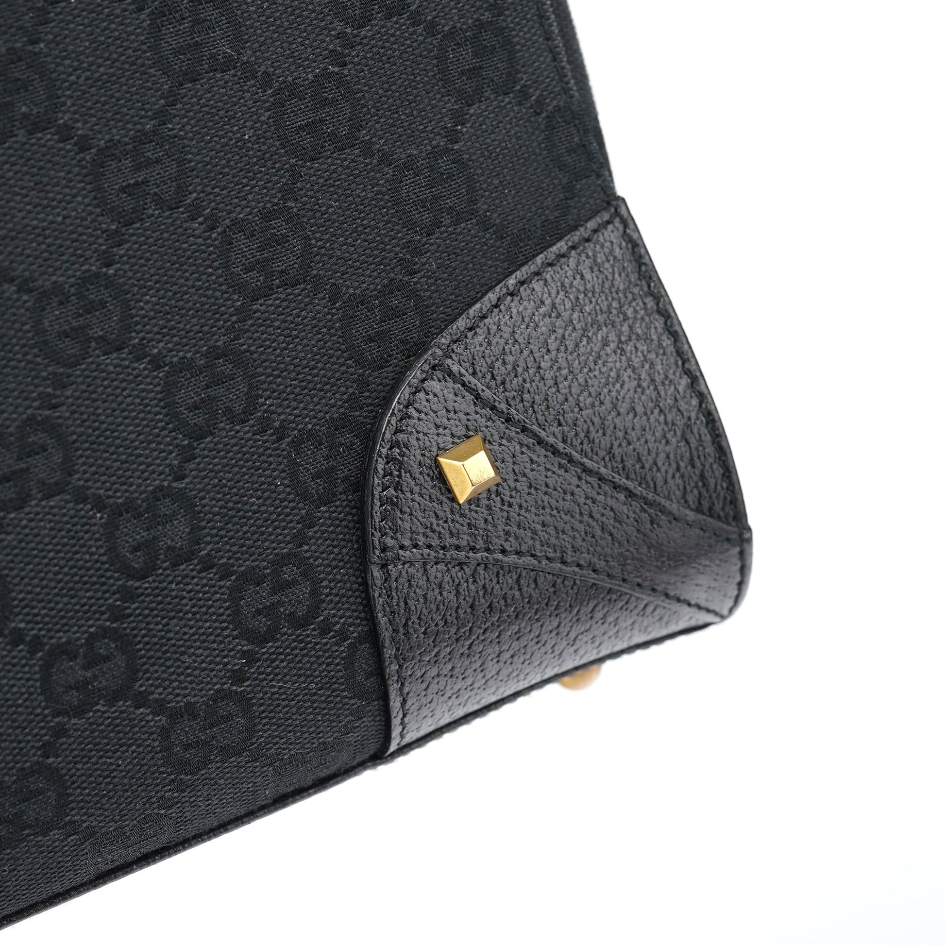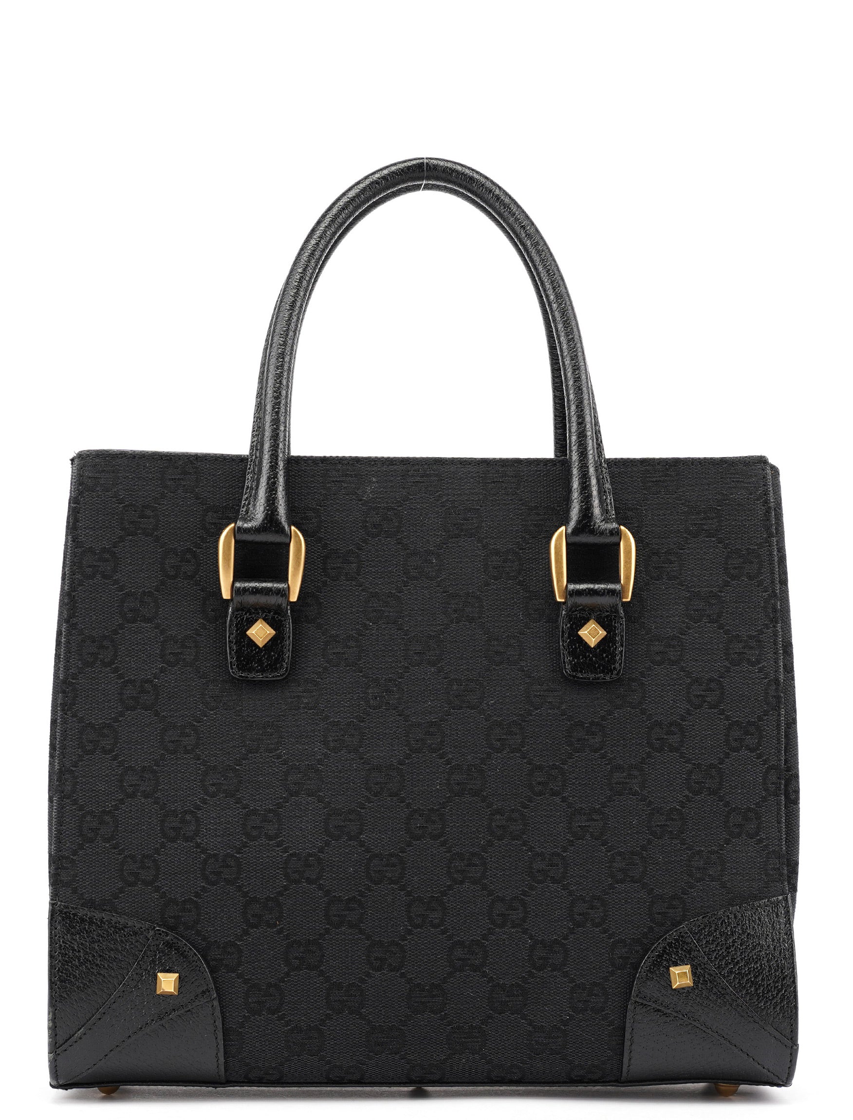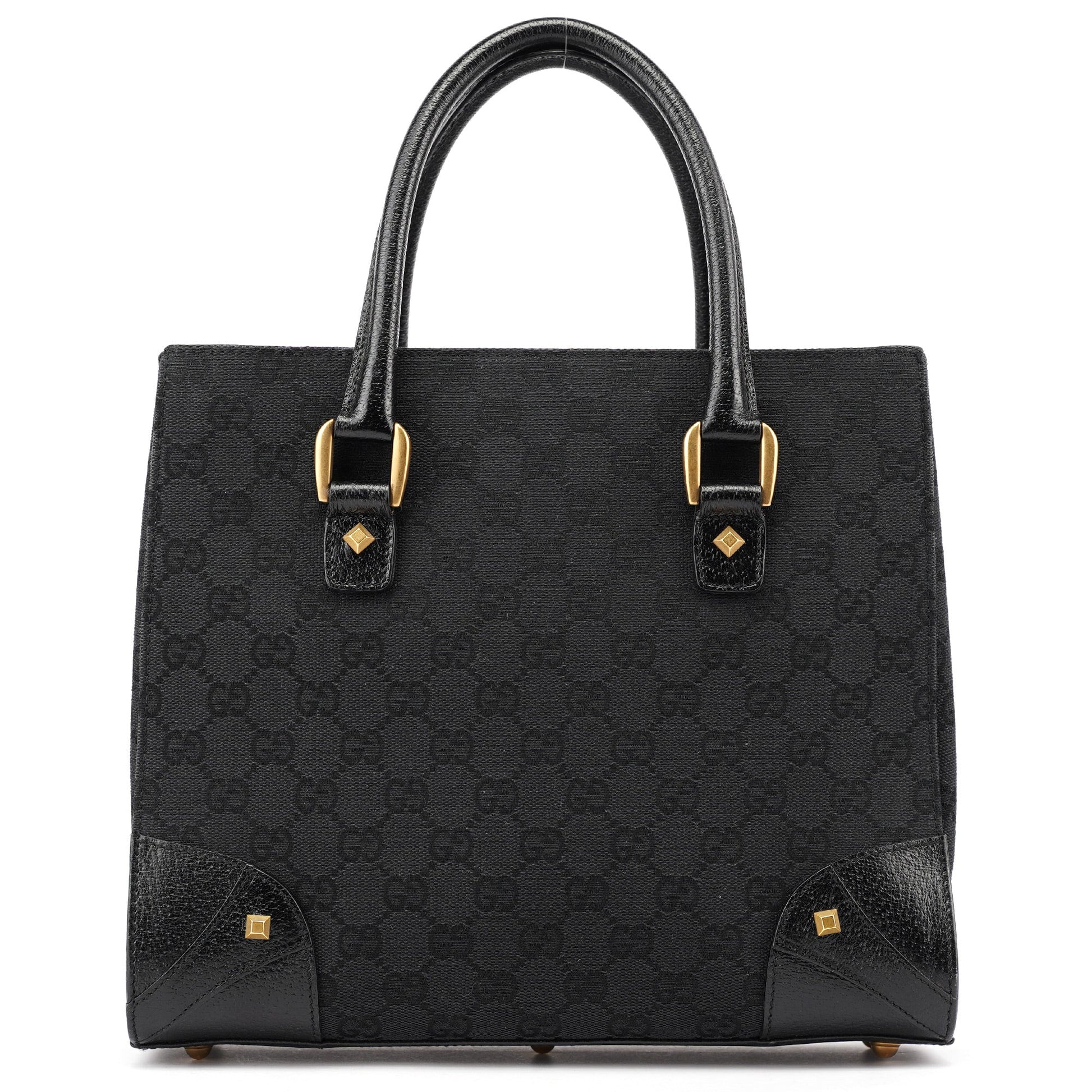 Designed by Tom Ford in the early 2000s, this Gucci tote is crafted from black GG monogram canvas with black leather trim and gold-tone pyramid stud accents. The structured silhouette features rolled leather handles and a suede-lined interior with a zip pocket, merging utilitarian structure with iconic branding.