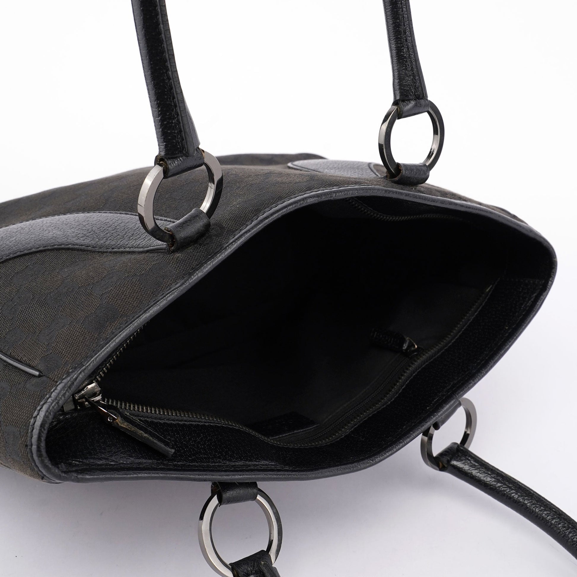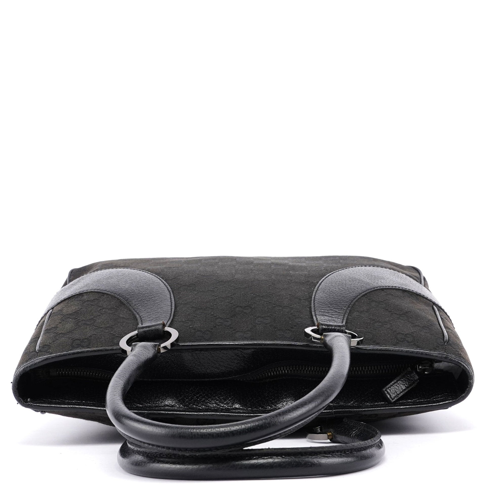 Designed by Tom Ford in the late 1990s, this Gucci GG tote bag features a black GG monogram canvas with tonal leather trim. The silver-tone hardware adds a touch of elegance. Inside, the cotton-lined interior includes a handy zipper pocket.