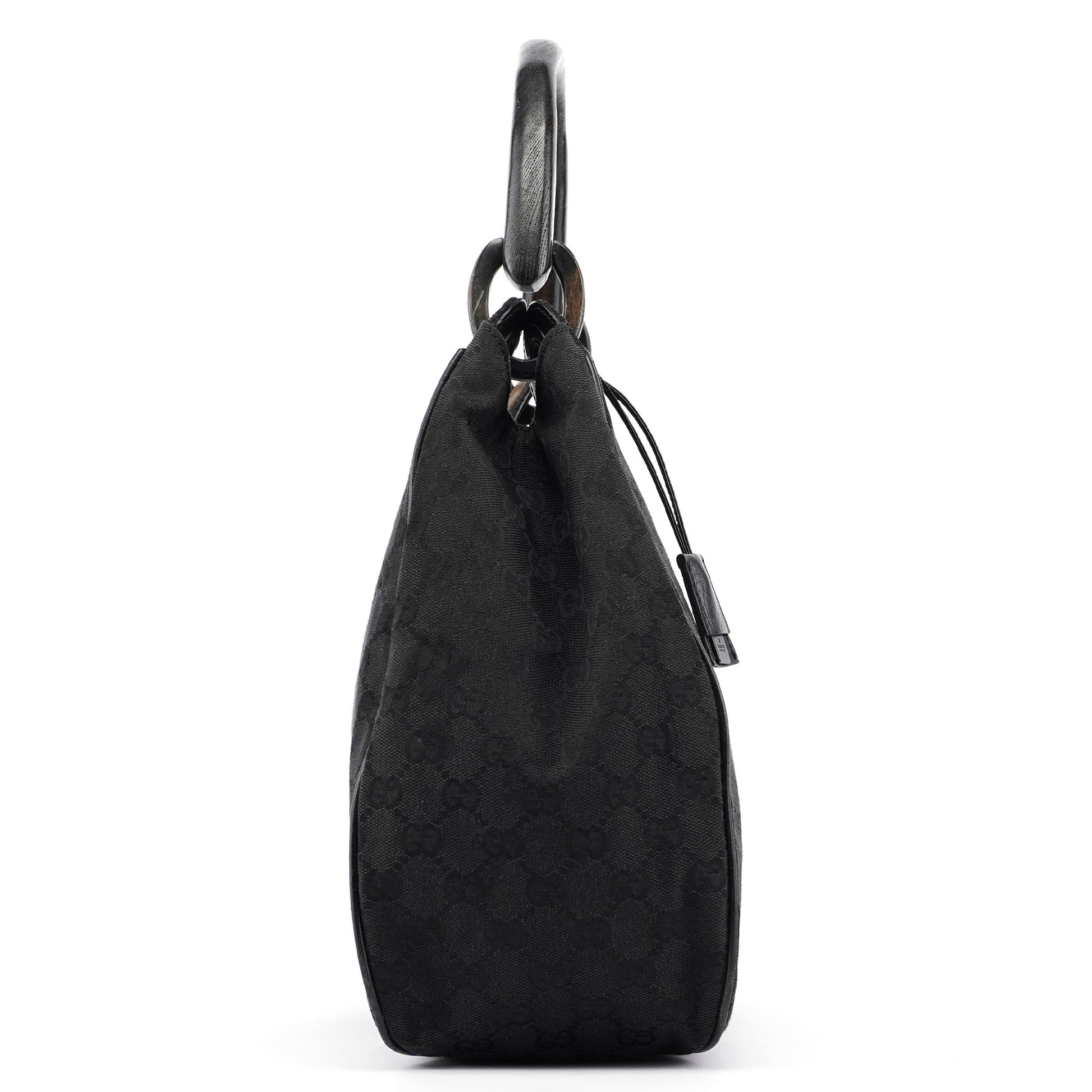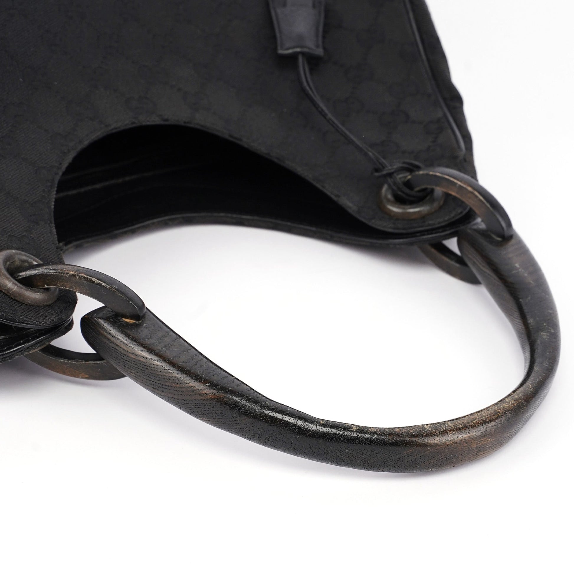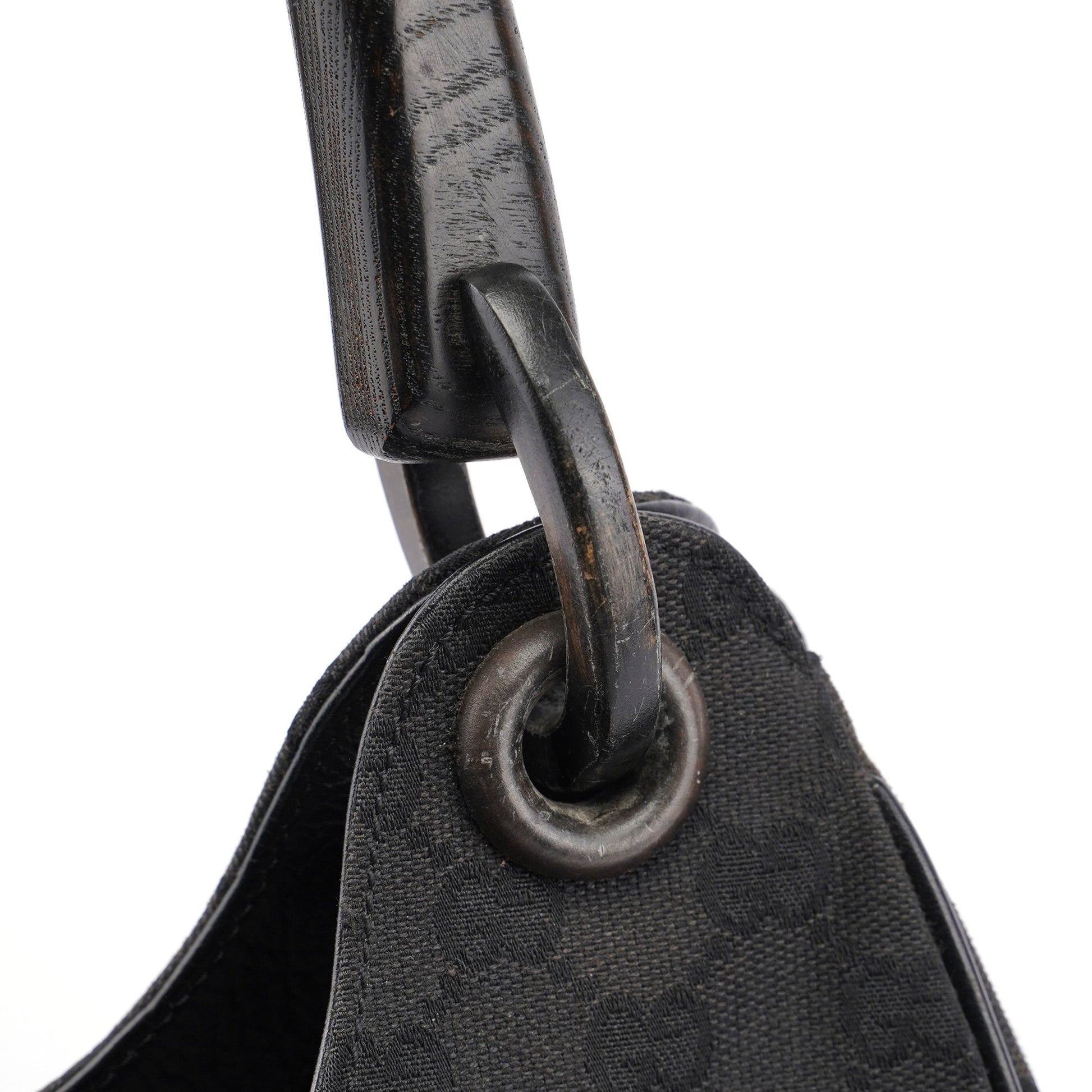 Designed by Tom Ford for the 2003 collection, this Gucci top handle bag is handcrafted in black GG monogram canvas. It boasts a wooden handle and a chic logo plate attached to the handle. The suede-lined interior includes a handy zipper pocket for organization.