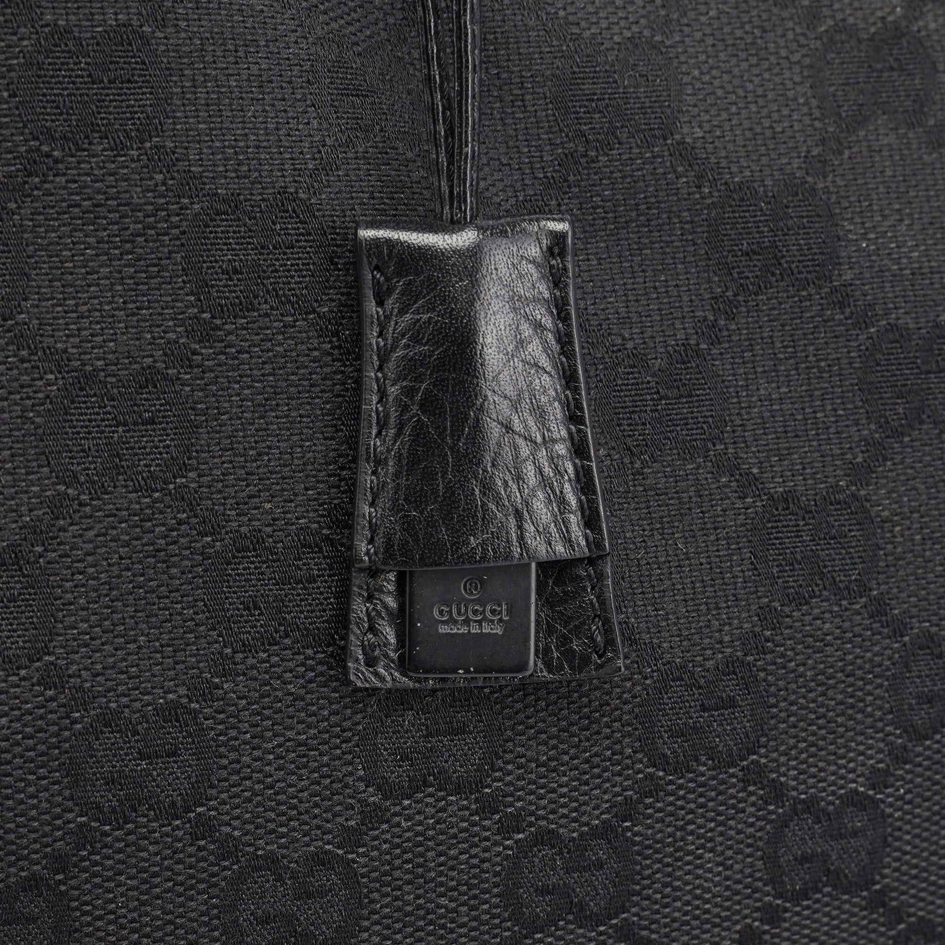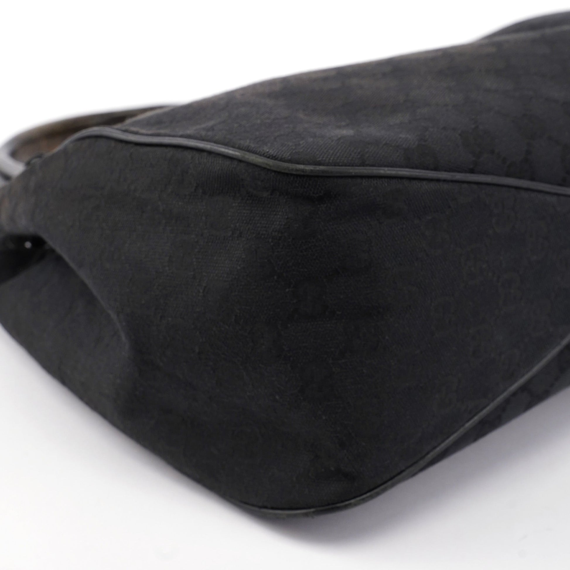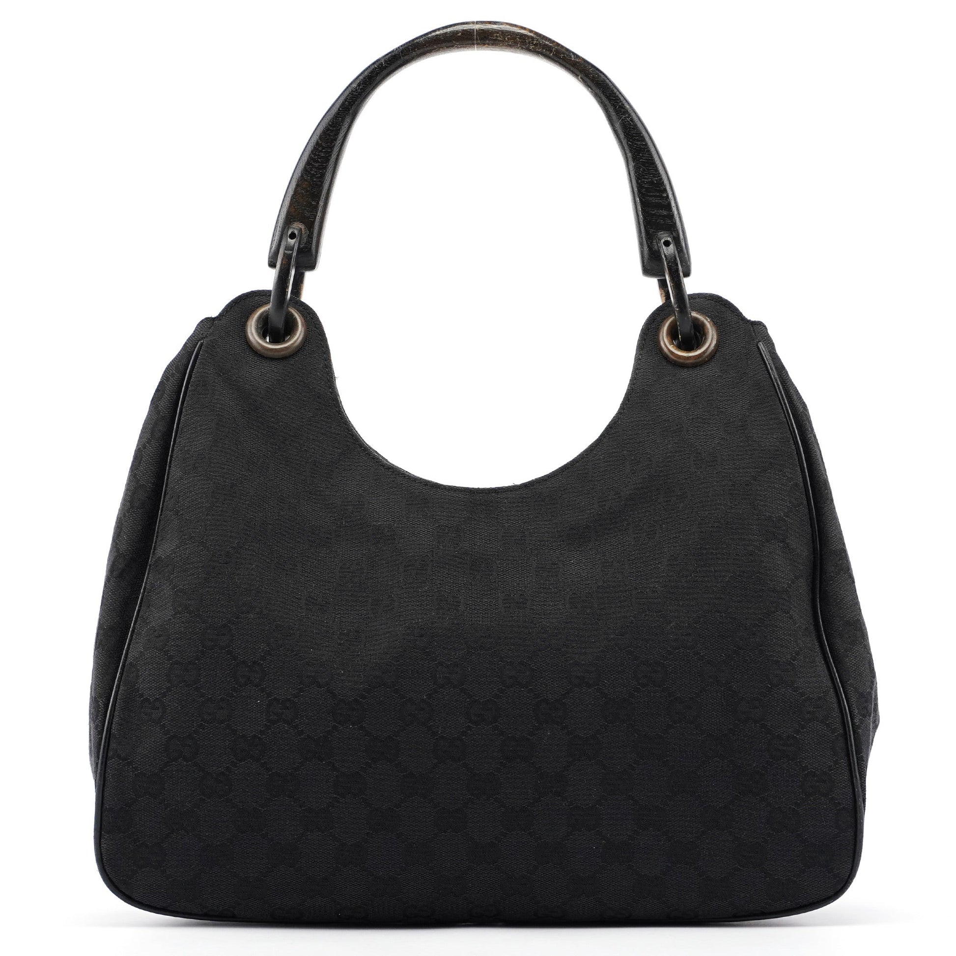 Designed by Tom Ford for the 2003 collection, this Gucci top handle bag is handcrafted in black GG monogram canvas. It boasts a wooden handle and a chic logo plate attached to the handle. The suede-lined interior includes a handy zipper pocket for organization.