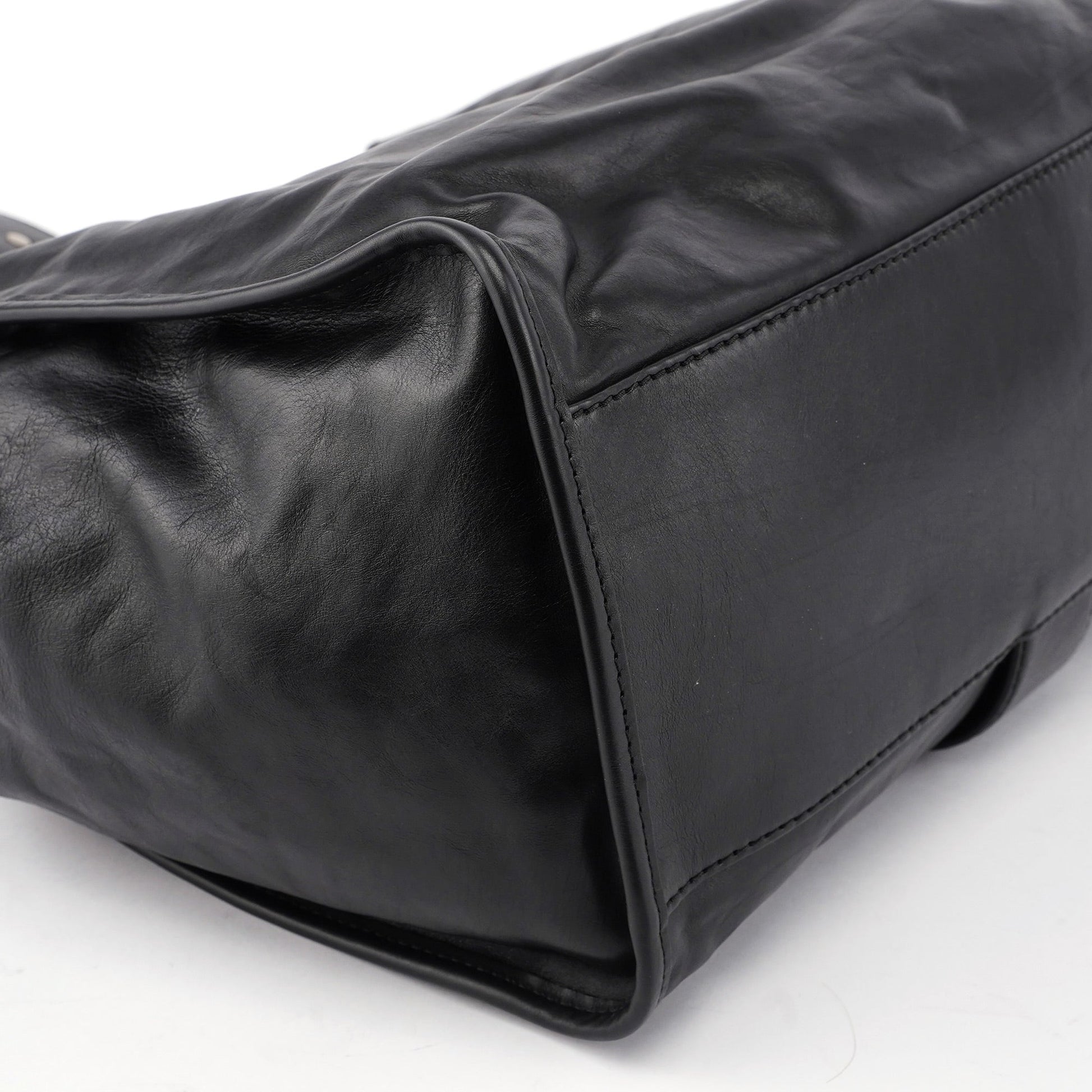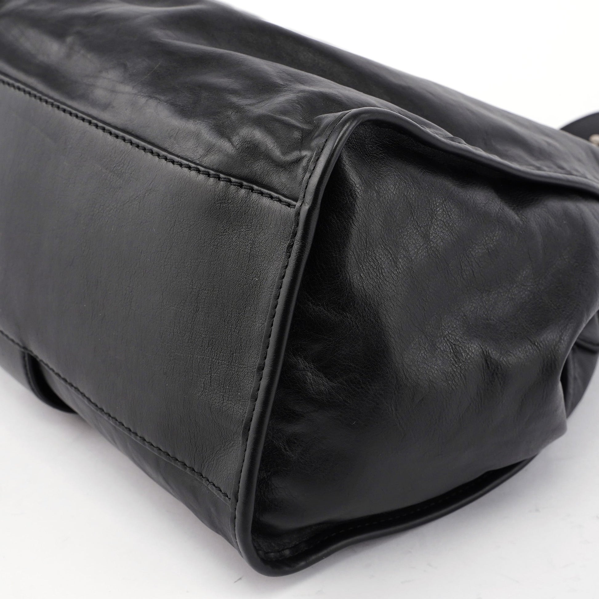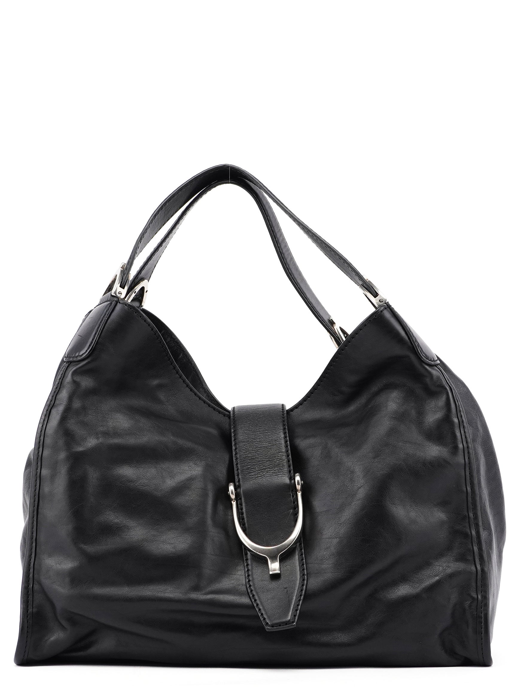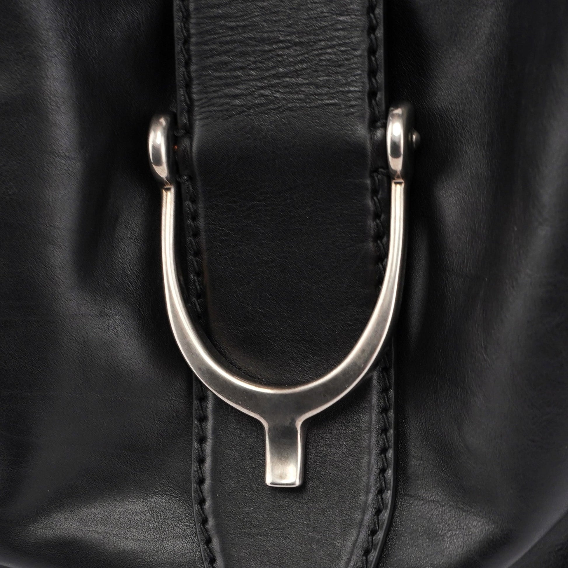 Classic Gucci Horsebit bag handcrafted from luxurious black lambskin leather featuring silver-tone hardware. The interior is lined in GG monogram cotton and includes an interior zipper pocket, showcasing timeless elegance.