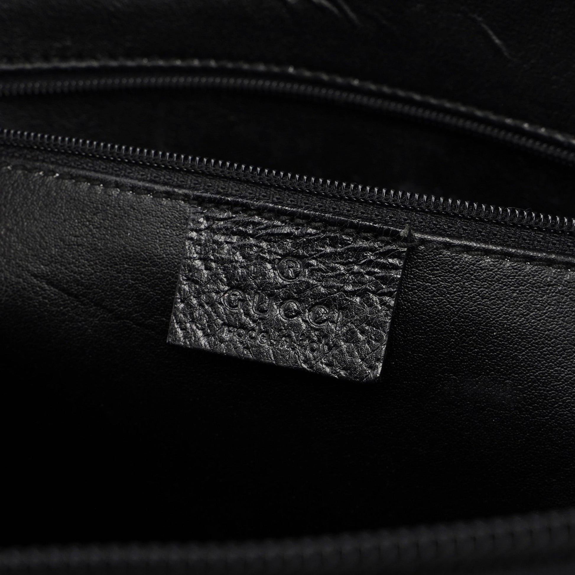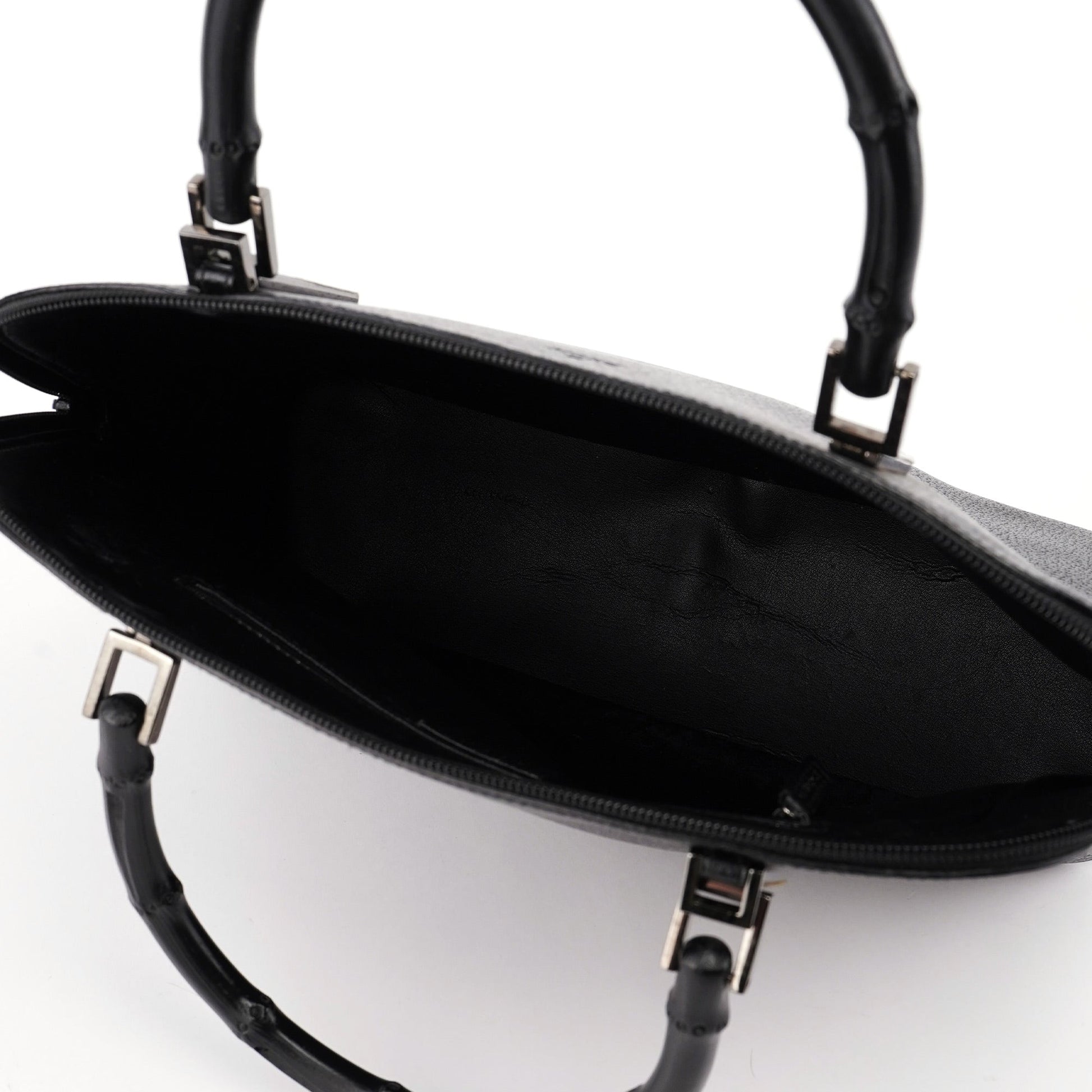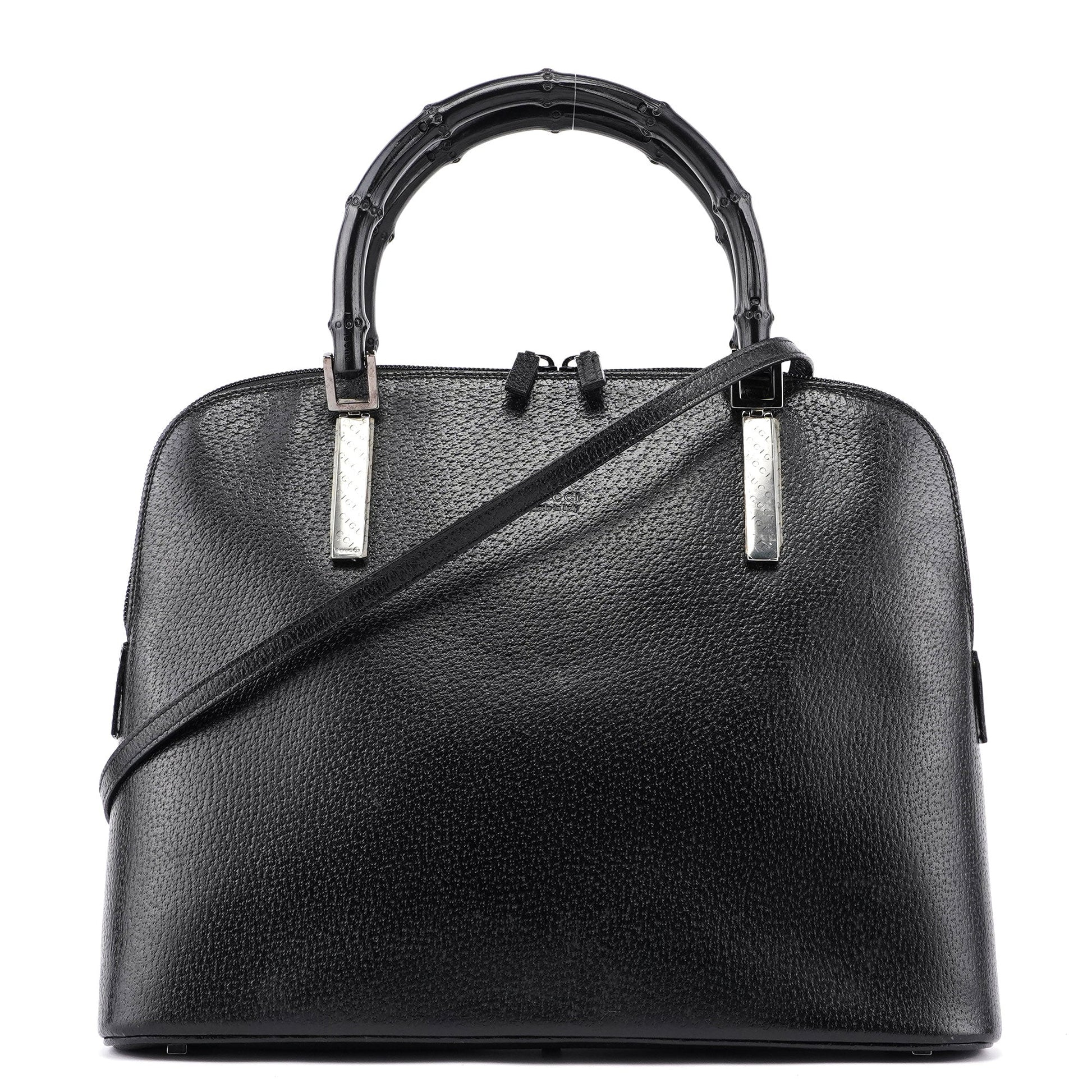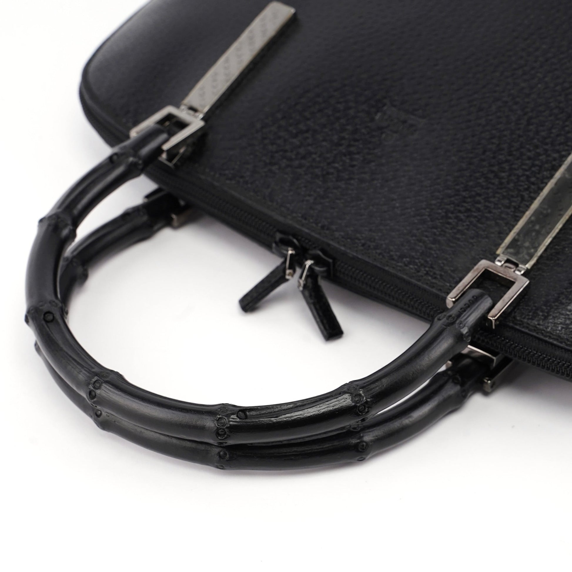 Designed by Tom Ford in the late 1990s, this Gucci Bamboo 2-Way bag is handcrafted from black leather with dual black bamboo handles engraved with the Gucci logo. It features silver-tone hardware, a zipper closure, and a leather-lined interior with a zipper pocket. A removable shoulder strap adds versatility, while the embossed Gucci logo at the front highlights its refined elegance.