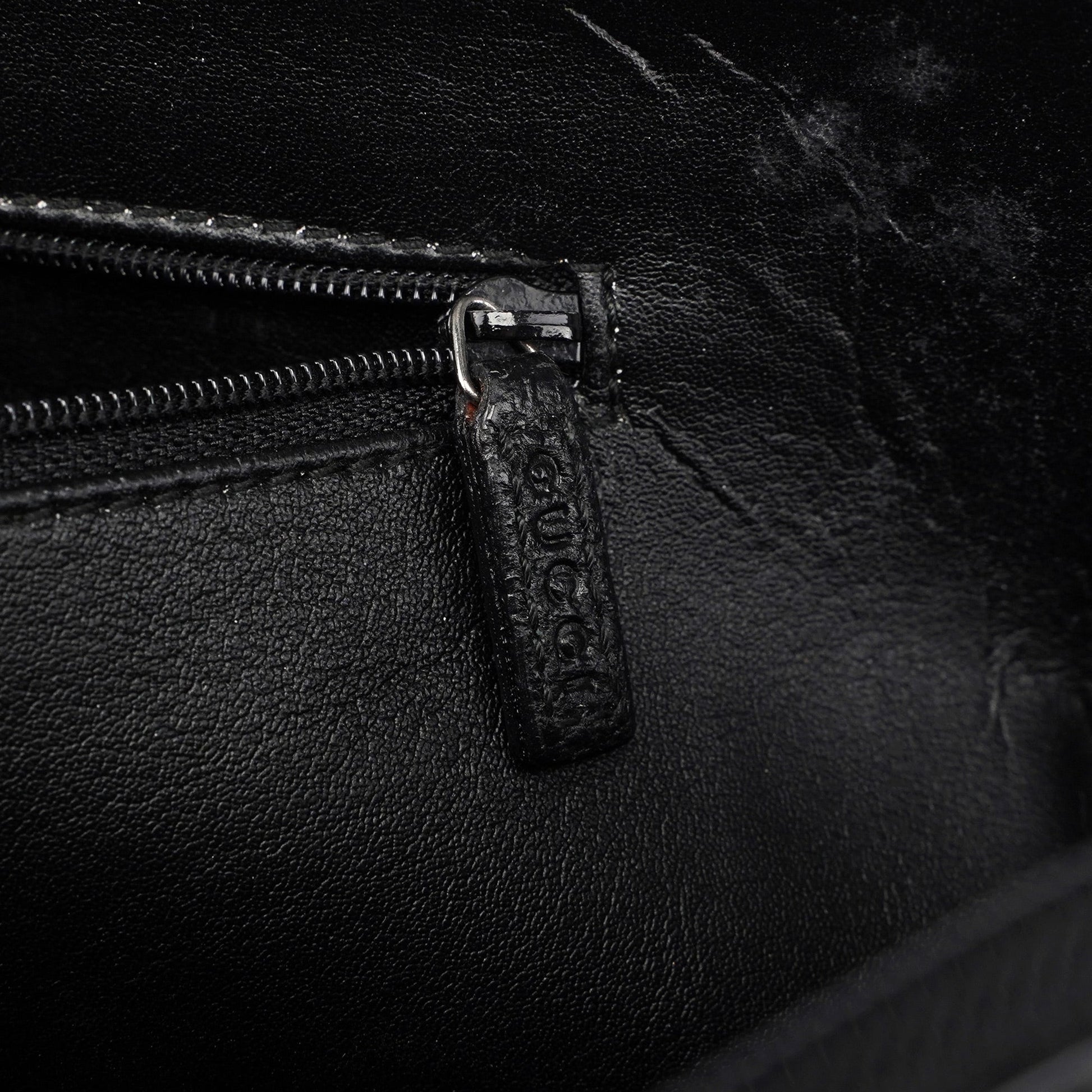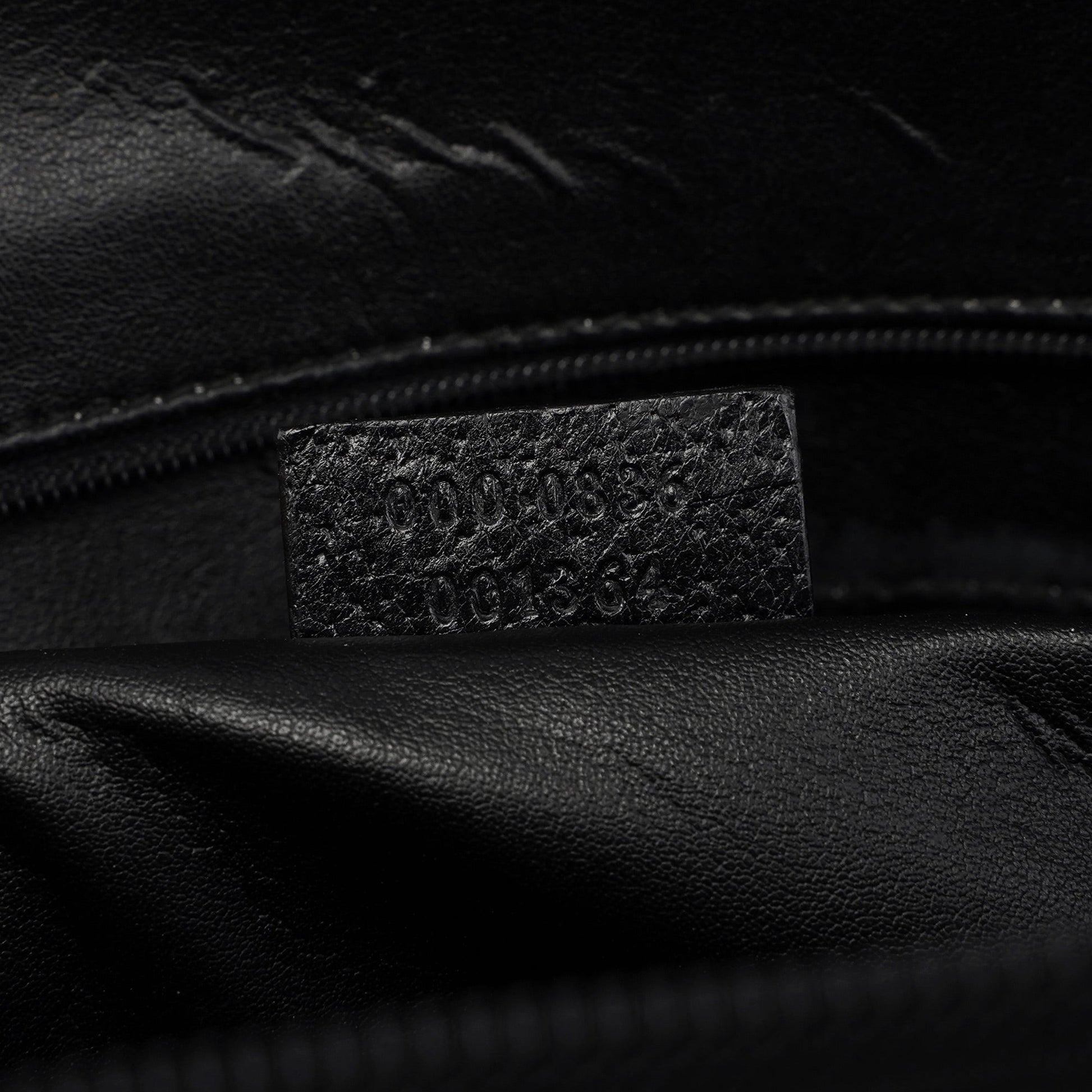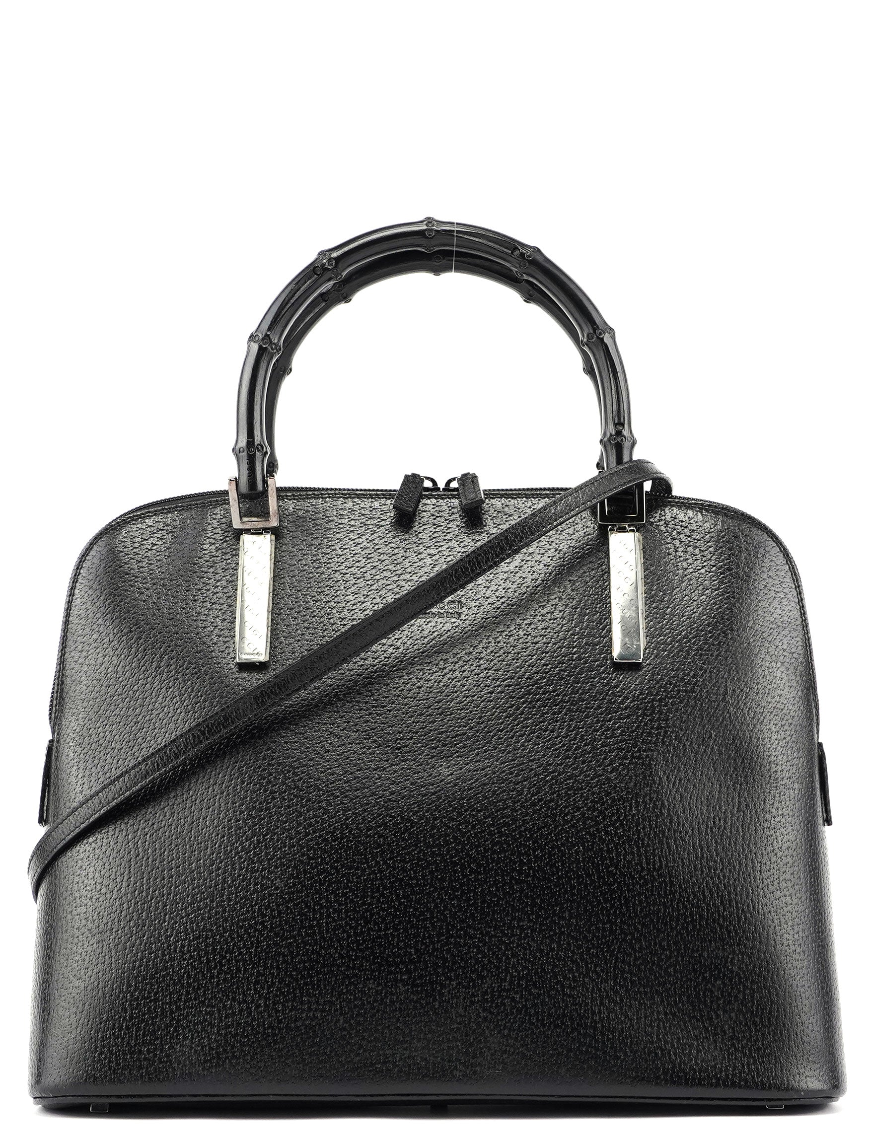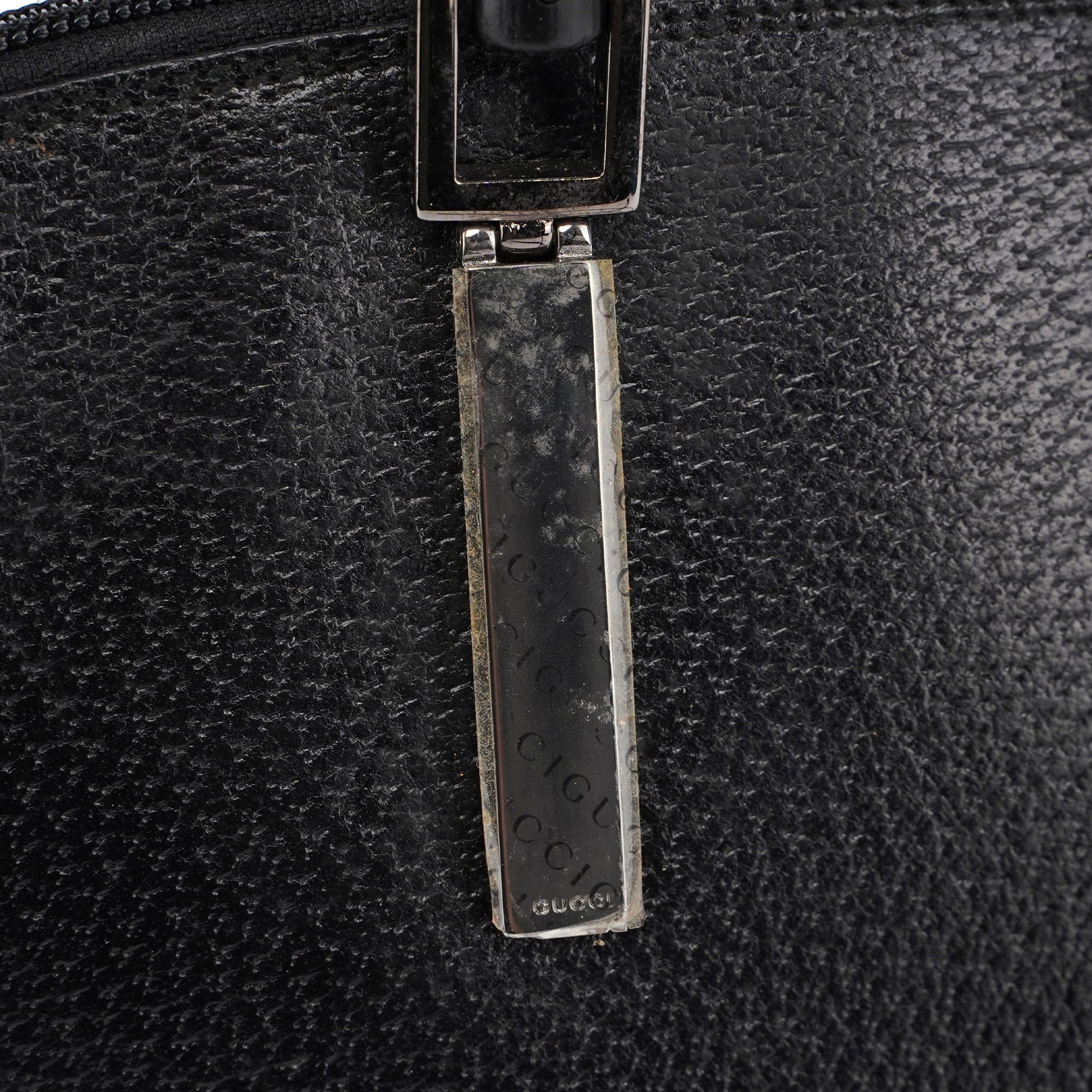 Designed by Tom Ford in the late 1990s, this Gucci Bamboo 2-Way bag is handcrafted from black leather with dual black bamboo handles engraved with the Gucci logo. It features silver-tone hardware, a zipper closure, and a leather-lined interior with a zipper pocket. A removable shoulder strap adds versatility, while the embossed Gucci logo at the front highlights its refined elegance.