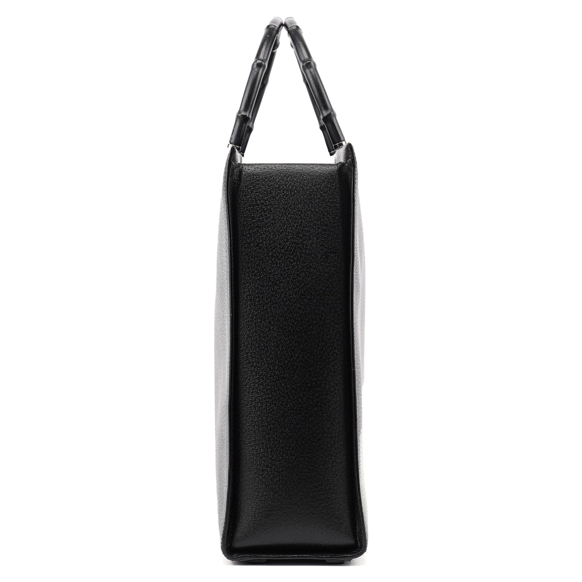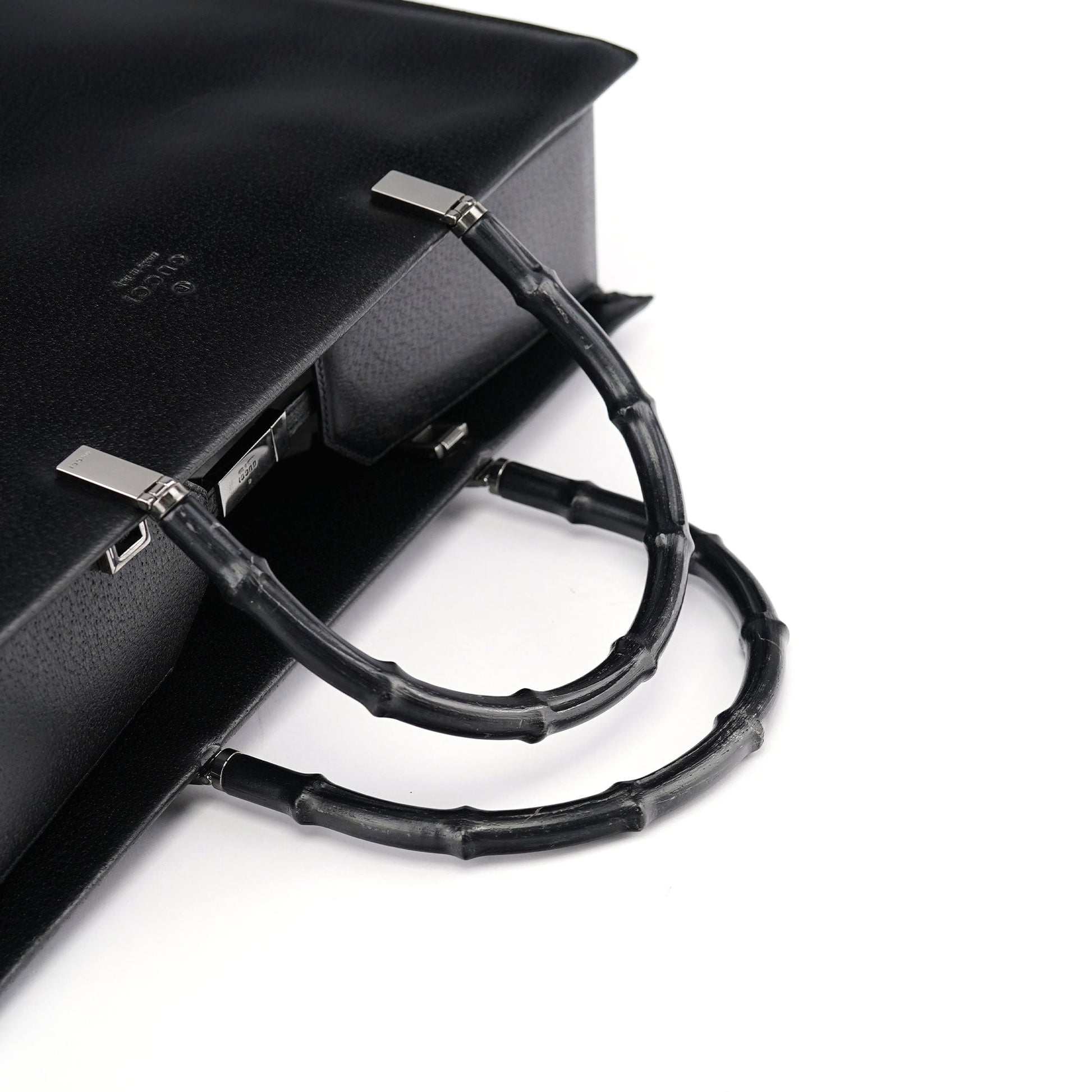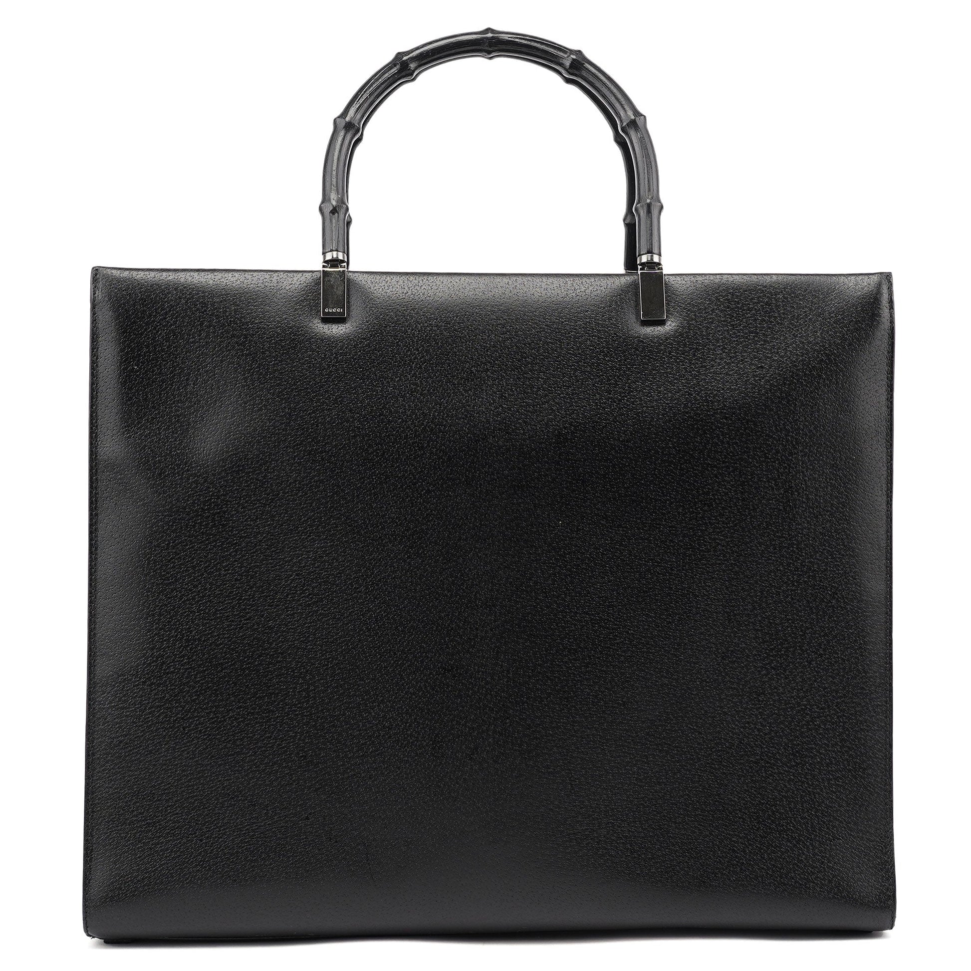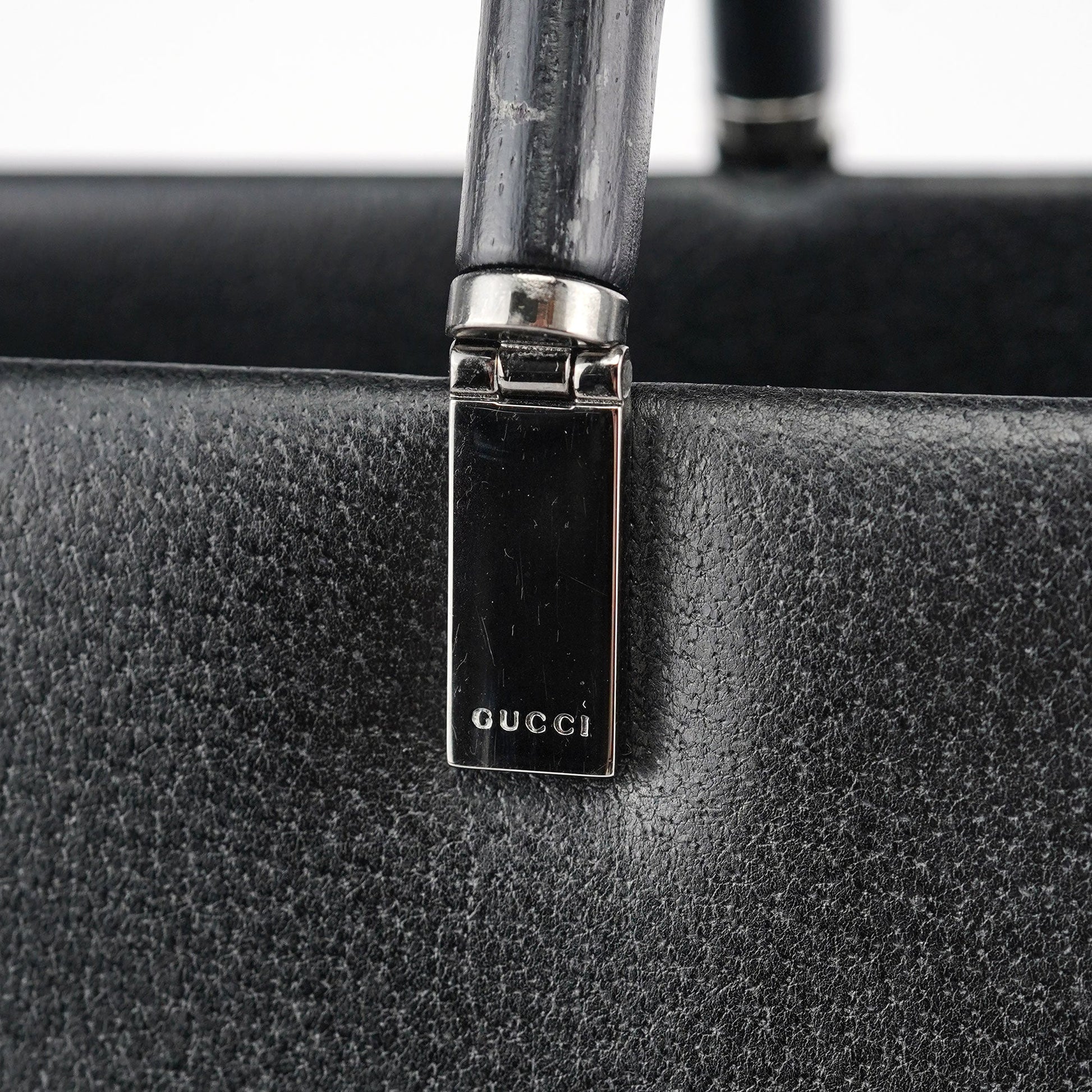 Designed by Tom Ford in the late 1990s, this vintage Gucci Bamboo tote is crafted from textured black leather with signature bamboo handles and silver-tone hardware. It features a clip closure, optional crossbody strap, and a calfskin-lined interior with two pockets. An embossed Gucci logo adds a refined finishing touch.