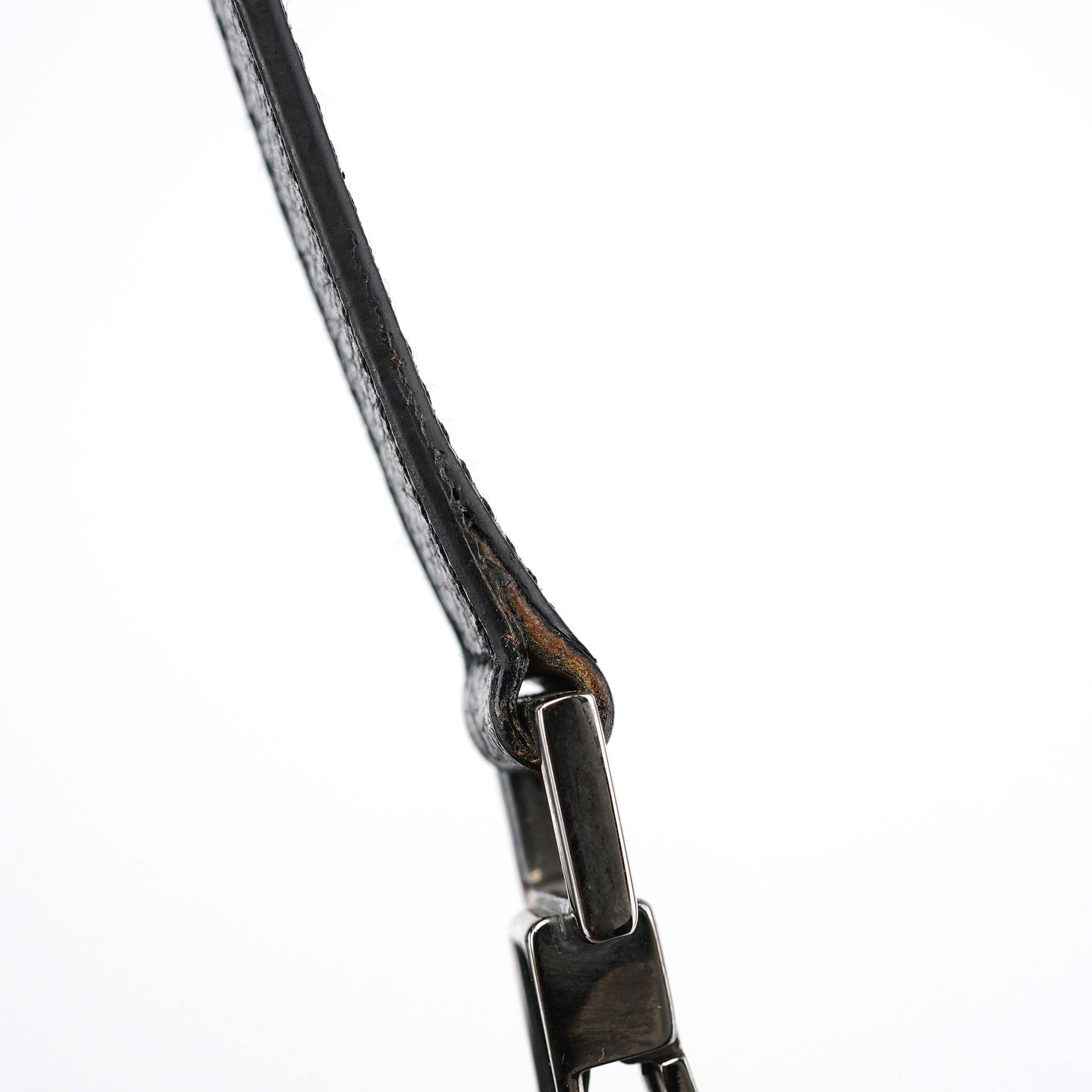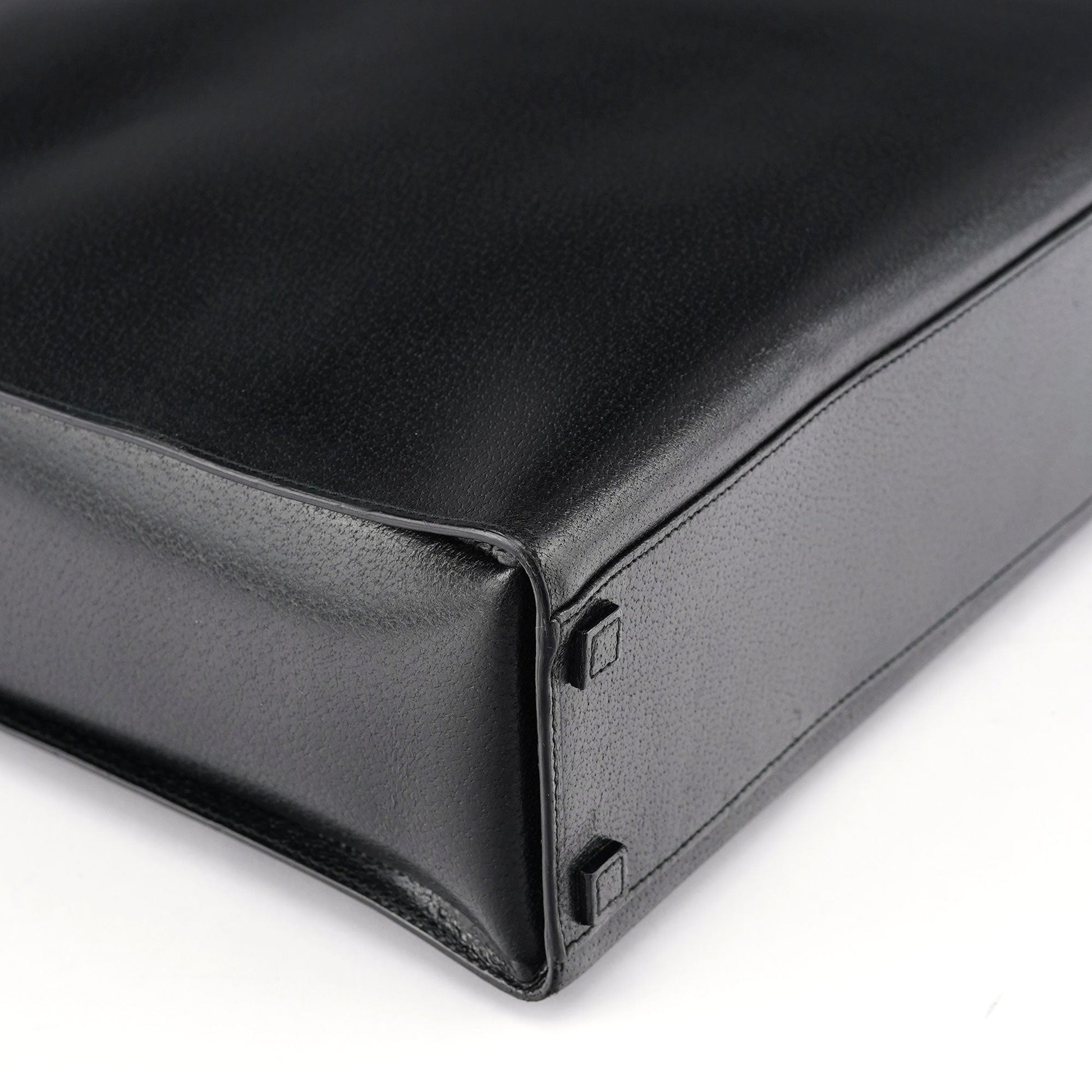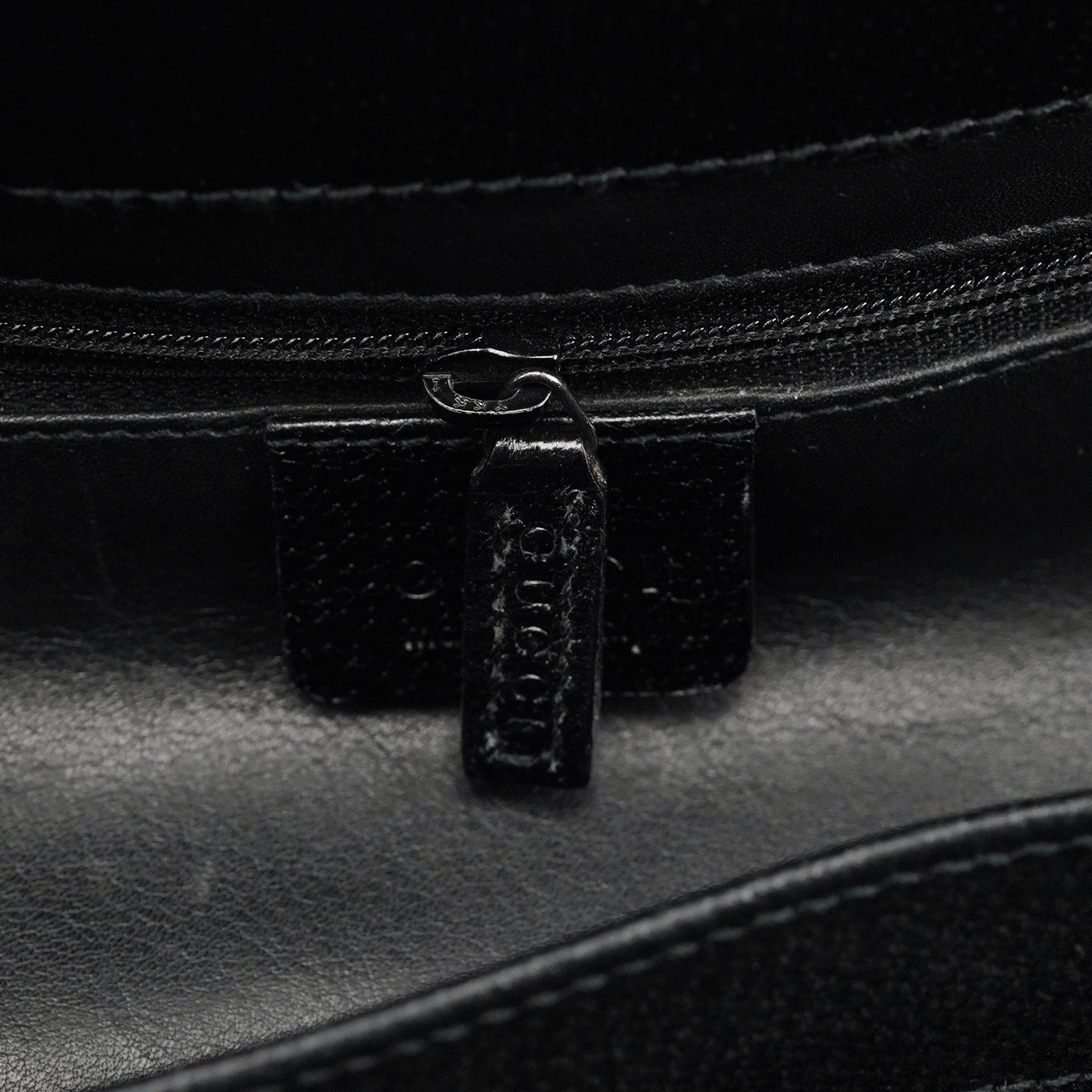 Designed by Tom Ford in the late 1990s, this vintage Gucci Bamboo tote is crafted from textured black leather with signature bamboo handles and silver-tone hardware. It features a clip closure, optional crossbody strap, and a calfskin-lined interior with two pockets. An embossed Gucci logo adds a refined finishing touch.