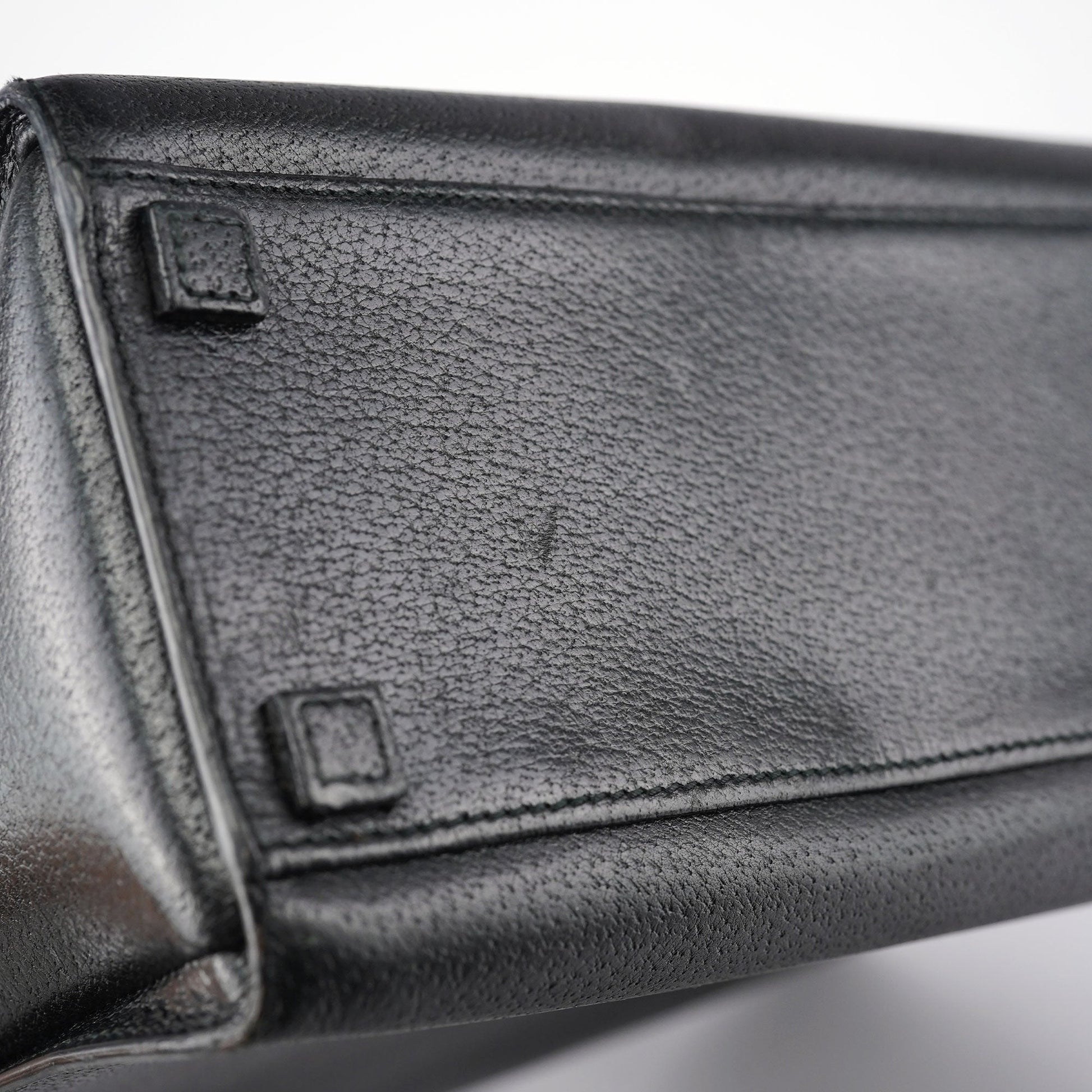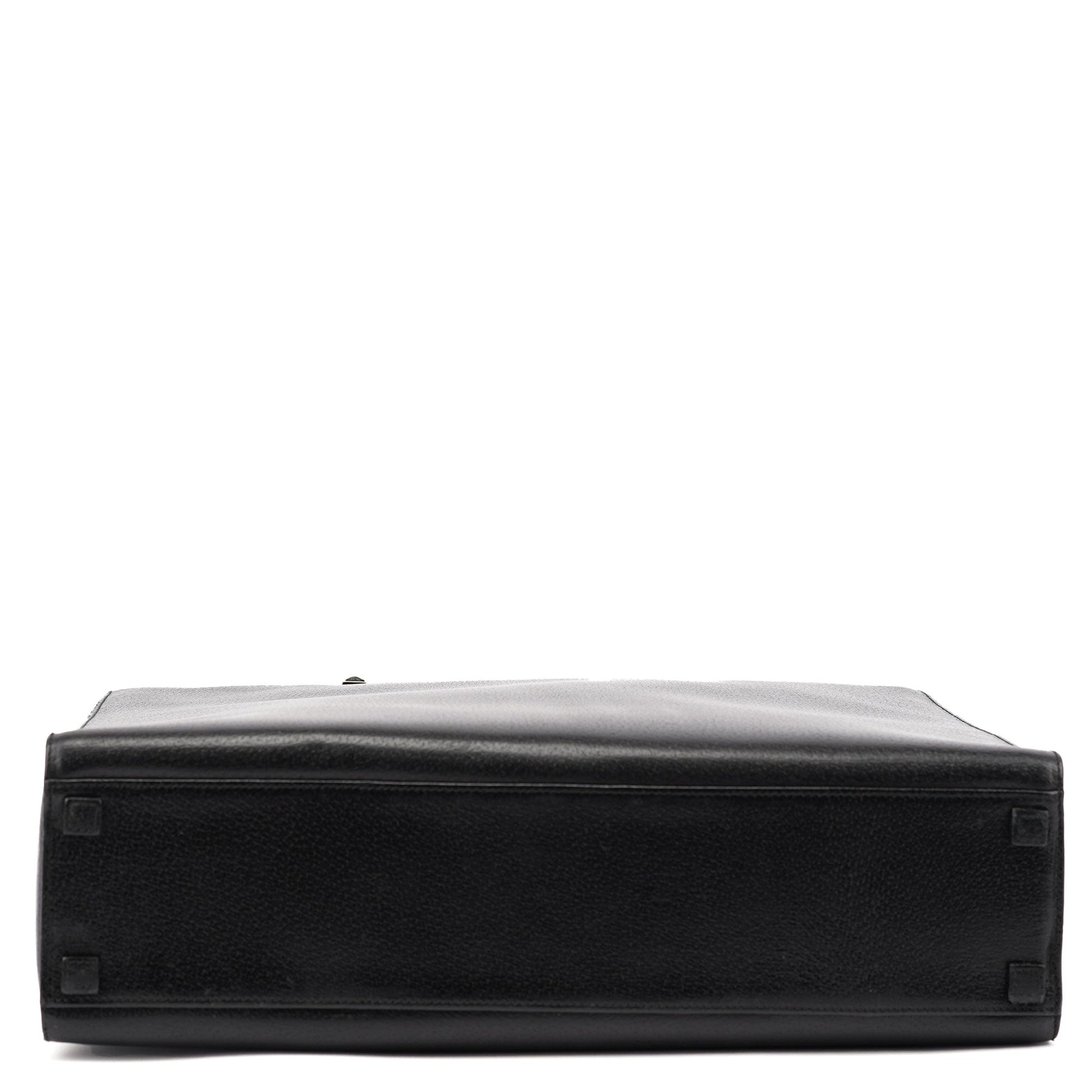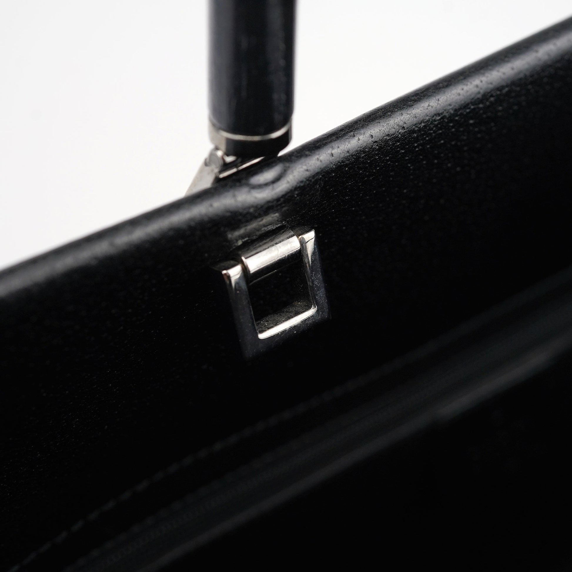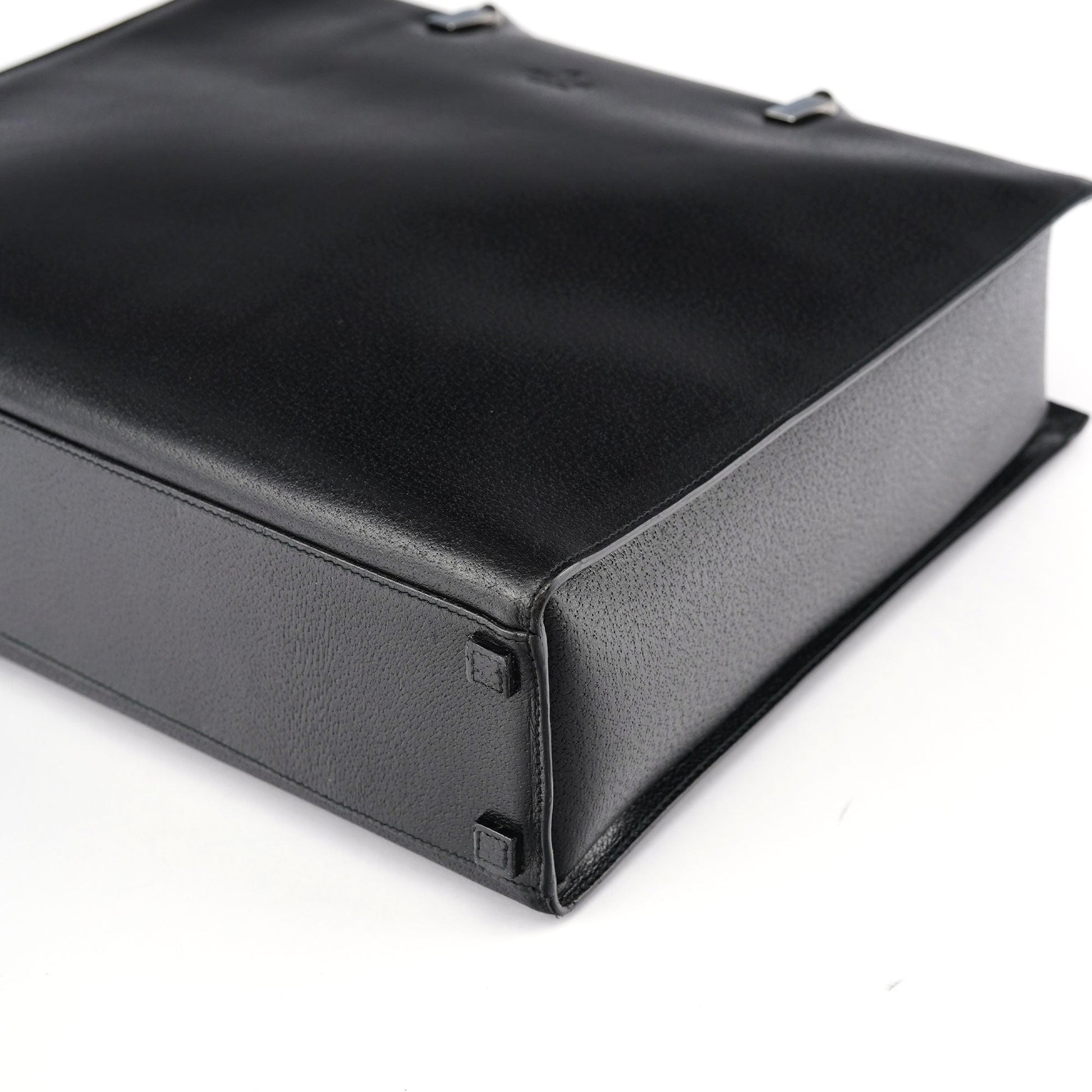 Designed by Tom Ford in the late 1990s, this vintage Gucci Bamboo tote is crafted from textured black leather with signature bamboo handles and silver-tone hardware. It features a clip closure, optional crossbody strap, and a calfskin-lined interior with two pockets. An embossed Gucci logo adds a refined finishing touch.