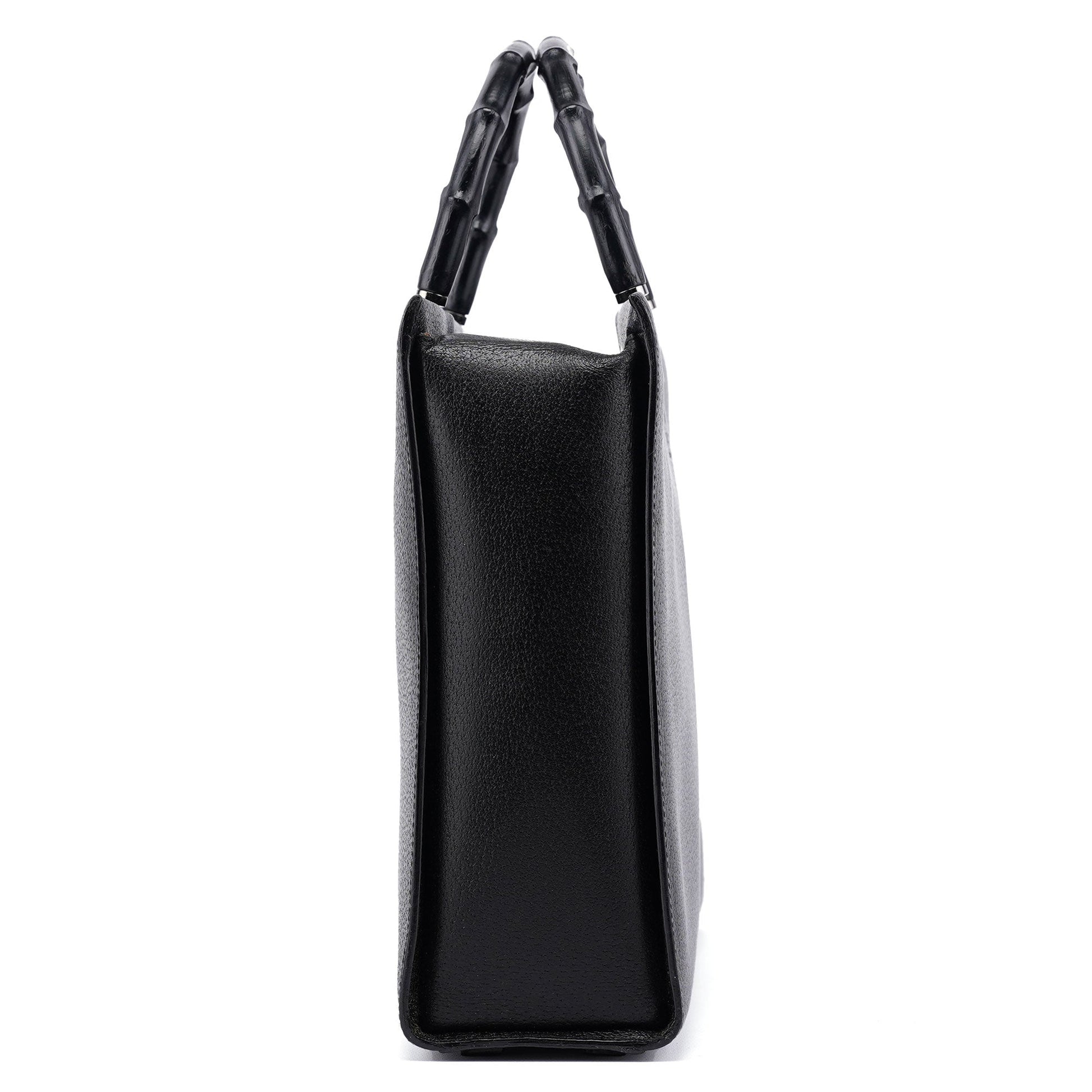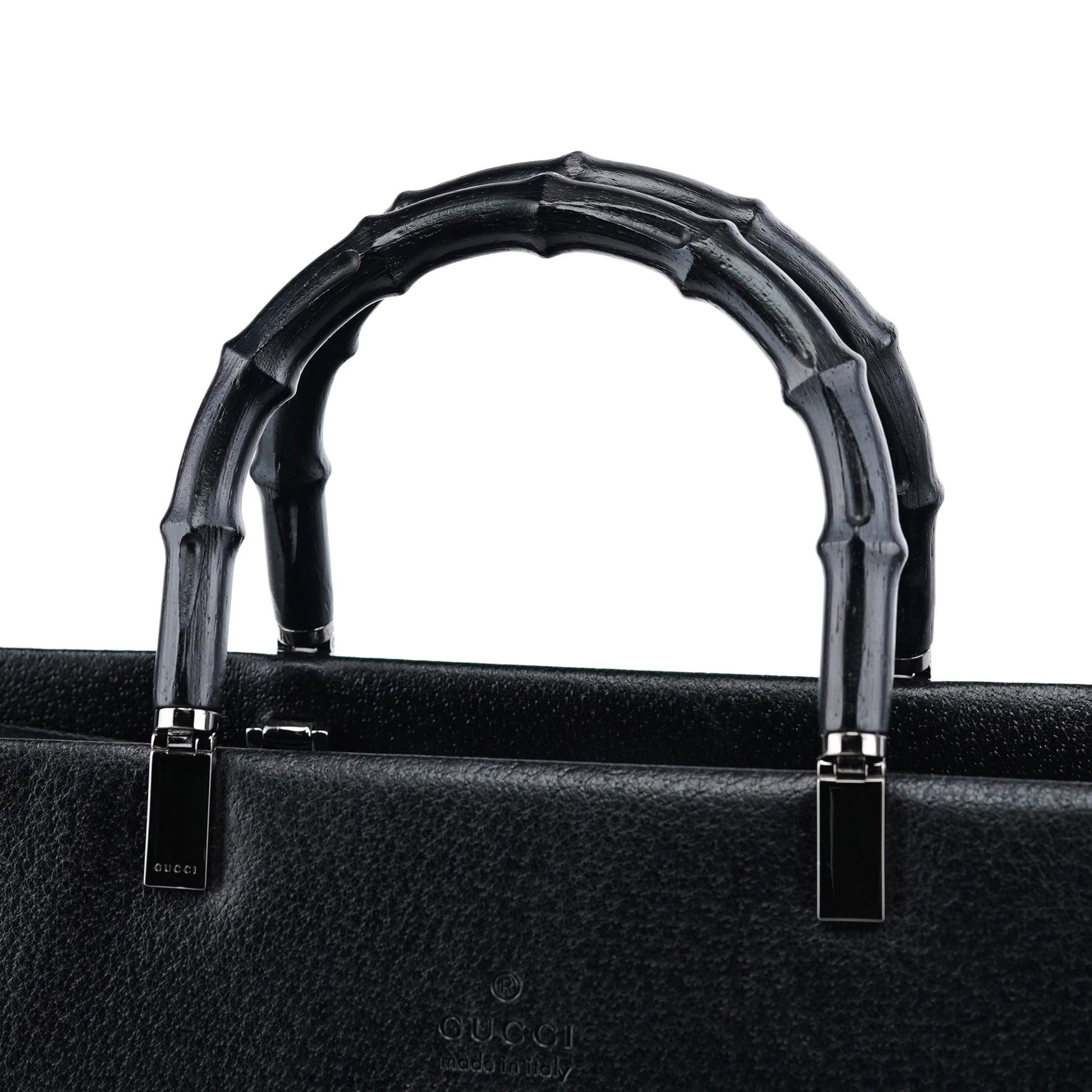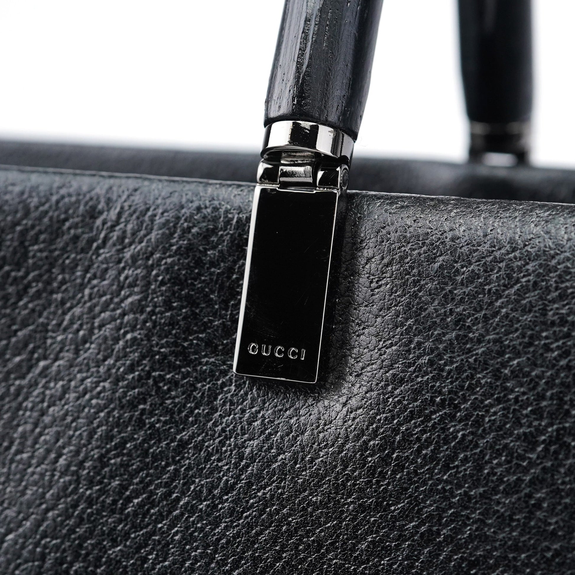 Designed by Tom Ford in the late 1990s, this vintage Gucci Bamboo tote is. crafted from textured black leather, it features bamboo handles, silver-tone hardware with Gucci logo engraving, and a crossbody strap. The clip closure ensures security, while the calfskin-lined interior with two pockets offers functionality. The embossed Gucci logo on the front adds the perfect finishing touch to this iconic design.