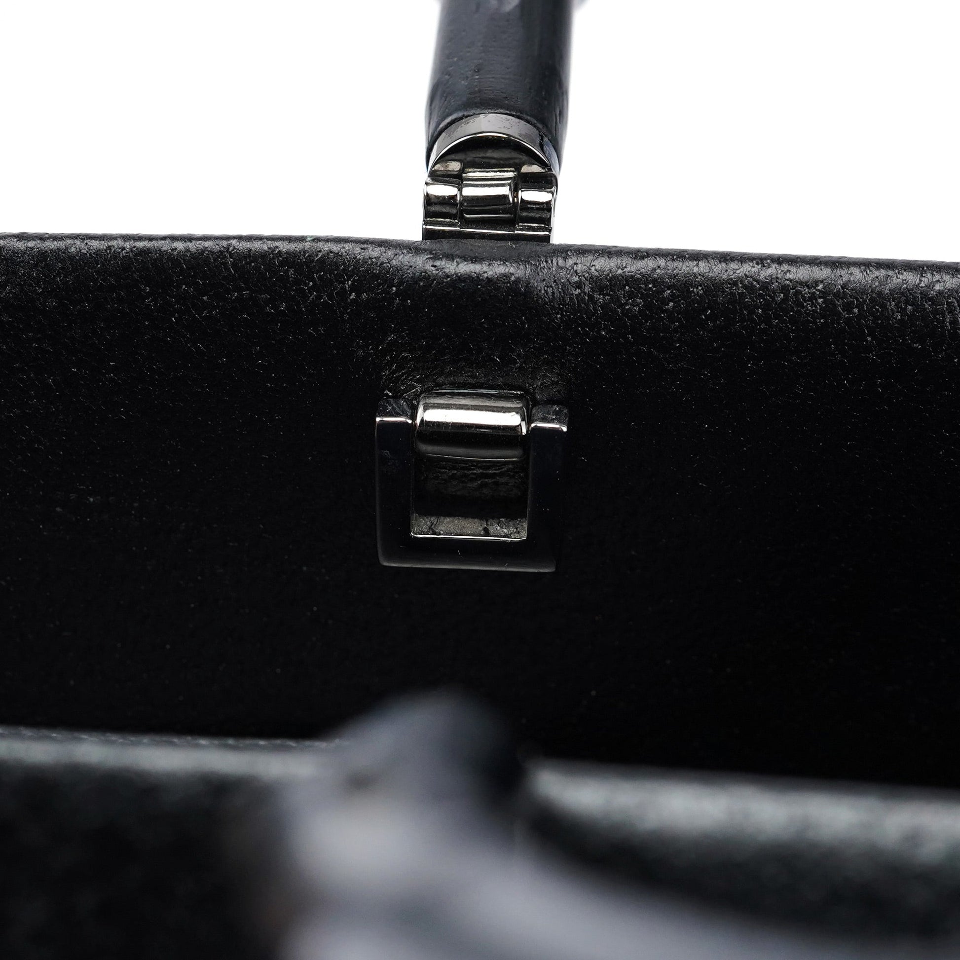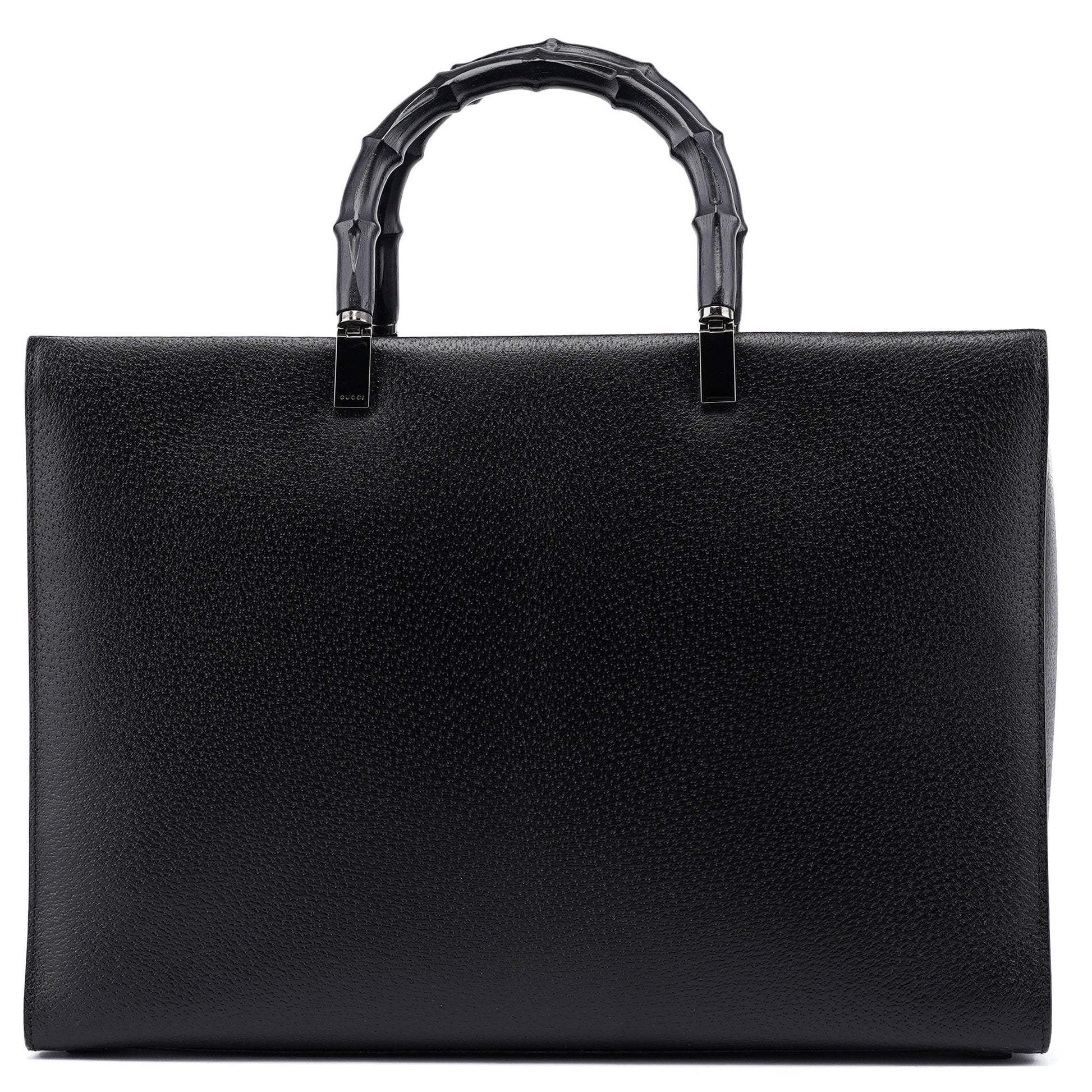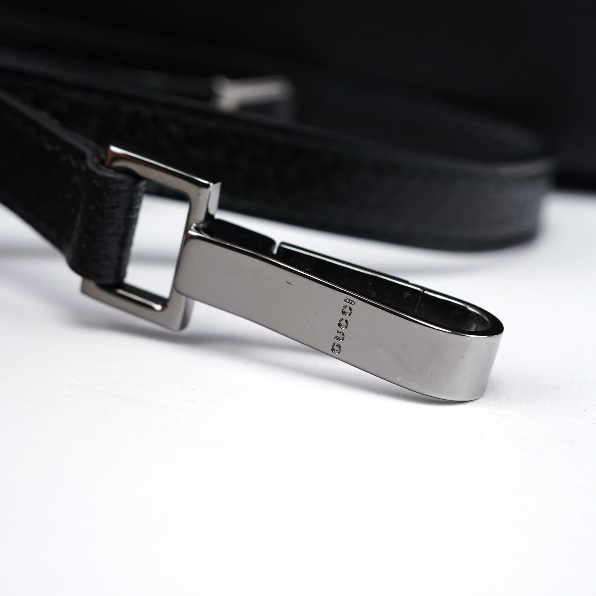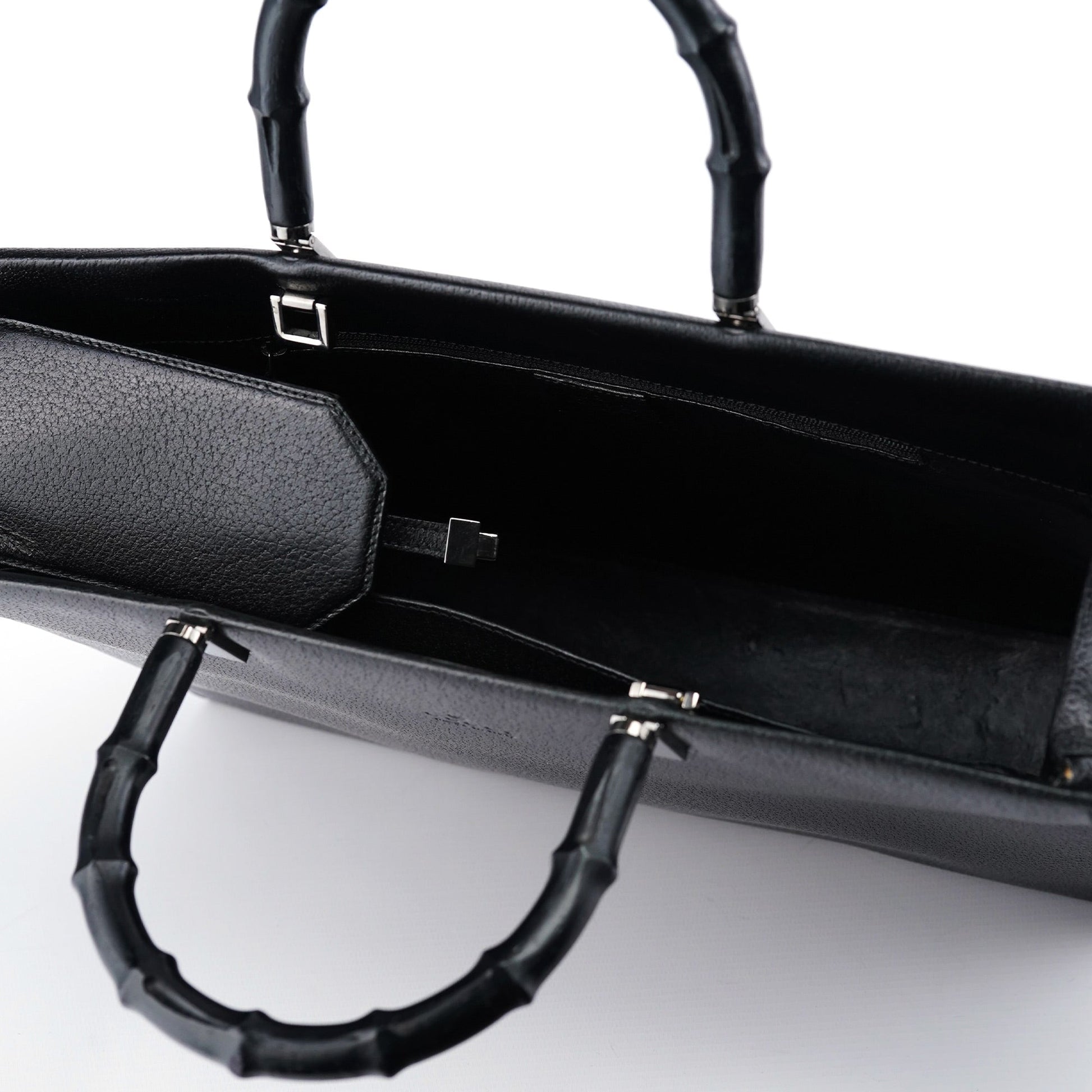 Designed by Tom Ford in the late 1990s, this vintage Gucci Bamboo tote is. crafted from textured black leather, it features bamboo handles, silver-tone hardware with Gucci logo engraving, and a crossbody strap. The clip closure ensures security, while the calfskin-lined interior with two pockets offers functionality. The embossed Gucci logo on the front adds the perfect finishing touch to this iconic design.